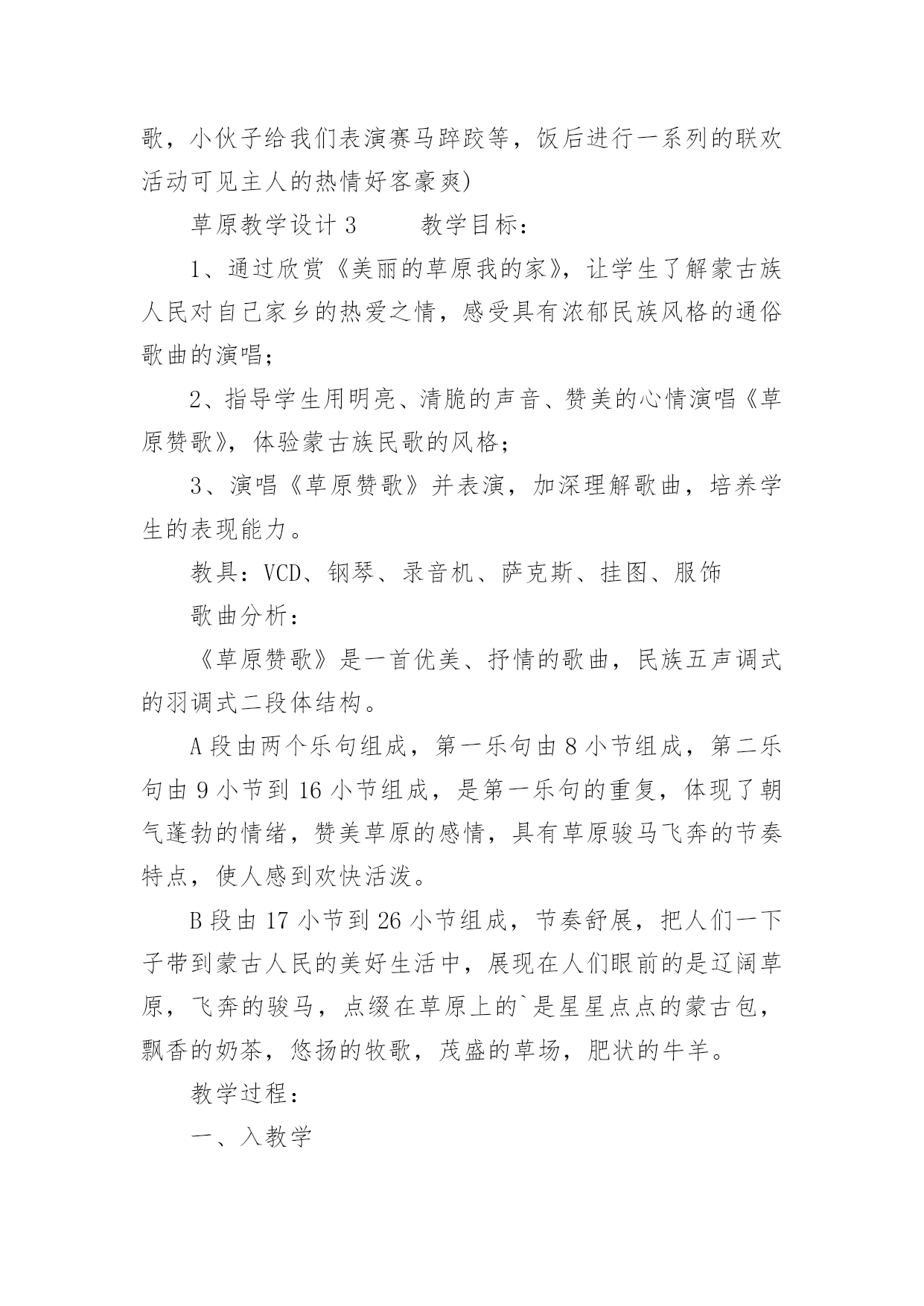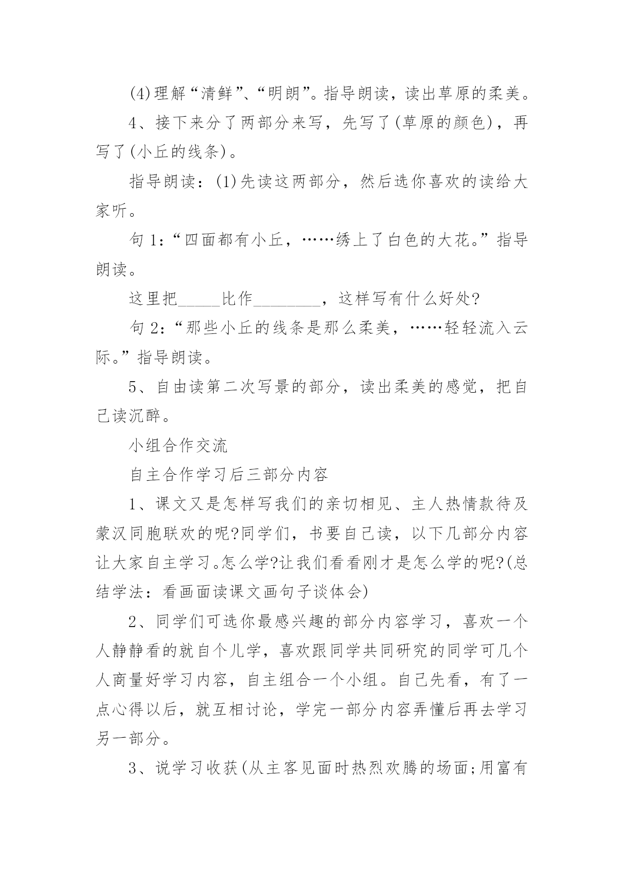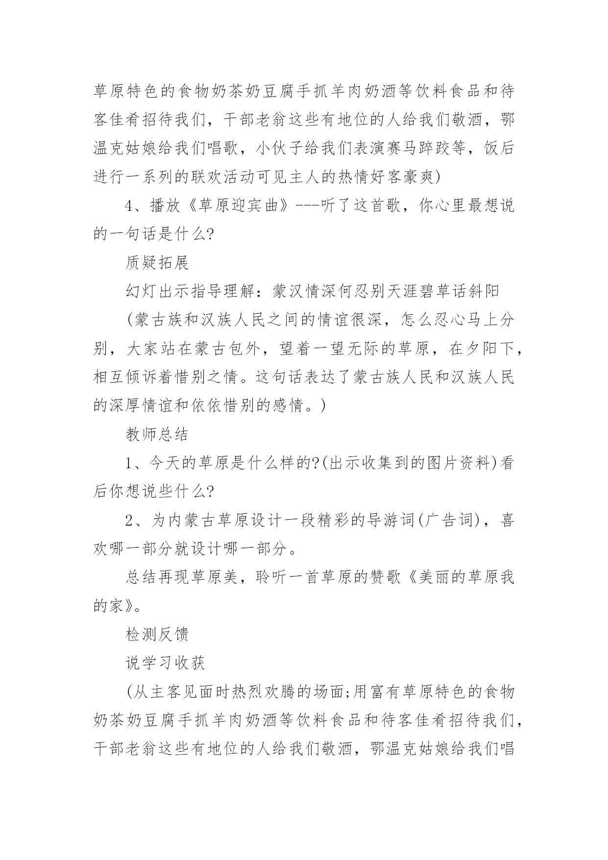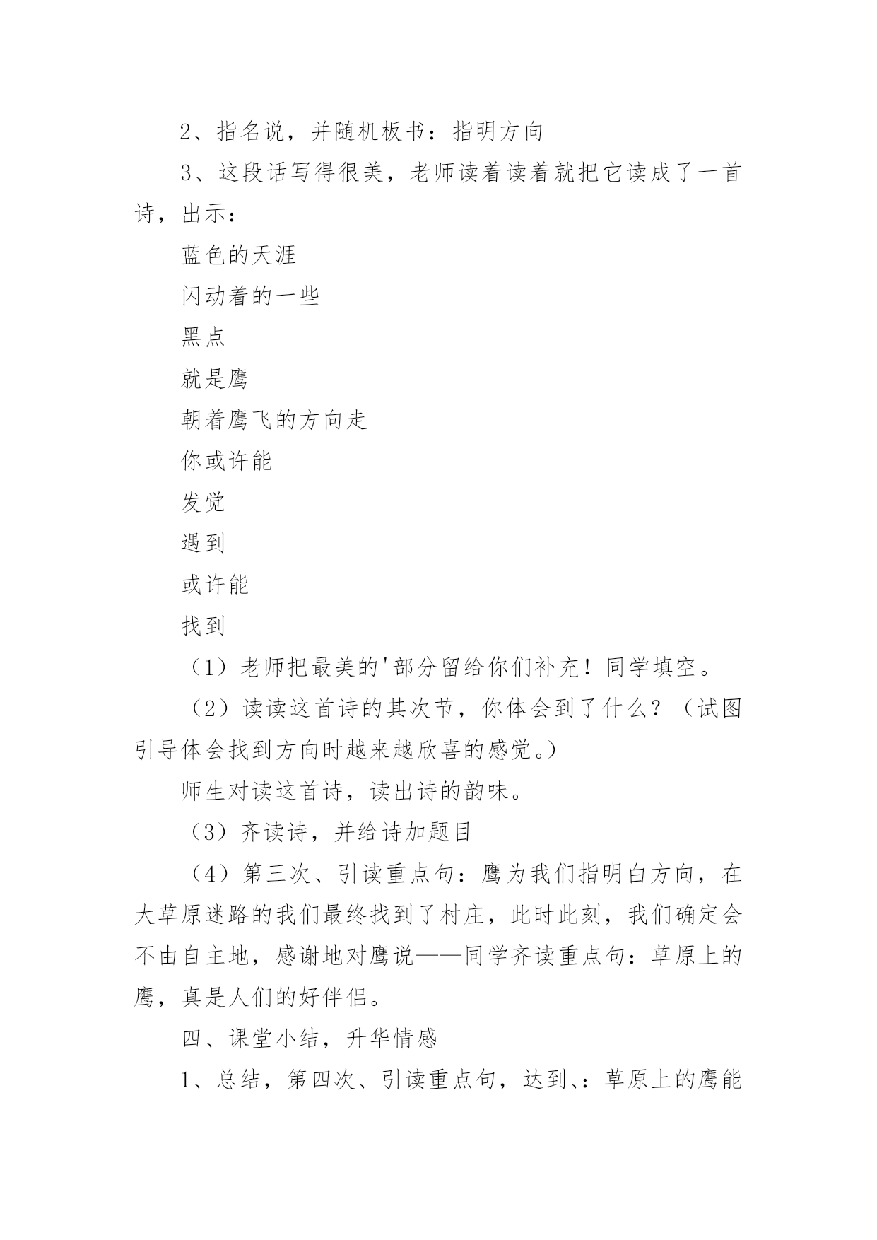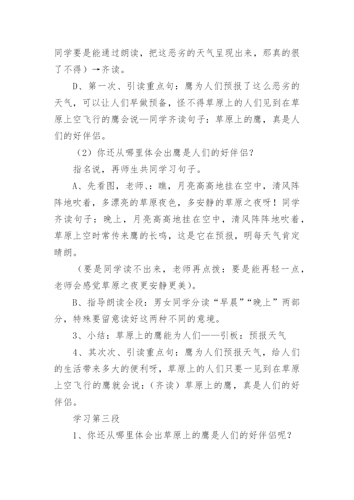 草原教学设计草原教学设计(20篇)作为一位优秀的人民教师,可能需要进行教学设计编写工作,教学设计是把教学原理转化为教学材料和教学活动的计划。我们应该怎么写教学设计呢?以下是小编帮大家整理的草原教学设计,欢迎大家分享。草原教学设计1(一)教学目标:1、读通课文,会读“旋、逝、尘、拳、雹、劈、卷、辽、阔、眺、潭”等生字,理解“狂风翻卷、沙尘滚滚、劈头盖脸”等词语。2、理解2、3两段,知道草原上的鹰能为人们做些什么事。3、体会草原上的鹰是人们的好伴侣。(二)教学重难点:知道草原上的鹰能为人们报告天气、指明方向,从而体会鹰是人们的好伴侣。(三)教法学法:多媒体帮助教学、读读悟悟、自主学习(四)课前预备:课件、课文重点句板贴卡片(五)教学过程:一、看图说话,提示课题1、播放课件:大草原和鹰,配上音乐《牧民新歌》。谈话:同学们,你们去过大草原吗?那就让我们一起去吧!老师一边操作课件一边引叙第一段:当你来到宽阔的大草原,首先见到的往往是鹰……2、这节课,就让我们和草原上的鹰交个伴侣吧!齐读课题:草原上的鹰师激读:草原上的鹰是多么威猛呀!再读二、初读课文,学习字词1、你想进一步了解草原上的鹰吗?打开书本自由朗读课文。要求:把课文读通顺,读精准,遇到不会读的字做一个记号,也可以先问问同桌或老师。老师巡察,把课文给同学圈出不熟悉的字。(做到生字让同学确定)2、老师出示课文,让同学读不熟悉的字。(同学能读的让同学读,不能读的老师注拼音让同学读。)3、分节读课文。①你觉得你能读好哪段?指名读一节。②谁最想熬炼一下?再指名读。(通过多种形式指导同学读通课文。)4、你们很会读书,还想读吗?请你们用自己喜爱的方式读课文。要求:哪一句话最能看出人们对草原上的鹰有着深厚的感情,边读边划出一个句子。5、指名说,并板贴句子:草原上的鹰,真是人们的好伴侣。指导朗读好这个句子,老师随机评点:老师感觉有点像好伴侣了,再读。三、读读悟悟,体会情感学习其次段1、(导)为什么说草原上的鹰是人们的好伴侣吗?自由朗读其次段,想一想:你从哪些句子中体会出鹰是人们的好伴侣?2、指名说,随机重点训练以下句子:(1)出示句子:果真,在朝霞消逝的地方,出现了一片黄云,狂风翻卷,沙尘滚滚,拳手大的冰雹就劈头盖脸地打下来。A、天气有怎样的改变?同学说,老师出示以上句子。B、其实天气改变是有肯定先后挨次的。请你给这两个句子加上表示先后挨次的词。(过不了多久、接着)读一读这两个词语,你有什么感觉?(体会天气改变之快。)C、天气的改变不仅快,而且越变越恶劣。先看图(配音)感受看了图,你有什么感受?请你用书上的一两个词语来说一说这时候的天气状况。(如:狂风翻卷,沙尘滚滚,劈头盖脸)老师立刻指导读好这几个词。你能通过读把这恶劣的天气呈现出来吗?自由练读整句子→指名读→评议→全班男同学读、女同学读(师点:女同学要是能通过朗读,把这恶劣的天气呈现出来,那真的很了不得)→齐读。D、第一次、引读重点句:鹰为人们预报了这么恶劣的天气,可以让人们早做预备,怪不得草原上的人们见到在草原上空飞行的鹰会说—同学齐读句子:草原上的鹰,真是人们的好伴侣。(2)你还从哪里体会出鹰是人们的好伴侣?指名说,再师生共同学习句子。A、先看图,老师、:瞧,月亮高高地挂在空中,清风阵阵地吹着,多漂亮的草原夜色,多安静的草原之夜呀!同学齐读句子:晚上,月亮高高地挂在空中,清风阵阵地吹着,草原上空时常传来鹰的长鸣,这是它在预报,明每天气肯定晴朗。(要是同学读不出来,老师再点拨:要是能再轻一点,老师会感觉草原之夜更安静更美)。B、指导朗读全段:男女同学分读“早晨”“晚上”两部分,特殊要留意读好这两种不同的意境。3、小结:草原上的鹰能为人们——引板:预报天气4、其次次、引读重点句:鹰为人们预报天气,给人们的生活带来多大的便利呀,草原上的人们只要一见到在草原上空飞行的鹰就会说:(齐读)草原上的鹰,真是人们的好伴侣。学习第三段1、你还从哪里体会出草原上的鹰是人们的好伴侣呢?2、指名说,并随机板书:指明方向3、这段话写得很美,老师读着读着就把它读成了一首诗,出示:蓝色的天涯闪动着的一些黑点就是鹰朝着鹰飞的方向走你或许能发觉遇到或许能找到(1)老师把最美的'部分留给你们补充!同学填空。(2)读读这首诗的其次节,你体会到了什么?(试图引导体会找到方向时越来越欣喜的感觉。)师生对读这首诗,读出诗的韵味。(3)齐读诗,并给诗加题目(4)第三次、引读重点句:鹰为我们指明白方向,在大草原迷路的我们最终找到了村庄,此时此刻,我们确定会不由自主地,感谢地对鹰说——同学齐读重点句:草原上的鹰,真是人们的好伴侣。四、课堂小结,升华情感1、总结,第四次、引读重点句,达到、:草原上的鹰能为人们预报天气,为迷路的人指路,其实还能为人们做许很多多的事,难怪人们对鹰布满了感情,