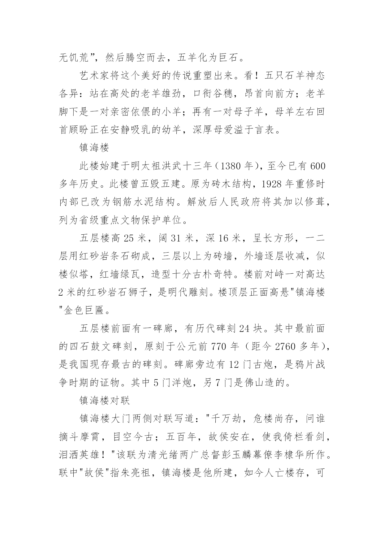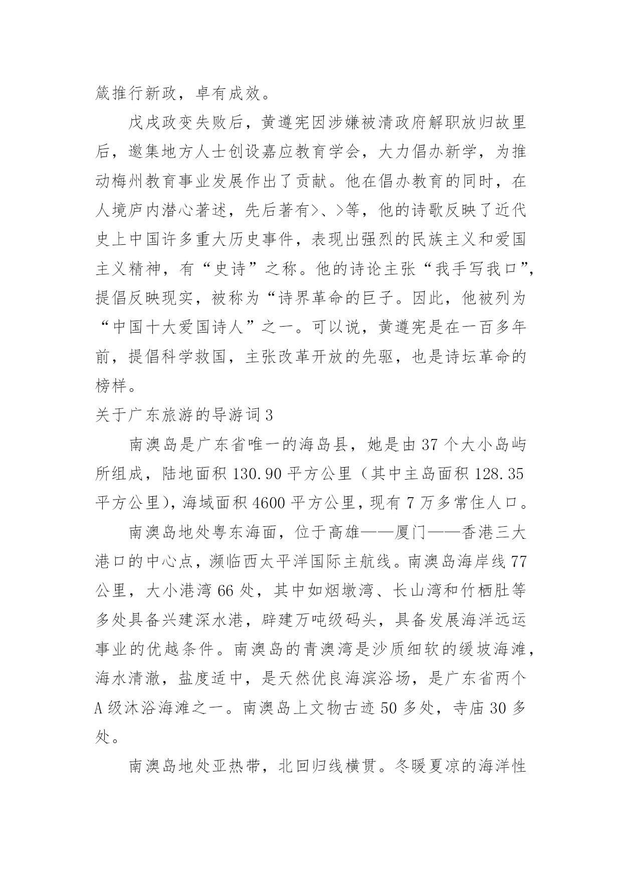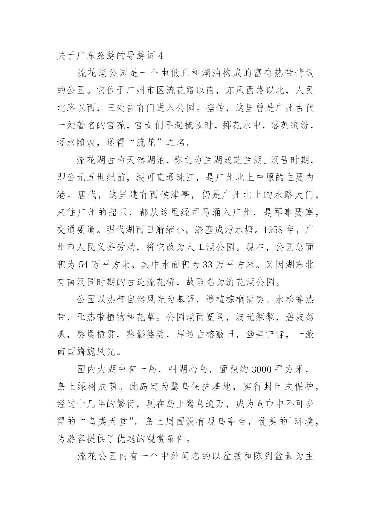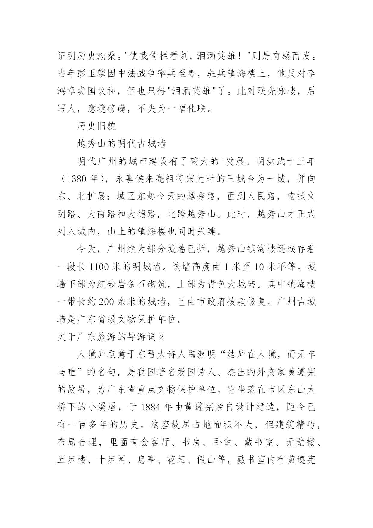 广东旅游的导游词关于广东旅游的导游词作为一名导游,编写导游词是必不可少的,导游词是导游员进行实地口语导游的基础和前提。那么优秀的导游词是什么样的呢?下面是小编为大家整理的关于广东旅游的导游词,仅供参考,希望能够帮助到大家。关于广东旅游的导游词1越秀公园位于广州市内北部、广州火车站东南约一公里处,是全市最大的公园,面积达92万平方米。除越秀山处,还包括周围的6个小山岗及东秀湖、南秀湖、北秀湖3个人工湖。越秀公园内广种花卉树木,初春的红棉,暮春的杜鹃,四月的白玉兰,五月的金凤和山丹,秋天的含笑,隆冬的腊梅。每年春秋两季,这里还举办盛大的迎春花会和菊展。公园内还有一座能容纳3万多观众的体育场。主要参观景点有五羊石雕、镇海楼和中山纪念碑等名胜古迹。越秀山上五羊石像五羊石像是广州市的标志。走进越秀公园,登上木壳岗,便会看到1959年由著名雕塑家尹积昌等人设计的,作为羊城城徽的,富有诗情画意的艺术作品—五羊石像。五羊仙子降临广州,给羊城人民带来了吉祥与幸福,他们赠稻于民,并祝“愿此闤闠(huanhui,意为街市),永无饥荒”,然后腾空而去,五羊化为巨石。艺术家将这个美好的传说重塑出来。看!五只石羊神态各异:站在高处的老羊雄劲,口衔谷穗,昂首向前方;老羊脚下是一对亲密依偎的小羊;再有一对母子羊,母羊左右回首顾盼正在安静吸乳的幼羊,深厚母爱溢于言表。镇海楼此楼始建于明太祖洪武十三年(1380年),至今已有600多年历史。此楼曾五毁五建。原为砖木结构,1928年重修时内部已改为钢筋水泥结构。解放后人民政府将其加以修葺,列为省级重点文物保护单位。五层楼高25米,阔31米,深16米,呈长方形,一二层用红砂岩条石砌成,三层以上为砖墙,外墙逐层收减,似楼似塔,红墙绿瓦,造型十分古朴奇特。楼前对峙一对高达2米的红砂岩石狮子,是明代雕刻。楼顶层正面高悬"镇海楼"金色巨匾。五层楼前面有一碑廊,有历代碑刻24块。其中最前面的四石鼓文碑刻,原刻于公元前770年(距今2760多年),是我国现存最古的碑刻。碑廊旁边有12门古炮,是鸦片战争时期的证物。其中5门洋炮,另7门是佛山造的。镇海楼对联镇海楼大门两侧对联写道:"千万劫,危楼尚存,问谁摘斗摩霄,目空今古;五百年,故侯安在,使我倚栏看剑,泪洒英雄!"该联为清光绪两广总督彭玉麟幕僚李棣华所作。联中"故侯"指朱亮祖,镇海楼是他所建,如今人亡楼存,可证明历史沧桑。"使我倚栏看剑,泪洒英雄!"则是有感而发。当年彭玉麟因中法战争率兵至粤,驻兵镇海楼上,他反对李鸿章卖国议和,但也只得"泪洒英雄"了。此对联先咏楼,后写人,意境磅礴,不失为一幅佳联。历史旧貌越秀山的明代古城墙明代广州的城市建设有了较大的'发展。明洪武十三年(1380年),永嘉侯朱亮祖将宋元时的三城合为一城,并向东、北扩展:城区东起今天的越秀路,西到人民路,南抵文明路、大南路和大德路,北跨越秀山。此时,越秀山才正式列入城内,山上的镇海楼也同时兴建。今天,广州绝大部分城墙已拆,越秀山镇海楼还残存着一段长1100米的明城墙。该墙高度由1米至10米不等。城墙下部为红砂岩条石砌筑,上部为青色大城砖。其中镇海楼一带长约200余米的城墙,已由市政府拨款修复。广州古城墙是广东省级文物保护单位。关于广东旅游的导游词2人境庐取意于东晋大诗人陶渊明“结庐在人境,而无车马暄”的名句,是我国著名爱国诗人、杰出的外交家黄遵宪的故居,为广东省重点文物保护单位。它坐落在市区东山大桥下的小溪唇,于1884年由黄遵宪亲自设计建造,距今已有一百多年的历史。这座故居占地面积不大,但建筑精巧,布局合理,里面有会客厅、书房、卧室、藏书室、无壁楼、五步楼、十步阁、息亭、花坛、假山等,藏书室内有黄遵宪的各种著作和读过的书共八千多册。庐中保留着黄遵宪亲自撰写的对联,如会客厅对联:“万丈函归方丈室,四围环列自家山”,另有一联:“有三分水、四分竹、添七分明月;从五步楼、十步阁、望百步长江”,都十分形象地描绘了这故居的环境。进入人境庐,你就会感到这是别开生面的文化景观。黄遵宪,字公度,他所生活的.年代,正值清未光绪年间。虽然只是一位举人,但他博学多才,又有一颗爱国忧民之心。光绪三年(1877年)被朝廷破格晋升为驻日使馆参赞,成为驻日参使何如璋的最得力助手与参谋。在驻日友赞四年内,着重研究日本历史,特别是日本明治维新的历史,后写成一部50多万字的>。这部书不仅是我国第一部全面系统研究日本历史的专著,同时也成为日本的第一部“国史”,它为当时中国的政治改革运动———即戊戌变法维新运动,提供了理论依据。从日本回国后,黄遵宪又先后任驻美参赞、驻美国旧金山及新加坡领事。他在担任十多年外交官期间,为维护国家和民族利益、建议政府实行护照办法与保护华侨做了大量工作,受到华侨和中外人士的敬仰。中日甲午战争期间,黄遵宪被召回国,任江宁洋