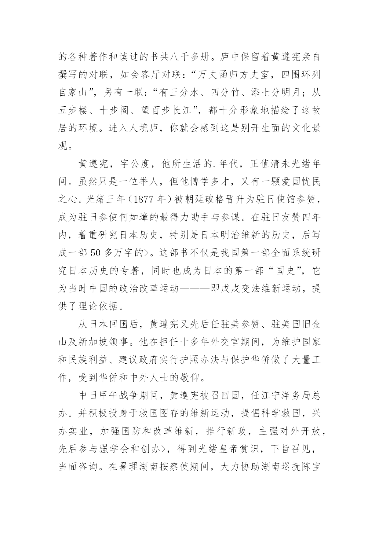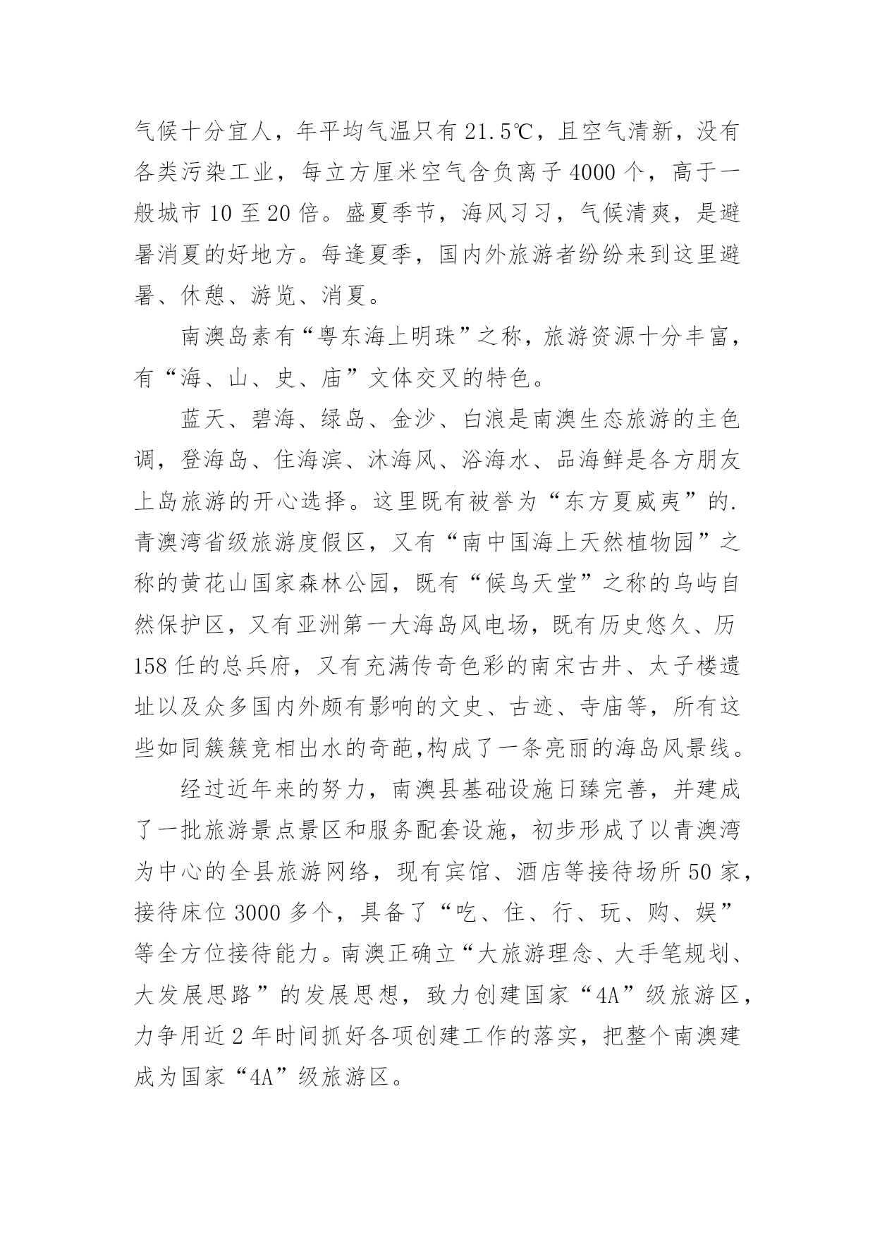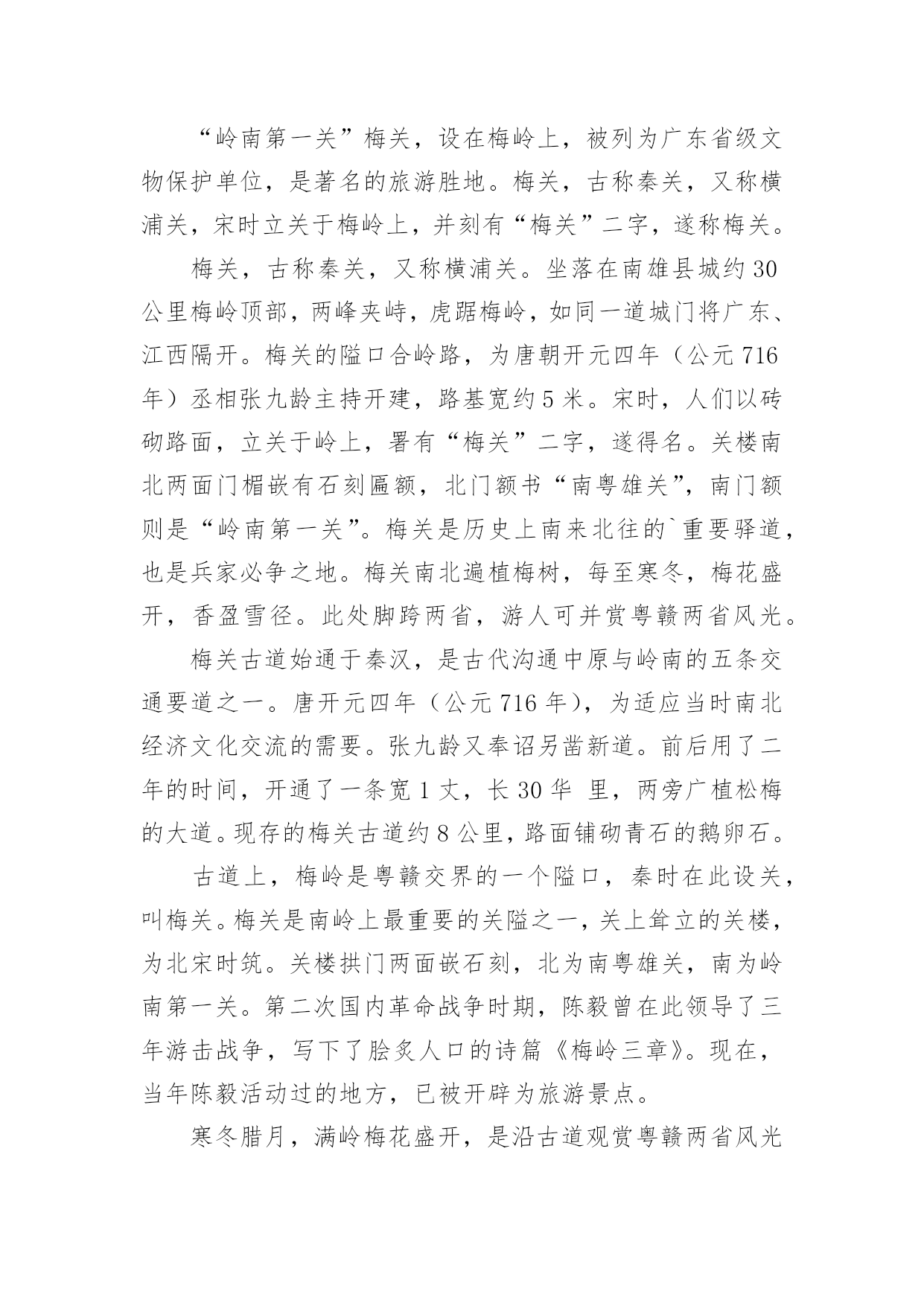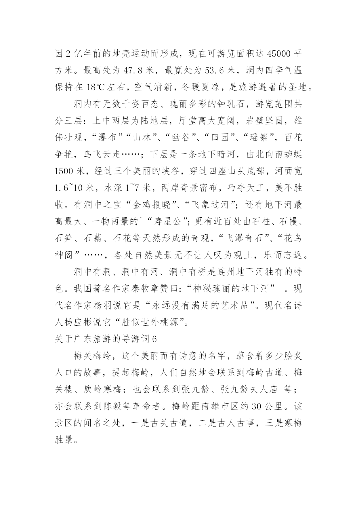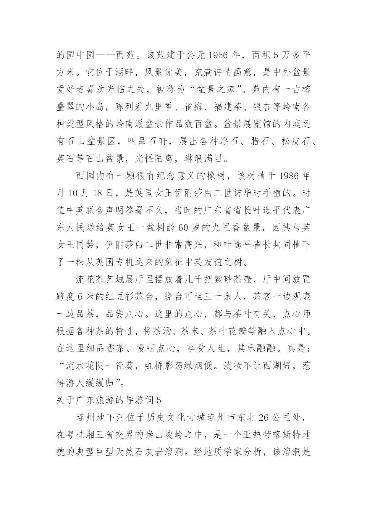 广东旅游的导游词关于广东旅游的导游词作为一名导游,编写导游词是必不可少的,导游词是导游员进行实地口语导游的基础和前提。那么优秀的导游词是什么样的呢?下面是小编为大家整理的关于广东旅游的导游词,仅供参考,希望能够帮助到大家。关于广东旅游的导游词1越秀公园位于广州市内北部、广州火车站东南约一公里处,是全市最大的公园,面积达92万平方米。除越秀山处,还包括周围的6个小山岗及东秀湖、南秀湖、北秀湖3个人工湖。越秀公园内广种花卉树木,初春的红棉,暮春的杜鹃,四月的白玉兰,五月的金凤和山丹,秋天的含笑,隆冬的腊梅。每年春秋两季,这里还举办盛大的迎春花会和菊展。公园内还有一座能容纳3万多观众的体育场。主要参观景点有五羊石雕、镇海楼和中山纪念碑等名胜古迹。越秀山上五羊石像五羊石像是广州市的标志。走进越秀公园,登上木壳岗,便会看到1959年由著名雕塑家尹积昌等人设计的,作为羊城城徽的,富有诗情画意的艺术作品—五羊石像。五羊仙子降临广州,给羊城人民带来了吉祥与幸福,他们赠稻于民,并祝“愿此闤闠(huanhui,意为街市),永无饥荒”,然后腾空而去,五羊化为巨石。艺术家将这个美好的传说重塑出来。看!五只石羊神态各异:站在高处的老羊雄劲,口衔谷穗,昂首向前方;老羊脚下是一对亲密依偎的小羊;再有一对母子羊,母羊左右回首顾盼正在安静吸乳的幼羊,深厚母爱溢于言表。镇海楼此楼始建于明太祖洪武十三年(1380年),至今已有600多年历史。此楼曾五毁五建。原为砖木结构,1928年重修时内部已改为钢筋水泥结构。解放后人民政府将其加以修葺,列为省级重点文物保护单位。五层楼高25米,阔31米,深16米,呈长方形,一二层用红砂岩条石砌成,三层以上为砖墙,外墙逐层收减,似楼似塔,红墙绿瓦,造型十分古朴奇特。楼前对峙一对高达2米的红砂岩石狮子,是明代雕刻。楼顶层正面高悬"镇海楼"金色巨匾。五层楼前面有一碑廊,有历代碑刻24块。其中最前面的四石鼓文碑刻,原刻于公元前770年(距今2760多年),是我国现存最古的碑刻。碑廊旁边有12门古炮,是鸦片战争时期的证物。其中5门洋炮,另7门是佛山造的。镇海楼对联镇海楼大门两侧对联写道:"千万劫,危楼尚存,问谁摘斗摩霄,目空今古;五百年,故侯安在,使我倚栏看剑,泪洒英雄!"该联为清光绪两广总督彭玉麟幕僚李棣华所作。联中"故侯"指朱亮祖,镇海楼是他所建,如今人亡楼存,可证明历史沧桑。"使我倚栏看剑,泪洒英雄!"则是有感而发。当年彭玉麟因中法战争率兵至粤,驻兵镇海楼上,他反对李鸿章卖国议和,但也只得"泪洒英雄"了。此对联先咏楼,后写人,意境磅礴,不失为一幅佳联。历史旧貌越秀山的明代古城墙明代广州的城市建设有了较大的'发展。明洪武十三年(1380年),永嘉侯朱亮祖将宋元时的三城合为一城,并向东、北扩展:城区东起今天的越秀路,西到人民路,南抵文明路、大南路和大德路,北跨越秀山。此时,越秀山才正式列入城内,山上的镇海楼也同时兴建。今天,广州绝大部分城墙已拆,越秀山镇海楼还残存着一段长1100米的明城墙。该墙高度由1米至10米不等。城墙下部为红砂岩条石砌筑,上部为青色大城砖。其中镇海楼一带长约200余米的城墙,已由市政府拨款修复。广州古城墙是广东省级文物保护单位。关于广东旅游的导游词2人境庐取意于东晋大诗人陶渊明“结庐在人境,而无车马暄”的名句,是我国著名爱国诗人、杰出的外交家黄遵宪的故居,为广东省重点文物保护单位。它坐落在市区东山大桥下的小溪唇,于1884年由黄遵宪亲自设计建造,距今已有一百多年的历史。这座故居占地面积不大,但建筑精巧,布局合理,里面有会客厅、书房、卧室、藏书室、无壁楼、五步楼、十步阁、息亭、花坛、假山等,藏书室内有黄遵宪的各种著作和读过的书共八千多册。庐中保留着黄遵宪亲自撰写的对联,如会客厅对联:“万丈函归方丈室,四围环列自家山”,另有一联:“有三分水、四分竹、添七分明月;从五步楼、十步阁、望百步长江”,都十分形象地描绘了这故居的环境。进入人境庐,你就会感到这是别开生面的文化景观。黄遵宪,字公度,他所生活的.年代,正值清未光绪年间。虽然只是一位举人,但他博学多才,又有一颗爱国忧民之心。光绪三年(1877年)被朝廷破格晋升为驻日使馆参赞,成为驻日参使何如璋的最得力助手与参谋。在驻日友赞四年内,着重研究日本历史,特别是日本明治维新的历史,后写成一部50多万字的>。这部书不仅是我国第一部全面系统研究日本历史的专著,同时也成为日本的第一部“国史”,它为当时中国的政治改革运动———即戊戌变法维新运动,提供了理论依据。从日本回国后,黄遵宪又先后任驻美参赞、驻美国旧金山及新加坡领事。他在担任十多年外交官期间,为维护国家和民族利益、建议政府实行护照办法与保护华侨做了大量工作,受到华侨和中外人士的敬仰。中日甲午战争期间,黄遵宪被召回国,任江宁洋