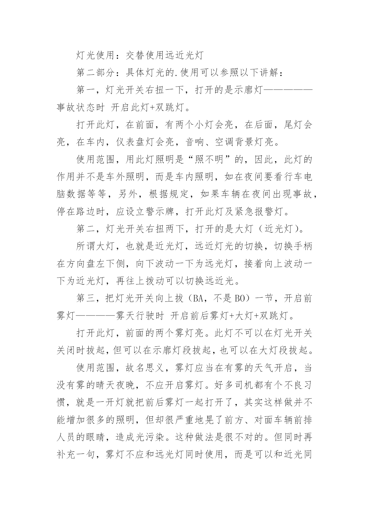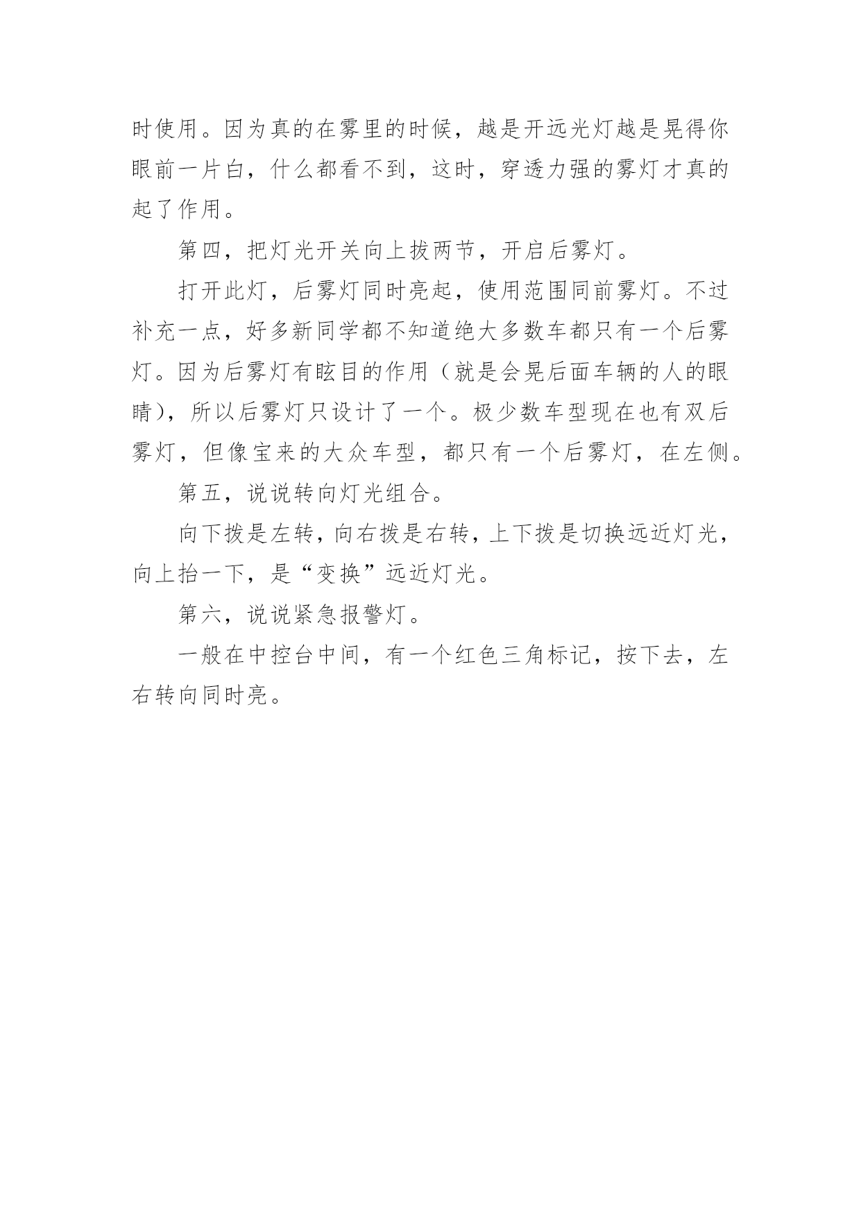 科目三考试灯光模拟教程科目三考试灯光模拟教程很多学员在科目三路考的时候对车灯和灯光的使用不熟悉,不知道夜间路考灯光如何使用。下面我给大家一一讲解。灯光使用:大灯开启1、夜间在没有路灯、照明不良条件下行驶:注:此时也可以一起开启远光灯,如果不开的话,接下来电脑也会提醒开启远光灯。以上均可。2、夜间同方向近距离跟车行驶灯光使用:近光灯3、夜间在窄路窄桥与非机动车会车灯光使用:近光灯4、夜间与机动车会车:灯光使用:近光灯5、夜间在道路上发生故障或交通事故妨碍交通又难以移动:灯光使用:大灯改为示廓灯+双跳灯6、雾天行驶:灯光使用:雾灯+双跳灯+大灯开启7、夜间通过急弯、拱桥、坡路、拱桥、人行横道或没有交通信号灯控制的路口:灯光使用:交替使用远近光灯第二部分:具体灯光的.使用可以参照以下讲解:第一,灯光开关右扭一下,打开的是示廓灯—————事故状态时开启此灯+双跳灯。打开此灯,在前面,有两个小灯会亮,在后面,尾灯会亮,在车内,仪表盘灯会亮,音响、空调背景灯亮。使用范围,用此灯照明是“照不明”的,因此,此灯的作用并不是车外照明,而是车内照明,如在夜间要看行车电脑数据等等,另外,根据规定,如果车辆在夜间出现事故,停在路边时,应设立警示牌,打开此灯及紧急报警灯。第二,灯光开关右扭两下,打开的是大灯(近光灯)。所谓大灯,也就是近光灯,远近灯光的切换,切换手柄在方向盘左下侧,向下波动一下为远光灯,接着向上波动一下为近光灯,再往上拨动可以切换远近光。第三,把灯光开关向上拔(BA,不是BO)一节,开启前雾灯————雾天行驶时开启前后雾灯+大灯+双跳灯。打开此灯,前面的两个雾灯亮。此灯不可以在灯光开关关闭时拔起,但可以在示廓灯段拔起,也可以在大灯段拔起。使用范围,故名思义,雾灯应当在有雾的天气开启,当没有雾的晴天夜晚,不应开启雾灯。好多司机都有个不良习惯,就是一开灯就把前后雾灯一起打开了,其实这样做并不能增加很多的照明,但却很严重地晃了前方、对面车辆前排人员的眼睛,造成光污染。这种做法是很不对的。但同时再补充一句,雾灯不应和远光灯同时使用,而是可以和近光同时使用。因为真的在雾里的时候,越是开远光灯越是晃得你眼前一片白,什么都看不到,这时,穿透力强的雾灯才真的起了作用。第四,把灯光开关向上拔两节,开启后雾灯。打开此灯,后雾灯同时亮起,使用范围同前雾灯。不过补充一点,好多新同学都不知道绝大多数车都只有一个后雾灯。因为后雾灯有眩目的作用(就是会晃后面车辆的人的眼睛),所以后雾灯只设计了一个。极少数车型现在也有双后雾灯,但像宝来的大众车型,都只有一个后雾灯,在左侧。第五,说说转向灯光组合。向下拨是左转,向右拨是右转,上下拨是切换远近灯光,向上抬一下,是“变换”远近灯光。第六,说说紧急报警灯。一般在中控台中间,有一个红色三角标记,按下去,左右转向同时亮。