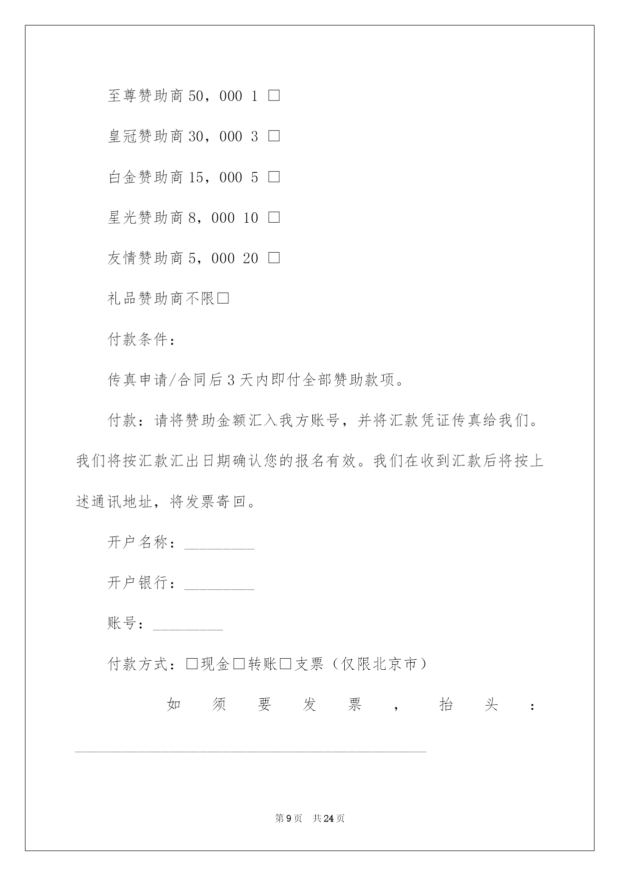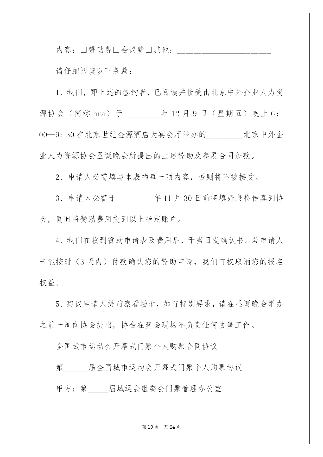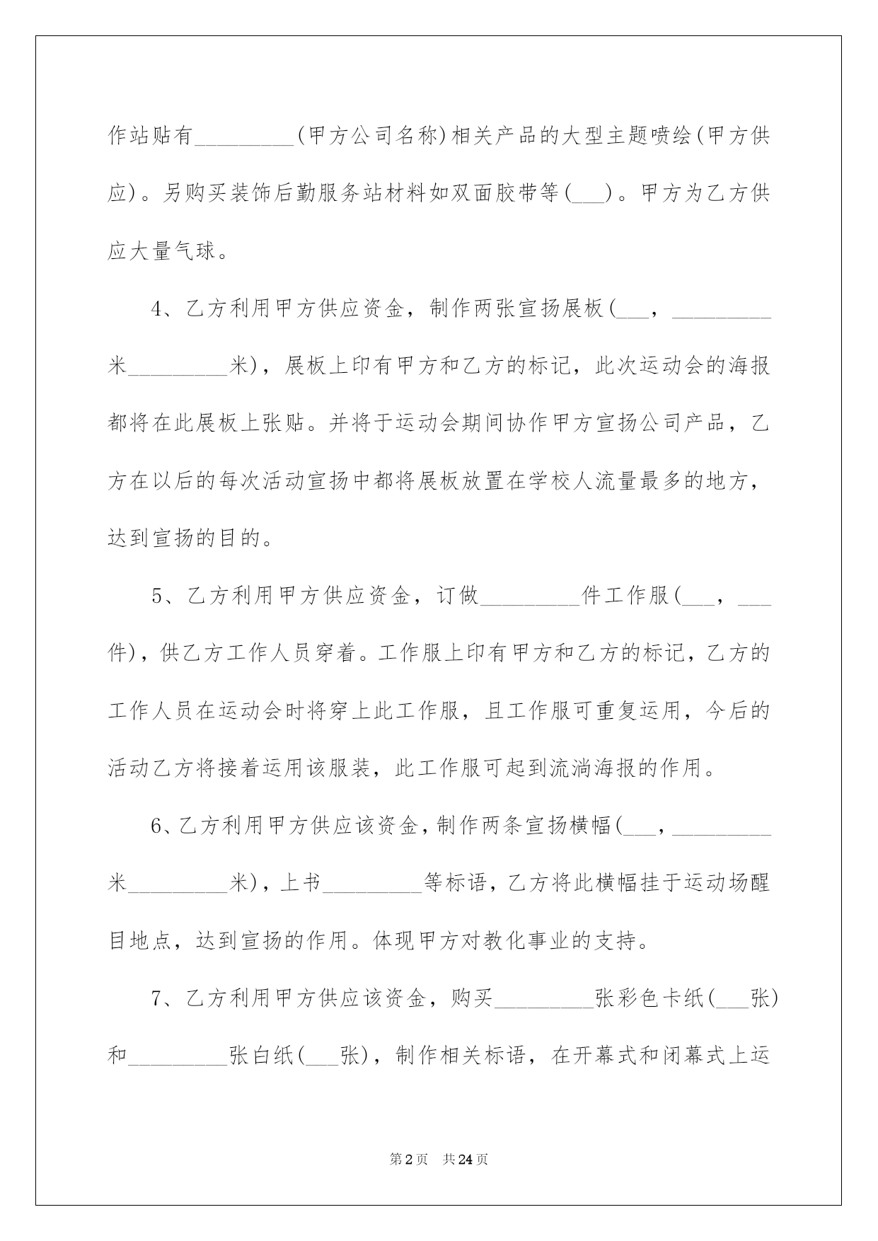 第PAGE\*Arabic\*MERGEFORMAT24页共NUMPAGES\*Arabic\*MERGEFORMAT24页第PAGE\*MERGEFORMAT24页共NUMPAGES\*MERGEFORMAT24页第PAGE\*MERGEFORMAT24页共NUMPAGES\*MERGEFORMAT24页第PAGE\*MERGEFORMAT24页共NUMPAGES\*MERGEFORMAT24页第PAGE\*MERGEFORMAT24页共NUMPAGES\*MERGEFORMAT24页第PAGE\*MERGEFORMAT24页共NUMPAGES\*MERGEFORMAT24页第PAGE\*MERGEFORMAT24页共NUMPAGES\*MERGEFORMAT24页第PAGE\*MERGEFORMAT24页共NUMPAGES\*MERGEFORMAT24页第PAGE\*MERGEFORMAT24页共NUMPAGES\*MERGEFORMAT24页第PAGE\*MERGEFORMAT24页共NUMPAGES\*MERGEFORMAT24页第PAGE\*MERGEFORMAT24页共NUMPAGES\*MERGEFORMAT24页2022学校运动会赞助合同学校运动会赞助合同随着人们法律意识的加强,人们运用到合同的场合不断增多,合同能够促使双方正确行使权力,严格履行义务。那么大家知道合同的格式吗?下面是我帮大家整理的学校运动会赞助合同,希望能够帮助到大家。学校运动会赞助合同1甲方:_________乙方:__________________学校运动会,活动时间是________年____月____日到________年____月____日。此次运动会将在_________(地点)进行。一、甲方赞助确认以及甲方和乙方的责任1、甲方为乙方供应此次活动所需资金。2、甲方为乙方供应_________把遮阳伞,用于运动员休息及甲方产品展台。3、甲方为乙方供应两个后勤工作站,作为甲方产品的临时储存管理调送点,以及乙方工作人员休息,后勤物资的堆放管理点。后勤工作站贴有_________(甲方公司名称)相关产品的大型主题喷绘(甲方供应)。另购买装饰后勤服务站材料如双面胶带等(___)。甲方为乙方供应大量气球。4、乙方利用甲方供应资金,制作两张宣扬展板(___,_________米_________米),展板上印有甲方和乙方的标记,此次运动会的海报都将在此展板上张贴。并将于运动会期间协作甲方宣扬公司产品,乙方在以后的每次活动宣扬中都将展板放置在学校人流量最多的地方,达到宣扬的目的。5、乙方利用甲方供应资金,订做_________件工作服(___,___件),供乙方工作人员穿着。工作服上印有甲方和乙方的标记,乙方的工作人员在运动会时将穿上此工作服,且工作服可重复运用,今后的活动乙方将接着运用该服装,此工作服可起到流淌海报的作用。6、乙方利用甲方供应该资金,制作两条宣扬横幅(___,_________米_________米),上书_________等标语,乙方将此横幅挂于运动场醒目地点,达到宣扬的作用。体现甲方对教化事业的支持。7、乙方利用甲方供应该资金,购买_________张彩色卡纸(___张)和_________张白纸(___张),制作相关标语,在开幕式和闭幕式上运用。8、乙方利用甲方供应资金,组建两支拉拉队,以及购买一些拉拉队所需物品,如服装(由甲方供应),拉拉球(___)等。用于鼓舞士气及宣扬甲方。9、乙方利用甲方供应该资金,购买挂牌(___,___块,共_________块),挂在乙方运动员身上。当运动员在跑步的时候,挂牌随风飘动,全校师生都将看到这一漂亮的风景线。1、乙方利用甲方供应资金,购买、租用一些运动会上参赛同学的必用品,如跑步钉鞋(___,___双,共_________双)、护腕(___,___双,共_________双)、糖类、食品(___)提神药品、护理药品、简易医药箱(___)等。医药箱上将印有甲方的标记,体现甲方对运动员的关切。2、乙方将在活动当日为甲方分发试尝品和宣扬单,甲方供应试尝品和宣扬单。3、乙方将在运动会现场实行表彰大会,嘉奖获奖同学,以甲方的名义为他们颁奖,奖品为甲方的优质产品。4、此次乙方运动会奖品(_________,_________,_________)及训练用水(_________件_________品牌),由甲方向乙方供应。5、乙方出面联系学校超市在运动会期间为甲方在超市门口设立卖点,专销甲方产品,乙方为甲方举荐销售人员。6、乙方与学校联系在运