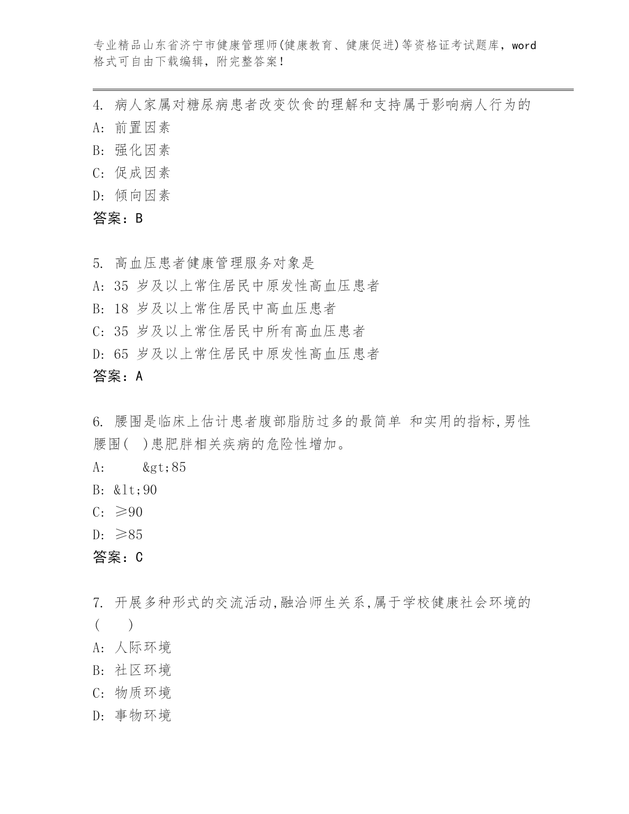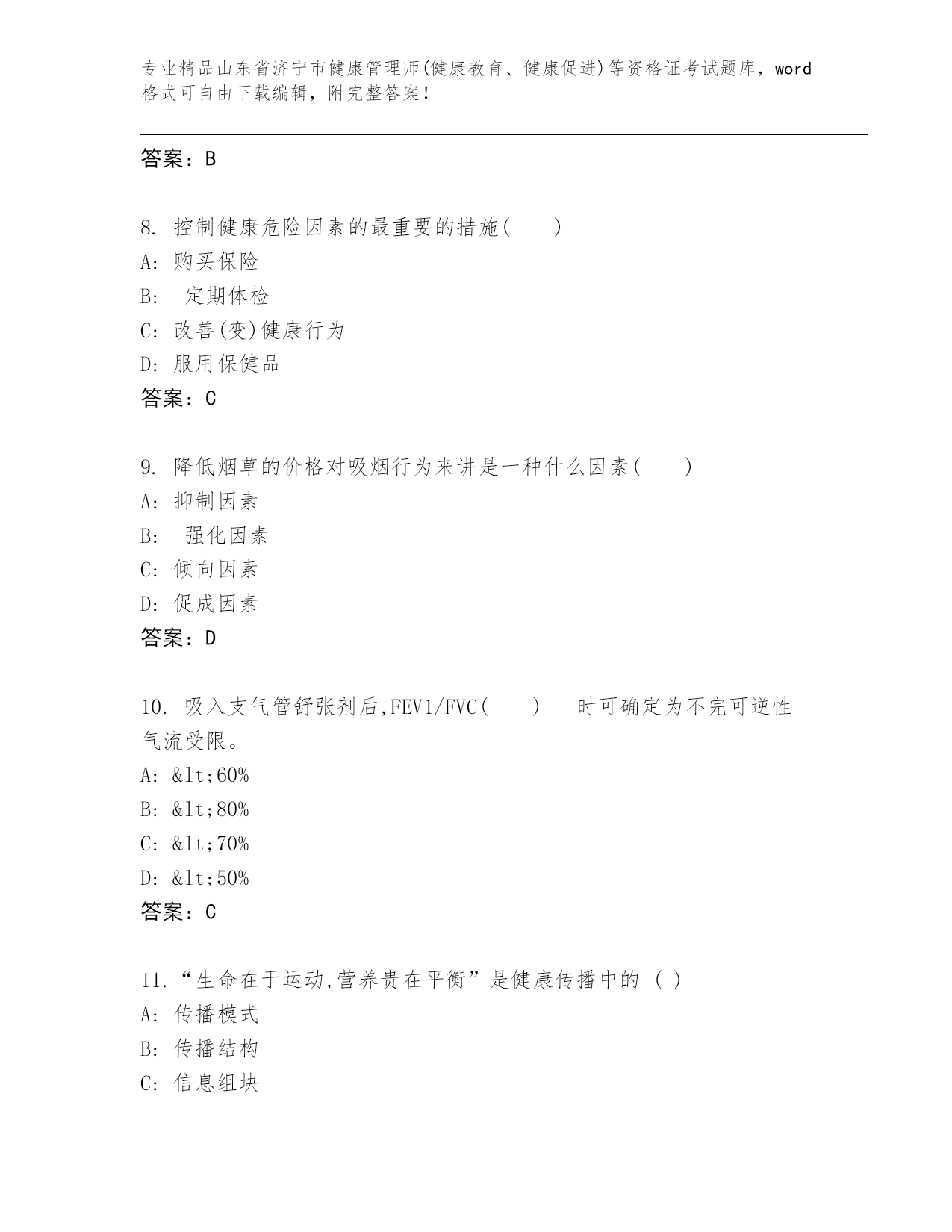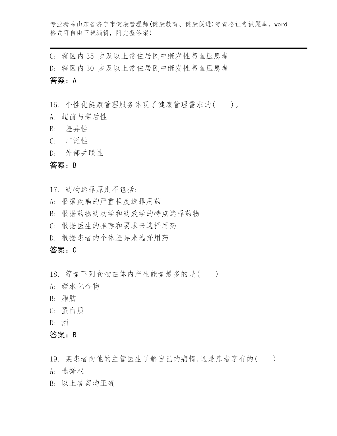 最新山东省济宁市健康管理师(健康教育、健康促进)等资格证考试精品题库推荐