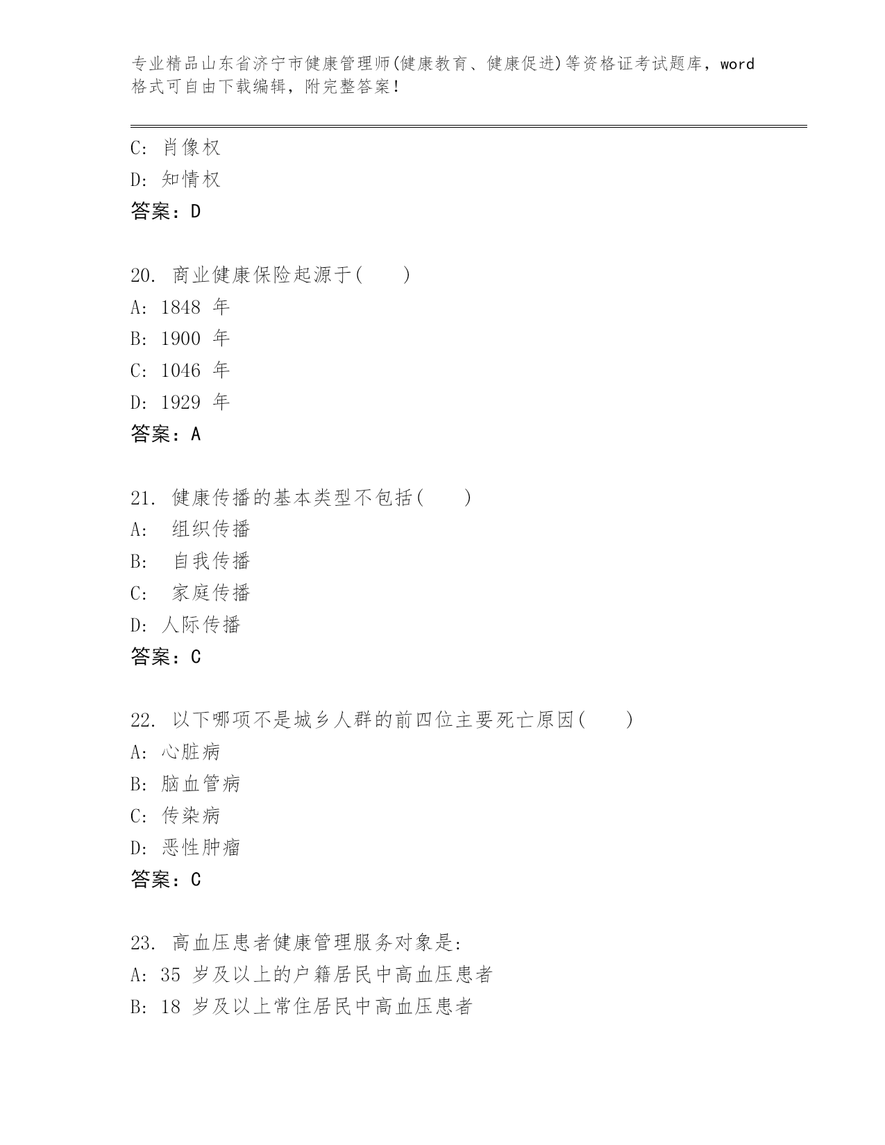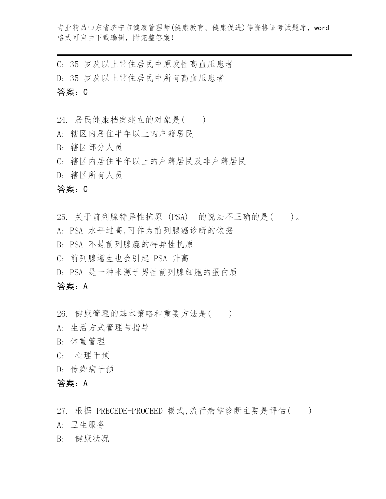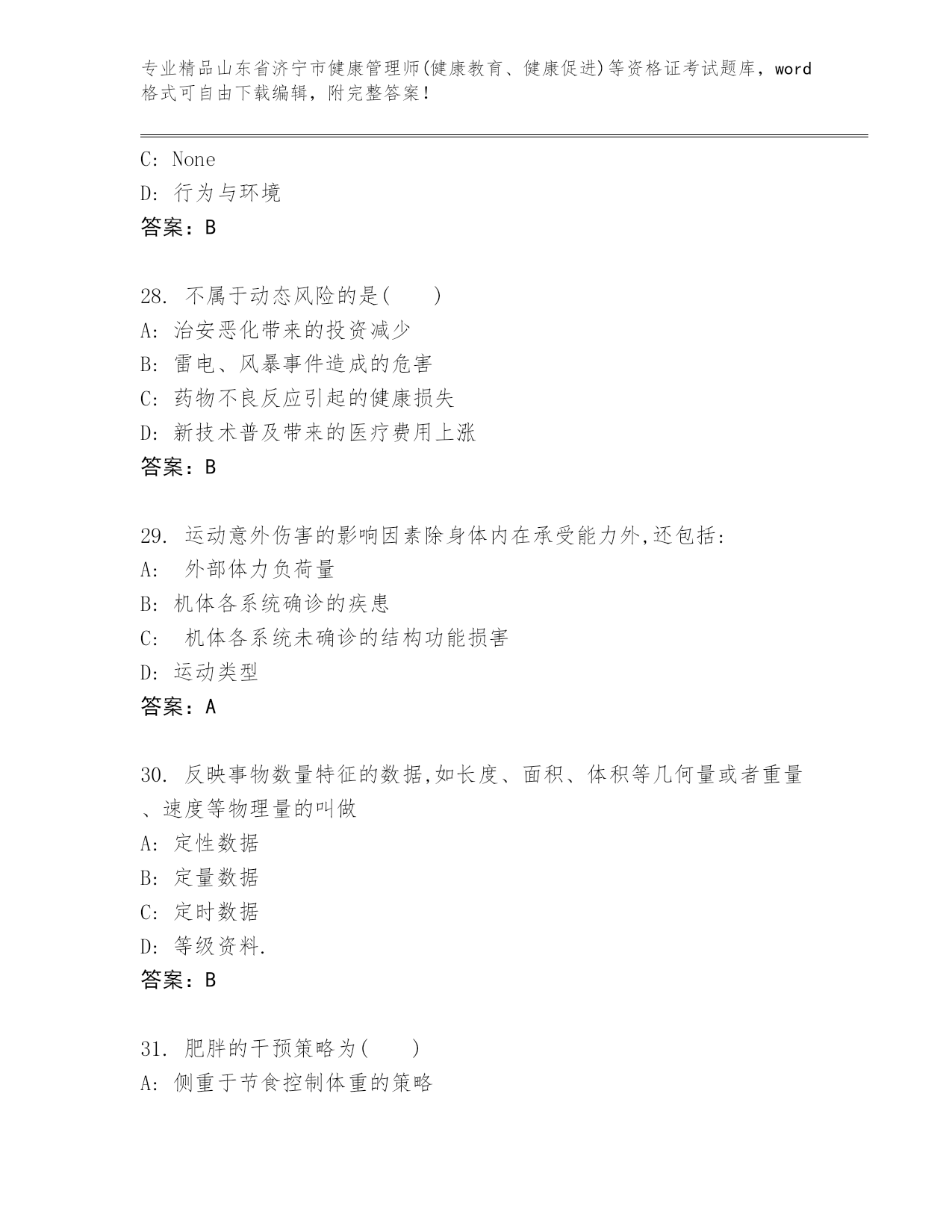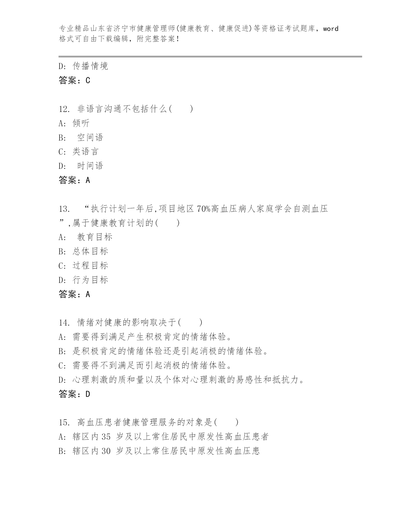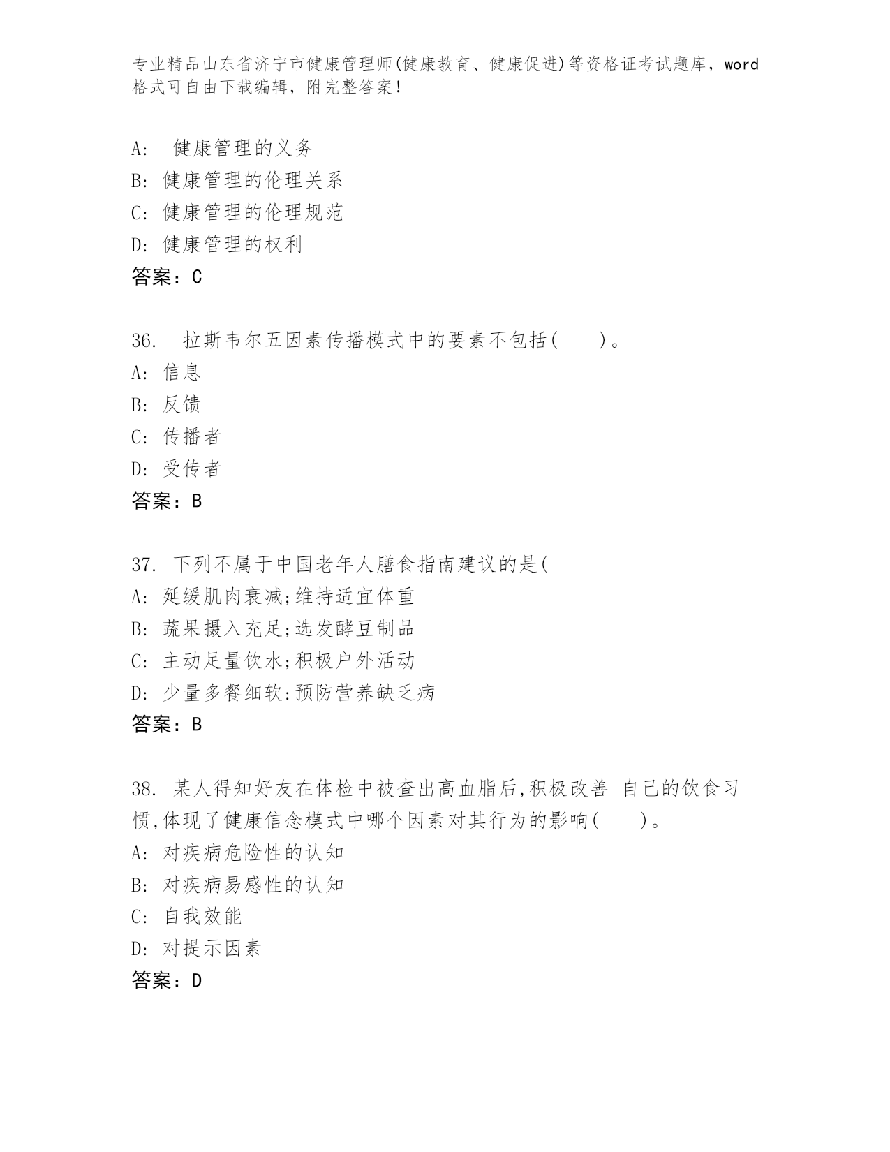 最新山东省济宁市健康管理师(健康教育、健康促进)等资格证考试精品题库推荐.docx