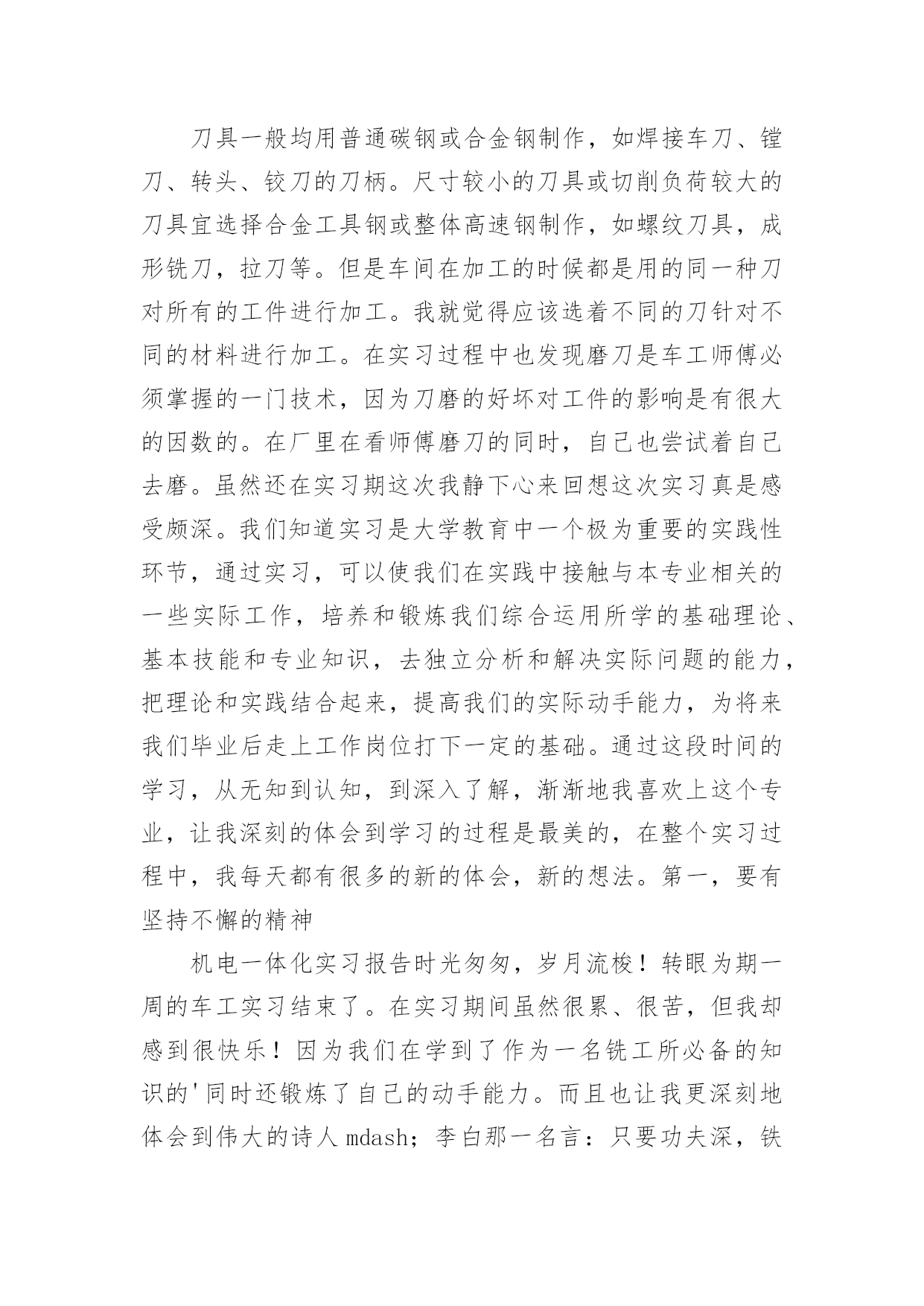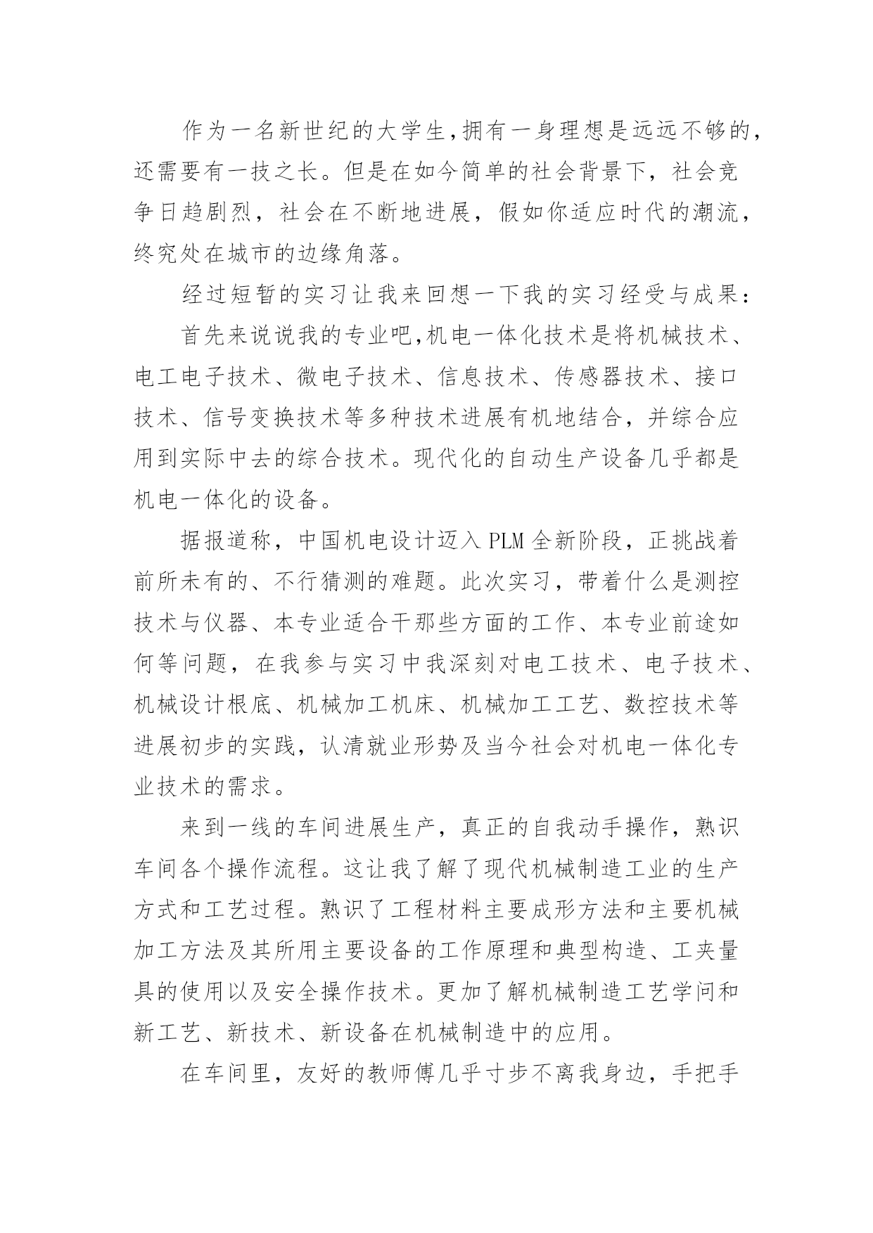 机电一体化心得当我们受到启发,对生活有了新的感悟时,将其记录在心得体会里,让自己铭记于心,这样有利于培养我们思考的习惯。但是心得体会有什么要求呢?以下是小编收集整理的机电一体化心得,仅供参考,希望能够帮助到大家。机电一体化心得1其实,对我们这些工科的学生来说这是一次理论与实习相结合的绝好机会,又将全面地检验我们知识水平。铣工实习是机械类各专业学生必修的实习性很强的技术基础课。学生在铣工实习过程中通过独立地实习操作,将有关机械制造的基本工艺知识、基本工艺方法和基本工艺实习等有机结合起来的,进行工程实习综合能力的训练及进行思想品德和素质的培养与锻练。铣工实习是培养学生实习能力的有效途径。又是我们大学生、工科类的大学生,院的学生的必修课,非常重要的也特别有铣工实习又是我们的一次实际掌握知识的机会,离开了课堂严谨的环境,我们会感受到车间的气氛。同时也更加感受到了当一名工人的心情,使我们更加清醒地认识到肩负的责任。1、铣台要放在便于工作和光线适宜的地方;钻床和砂轮一般应放在场地的边缘,以保证安全。1、了解铣削加工的工艺特点及加工范围。一、实习目的偏心距的间接测量方法式中刀具一般均用普通碳钢或合金钢制作,如焊接车刀、镗刀、转头、铰刀的刀柄。尺寸较小的刀具或切削负荷较大的刀具宜选择合金工具钢或整体高速钢制作,如螺纹刀具,成形铣刀,拉刀等。但是车间在加工的时候都是用的同一种刀对所有的工件进行加工。我就觉得应该选着不同的刀针对不同的材料进行加工。在实习过程中也发现磨刀是车工师傅必须掌握的一门技术,因为刀磨的好坏对工件的影响是有很大的因数的。在厂里在看师傅磨刀的同时,自己也尝试着自己去磨。虽然还在实习期这次我静下心来回想这次实习真是感受颇深。我们知道实习是大学教育中一个极为重要的实践性环节,通过实习,可以使我们在实践中接触与本专业相关的一些实际工作,培养和锻炼我们综合运用所学的基础理论、基本技能和专业知识,去独立分析和解决实际问题的能力,把理论和实践结合起来,提高我们的实际动手能力,为将来我们毕业后走上工作岗位打下一定的基础。通过这段时间的学习,从无知到认知,到深入了解,渐渐地我喜欢上这个专业,让我深刻的体会到学习的过程是最美的,在整个实习过程中,我每天都有很多的新的体会,新的想法。第一,要有坚持不懈的精神机电一体化实习报告时光匆匆,岁月流梭!转眼为期一周的车工实习结束了。在实习期间虽然很累、很苦,但我却感到很快乐!因为我们在学到了作为一名铣工所必备的知识的'同时还锻炼了自己的动手能力。而且也让我更深刻地体会到伟大的诗人mdash;李白那一名言:只要功夫深,铁杵磨成针的真正内涵!我们实习的第一天看了关于车工实习的有关的知识与我车工实习过程中的注意事项的碟片。看到那飞转的机器、飞溅的铁花,令我既担心又激动。担心的是,如果那飞转的机器隆隆声让人心惊肉跳和那鲜红的铁花四处飞溅的发出耀眼的的光芒令人眼花缭乱;激动的是,等待了将近一年的车工实习就要开始了。这是作为学生的我们第一次进入工厂当令人尊敬的工人,也是第一次到每一个工科学子一试身手的实习基地。我怎么会不激动万分呢。其中铣工的实习安全技术为:1、我们知道了铣工的主要内容为划线、錾削、锯削、锉削、刮削、研磨、钻孔、扩孔、铰孔、锪孔、攻螺纹、套螺纹、装配、和修理等等。了解了锉刀的构造、分类、选用、锉削姿势、锉削方法和质量的检测。①通过这次实习我们了解了现代机械制造工业的生产方式和工艺过程。熟悉工程材料主要成形方法和主要机械加工方法及其所用主要设备的工作原理和典型结构、工夹量具的使用以及安全操作技术。了解机械制造工艺知识和新工艺、新技术、新设备在机械制造中的应用。学院为了使我们更多了解机电产品、设备,提高对机电工程制造技术的认识,加深机电在工业各领域应用的感性认识,开阔视野,了解相关设备及技术资料,熟悉典型零件的加工工艺,特意安排了我们到几个拥有较多类型的机电一体化设备,生产技术较先进的工厂进行生产操作实习。在通机工厂的实习,了解了目前制造业的基本情况,只是由于机械行业特有的技术操作熟练性和其具有的较大风险性,很遗憾地,不能多做一些具体实践的操作,但是观察了一台机床的各个零件的生产加工过程及其装配过程,使许多自己从书本上学的知识鲜活了起来,明白了本专业在一些技术制造上的具体应用。在精机公司的实习中,极大地丰富了自己关于零件加工工艺的知识,拓展了自己的知识面。在这次实习中,感触最深的是了解了数控机床在机械制造业中的重要性,它是电子信息技术和传统机械加工技术结合的产物,它集现代精密机械、计算机、通信、液压气动、光电等多学科技术为一体,具有高效率、高精度、高自动化和高柔性等特点,是尖端工业所不可缺少的生产设备。目前我国绝大部分数控机床都是出自国外先进制造商,无论在数量上,精度,性能指标上,中国制造业都远远落后