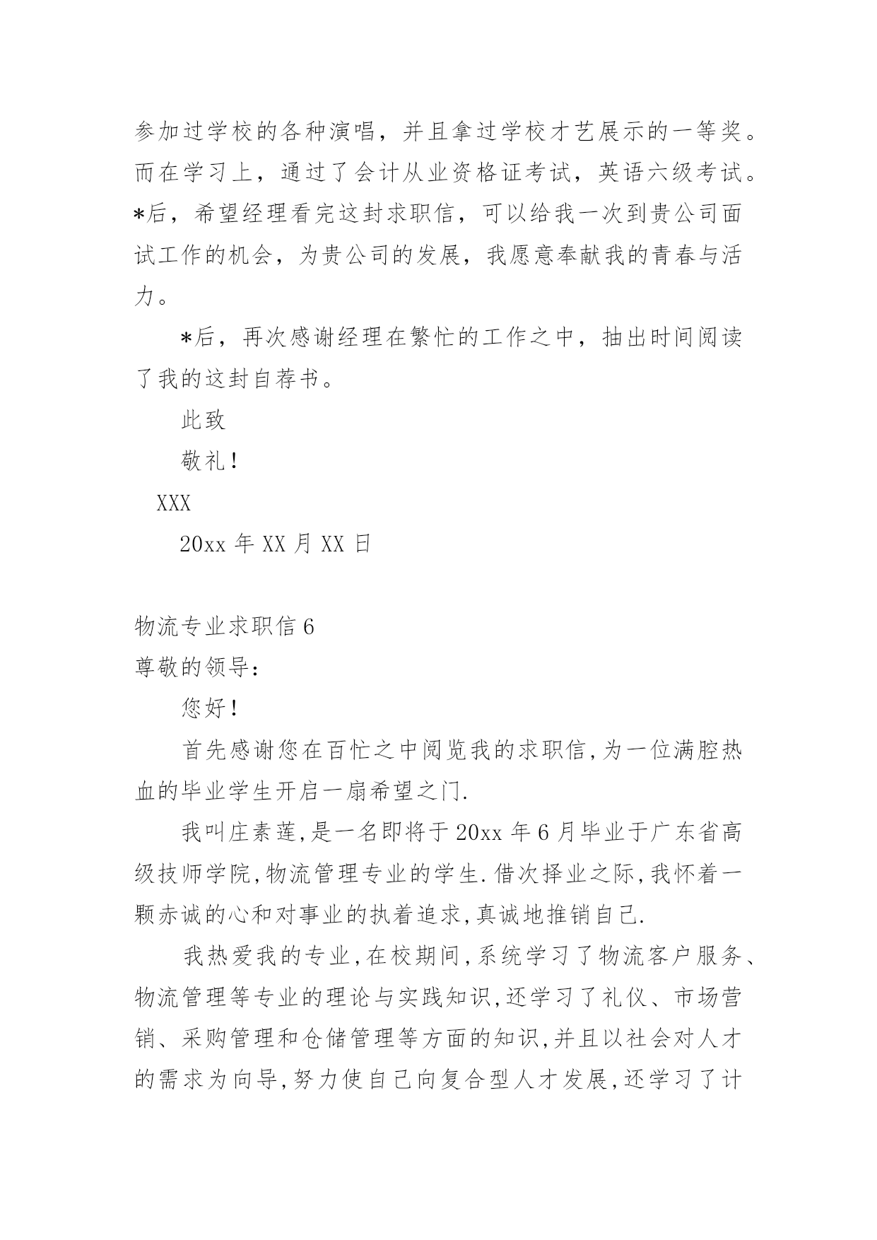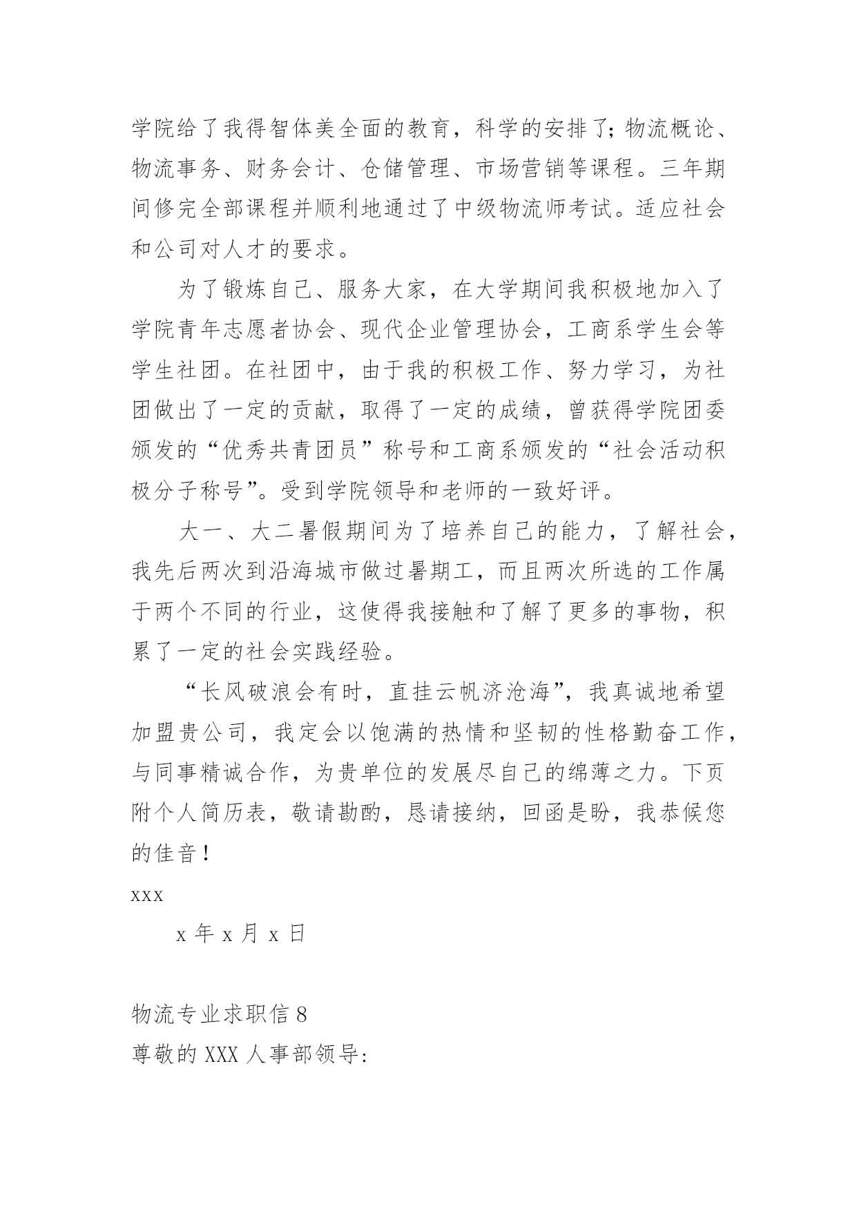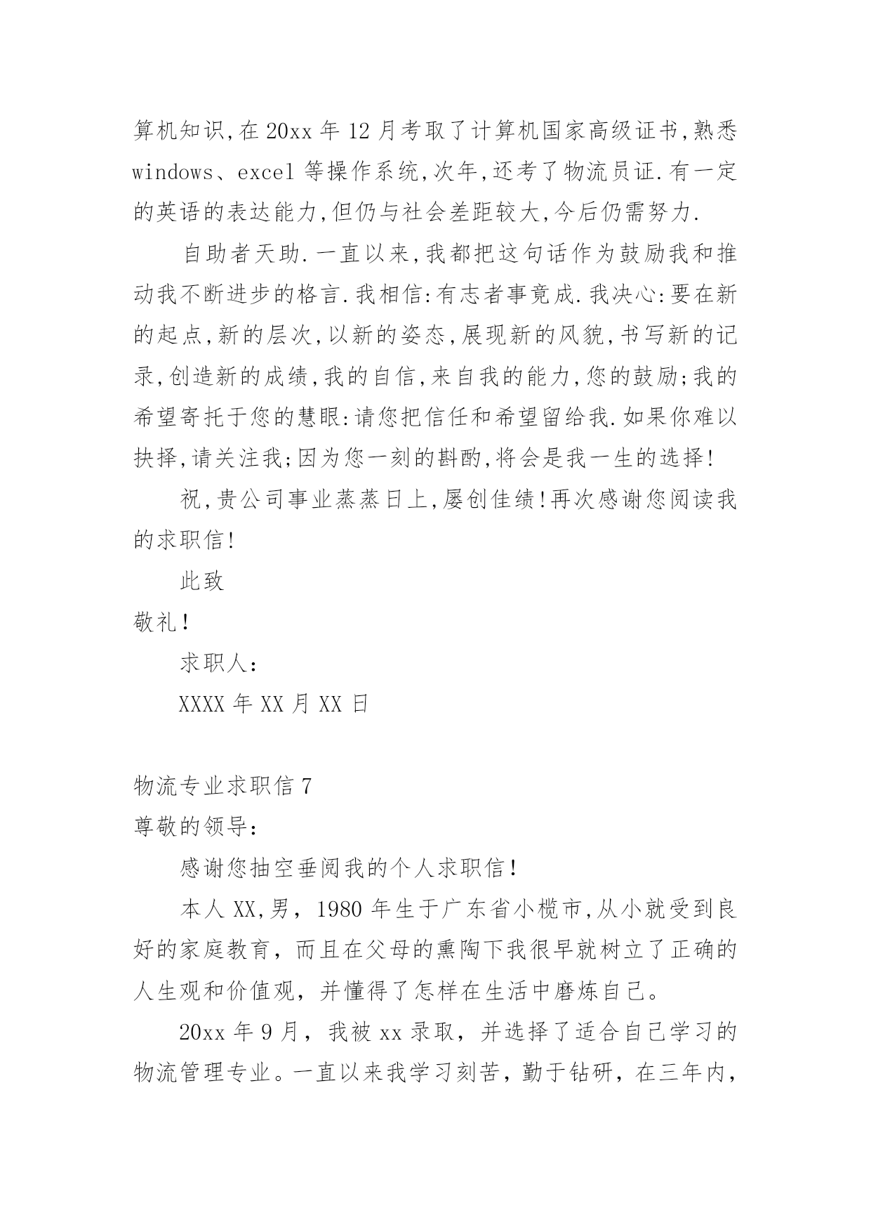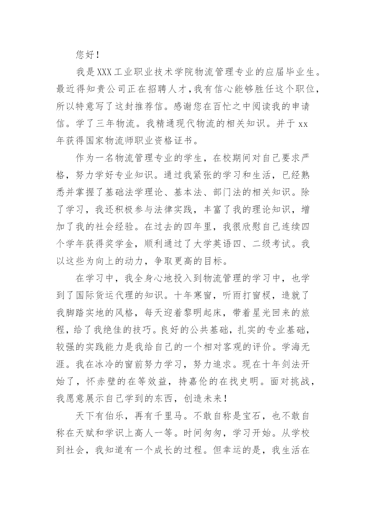 物流专业求职信物流专业求职信15篇光阴迅速,一眨眼就过去了,相信很多朋友又忙着找工作呢吧,现在的你想必是在写求职信吧。那么如何写求职信才简练、明确呢?下面是小编收集整理的物流专业求职信,仅供参考,大家一起来看看吧。物流专业求职信1尊敬的领导:您好!我叫xxx,是一名即将于xx年x月毕业于xx省高级技师学院,物流管理专业的学生。首先感谢您在百忙之中阅览我的求职信,为一位满腔热血的毕业学生开启一扇希望之门。借次择业之际,我怀着一颗赤诚的心和对事业的执着追求,真诚地推荐自己。我热爱我的专业,在校期间,系统学习物流客户服务、物流管理等专业的理论与实践知识,还学习礼仪、市场营销、采购管理和仓储管理等方面的知识,并且以社会对人才的需求为向导,努力使自己向复合型人才发展,还学习计算机知识,在xx年xx月考取计算机国家高级证书,熟悉windows、excel等操作系统,次年,还考物流员证。有一定的英语的表达能力,但仍与社会差距较大,今后仍需努力。自助者天助。一直以来,我都把这句话作为鼓励我和推动我不断进步的格言。我相信:有志者事竟成。我决心:要在新的起点,新的层次,以新的姿态,展现新的风貌,书写新的记录,创造新的成绩,我的自信,来自我的能力,您的鼓励;我的希望寄托于您的慧眼:请您把信任和希望留给我。如果你难以抉择,请关注我;因为您一刻的斟酌,将会是我一生的选择!恕冒昧,如果我能成为贵公司的一员,我定当用我的热情和能力投入到我的工作中去。请相信:你们所要实现的正是我想要达到的!求职人:日期:物流专业求职信2尊敬的领导:感谢您抽空垂阅我的个人求职信,以下权当作是我的个人求职自我介绍:本人XX,男,19xx年生于xx省xx市,从小就受到良好的家庭教育,而且在父母的熏陶下我很早就树立了正确的人生观和价值观,并懂得了怎样在生活中磨炼自己。20xx年9月,我被xxxxx学院录取,并选择了适合自己学习的物流管理专业。一直以来我学习刻苦,勤于钻研,在三年内,学院给了我得智体美全面的教育,科学的安排了;物流概论、物流事务、财务会计、仓储管理、市场营销等课程。三年期间修完全部课程并顺利地通过了中级物流师考试。适应社会和公司对人才的要求。为了锻炼自己、服务大家,在大学期间我积极地加入了学院青年志愿者协会、现代企业管理协会,工商系学生会等学生社团。在社团中,由于我的积极工作、努力学习,为社团做出了一定的贡献,取得了一定的成绩,曾获得学院团委颁发的“优秀共青团员”称号和工商系颁发的“社会活动积极分子称号”。受到学院领导和老师的一致好评。大一、大二暑假期间为了培养自己的能力,了解社会,我先后两次到沿海城市做过暑期工,而且两次所选的工作属于两个不同的行业,这使得我接触和了解了更多的事物,积累了一定的社会实践经验。毕业后,我进入xxxx有限公司担任物流操作员一职,在工作中我勤奋好学,刻苦钻研业务知识,团结同事,注重理论结合实际,使自己的工作能力得到很大提高,并且我利用业余时间自学江西财经大学市场调查与分析专业(本科)的课程,并已通过全部科目的考试,今年9月份即可颁发毕业证,通过自考的学习,提升了自身的理论水平,为将来更高层次的工作打下了坚实的基础。“长风破浪会有时,直挂云帆济沧海”,我真诚地希望加盟贵公司,我定会以饱满的热情和坚韧的性格勤奋工作,与同事精诚合作,为贵单位的发展尽自己的绵薄之力。下页附个人简历表,敬请勘酌,恳请接纳,回函是盼,我恭候您的佳音!致此礼敬!求职人:xxx日期物流专业求职信3尊敬的领导:您好!首先感谢您在百忙之中阅览我的求职信,为一位满腔热血的毕业学生开启了一扇希望之门。我叫庄xx,是一名即将于20xx年6月毕业于广东省技术师范学院,物流管理专业的学生。借次择业之际,我怀着一颗赤诚的心和对事业的执着追求,真诚地推销自己。我热爱我的专业,在校期间,系统学习了物流客户服务、物流管理等专业的理论与实践知识,还学习了礼仪、市场营销、采购管理和仓储管理等方面的知识,并且以社会对人才的需求为向导,努力使自己向复合型人才发展,还学习了计算机知识,在20xx年12月考取了计算机国家高级证书,熟悉windows、excel等操作系统,次年,还考了物流员证。有一定的英语的表达能力,但仍与社会差距较大,今后仍需努力。自助者天助。一直以来,我都把这句话作为鼓励我和推动我不断进步的格言。我相信:有志者事竟成。我决心:要在新的起点,新的层次,以新的姿态,展现新的风貌,书写新的记录,创造新的成绩,我的自信,来自我的能力,您的鼓励;我的希望寄托于您的慧眼:请您把信任和希望留给我。如果你难以抉择,请关注我;因为您一刻的斟酌,将会是我一生的选择!祝贵公司事业蒸蒸日上,再创佳绩!再次感谢您!此致敬礼物流专业求职信4尊敬的领导:您好!我的名字叫XXX,是XX职业学院物流管理专业的学生。