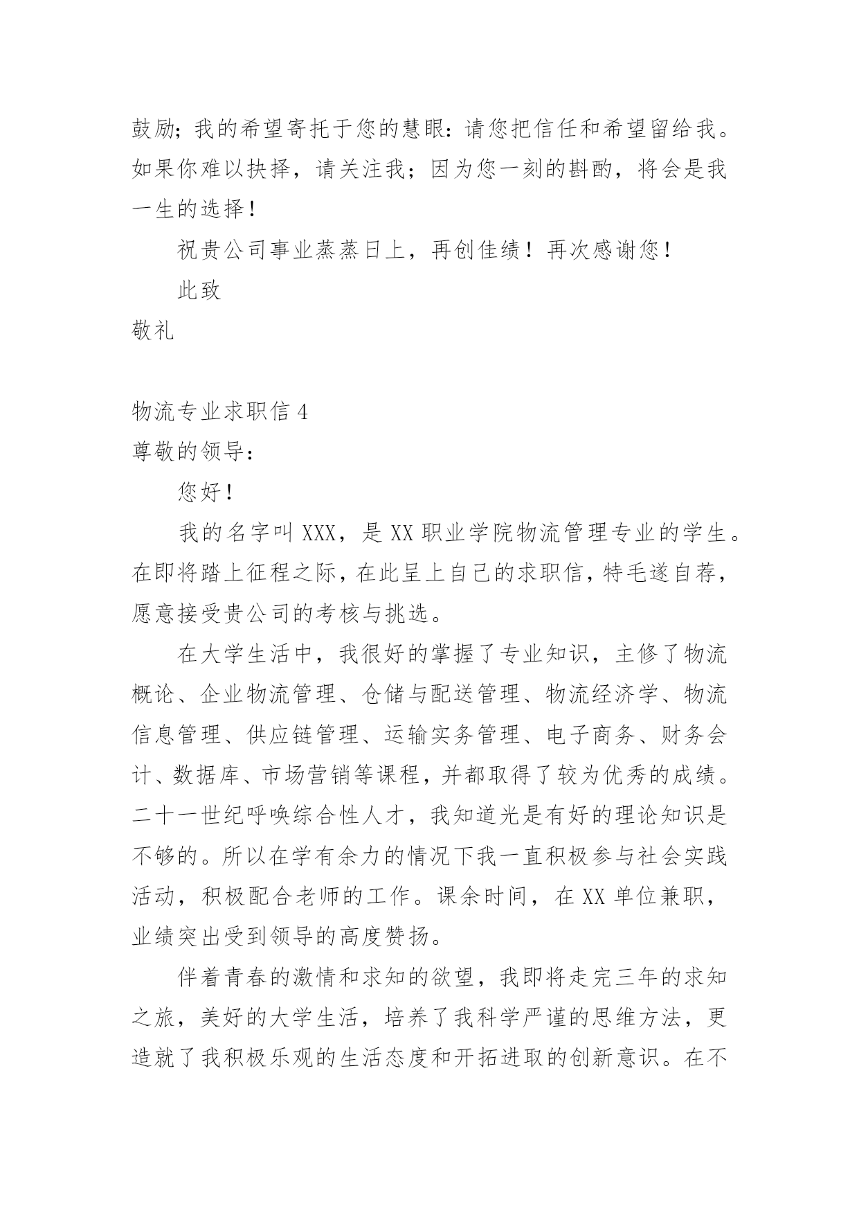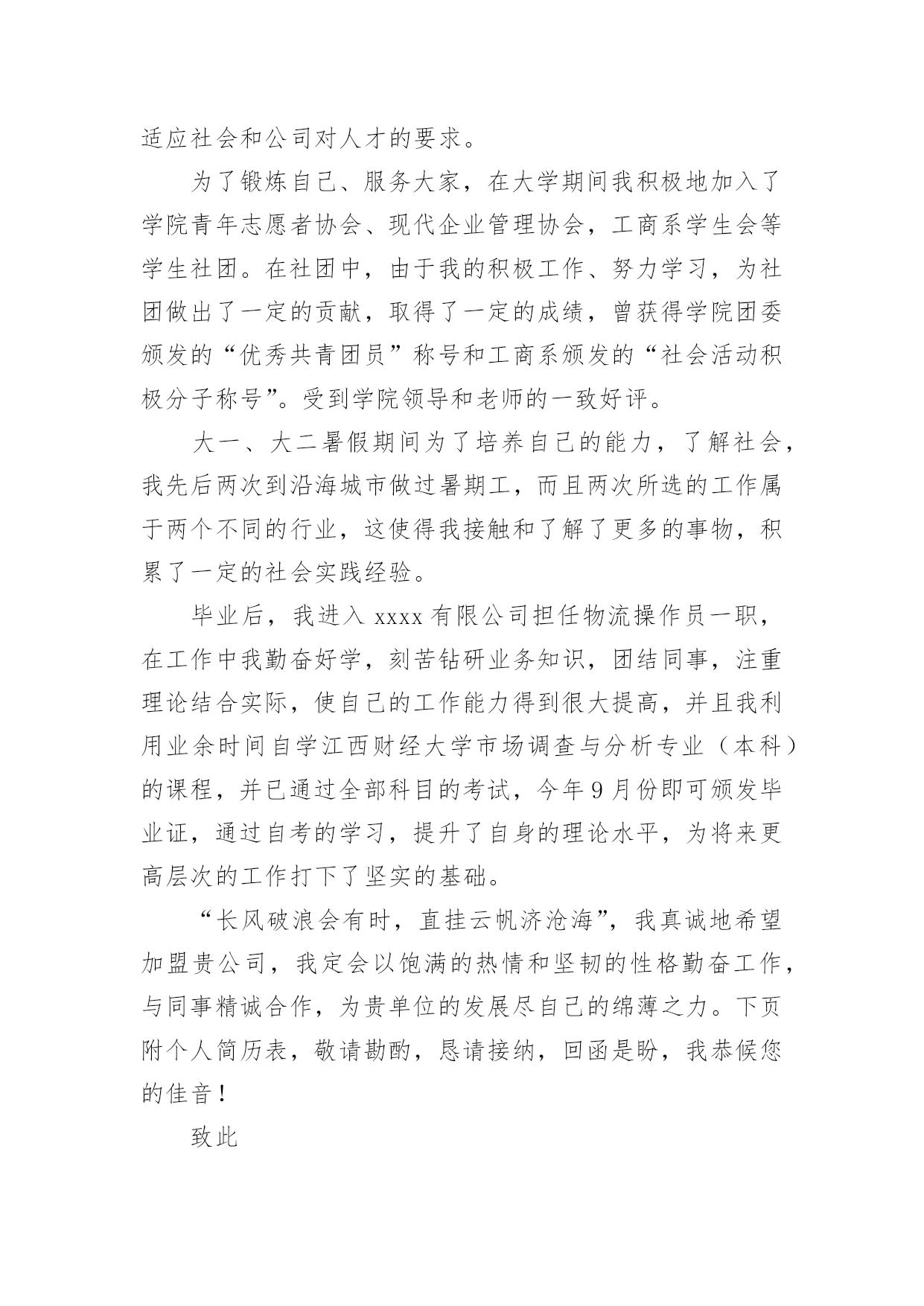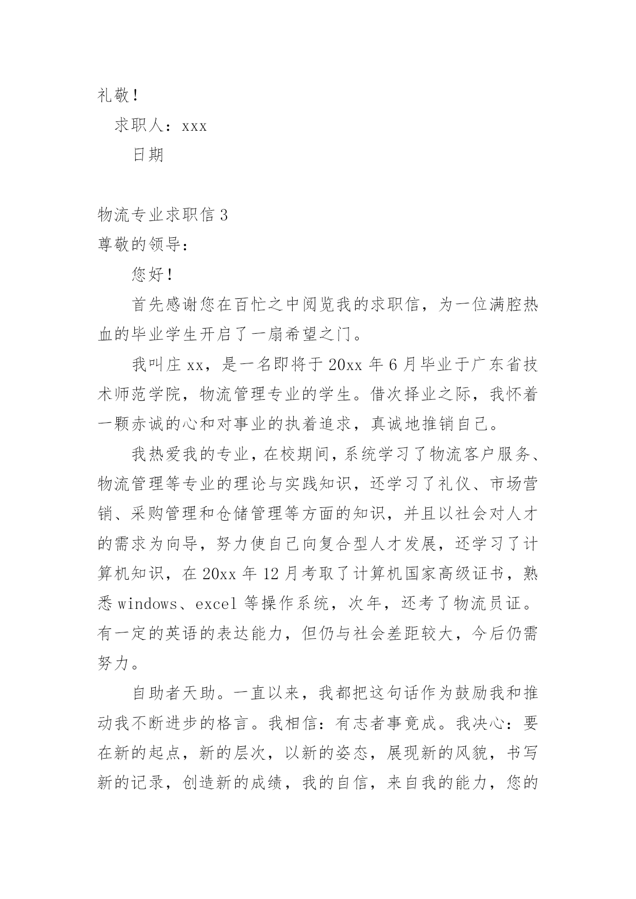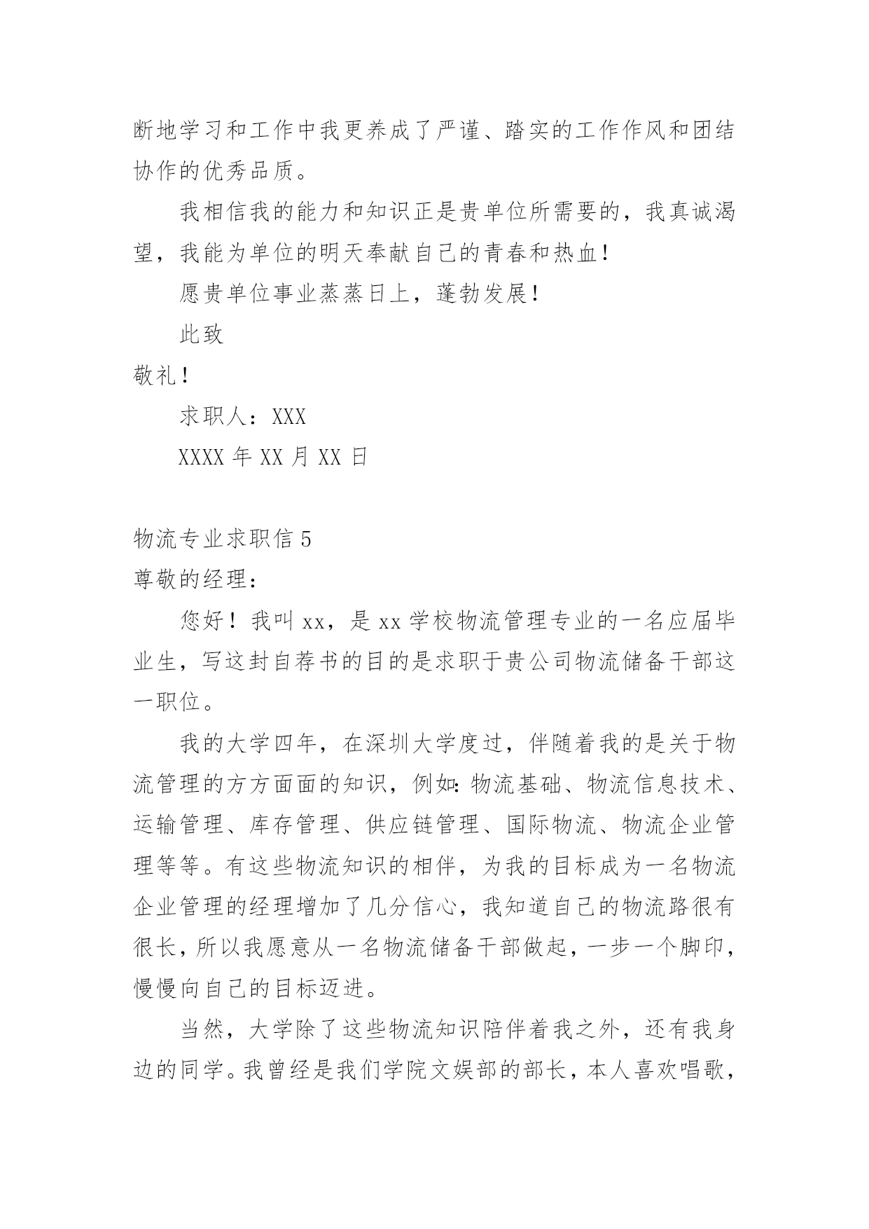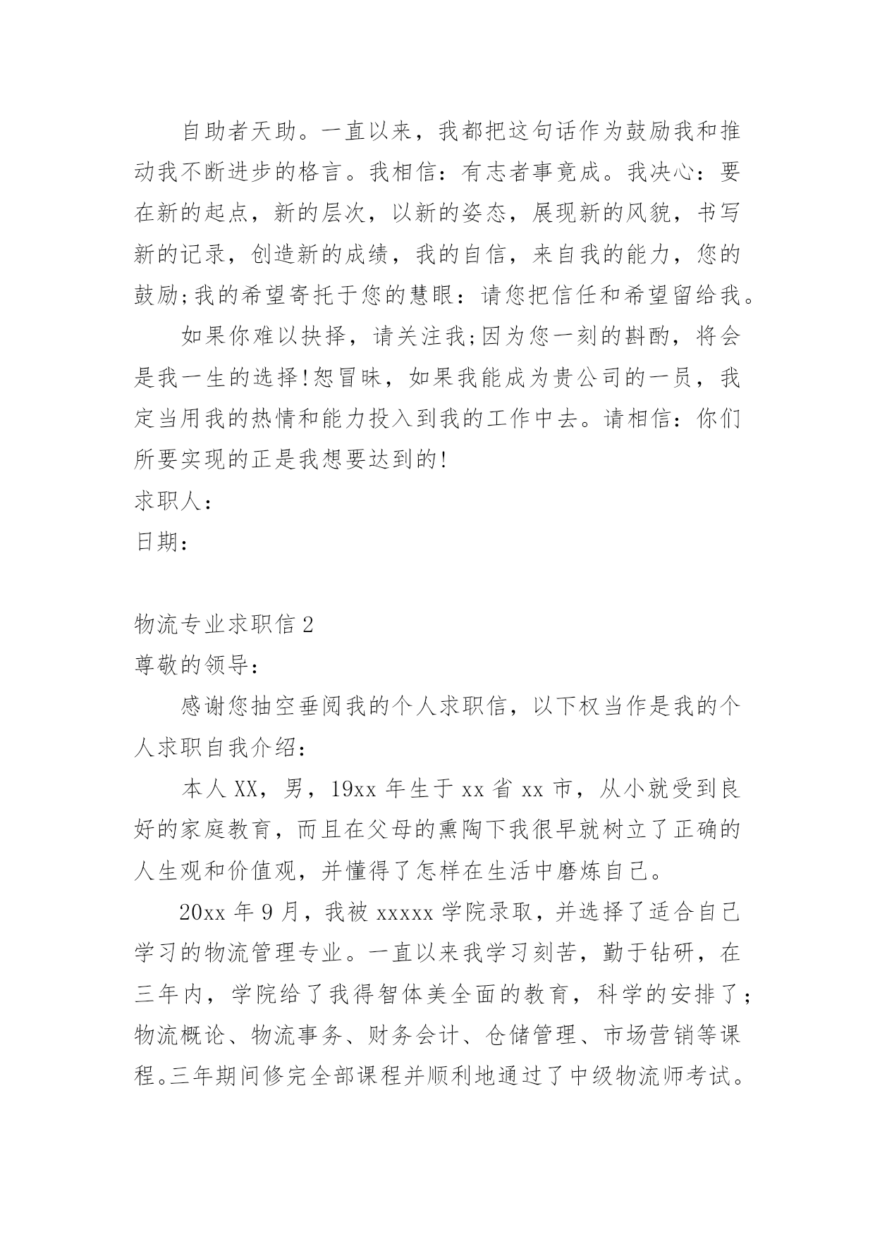 物流专业求职信物流专业求职信15篇光阴迅速,一眨眼就过去了,相信很多朋友又忙着找工作呢吧,现在的你想必是在写求职信吧。那么如何写求职信才简练、明确呢?下面是小编收集整理的物流专业求职信,仅供参考,大家一起来看看吧。物流专业求职信1尊敬的领导:您好!我叫xxx,是一名即将于xx年x月毕业于xx省高级技师学院,物流管理专业的学生。首先感谢您在百忙之中阅览我的求职信,为一位满腔热血的毕业学生开启一扇希望之门。借次择业之际,我怀着一颗赤诚的心和对事业的执着追求,真诚地推荐自己。我热爱我的专业,在校期间,系统学习物流客户服务、物流管理等专业的理论与实践知识,还学习礼仪、市场营销、采购管理和仓储管理等方面的知识,并且以社会对人才的需求为向导,努力使自己向复合型人才发展,还学习计算机知识,在xx年xx月考取计算机国家高级证书,熟悉windows、excel等操作系统,次年,还考物流员证。有一定的英语的表达能力,但仍与社会差距较大,今后仍需努力。自助者天助。一直以来,我都把这句话作为鼓励我和推动我不断进步的格言。我相信:有志者事竟成。我决心:要在新的起点,新的层次,以新的姿态,展现新的风貌,书写新的记录,创造新的成绩,我的自信,来自我的能力,您的鼓励;我的希望寄托于您的慧眼:请您把信任和希望留给我。如果你难以抉择,请关注我;因为您一刻的斟酌,将会是我一生的选择!恕冒昧,如果我能成为贵公司的一员,我定当用我的热情和能力投入到我的工作中去。请相信:你们所要实现的正是我想要达到的!求职人:日期:物流专业求职信2尊敬的领导:感谢您抽空垂阅我的个人求职信,以下权当作是我的个人求职自我介绍:本人XX,男,19xx年生于xx省xx市,从小就受到良好的家庭教育,而且在父母的熏陶下我很早就树立了正确的人生观和价值观,并懂得了怎样在生活中磨炼自己。20xx年9月,我被xxxxx学院录取,并选择了适合自己学习的物流管理专业。一直以来我学习刻苦,勤于钻研,在三年内,学院给了我得智体美全面的教育,科学的安排了;物流概论、物流事务、财务会计、仓储管理、市场营销等课程。三年期间修完全部课程并顺利地通过了中级物流师考试。适应社会和公司对人才的要求。为了锻炼自己、服务大家,在大学期间我积极地加入了学院青年志愿者协会、现代企业管理协会,工商系学生会等学生社团。在社团中,由于我的积极工作、努力学习,为社团做出了一定的贡献,取得了一定的成绩,曾获得学院团委颁发的“优秀共青团员”称号和工商系颁发的“社会活动积极分子称号”。受到学院领导和老师的一致好评。大一、大二暑假期间为了培养自己的能力,了解社会,我先后两次到沿海城市做过暑期工,而且两次所选的工作属于两个不同的行业,这使得我接触和了解了更多的事物,积累了一定的社会实践经验。毕业后,我进入xxxx有限公司担任物流操作员一职,在工作中我勤奋好学,刻苦钻研业务知识,团结同事,注重理论结合实际,使自己的工作能力得到很大提高,并且我利用业余时间自学江西财经大学市场调查与分析专业(本科)的课程,并已通过全部科目的考试,今年9月份即可颁发毕业证,通过自考的学习,提升了自身的理论水平,为将来更高层次的工作打下了坚实的基础。“长风破浪会有时,直挂云帆济沧海”,我真诚地希望加盟贵公司,我定会以饱满的热情和坚韧的性格勤奋工作,与同事精诚合作,为贵单位的发展尽自己的绵薄之力。下页附个人简历表,敬请勘酌,恳请接纳,回函是盼,我恭候您的佳音!致此礼敬!求职人:xxx日期物流专业求职信3尊敬的领导:您好!首先感谢您在百忙之中阅览我的求职信,为一位满腔热血的毕业学生开启了一扇希望之门。我叫庄xx,是一名即将于20xx年6月毕业于广东省技术师范学院,物流管理专业的学生。借次择业之际,我怀着一颗赤诚的心和对事业的执着追求,真诚地推销自己。我热爱我的专业,在校期间,系统学习了物流客户服务、物流管理等专业的理论与实践知识,还学习了礼仪、市场营销、采购管理和仓储管理等方面的知识,并且以社会对人才的需求为向导,努力使自己向复合型人才发展,还学习了计算机知识,在20xx年12月考取了计算机国家高级证书,熟悉windows、excel等操作系统,次年,还考了物流员证。有一定的英语的表达能力,但仍与社会差距较大,今后仍需努力。自助者天助。一直以来,我都把这句话作为鼓励我和推动我不断进步的格言。我相信:有志者事竟成。我决心:要在新的起点,新的层次,以新的姿态,展现新的风貌,书写新的记录,创造新的成绩,我的自信,来自我的能力,您的鼓励;我的希望寄托于您的慧眼:请您把信任和希望留给我。如果你难以抉择,请关注我;因为您一刻的斟酌,将会是我一生的选择!祝贵公司事业蒸蒸日上,再创佳绩!再次感谢您!此致敬礼物流专业求职信4尊敬的领导:您好!我的名字叫XXX,是XX职业学院物流管理专业的学生。