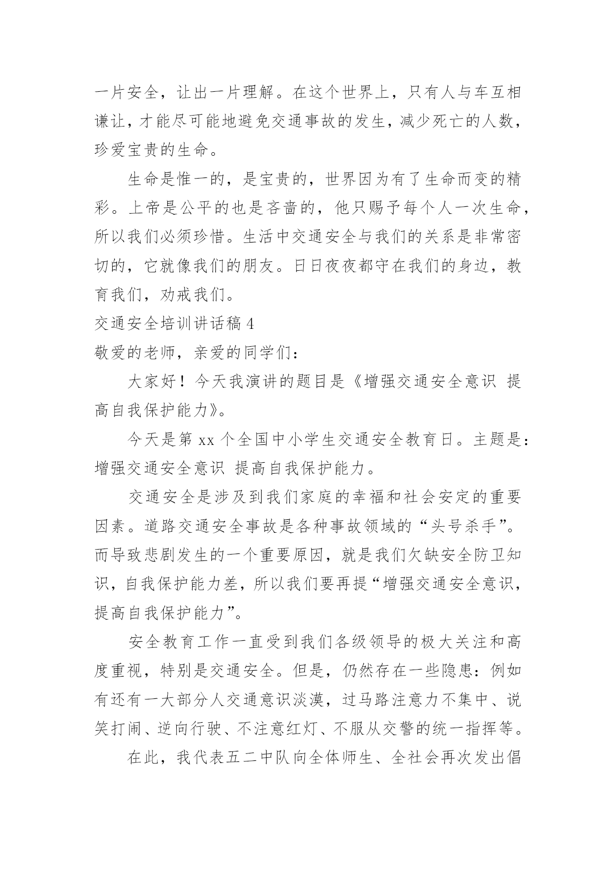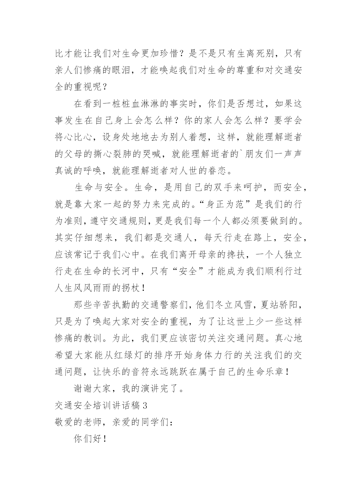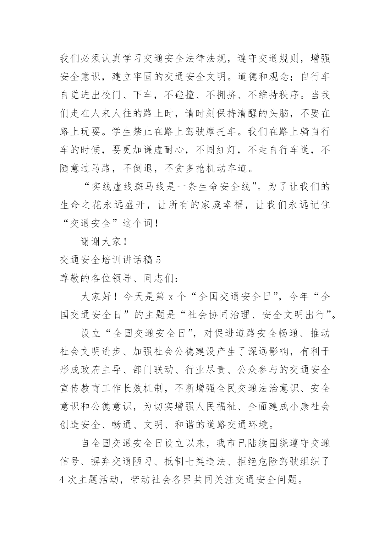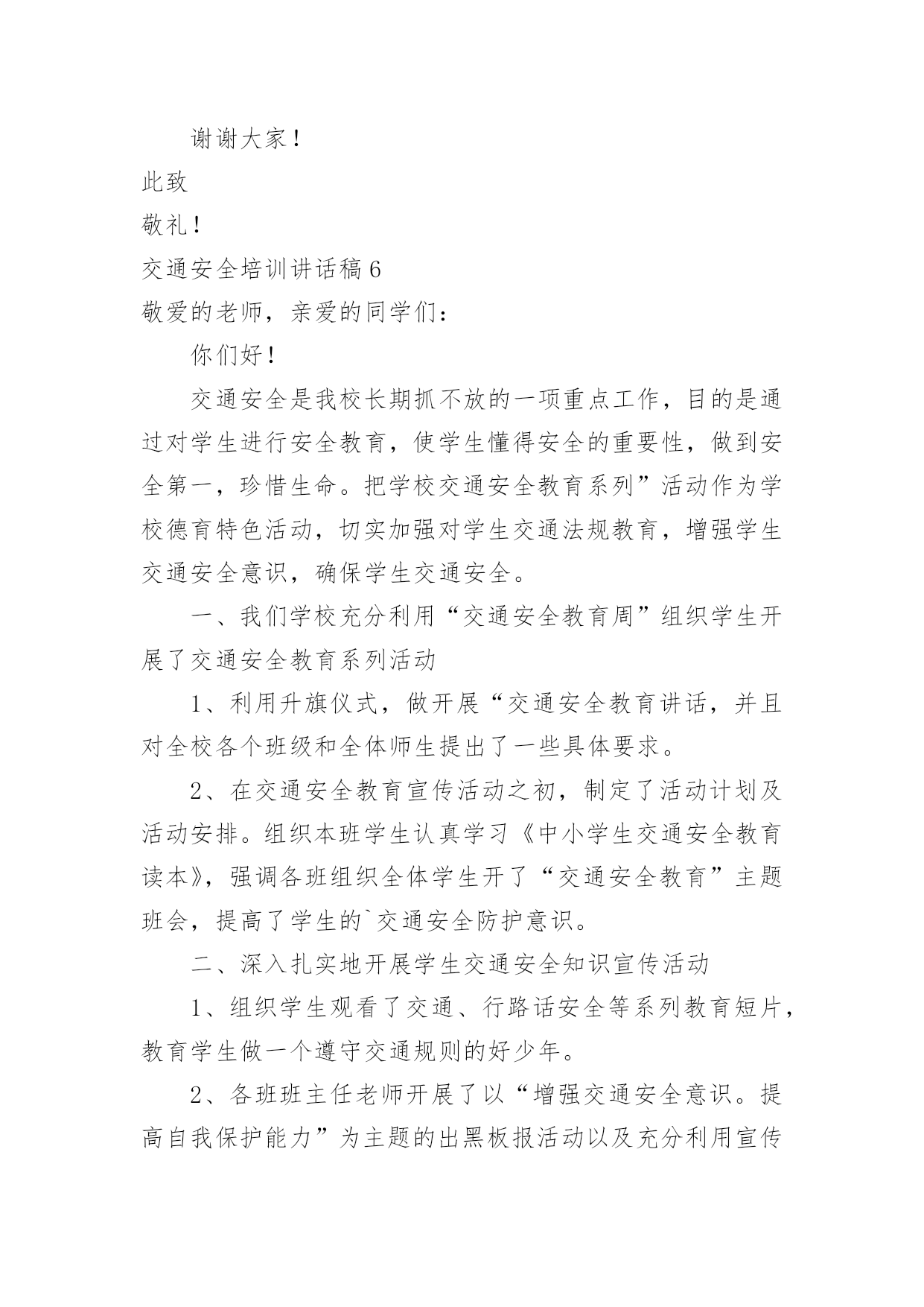 交通安全培训讲话稿交通安全培训讲话稿在发展不断提速的社会中,我们需要用到讲话稿的情形越来越多,讲话稿是指把在一定场合下所要讲的话事先用文字有条理的写出来的文稿。怎么写讲话稿才能避免踩雷呢?以下是小编精心整理的交通安全培训讲话稿,欢迎阅读,希望大家能够喜欢。交通安全培训讲话稿1尊敬的老师、亲爱的同学们:大家好!在现代社会,我们的生活离不开交通,交通安全也是一个不容忽视的'问题,必须言出必行,从我做起。然而,有些人不注意交通安全。你有没有想过,一点点的疏忽,可能会让你后悔一辈子?记得有一次,我从学校走回家的路上,突然听到不远处有“嘘——”的紧急刹车声和撞车声。听说一辆校车和一辆转弯的车相撞,车头撞上了校车尾部,校车的油漆被撞掉了,有的变形了,车的大灯也下来了。当时我的心猛地一抖,心想:校车上那么多学生有多危险!如果司机反应稍微慢一点,含苞待放的小花车可能还没开就被车祸撞死了。一想到这我就吓出一身冷汗。这时候双方业主吵起来了,我也靠近了一点。听说车主身上有股难闻的酒味,显然喝了不少酒。这时,交警也赶到现场处理交通事故。那些酒驾的人,不要让自己的生命徘徊在生死线上;不遵守交通规则的,请遵守交通规则!作为一名小学生,我必须以身作则,严格遵守交通规则。交通安全,从我做起。这是一个迫切的问题。让我们珍惜生命,关注交通安全。交通安全培训讲话稿2敬爱的各位老师,亲爱的各位同学:大家好!我今天演讲的题目是“生命与安全”。交通是一个考验人们社会秩序的法则,在交通安全这一块,就需要大家一起努力,把交通事故的发生率降到最低。这样,人们的生命安全就有了保障,寿命也会逐渐地延长。但是,总是会有那么一些人,在爱慕虚荣的时候,会想出和别人飙车的馊主意。这是不对的,这是对人类生命的亵渎。他们没有把交通法规放在眼里,更没有把他们放在心里。他们不仅没有遵守成文的交通法规,还违反了人类该有的社会公德心。试问,这样的人在世界上,人类在路上走时,生命会有高质量的保障吗?生命与安全,这是一个非常沉重的话题,是一个足以让人背负一生伤痛的话题,在这里,我也不忍心让这些伤痛的人再被回忆撕裂心扉。我只是在想,为什么交通安全意识的增长一定要用鲜血和泪水浇灌?为什么只有经过死亡的对比才能让我们对生命更加珍惜?是不是只有生离死别,只有亲人们惨痛的眼泪,才能唤起我们对生命的尊重和对交通安全的重视呢?在看到一桩桩血淋淋的事实时,你们是否想过,如果这事发生在自己身上会怎么样?你的家人会怎么样?要学会将心比心,设身处地地去为别人着想,这样,就能理解逝者的父母的撕心裂肺的哭喊,就能理解逝者的`朋友们一声声真诚的呼唤,就能理解逝者对人世的眷恋。生命与安全。生命,是用自己的双手来呵护,而安全,就是靠大家一起的努力来完成的。“身正为范”是我们的行为准则,遵守交通规则,更是我们每一个人都必须要做到的。其实仔细想来,我们都是交通人,每天行走在路上,安全,应该常记于我们心中。在我们离开母亲的搀扶,一个人独立行走在生命的长河中,只有“安全”才能成为我们顺利行过人生风风雨雨的拐杖!那些辛苦执勤的交通警察们,他们冬立风雪,夏站骄阳,只是为了唤起大家对安全的重视,为了让这世上少一些这样惨痛的教训。为此,我们更应该密切关注交通问题。真心地希望大家能从红绿灯的排序开始身体力行的关注我们的交通问题,让快乐的音符永远跳跃在属于自己的生命乐章!谢谢大家,我的演讲完了。交通安全培训讲话稿3敬爱的老师,亲爱的同学们:你们好!宽阔的马路,先进的道路安全设施,一直在更新的交通法规,难道真能对交通安全起到持久稳固的作用吗?如果是,那为何交通事故还是年年不断的频繁发生?可见交通安全保障并没有达到真正的效果。而这究竟又是谁的'错呢?这是人们的错。国家给了我们交通安全的保障,得失我们往往却只顾自己的方便,只顾自己的利益,并未能好好的遵守交通法规。大家想过如此的后果会是怎样的吗?看!那辆超载的大卡车正吃力的前进着,司机见了红灯也不停车,随意乱闯,只是为了赶交差,得一笔工钱,不顾违章的后果。可这位司机知道吗?只是为了这么一笔工钱违反交规,一刹那间就很有可能会葬送生命,而这无价的生命又岂是金钱可以买到的?看!那场悲剧终究还是上演了,鲜血染红了车轮,受害者的亲人悲痛万分……啊!又是一场悲剧!人行道上,一辆摩托车疾速行驶,将一位老奶奶撞倒在地,老奶奶立马气绝身亡。我不明白,摩托车司机为什么不按道行驶而偏偏要闯入非机动车道呢?只是图方便、图省事,却致使又一个宝贵的生命离开了这个世界。而这又会使多少人为受害者伤心泪流,使家庭因之而破碎啊!在交通安全的维护上,我们每个人都有责任和义务。生命可贵却脆弱,希望人人都能自觉遵守交通规则,让我们生活的环境更安全更美好。人让车,让出一片温情,让出一片秩序;车让人,让出一片安全,让出一片理解。在这个世界上,只有人与车