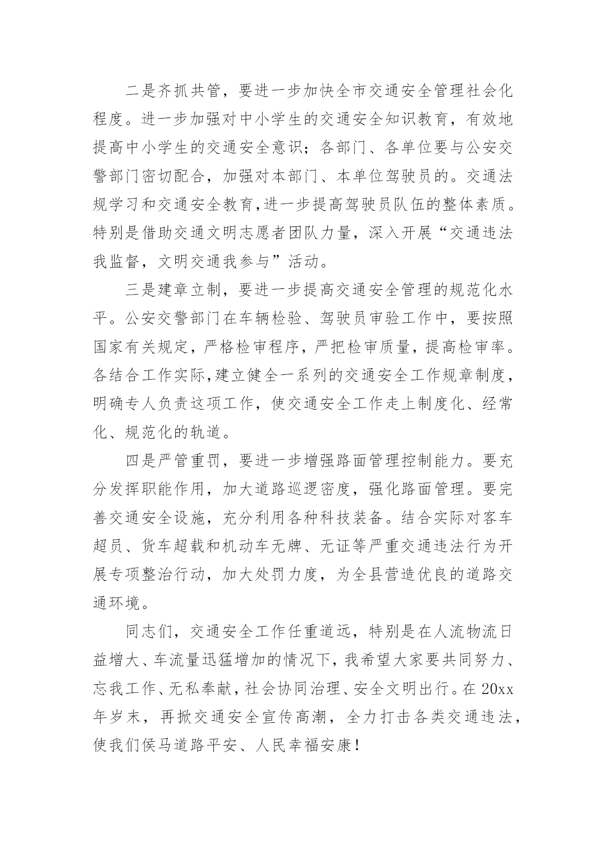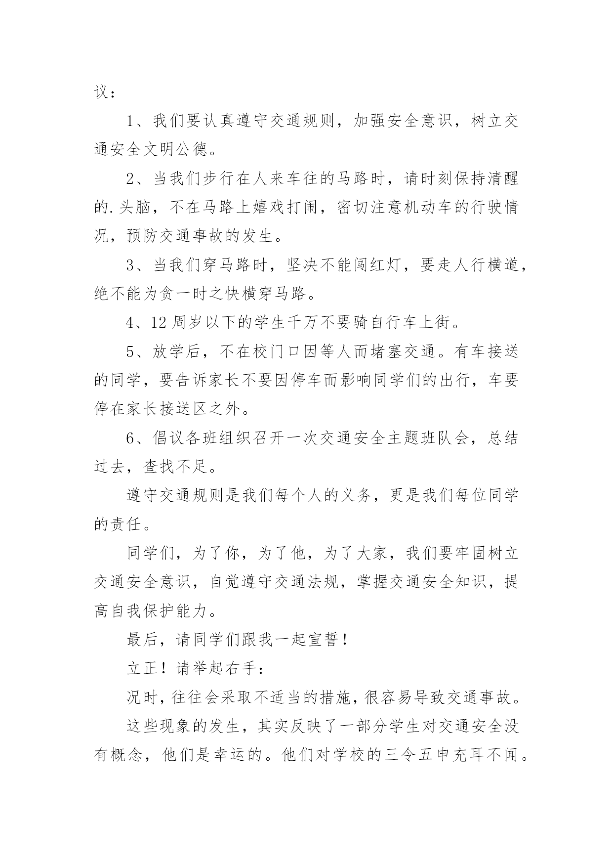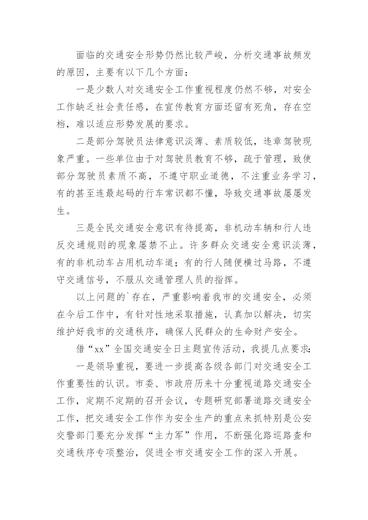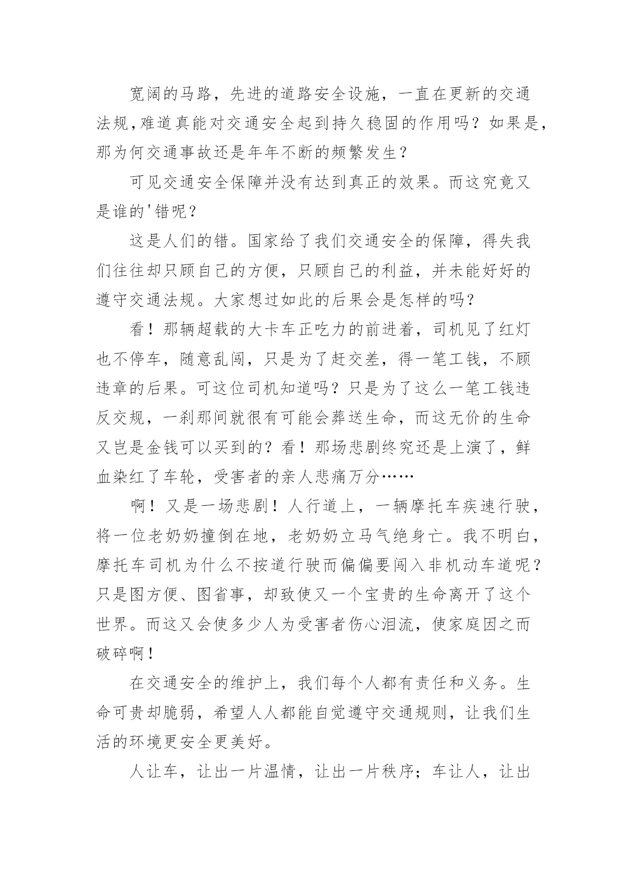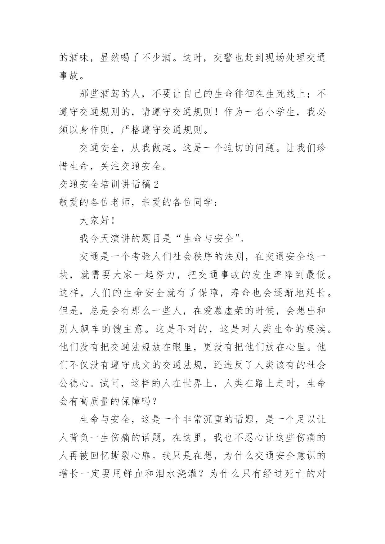 交通安全培训讲话稿交通安全培训讲话稿在发展不断提速的社会中,我们需要用到讲话稿的情形越来越多,讲话稿是指把在一定场合下所要讲的话事先用文字有条理的写出来的文稿。怎么写讲话稿才能避免踩雷呢?以下是小编精心整理的交通安全培训讲话稿,欢迎阅读,希望大家能够喜欢。交通安全培训讲话稿1尊敬的老师、亲爱的同学们:大家好!在现代社会,我们的生活离不开交通,交通安全也是一个不容忽视的'问题,必须言出必行,从我做起。然而,有些人不注意交通安全。你有没有想过,一点点的疏忽,可能会让你后悔一辈子?记得有一次,我从学校走回家的路上,突然听到不远处有“嘘——”的紧急刹车声和撞车声。听说一辆校车和一辆转弯的车相撞,车头撞上了校车尾部,校车的油漆被撞掉了,有的变形了,车的大灯也下来了。当时我的心猛地一抖,心想:校车上那么多学生有多危险!如果司机反应稍微慢一点,含苞待放的小花车可能还没开就被车祸撞死了。一想到这我就吓出一身冷汗。这时候双方业主吵起来了,我也靠近了一点。听说车主身上有股难闻的酒味,显然喝了不少酒。这时,交警也赶到现场处理交通事故。那些酒驾的人,不要让自己的生命徘徊在生死线上;不遵守交通规则的,请遵守交通规则!作为一名小学生,我必须以身作则,严格遵守交通规则。交通安全,从我做起。这是一个迫切的问题。让我们珍惜生命,关注交通安全。交通安全培训讲话稿2敬爱的各位老师,亲爱的各位同学:大家好!我今天演讲的题目是“生命与安全”。交通是一个考验人们社会秩序的法则,在交通安全这一块,就需要大家一起努力,把交通事故的发生率降到最低。这样,人们的生命安全就有了保障,寿命也会逐渐地延长。但是,总是会有那么一些人,在爱慕虚荣的时候,会想出和别人飙车的馊主意。这是不对的,这是对人类生命的亵渎。他们没有把交通法规放在眼里,更没有把他们放在心里。他们不仅没有遵守成文的交通法规,还违反了人类该有的社会公德心。试问,这样的人在世界上,人类在路上走时,生命会有高质量的保障吗?生命与安全,这是一个非常沉重的话题,是一个足以让人背负一生伤痛的话题,在这里,我也不忍心让这些伤痛的人再被回忆撕裂心扉。我只是在想,为什么交通安全意识的增长一定要用鲜血和泪水浇灌?为什么只有经过死亡的对比才能让我们对生命更加珍惜?是不是只有生离死别,只有亲人们惨痛的眼泪,才能唤起我们对生命的尊重和对交通安全的重视呢?在看到一桩桩血淋淋的事实时,你们是否想过,如果这事发生在自己身上会怎么样?你的家人会怎么样?要学会将心比心,设身处地地去为别人着想,这样,就能理解逝者的父母的撕心裂肺的哭喊,就能理解逝者的`朋友们一声声真诚的呼唤,就能理解逝者对人世的眷恋。生命与安全。生命,是用自己的双手来呵护,而安全,就是靠大家一起的努力来完成的。“身正为范”是我们的行为准则,遵守交通规则,更是我们每一个人都必须要做到的。其实仔细想来,我们都是交通人,每天行走在路上,安全,应该常记于我们心中。在我们离开母亲的搀扶,一个人独立行走在生命的长河中,只有“安全”才能成为我们顺利行过人生风风雨雨的拐杖!那些辛苦执勤的交通警察们,他们冬立风雪,夏站骄阳,只是为了唤起大家对安全的重视,为了让这世上少一些这样惨痛的教训。为此,我们更应该密切关注交通问题。真心地希望大家能从红绿灯的排序开始身体力行的关注我们的交通问题,让快乐的音符永远跳跃在属于自己的生命乐章!谢谢大家,我的演讲完了。交通安全培训讲话稿3敬爱的老师,亲爱的同学们:你们好!宽阔的马路,先进的道路安全设施,一直在更新的交通法规,难道真能对交通安全起到持久稳固的作用吗?如果是,那为何交通事故还是年年不断的频繁发生?可见交通安全保障并没有达到真正的效果。而这究竟又是谁的'错呢?这是人们的错。国家给了我们交通安全的保障,得失我们往往却只顾自己的方便,只顾自己的利益,并未能好好的遵守交通法规。大家想过如此的后果会是怎样的吗?看!那辆超载的大卡车正吃力的前进着,司机见了红灯也不停车,随意乱闯,只是为了赶交差,得一笔工钱,不顾违章的后果。可这位司机知道吗?只是为了这么一笔工钱违反交规,一刹那间就很有可能会葬送生命,而这无价的生命又岂是金钱可以买到的?看!那场悲剧终究还是上演了,鲜血染红了车轮,受害者的亲人悲痛万分……啊!又是一场悲剧!人行道上,一辆摩托车疾速行驶,将一位老奶奶撞倒在地,老奶奶立马气绝身亡。我不明白,摩托车司机为什么不按道行驶而偏偏要闯入非机动车道呢?只是图方便、图省事,却致使又一个宝贵的生命离开了这个世界。而这又会使多少人为受害者伤心泪流,使家庭因之而破碎啊!在交通安全的维护上,我们每个人都有责任和义务。生命可贵却脆弱,希望人人都能自觉遵守交通规则,让我们生活的环境更安全更美好。人让车,让出一片温情,让出一片秩序;车让人,让出一片安全,让出一片理解。在这个世界上,只有人与车