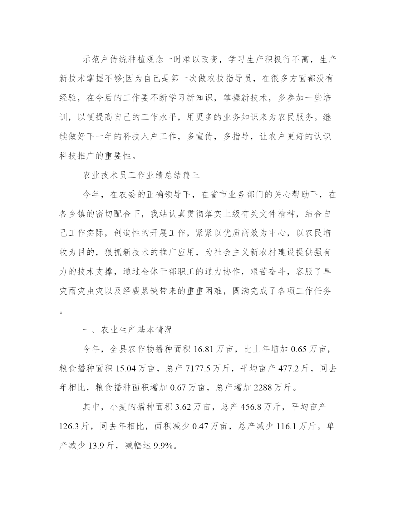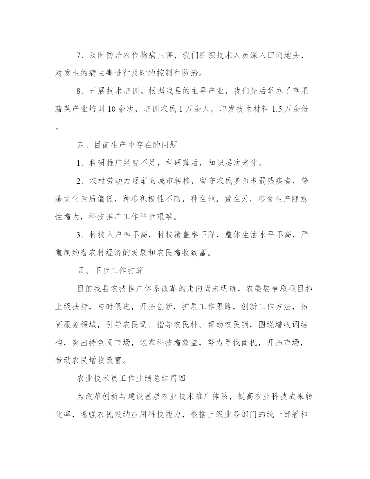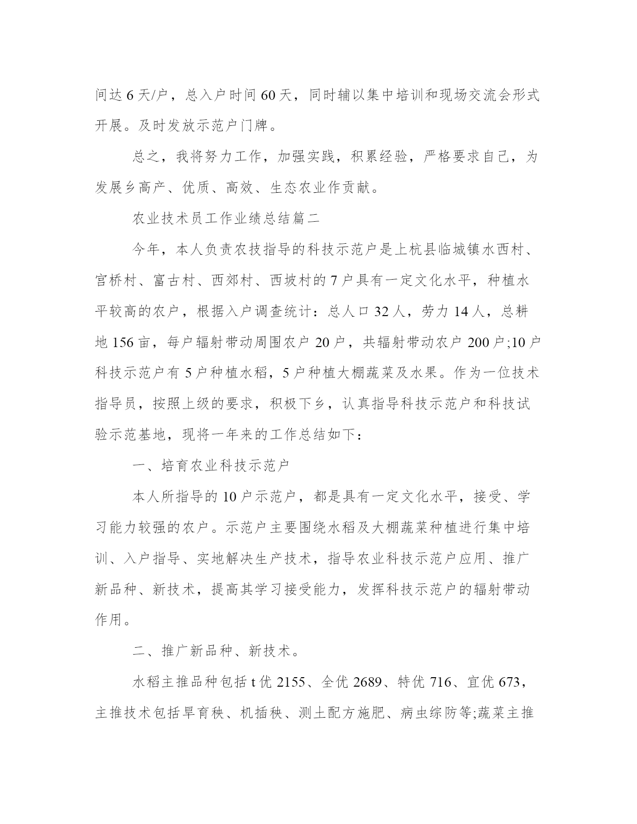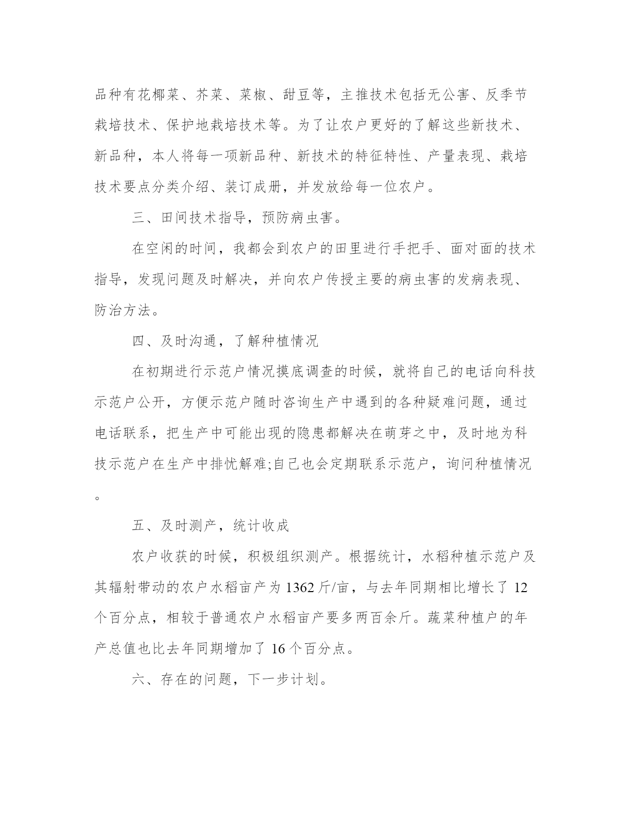 最新农业技术员工作业绩总结(12篇)总结是对过去一定时期的工作、学习或思想情况进行回顾、分析,并做出客观评价的书面材料,它有助于我们寻找工作和事物发展的规律,从而掌握并运用这些规律,是时候写一份总结了。优秀的总结都具备一些什么特点呢?又该怎么写呢?下面是小编整理的个人今后的总结范文,欢迎阅读分享,希望对大家有所帮助。农业技术员工作业绩总结篇一一、积极参加业务学习,提高自己的业务素质开展科技入户示范工程后,积极参加了县农委组织的各期培训学习,全面学习了小麦、水稻、大豆等有关知识,更新了知识,拓宽了视野,提高了业务素质,增强了指导示范户的服务能力。二、加强宣传、营造氛围农业科技推广是传统农业向现代农业转变的机制创新,为争取社会各界对农业科技推广的支持,使全社会特别是广大农民更多地了解和积极参与农业科技推广工程,采取广播、电视、黑板报、标语等多种形式宣传农业科技推广工作,宣传农业科技示范县的政策,宣传面向市场的现代农业生产技术,取得了较好的效果。三、精心选择高素质科技示范户农业科技推广在我乡以种植业为主,科技示范户理所当然的要有一定的种植水平,同时要有较强的号召力和影响力,能够将先进的农业科技在周边群众中推广开来。经过综合考虑,选择了10户素质较高的农户,作为科技示范户。对10户示范户进行挨家挨户走访,详细了解各农户的基本情况,了解他们对农业生产技术的需求,摸清当地耕作制度,并登记示范户的相关信息,收集他们对农技推广工作的各种意见、建议。同时做好宣传工作,加强科技示范户对农业科技推广工作的了解。要求每户示范户带动20户辐射户,全面带动各村民小组的所有农户学科学用科学。四、加强农业生产新技术的推广与应用通过科技入户示范工程,我所指导的示范户和辐射带动户上有了很大的提高。在摸清了各户的基本情况、了解了各户的需求后,精心设计了针对各户的技术指导方案。一年主要推广应用了:测土配方施用bb控释肥技术,不但节约了成本,保护农田环境,为实现农业增产、增收相统一的目标打下基础。五、入户指导方式灵活多样农业科技推广的关键在于入户,培训指导,传授技术,推广各项农业新技术到田到户。为提高专业技术水平、入户指导技能和示范户农民的科技素质。我根据技术指导方案和农民的需求,在农业生产关键环节(如备耕、播种、田间管理、病虫害多发期等),到每个示范户家中开展技术指导、培训和信息服务,与联系户保持电话联系,确保技术和信息服务通畅。在指导方式上采用入户指导为主,半年来入户时间达6天/户,总入户时间60天,同时辅以集中培训和现场交流会形式开展。及时发放示范户门牌。总之,我将努力工作,加强实践,积累经验,严格要求自己,为发展乡高产、优质、高效、生态农业作贡献。农业技术员工作业绩总结篇二今年,本人负责农技指导的科技示范户是上杭县临城镇水西村、宫桥村、富古村、西郊村、西坡村的7户具有一定文化水平,种植水平较高的农户,根据入户调查统计:总人口32人,劳力14人,总耕地156亩,每户辐射带动周围农户20户,共辐射带动农户200户;10户科技示范户有5户种植水稻,5户种植大棚蔬菜及水果。作为一位技术指导员,按照上级的要求,积极下乡,认真指导科技示范户和科技试验示范基地,现将一年来的工作总结如下:一、培育农业科技示范户本人所指导的10户示范户,都是具有一定文化水平,接受、学习能力较强的农户。示范户主要围绕水稻及大棚蔬菜种植进行集中培训、入户指导、实地解决生产技术,指导农业科技示范户应用、推广新品种、新技术,提高其学习接受能力,发挥科技示范户的辐射带动作用。二、推广新品种、新技术。水稻主推品种包括t优2155、全优2689、特优716、宜优673,主推技术包括旱育秧、机插秧、测土配方施肥、病虫综防等;蔬菜主推品种有花椰菜、芥菜、菜椒、甜豆等,主推技术包括无公害、反季节栽培技术、保护地栽培技术等。为了让农户更好的了解这些新技术、新品种,本人将每一项新品种、新技术的特征特性、产量表现、栽培技术要点分类介绍、装订成册,并发放给每一位农户。三、田间技术指导,预防病虫害。在空闲的时间,我都会到农户的田里进行手把手、面对面的技术指导,发现问题及时解决,并向农户传授主要的病虫害的发病表现、防治方法。四、及时沟通,了解种植情况在初期进行示范户情况摸底调查的时候,就将自己的电话向科技示范户公开,方便示范户随时咨询生产中遇到的各种疑难问题,通过电话联系,把生产中可能出现的隐患都解决在萌芽之中,及时地为科技示范户在生产中排忧解难;自己也会定期联系示范户,询问种植情况。五、及时测产,统计收成农户收获的时候,积极组织测产。根据统计,水稻种植示范户及其辐射带动的农户水稻亩产为1362斤/亩,与去年同期相比增长了12个百分点,相较于普通农户水稻亩产要多两百余斤。蔬