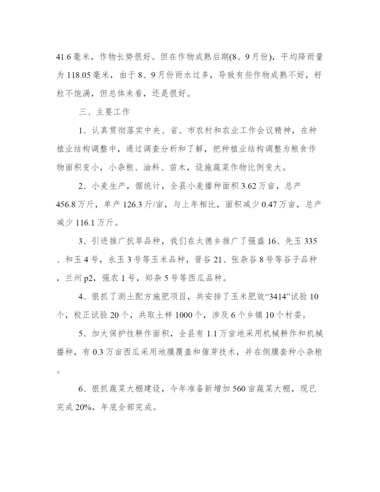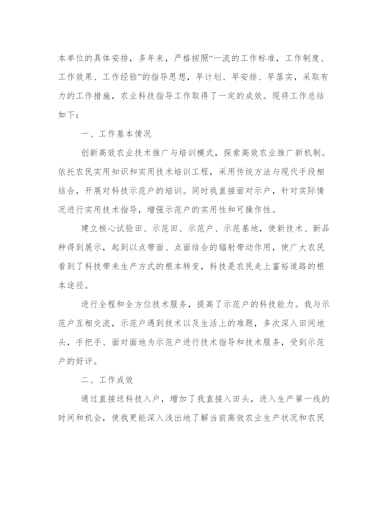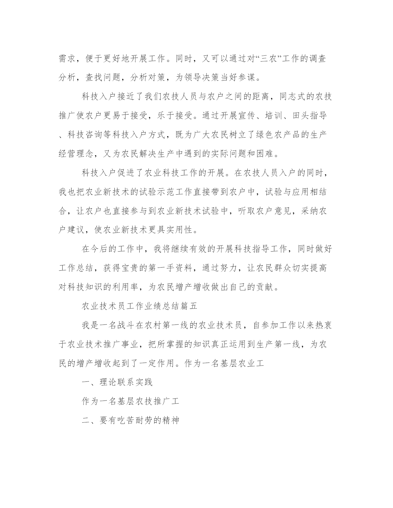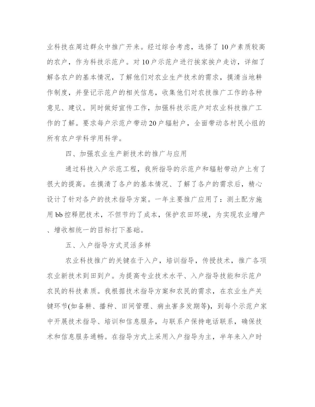 最新农业技术员工作业绩总结(12篇)总结是对过去一定时期的工作、学习或思想情况进行回顾、分析,并做出客观评价的书面材料,它有助于我们寻找工作和事物发展的规律,从而掌握并运用这些规律,是时候写一份总结了。优秀的总结都具备一些什么特点呢?又该怎么写呢?下面是小编整理的个人今后的总结范文,欢迎阅读分享,希望对大家有所帮助。农业技术员工作业绩总结篇一一、积极参加业务学习,提高自己的业务素质开展科技入户示范工程后,积极参加了县农委组织的各期培训学习,全面学习了小麦、水稻、大豆等有关知识,更新了知识,拓宽了视野,提高了业务素质,增强了指导示范户的服务能力。二、加强宣传、营造氛围农业科技推广是传统农业向现代农业转变的机制创新,为争取社会各界对农业科技推广的支持,使全社会特别是广大农民更多地了解和积极参与农业科技推广工程,采取广播、电视、黑板报、标语等多种形式宣传农业科技推广工作,宣传农业科技示范县的政策,宣传面向市场的现代农业生产技术,取得了较好的效果。三、精心选择高素质科技示范户农业科技推广在我乡以种植业为主,科技示范户理所当然的要有一定的种植水平,同时要有较强的号召力和影响力,能够将先进的农业科技在周边群众中推广开来。经过综合考虑,选择了10户素质较高的农户,作为科技示范户。对10户示范户进行挨家挨户走访,详细了解各农户的基本情况,了解他们对农业生产技术的需求,摸清当地耕作制度,并登记示范户的相关信息,收集他们对农技推广工作的各种意见、建议。同时做好宣传工作,加强科技示范户对农业科技推广工作的了解。要求每户示范户带动20户辐射户,全面带动各村民小组的所有农户学科学用科学。四、加强农业生产新技术的推广与应用通过科技入户示范工程,我所指导的示范户和辐射带动户上有了很大的提高。在摸清了各户的基本情况、了解了各户的需求后,精心设计了针对各户的技术指导方案。一年主要推广应用了:测土配方施用bb控释肥技术,不但节约了成本,保护农田环境,为实现农业增产、增收相统一的目标打下基础。五、入户指导方式灵活多样农业科技推广的关键在于入户,培训指导,传授技术,推广各项农业新技术到田到户。为提高专业技术水平、入户指导技能和示范户农民的科技素质。我根据技术指导方案和农民的需求,在农业生产关键环节(如备耕、播种、田间管理、病虫害多发期等),到每个示范户家中开展技术指导、培训和信息服务,与联系户保持电话联系,确保技术和信息服务通畅。在指导方式上采用入户指导为主,半年来入户时间达6天/户,总入户时间60天,同时辅以集中培训和现场交流会形式开展。及时发放示范户门牌。总之,我将努力工作,加强实践,积累经验,严格要求自己,为发展乡高产、优质、高效、生态农业作贡献。农业技术员工作业绩总结篇二今年,本人负责农技指导的科技示范户是上杭县临城镇水西村、宫桥村、富古村、西郊村、西坡村的7户具有一定文化水平,种植水平较高的农户,根据入户调查统计:总人口32人,劳力14人,总耕地156亩,每户辐射带动周围农户20户,共辐射带动农户200户;10户科技示范户有5户种植水稻,5户种植大棚蔬菜及水果。作为一位技术指导员,按照上级的要求,积极下乡,认真指导科技示范户和科技试验示范基地,现将一年来的工作总结如下:一、培育农业科技示范户本人所指导的10户示范户,都是具有一定文化水平,接受、学习能力较强的农户。示范户主要围绕水稻及大棚蔬菜种植进行集中培训、入户指导、实地解决生产技术,指导农业科技示范户应用、推广新品种、新技术,提高其学习接受能力,发挥科技示范户的辐射带动作用。二、推广新品种、新技术。水稻主推品种包括t优2155、全优2689、特优716、宜优673,主推技术包括旱育秧、机插秧、测土配方施肥、病虫综防等;蔬菜主推品种有花椰菜、芥菜、菜椒、甜豆等,主推技术包括无公害、反季节栽培技术、保护地栽培技术等。为了让农户更好的了解这些新技术、新品种,本人将每一项新品种、新技术的特征特性、产量表现、栽培技术要点分类介绍、装订成册,并发放给每一位农户。三、田间技术指导,预防病虫害。在空闲的时间,我都会到农户的田里进行手把手、面对面的技术指导,发现问题及时解决,并向农户传授主要的病虫害的发病表现、防治方法。四、及时沟通,了解种植情况在初期进行示范户情况摸底调查的时候,就将自己的电话向科技示范户公开,方便示范户随时咨询生产中遇到的各种疑难问题,通过电话联系,把生产中可能出现的隐患都解决在萌芽之中,及时地为科技示范户在生产中排忧解难;自己也会定期联系示范户,询问种植情况。五、及时测产,统计收成农户收获的时候,积极组织测产。根据统计,水稻种植示范户及其辐射带动的农户水稻亩产为1362斤/亩,与去年同期相比增长了12个百分点,相较于普通农户水稻亩产要多两百余斤。蔬