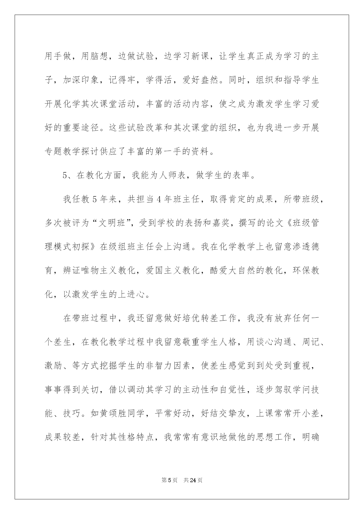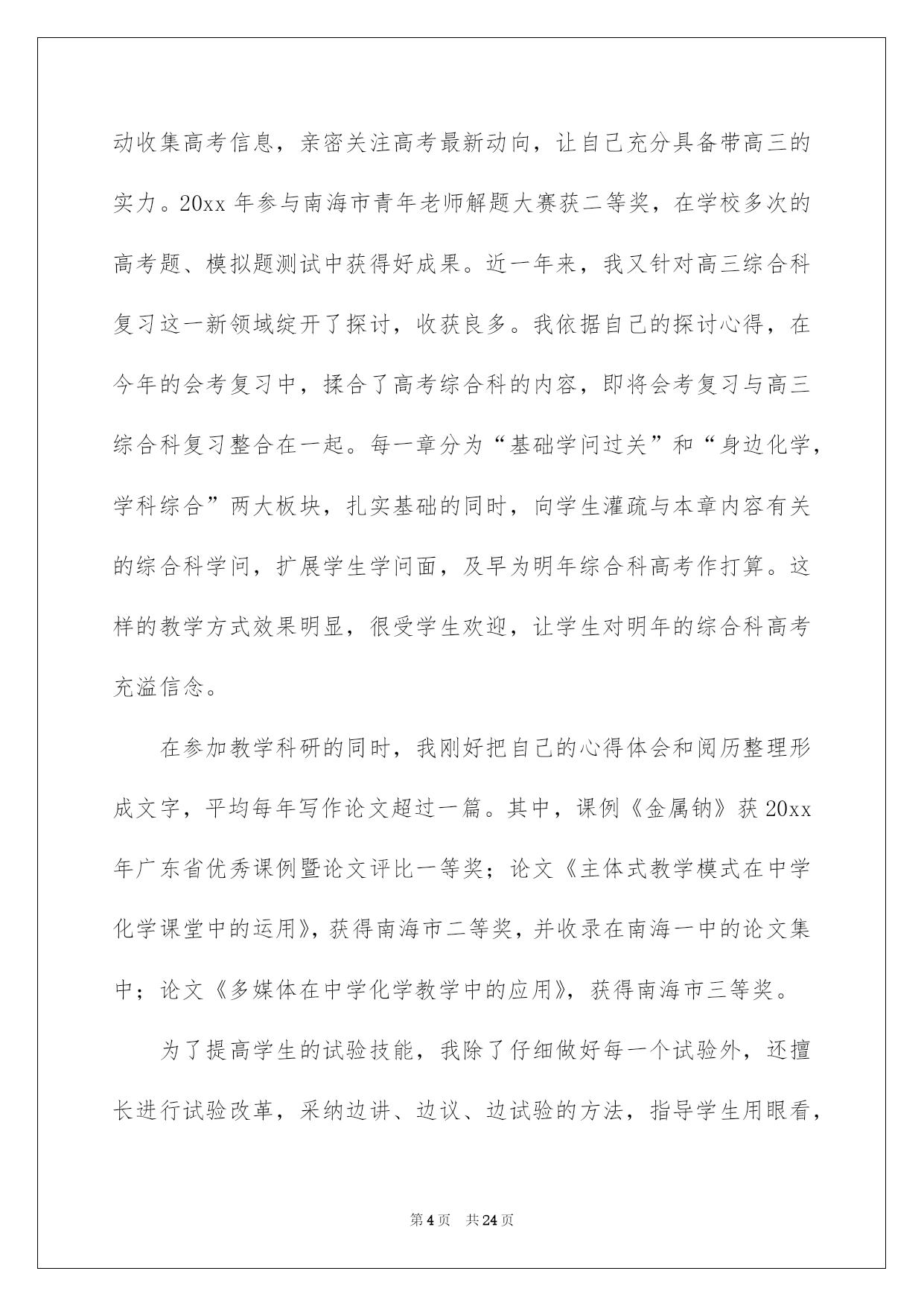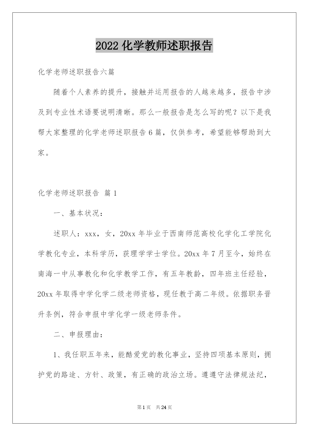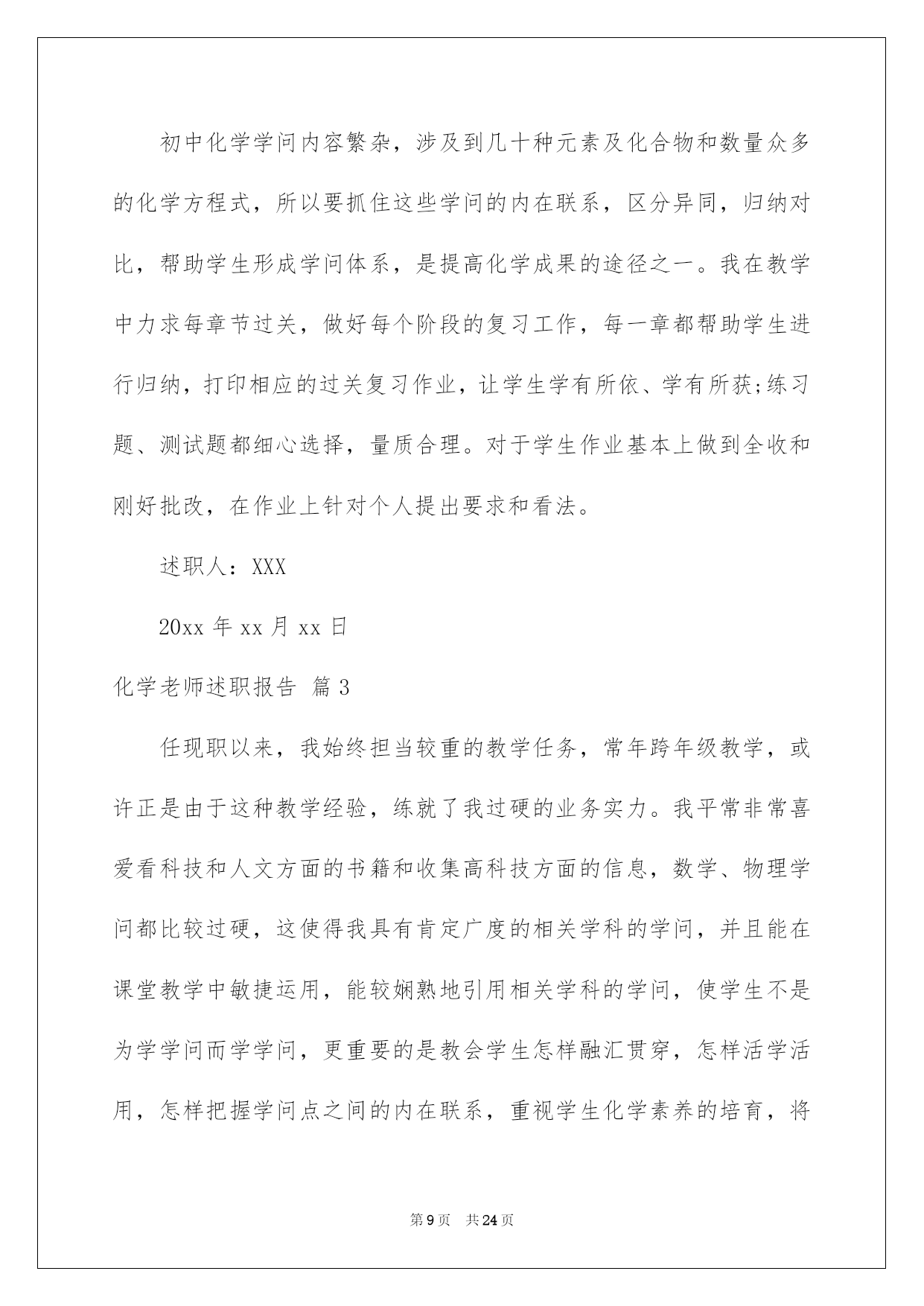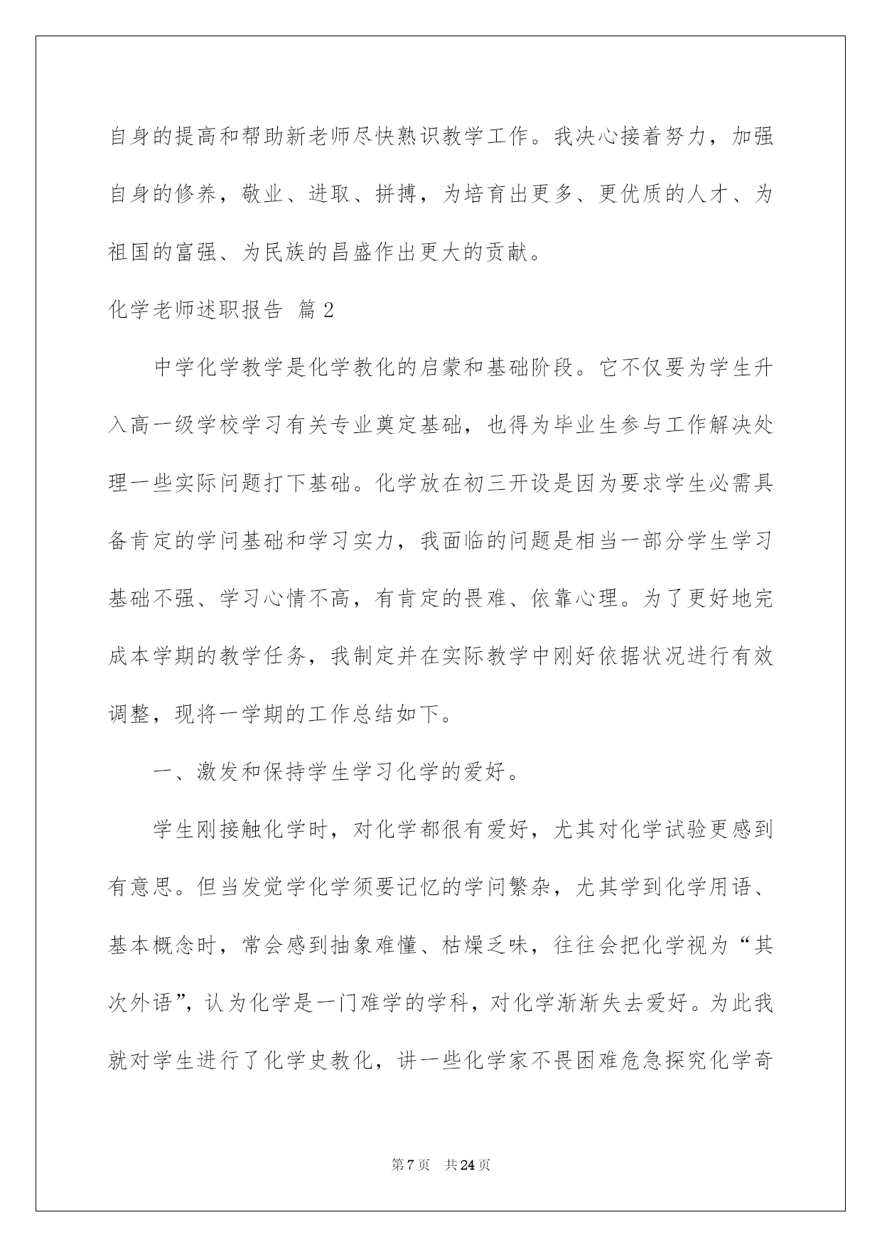 第PAGE\*Arabic\*MERGEFORMAT24页共NUMPAGES\*Arabic\*MERGEFORMAT24页第PAGE\*MERGEFORMAT24页共NUMPAGES\*MERGEFORMAT24页第PAGE\*MERGEFORMAT24页共NUMPAGES\*MERGEFORMAT24页第PAGE\*MERGEFORMAT24页共NUMPAGES\*MERGEFORMAT24页第PAGE\*MERGEFORMAT24页共NUMPAGES\*MERGEFORMAT24页第PAGE\*MERGEFORMAT24页共NUMPAGES\*MERGEFORMAT24页第PAGE\*MERGEFORMAT24页共NUMPAGES\*MERGEFORMAT24页第PAGE\*MERGEFORMAT24页共NUMPAGES\*MERGEFORMAT24页第PAGE\*MERGEFORMAT24页共NUMPAGES\*MERGEFORMAT24页第PAGE\*MERGEFORMAT24页共NUMPAGES\*MERGEFORMAT24页第PAGE\*MERGEFORMAT24页共NUMPAGES\*MERGEFORMAT24页2022化学教师述职报告化学老师述职报告六篇随着个人素养的提升,接触并运用报告的人越来越多,报告中涉及到专业性术语要说明清晰。那么一般报告是怎么写的呢?以下是我帮大家整理的化学老师述职报告6篇,仅供参考,希望能够帮助到大家。化学老师述职报告篇1一、基本状况:述职人:xxx,女,20xx年毕业于西南师范高校化学化工学院化学教化专业,本科学历,获理学学士学位。20xx年7月至今,始终在南海一中从事教化和化学教学工作,有五年教龄,四年班主任经验,20xx年取得中学化学二级老师资格,现任教于高二年级。依据职务晋升条例,符合申报中学化学一级老师条件。二、申报理由:1、我任职五年来,能酷爱党的教化事业,坚持四项基本原则,拥护党的路途、方针、政策,有正确的政治立场。遵遵守法律规法纪,关切集体,团结同事,作风正派,从严治教,有较高的思想觉悟和良好的老师职业道德。能一心一意从事本学科的教学,力求精益求精,肯定听从上级和学校领导的工作支配,任劳任怨,诚恳切恳,从工作中去体会教化工作的崇高,从工作中去获得人生的奋斗意义,在工作中去享受为人师的乐趣,在工作中渐渐充溢了自己。2、我先后任教过高一、高二、高三的化学,并自己熟识了初中化学教材和教学大纲,对中学化学教材有比较充分的理解,能正确理解、驾驭化学教学大纲和教材,能正确传授内容,重点突出。能够落实“双基”教学,留意培育学生的化学创新精神和实践实力,一般话流畅,表达精确,板书清楚,条理性好。3、任现职以来,我努力探究课堂教学的艺术性,不断提高自身教学实力。我知道要在教学中有所建树,必先成为一名受学生欢迎的老师。古语云:“亲其师,信其道”。我首先要求自己在言行举止上,做学生的表率,爱每一个学生,既是师长又是挚友,把自己对教化的爱迁移到学生对化学学问的爱,用自己坚毅而执着的追求去默化学生对化学学问的探究。要求自己在讲台上,完备呈现老师的风采;要求做到每一节课都生动活泼,引人入胜,而且教学质量达标,把每一节课当成优质示范课来上。4、我留意教研与教学相结合,开展专题教学探讨。教研是教学进步的动力,更是教学特色形成的根本途径。任现职以来,我坚持在教研中教学,在探究中教书,在思想的升华过程中育人。我主动参与学校的各项教研活动,亲密留意和追踪本学科的发展趋势、最新教学科研成果和高考信息,驾驭教化发展动态,主动参加科组的教研活动,主动担当教研课题,并把新的科研成果引进到教学中来,在教学中探究理论和实践相结合的可行性和可操作性,使教学和科研相互促进。例如,仔细学习教化教学理论,创建适合我校校情的教改方法;探讨多媒体电化教学手段在化学教学中的运用;加强对学生心理行为与学习效率关系的探讨;探讨提高课堂教学的艺术,增加学生对化学学习的爱好、方法和措施;抓好培优转差工作的开展与落实等等。我在20xx年加入国家级教研课题“主体式教学法”的探讨,并取得肯定的成效,学生的学习主动性和学习成果都有了很大的提高。因为自己是青年老师,只担当过一次高三教学,指导高考的阅历不足,所以我非常留意探讨高考。平常仔细钻研近年来的高考题,主动收集高考信息,亲密关注高考最新动向,让自己充分具备带高三的实力。20xx年参与南海市青年老师解题大赛获二等奖,在学校多次的高考题、模拟题测试中获得好成果。近一年来,我又针对高三综合科复习这一新领域绽开了探讨,收获良多。我依据自己的探讨