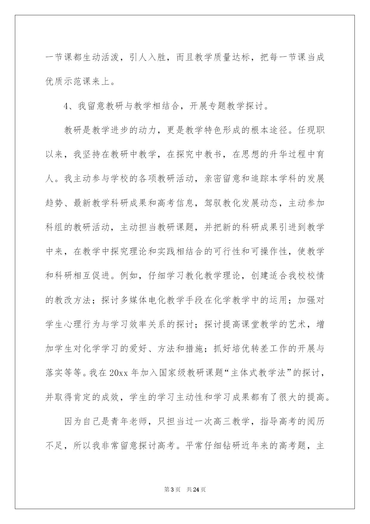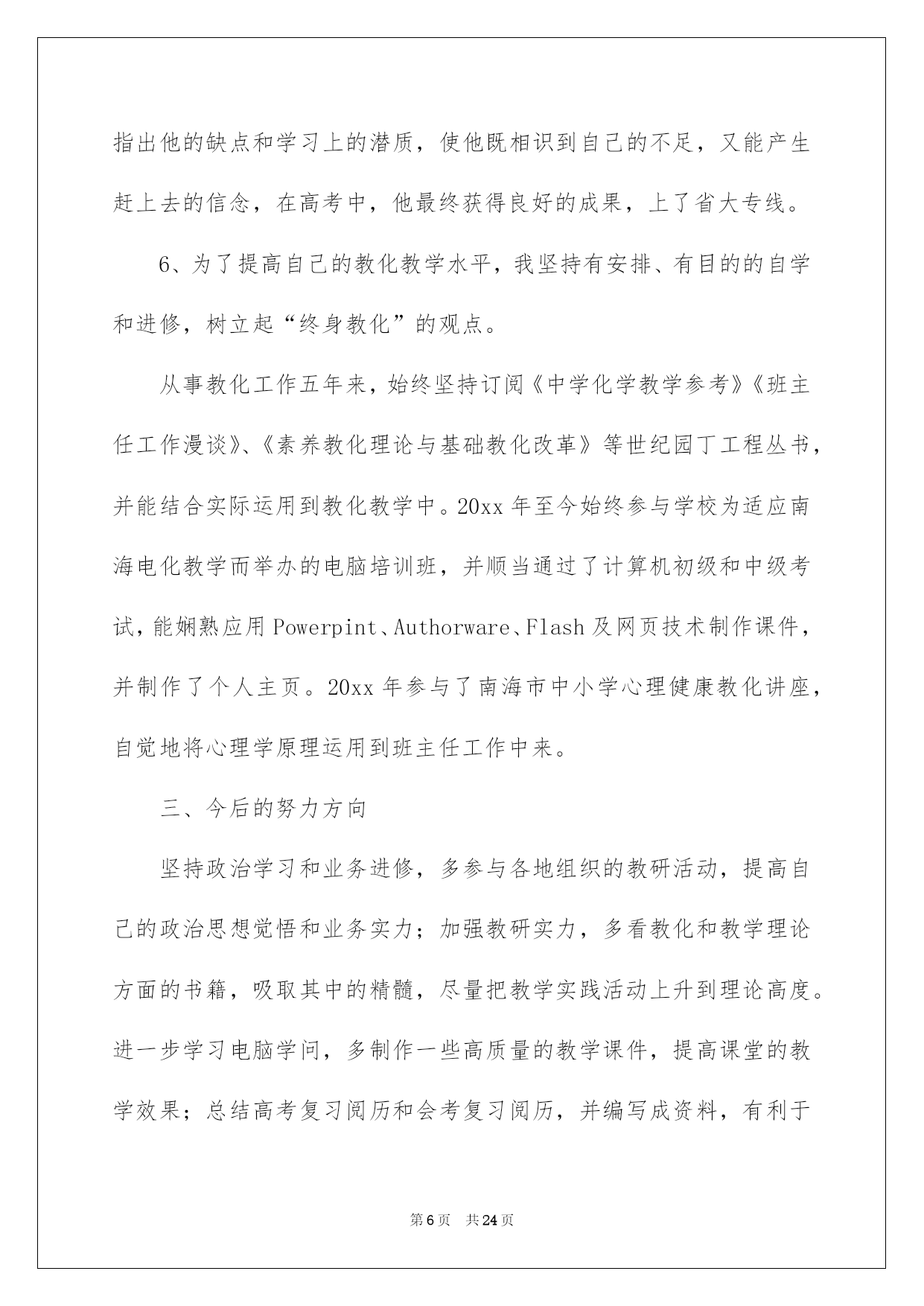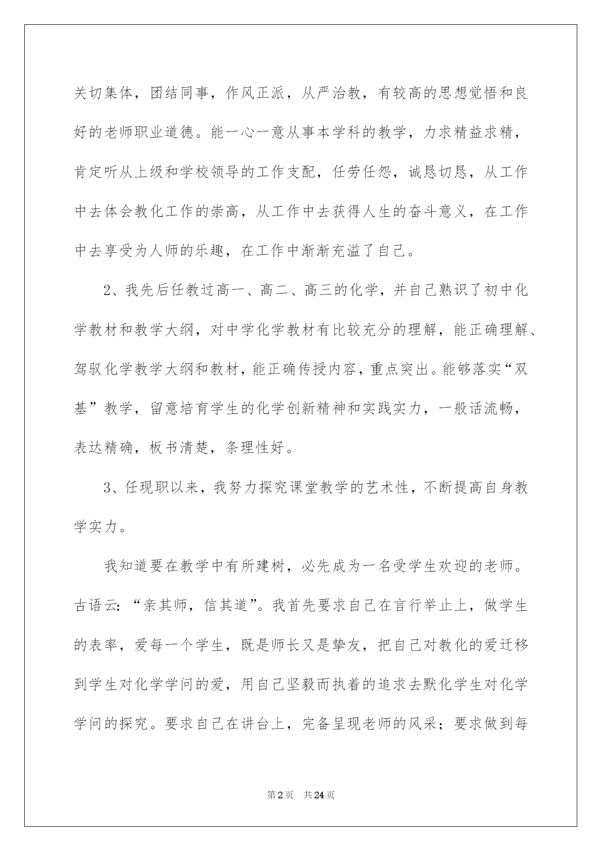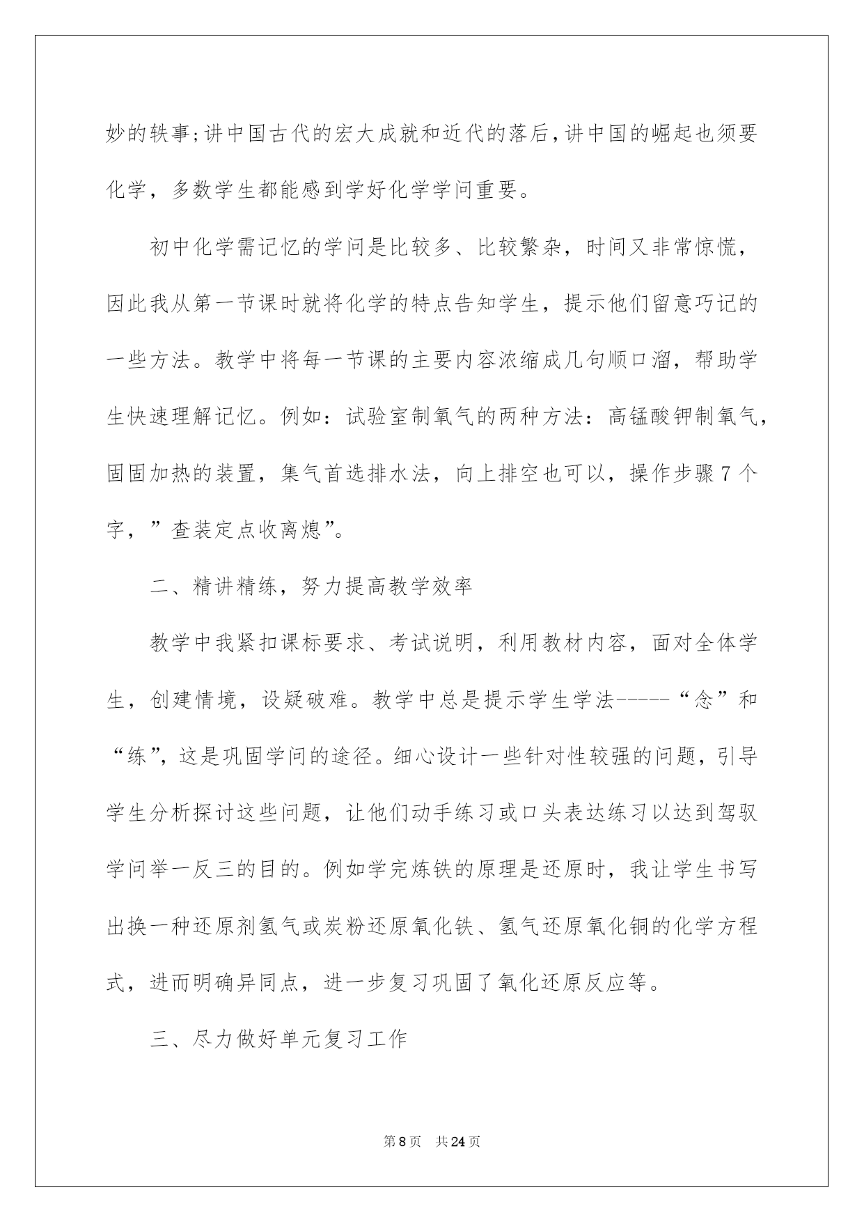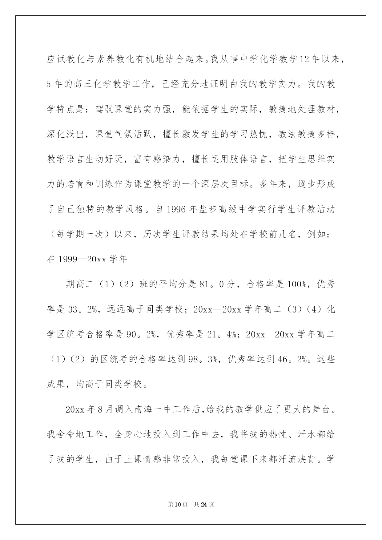第PAGE\*Arabic\*MERGEFORMAT24页共NUMPAGES\*Arabic\*MERGEFORMAT24页第PAGE\*MERGEFORMAT24页共NUMPAGES\*MERGEFORMAT24页第PAGE\*MERGEFORMAT24页共NUMPAGES\*MERGEFORMAT24页第PAGE\*MERGEFORMAT24页共NUMPAGES\*MERGEFORMAT24页第PAGE\*MERGEFORMAT24页共NUMPAGES\*MERGEFORMAT24页第PAGE\*MERGEFORMAT24页共NUMPAGES\*MERGEFORMAT24页第PAGE\*MERGEFORMAT24页共NUMPAGES\*MERGEFORMAT24页第PAGE\*MERGEFORMAT24页共NUMPAGES\*MERGEFORMAT24页第PAGE\*MERGEFORMAT24页共NUMPAGES\*MERGEFORMAT24页第PAGE\*MERGEFORMAT24页共NUMPAGES\*MERGEFORMAT24页第PAGE\*MERGEFORMAT24页共NUMPAGES\*MERGEFORMAT24页2022化学教师述职报告化学老师述职报告六篇随着个人素养的提升,接触并运用报告的人越来越多,报告中涉及到专业性术语要说明清晰。那么一般报告是怎么写的呢?以下是我帮大家整理的化学老师述职报告6篇,仅供参考,希望能够帮助到大家。化学老师述职报告篇1一、基本状况:述职人:xxx,女,20xx年毕业于西南师范高校化学化工学院化学教化专业,本科学历,获理学学士学位。20xx年7月至今,始终在南海一中从事教化和化学教学工作,有五年教龄,四年班主任经验,20xx年取得中学化学二级老师资格,现任教于高二年级。依据职务晋升条例,符合申报中学化学一级老师条件。二、申报理由:1、我任职五年来,能酷爱党的教化事业,坚持四项基本原则,拥护党的路途、方针、政策,有正确的政治立场。遵遵守法律规法纪,关切集体,团结同事,作风正派,从严治教,有较高的思想觉悟和良好的老师职业道德。能一心一意从事本学科的教学,力求精益求精,肯定听从上级和学校领导的工作支配,任劳任怨,诚恳切恳,从工作中去体会教化工作的崇高,从工作中去获得人生的奋斗意义,在工作中去享受为人师的乐趣,在工作中渐渐充溢了自己。2、我先后任教过高一、高二、高三的化学,并自己熟识了初中化学教材和教学大纲,对中学化学教材有比较充分的理解,能正确理解、驾驭化学教学大纲和教材,能正确传授内容,重点突出。能够落实“双基”教学,留意培育学生的化学创新精神和实践实力,一般话流畅,表达精确,板书清楚,条理性好。3、任现职以来,我努力探究课堂教学的艺术性,不断提高自身教学实力。我知道要在教学中有所建树,必先成为一名受学生欢迎的老师。古语云:“亲其师,信其道”。我首先要求自己在言行举止上,做学生的表率,爱每一个学生,既是师长又是挚友,把自己对教化的爱迁移到学生对化学学问的爱,用自己坚毅而执着的追求去默化学生对化学学问的探究。要求自己在讲台上,完备呈现老师的风采;要求做到每一节课都生动活泼,引人入胜,而且教学质量达标,把每一节课当成优质示范课来上。4、我留意教研与教学相结合,开展专题教学探讨。教研是教学进步的动力,更是教学特色形成的根本途径。任现职以来,我坚持在教研中教学,在探究中教书,在思想的升华过程中育人。我主动参与学校的各项教研活动,亲密留意和追踪本学科的发展趋势、最新教学科研成果和高考信息,驾驭教化发展动态,主动参加科组的教研活动,主动担当教研课题,并把新的科研成果引进到教学中来,在教学中探究理论和实践相结合的可行性和可操作性,使教学和科研相互促进。例如,仔细学习教化教学理论,创建适合我校校情的教改方法;探讨多媒体电化教学手段在化学教学中的运用;加强对学生心理行为与学习效率关系的探讨;探讨提高课堂教学的艺术,增加学生对化学学习的爱好、方法和措施;抓好培优转差工作的开展与落实等等。我在20xx年加入国家级教研课题“主体式教学法”的探讨,并取得肯定的成效,学生的学习主动性和学习成果都有了很大的提高。因为自己是青年老师,只担当过一次高三教学,指导高考的阅历不足,所以我非常留意探讨高考。平常仔细钻研近年来的高考题,主动收集高考信息,亲密关注高考最新动向,让自己充分具备带高三的实力。20xx年参与南海市青年老师解题大赛获二等奖,在学校多次的高考题、模拟题测试中获得好成果。近一年来,我又针对高三综合科复习这一新领域绽开了探讨,收获良多。我依据自己的探讨