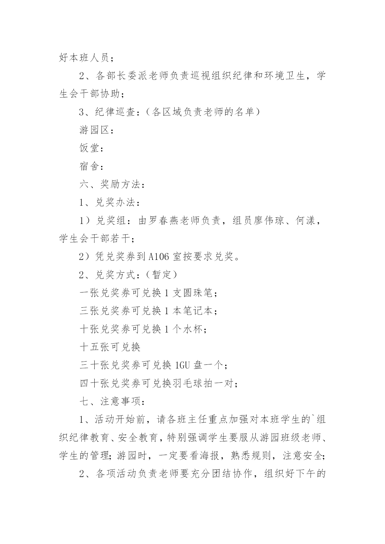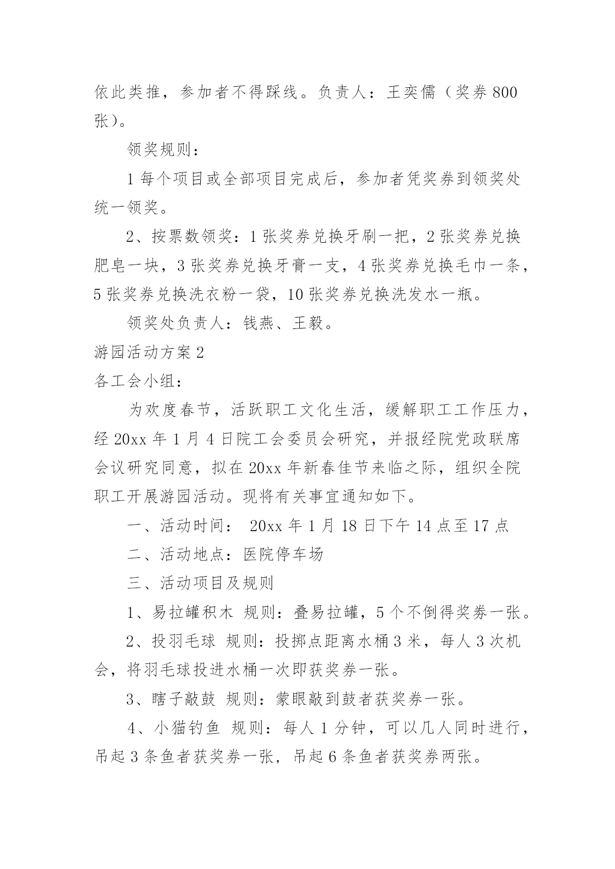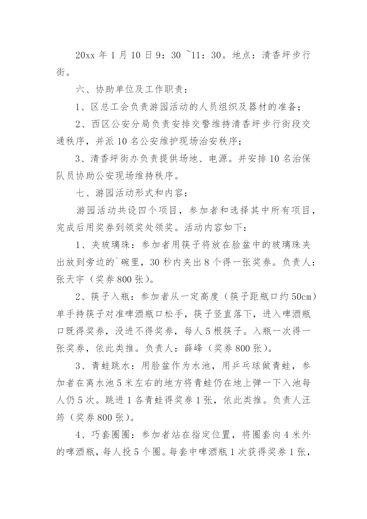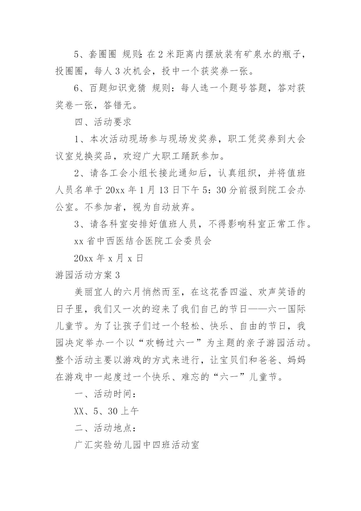 游园活动方案游园活动方案15篇为了确保我们的努力取得实效,我们需要事先制定方案,方案是在案前得出的方法计划。写方案需要注意哪些格式呢?以下是小编为大家整理的游园活动方案,欢迎阅读,希望大家能够喜欢。游园活动方案120xx年元宵节即将来临,为让全区广大职工度过一个欢乐、祥和的节日,按照市总工会的安排报西区重大节日活动办同意,现将西区总工会20xx年元宵节游园活动安排如下:一、活动主题:“热烈、祥和、参与”。二、活动目标:通过丰富多彩的游园活动,活跃职工群众元宵佳节的文化生活,全面展现西区广大职工健康向上的精神风貌,充分体现和谐西区的新气象。三、主办单位:区重大节日办。四、协办单位:西区总工会。五、活动时间:20xx年1月10日9:30~11:30。地点:清香坪步行街。六、协助单位及工作职责:1、区总工会负责游园活动的人员组织及器材的准备;2、西区公安分局负责安排交警维持清香坪步行街段交通秩序,并派10名公安维护现场治安秩序;3、清香坪街办负责提供场地、电源。并安排10名治保队员协助公安现场维持秩序。七、游园活动形式和内容:游园活动共设四个项目,参加者和选择其中所有项目,完成后用奖券到领奖处领奖。活动内容如下:1、夹玻璃珠:参加者用筷子将放在脸盆中的玻璃珠夹出放到旁边的`碗里,30秒内夹出8个得一张奖券。负责人:张天宇(奖券800张)。2、筷子入瓶:参加者从一定高度(筷子距瓶口约50cm)单手持筷子对准啤酒瓶口松手,筷子竖直落下,进入啤酒瓶口既得奖券,没进不得奖券,每人5根筷子。入瓶一次得一张奖券,依此类推。负责人:薛峰(奖券800张)。3、青蛙跳水:用脸盆作为水池,用乒乓球做青蛙,参加者在离水池5米左右的地方将青蛙仍在地上弹一下入池每人仍5次。跳进1各青蛙得奖券1张,依此类推。负责人汪筠(奖券800张)。4、巧套圈圈:参加者站在指定位置,将圈套向4米外的啤酒瓶,每人投5个圈。每套中啤酒瓶1次获得奖券1张,依此类推,参加者不得踩线。负责人:王奕儒(奖券800张)。领奖规则:1每个项目或全部项目完成后,参加者凭奖券到领奖处统一领奖。2、按票数领奖:1张奖券兑换牙刷一把,2张奖券兑换肥皂一块,3张奖券兑换牙膏一支,4张奖券兑换毛巾一条,5张奖券兑换洗衣粉一袋,10张奖券兑换洗发水一瓶。领奖处负责人:钱燕、王毅。游园活动方案2各工会小组:为欢度春节,活跃职工文化生活,缓解职工工作压力,经20xx年1月4日院工会委员会研究,并报经院党政联席会议研究同意,拟在20xx年新春佳节来临之际,组织全院职工开展游园活动。现将有关事宜通知如下。一、活动时间:20xx年1月18日下午14点至17点二、活动地点:医院停车场三、活动项目及规则1、易拉罐积木规则:叠易拉罐,5个不倒得奖劵一张。2、投羽毛球规则:投掷点距离水桶3米,每人3次机会,将羽毛球投进水桶一次即获奖券一张。3、瞎子敲鼓规则:蒙眼敲到鼓者获奖券一张。4、小猫钓鱼规则:每人1分钟,可以几人同时进行,吊起3条鱼者获奖券一张,吊起6条鱼者获奖券两张。5、套圈圈规则:在2米距离内摆放装有矿泉水的瓶子,投圈圈,每人3次机会,投中一个获奖券一张。6、百题知识竞猜规则:每人选一个题号答题,答对获奖卷一张,答错无。四、活动要求1、本次活动现场参与现场发奖券,职工凭奖券到大会议室兑换奖品,欢迎广大职工踊跃参加。2、请各工会小组长接此通知后,认真组织,并将值班人员名单于20xx年1月13日下午5:30分前报到院工会办公室。不参加者,视为自动放弃。3、请各科室安排好值班人员,不得影响科室正常工作。xx省中西医结合医院工会委员会20xx年x月x日游园活动方案3美丽宜人的六月悄然而至,在这花香四溢、欢声笑语的日子里,我们又一次的迎来了我们自己的节日——六一国际儿童节。为了让孩子们过一个轻松、快乐、自由的节日,我园决定举办一个以“欢畅过六一”为主题的亲子游园活动。整个活动主要以游戏的方式来进行,让宝贝们和爸爸、妈妈在游戏中一起度过一个快乐、难忘的“六一”儿童节。一、活动时间:XX、5、30上午二、活动地点:广汇实验幼儿园中四班活动室三、活动目标:1、丰富孩子的生活,融洽师生关系,增进家园互动2、培养孩子们的竞争意识、合作意识、参与意识,让孩子的各种技能技巧得到锻炼3、让孩子们度过一个愉快又有意义的儿童节。四、活动准备1、活动室门前做好游戏海报,写好游戏内容、规则2、各游戏负责人提前准备好游戏需要的材料3、幼儿园准备活动奖品和礼品4、提前通知家长参加活动五、活动过程1、播放六一国际儿童歌,让幼儿感受“六一”欢快的气氛。2、教师向各位家长介绍六一游园活动的`内容、要求、规则等。六、游园活动内容亲子游戏:贴鼻子游戏准备:1、单独鼻子贴纸3张2、缺少鼻子的脸庞贴纸3张游戏玩法:请家长蒙好眼睛后,由幼儿带领家长走到终点,并