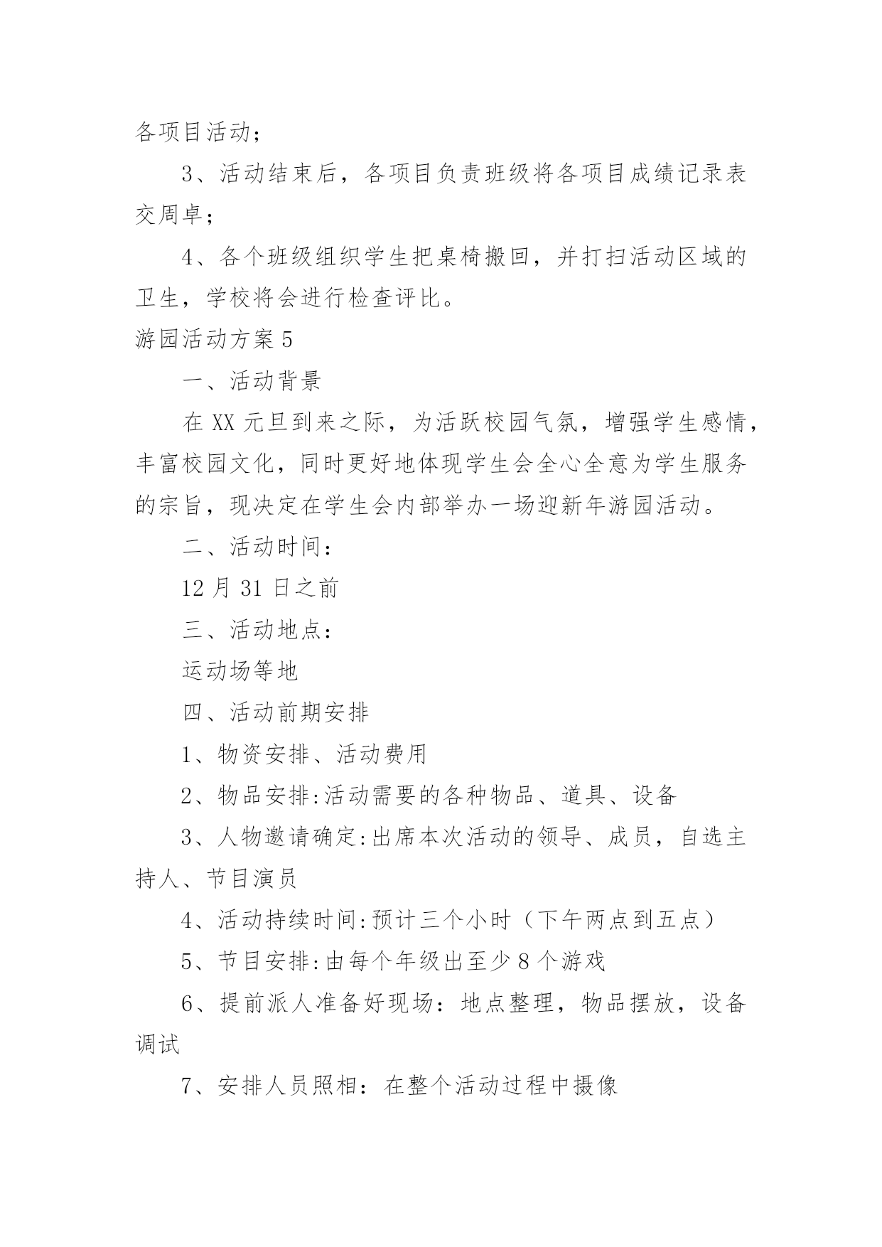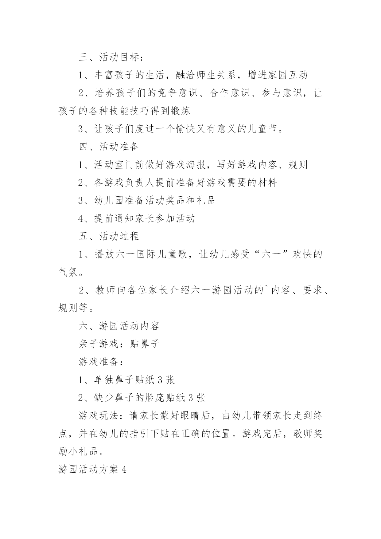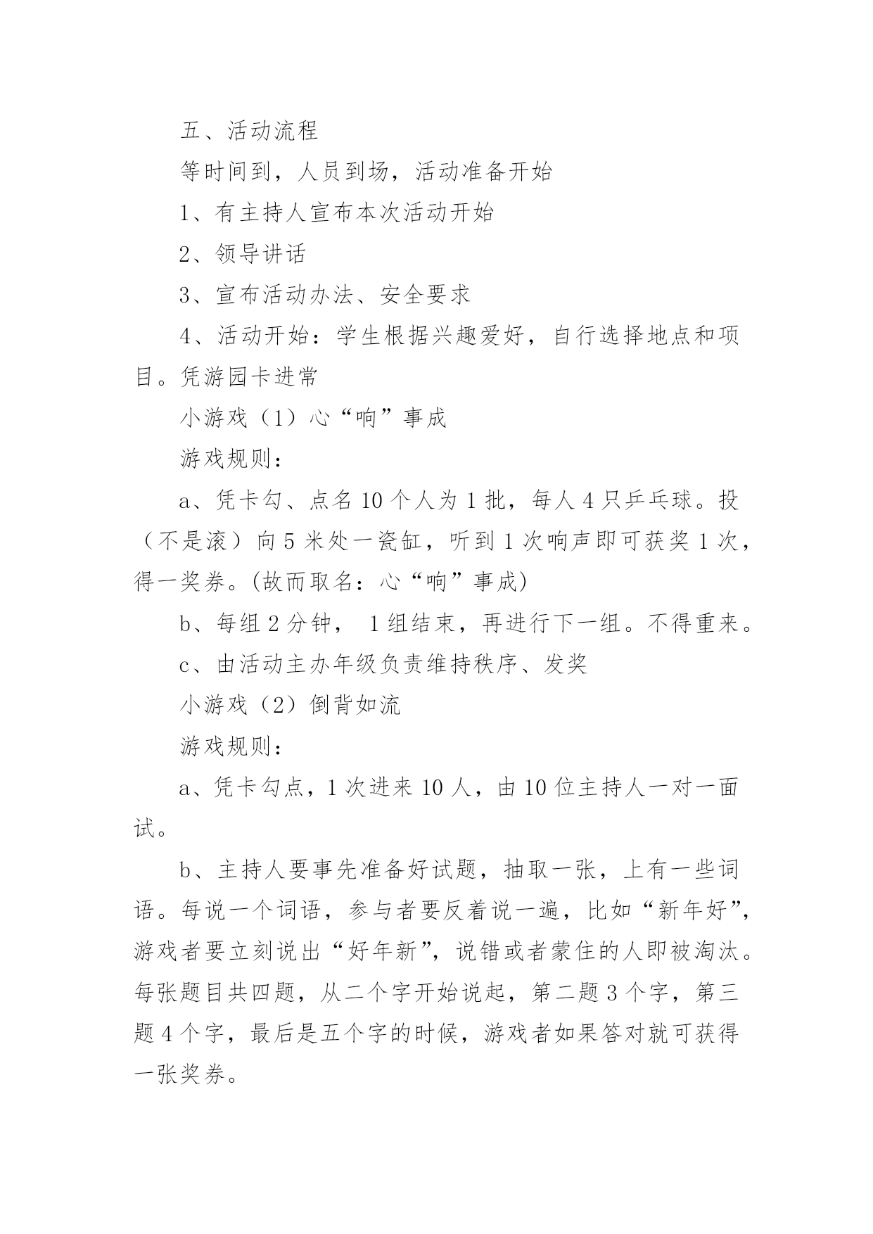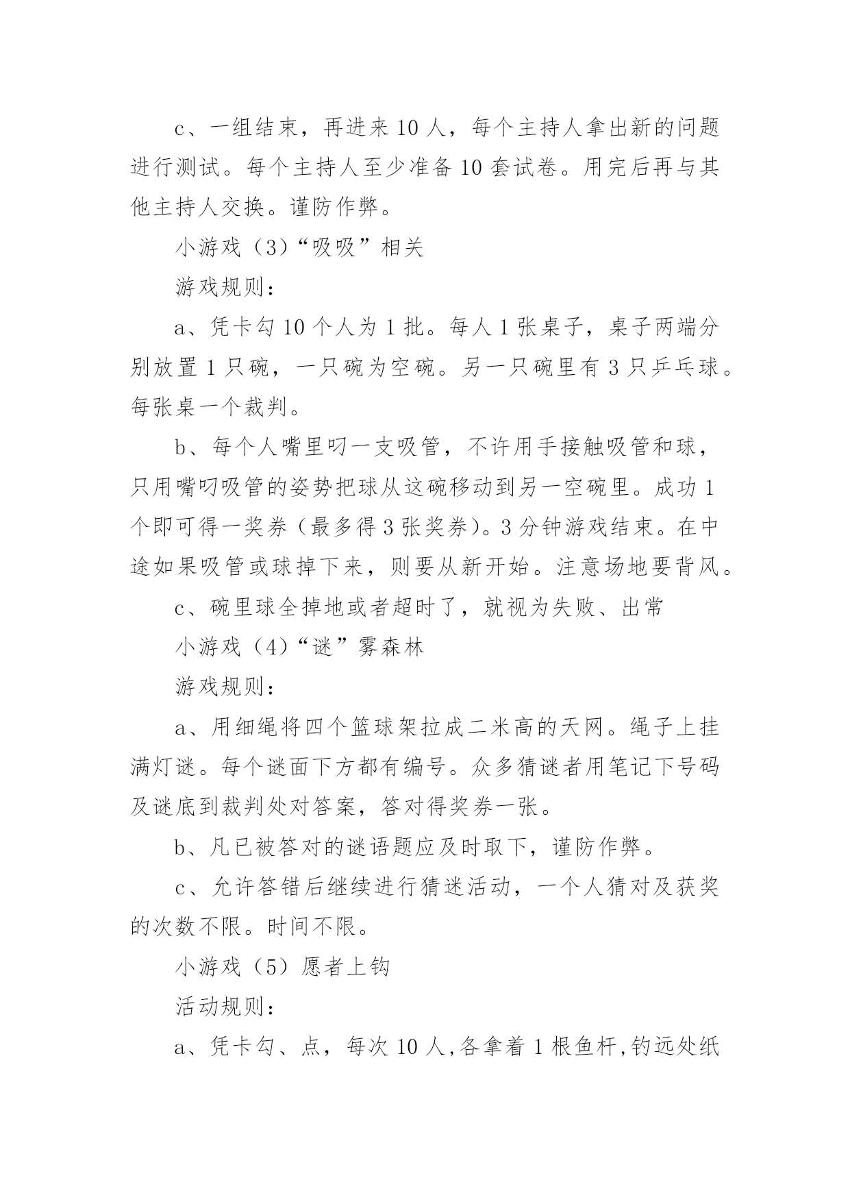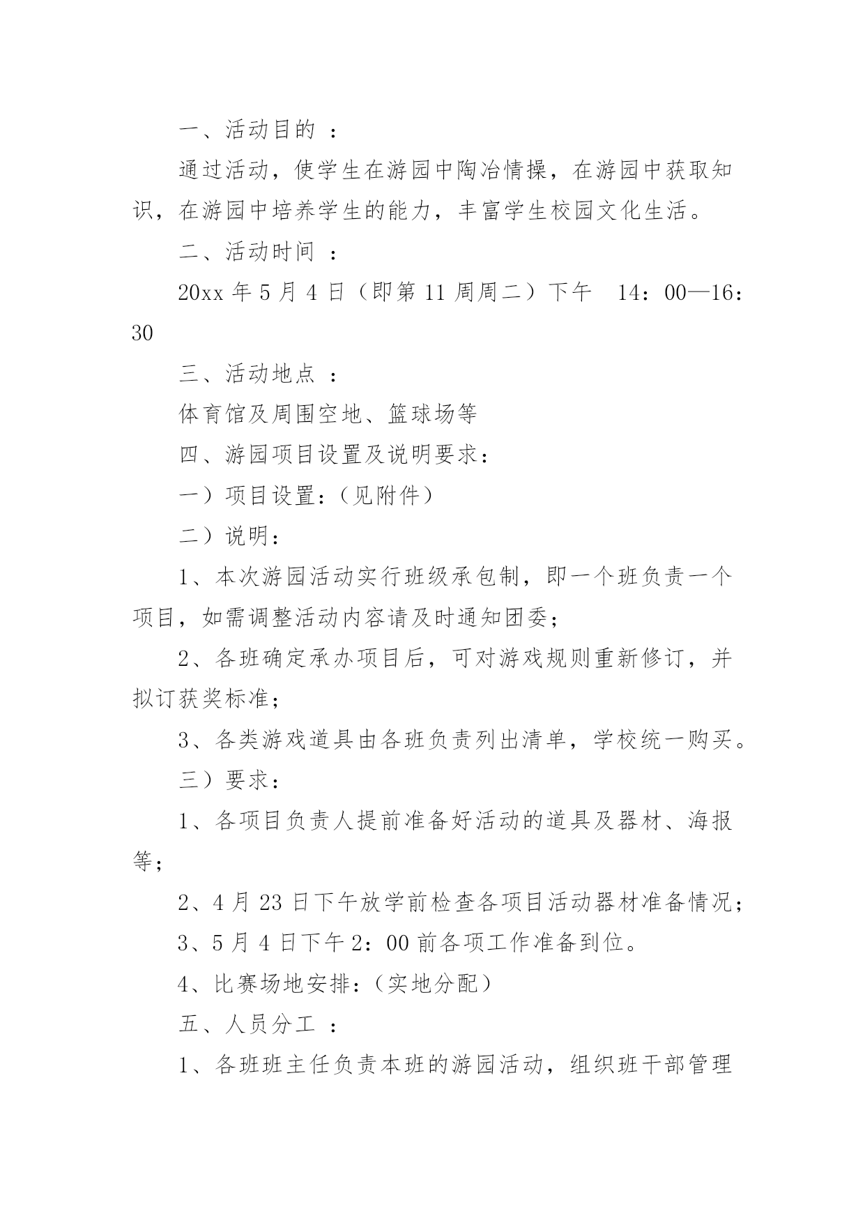 游园活动方案游园活动方案15篇为了确保我们的努力取得实效,我们需要事先制定方案,方案是在案前得出的方法计划。写方案需要注意哪些格式呢?以下是小编为大家整理的游园活动方案,欢迎阅读,希望大家能够喜欢。游园活动方案120xx年元宵节即将来临,为让全区广大职工度过一个欢乐、祥和的节日,按照市总工会的安排报西区重大节日活动办同意,现将西区总工会20xx年元宵节游园活动安排如下:一、活动主题:“热烈、祥和、参与”。二、活动目标:通过丰富多彩的游园活动,活跃职工群众元宵佳节的文化生活,全面展现西区广大职工健康向上的精神风貌,充分体现和谐西区的新气象。三、主办单位:区重大节日办。四、协办单位:西区总工会。五、活动时间:20xx年1月10日9:30~11:30。地点:清香坪步行街。六、协助单位及工作职责:1、区总工会负责游园活动的人员组织及器材的准备;2、西区公安分局负责安排交警维持清香坪步行街段交通秩序,并派10名公安维护现场治安秩序;3、清香坪街办负责提供场地、电源。并安排10名治保队员协助公安现场维持秩序。七、游园活动形式和内容:游园活动共设四个项目,参加者和选择其中所有项目,完成后用奖券到领奖处领奖。活动内容如下:1、夹玻璃珠:参加者用筷子将放在脸盆中的玻璃珠夹出放到旁边的`碗里,30秒内夹出8个得一张奖券。负责人:张天宇(奖券800张)。2、筷子入瓶:参加者从一定高度(筷子距瓶口约50cm)单手持筷子对准啤酒瓶口松手,筷子竖直落下,进入啤酒瓶口既得奖券,没进不得奖券,每人5根筷子。入瓶一次得一张奖券,依此类推。负责人:薛峰(奖券800张)。3、青蛙跳水:用脸盆作为水池,用乒乓球做青蛙,参加者在离水池5米左右的地方将青蛙仍在地上弹一下入池每人仍5次。跳进1各青蛙得奖券1张,依此类推。负责人汪筠(奖券800张)。4、巧套圈圈:参加者站在指定位置,将圈套向4米外的啤酒瓶,每人投5个圈。每套中啤酒瓶1次获得奖券1张,依此类推,参加者不得踩线。负责人:王奕儒(奖券800张)。领奖规则:1每个项目或全部项目完成后,参加者凭奖券到领奖处统一领奖。2、按票数领奖:1张奖券兑换牙刷一把,2张奖券兑换肥皂一块,3张奖券兑换牙膏一支,4张奖券兑换毛巾一条,5张奖券兑换洗衣粉一袋,10张奖券兑换洗发水一瓶。领奖处负责人:钱燕、王毅。游园活动方案2各工会小组:为欢度春节,活跃职工文化生活,缓解职工工作压力,经20xx年1月4日院工会委员会研究,并报经院党政联席会议研究同意,拟在20xx年新春佳节来临之际,组织全院职工开展游园活动。现将有关事宜通知如下。一、活动时间:20xx年1月18日下午14点至17点二、活动地点:医院停车场三、活动项目及规则1、易拉罐积木规则:叠易拉罐,5个不倒得奖劵一张。2、投羽毛球规则:投掷点距离水桶3米,每人3次机会,将羽毛球投进水桶一次即获奖券一张。3、瞎子敲鼓规则:蒙眼敲到鼓者获奖券一张。4、小猫钓鱼规则:每人1分钟,可以几人同时进行,吊起3条鱼者获奖券一张,吊起6条鱼者获奖券两张。5、套圈圈规则:在2米距离内摆放装有矿泉水的瓶子,投圈圈,每人3次机会,投中一个获奖券一张。6、百题知识竞猜规则:每人选一个题号答题,答对获奖卷一张,答错无。四、活动要求1、本次活动现场参与现场发奖券,职工凭奖券到大会议室兑换奖品,欢迎广大职工踊跃参加。2、请各工会小组长接此通知后,认真组织,并将值班人员名单于20xx年1月13日下午5:30分前报到院工会办公室。不参加者,视为自动放弃。3、请各科室安排好值班人员,不得影响科室正常工作。xx省中西医结合医院工会委员会20xx年x月x日游园活动方案3美丽宜人的六月悄然而至,在这花香四溢、欢声笑语的日子里,我们又一次的迎来了我们自己的节日——六一国际儿童节。为了让孩子们过一个轻松、快乐、自由的节日,我园决定举办一个以“欢畅过六一”为主题的亲子游园活动。整个活动主要以游戏的方式来进行,让宝贝们和爸爸、妈妈在游戏中一起度过一个快乐、难忘的“六一”儿童节。一、活动时间:XX、5、30上午二、活动地点:广汇实验幼儿园中四班活动室三、活动目标:1、丰富孩子的生活,融洽师生关系,增进家园互动2、培养孩子们的竞争意识、合作意识、参与意识,让孩子的各种技能技巧得到锻炼3、让孩子们度过一个愉快又有意义的儿童节。四、活动准备1、活动室门前做好游戏海报,写好游戏内容、规则2、各游戏负责人提前准备好游戏需要的材料3、幼儿园准备活动奖品和礼品4、提前通知家长参加活动五、活动过程1、播放六一国际儿童歌,让幼儿感受“六一”欢快的气氛。2、教师向各位家长介绍六一游园活动的`内容、要求、规则等。六、游园活动内容亲子游戏:贴鼻子游戏准备:1、单独鼻子贴纸3张2、缺少鼻子的脸庞贴纸3张游戏玩法:请家长蒙好眼睛后,由幼儿带领家长走到终点,并