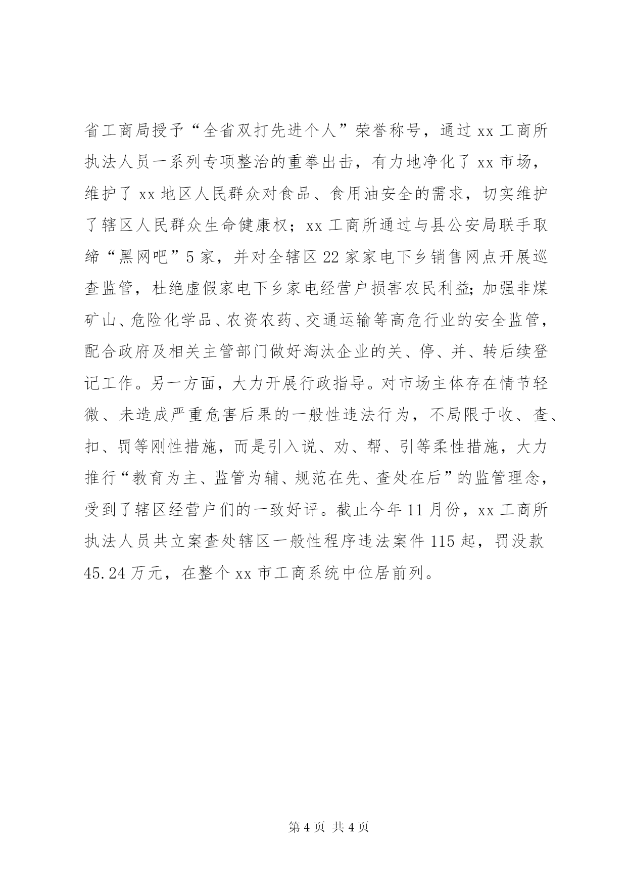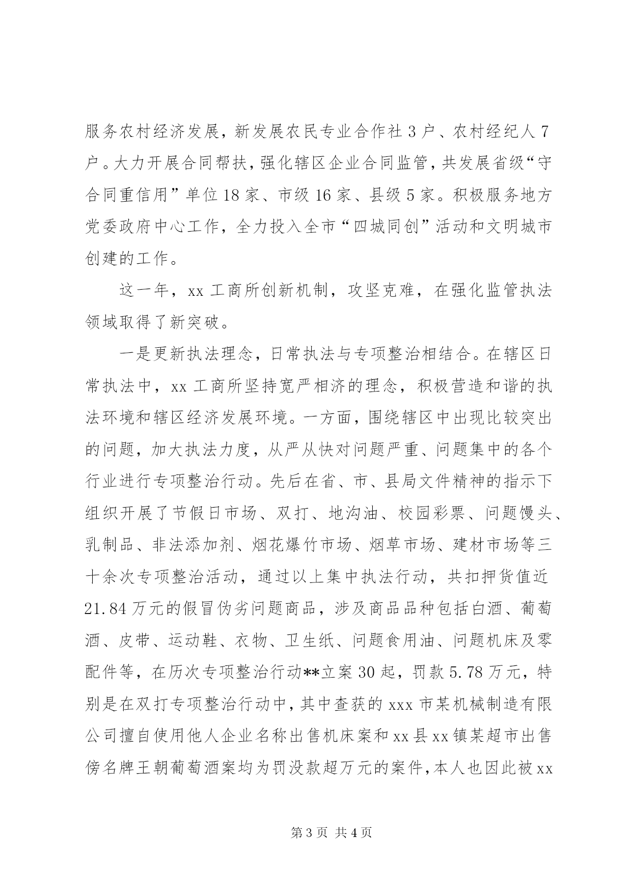 第PAGE\*Arabic\*MERGEFORMAT4页共NUMPAGES\*MERGEFORMAT4页工商所述职述廉报告各位领导,各位同志,各位代表,大家好:本年度,在市、县局和当地政府正确的领导下,本人率领xxx工商所全体同事,坚持以科学发展观为指引,认真学习贯彻党的xx大、xx届四中全会精神,紧紧围绕xx地区企事业单位和经营户服务的主战略,开拓创新,扎实工作,积极推进xx地区经济社会又好又快和谐发展。现我就这一年xx工商所的重要工作情况和自身廉洁自律情况向在座的各位领导、各位代表报告如下:xx年是xxx工商所建所以来服务xx地方经济社会又好又快发展的一年;是我和xx工商所全体同事们一起为进一步贯彻落实市、县局和xxXX县区地方政府各项涉及工商部门政策指示精神努力工作的一年;是xx工商所各项工作取得不菲成绩并得到上级领导部门、地方各级政府和辖区各界认可的一年;更是xx工商所全面深化推进所内各项工作、全面构建服务工商、法治工商、廉洁工商和责任工商的一年。这一年xx工商所潜心助力,服务地方,为优化xx地区经济发展环境作出新作为:一是提高行政效能,辖区内市场主体准入通道进一步畅通。xx工商所在继续推行“五严十宽”行政执法制度和“三不”特殊政策的基础上,按照xxXX县区政府将XX县区打造成人文XX县区、和谐XX县区、宜居XX县区、产业XX县区的发展战略总体部署,紧紧围绕xxXX县区发展大局,拓宽市场主体准入渠道,再造审批流程,进一步压缩办理时限,实行个体户市场主体准入两日办结制,企业市场主体准入流程一次性告知制度。xx年xx工商所共受理发放个体户营业执照户,协助XX县区服务中心工商窗口受理发放企业营业执照户。以实际行动有力的推动促进了整个XX县区经济的繁荣和发展。xx工商所个私受理窗口优质高效的服务多次受到服务对象的表扬,上级领导部门对xx工商所有关行政审批的高效创新及对辖区经营户热情服务也多次给予肯定和表彰。二是实施商标发展战略,辖区经济发展动力进一步增强。xx年xx工商所响应市局号召加快推进辖区企业商标发展战略,截止今年11月份xx工商所辖区内企业注册商标数上升至215件,扶持辖区规模型企业申报省著名商标增加到28件,占全xxx市企业获得省著名商标数量的30%强,为将xx地区打造成一个的产业品牌基地做出了应有的贡献。xx工商所因其出色的辖区商标工作被国家工商总局授予xx市工商系统唯一的“全国商标管理先进集体”称号,这也是我所建所以来第三次荣获国家局颁发的先进集体荣誉称号。三是拓展服务内涵,服务发展地方经济的主动性进一步增强。为方便辖区企业,xx年xx工商所继续开展企业工商营业执照上门年检工作,逐步实行网上年检企业营业执照的推广工作。积极服务农村经济发展,新发展农民专业合作社3户、农村经纪人7户。大力开展合同帮扶,强化辖区企业合同监管,共发展省级“守合同重信用”单位18家、市级16家、县级5家。积极服务地方党委政府中心工作,全力投入全市“四城同创”活动和文明城市创建的工作。这一年,xx工商所创新机制,攻坚克难,在强化监管执法领域取得了新突破。一是更新执法理念,日常执法与专项整治相结合。在辖区日常执法中,xx工商所坚持宽严相济的理念,积极营造和谐的执法环境和辖区经济发展环境。一方面,围绕辖区中出现比较突出的问题,加大执法力度,从严从快对问题严重、问题集中的各个行业进行专项整治行动。先后在省、市、县局文件精神的指示下组织开展了节假日市场、双打、地沟油、校园彩票、问题馒头、乳制品、非法添加剂、烟花爆竹市场、烟草市场、建材市场等三十余次专项整治活动,通过以上集中执法行动,共扣押货值近21.84万元的假冒伪劣问题商品,涉及商品品种包括白酒、葡萄酒、皮带、运动鞋、衣物、卫生纸、问题食用油、问题机床及零配件等,在历次专项整治行动**立案30起,罚款5.78万元,特别是在双打专项整治行动中,其中查获的xxx市某机械制造有限公司擅自使用他人企业名称出售机床案和xx县xx镇某超市出售傍名牌王朝葡萄酒案均为罚没款超万元的案件,本人也因此被xx省工商局授予“全省双打先进个人”荣誉称号,通过xx工商所执法人员一系列专项整治的重拳出击,有力地净化了xx市场,维护了xx地区人民群众对食品、食用油安全的需求,切实维护了辖区人民群众生命健康权;xx工商所通过与县公安局联手取缔“黑网吧”5家,并对全辖区22家家电下乡销售网点开展巡查监管,杜绝虚假家电下乡家电经营户损害农民利益;加强非煤矿山、危险化学品、农资农药、交通运输等高危行业的安全监管,配合政府及相关主管部门做好淘汰企业的关、停、并、转后续登记工作。另一方面,大力开展行政指导。对市场主体存在情节轻微、未造成严重危害后果的一般性违法行为,不局限于收、查、扣、罚等刚性措施,而是引入说、劝