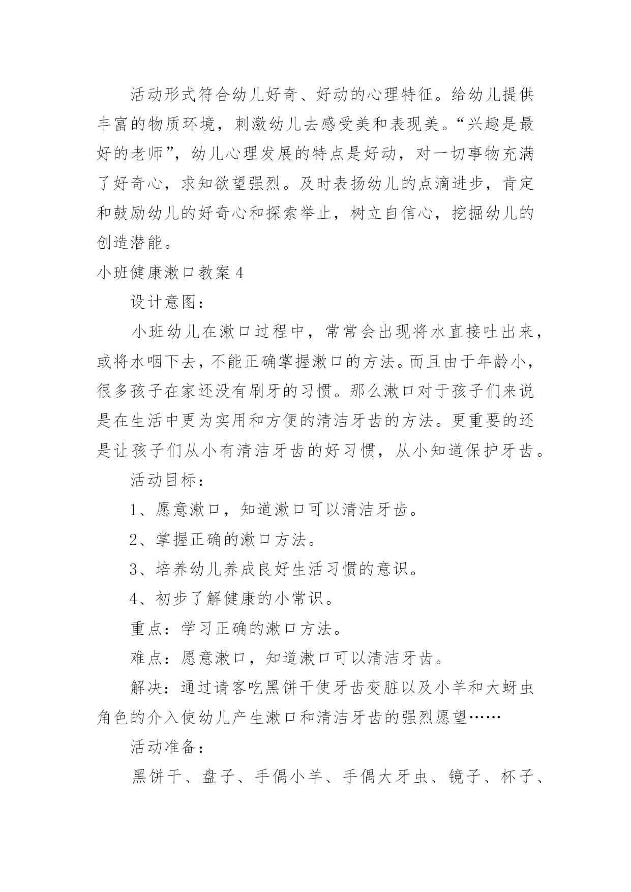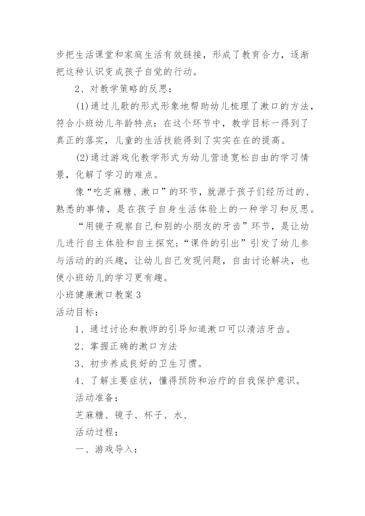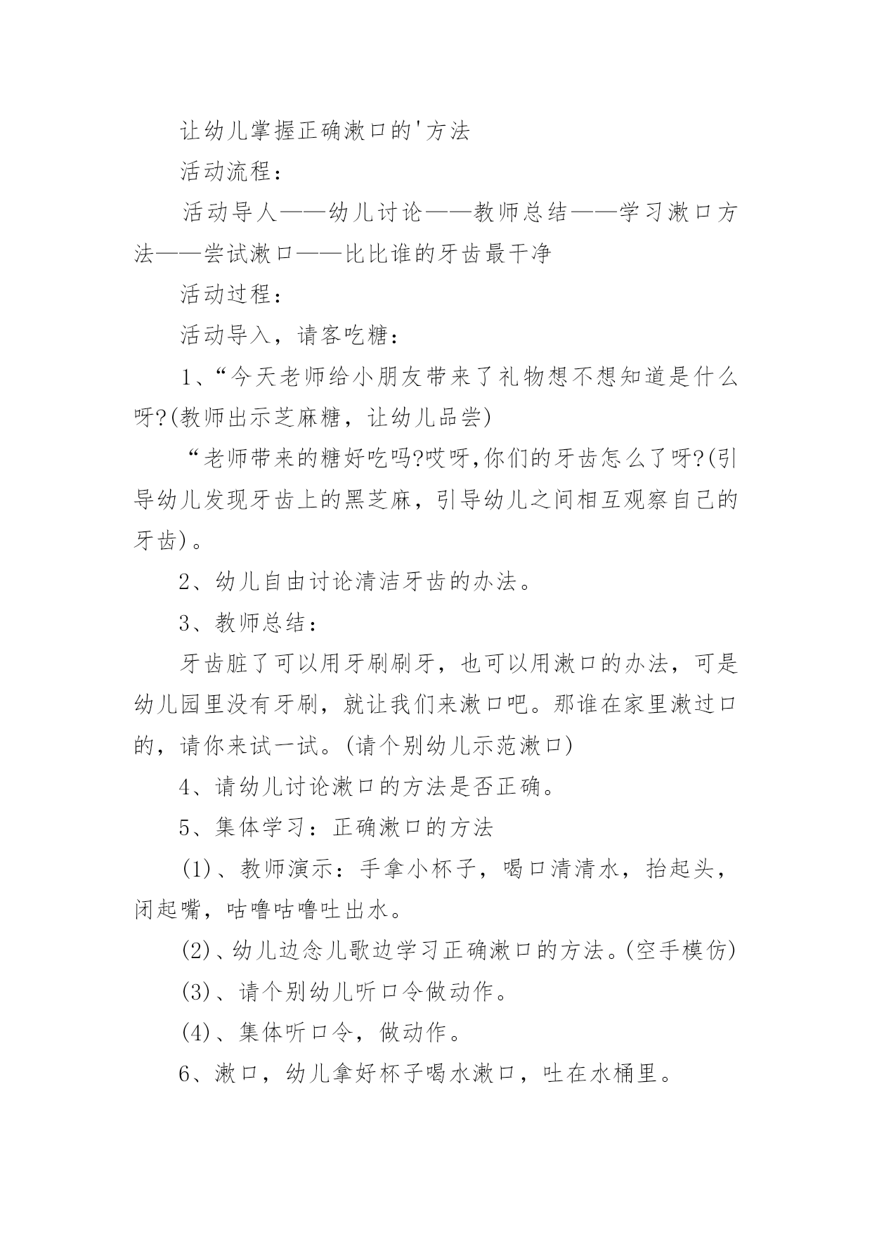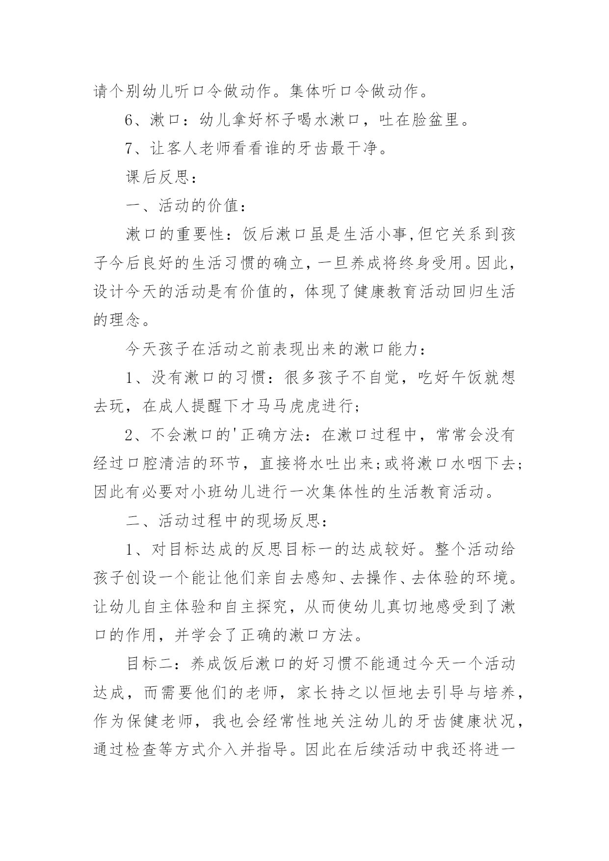 小班健康漱口教案小班健康漱口教案作为一名教职工,常常需要准备教案,教案有助于顺利而有效地开展教学活动。那么应当如何写教案呢?下面是小编收集整理的小班健康漱口教案,欢迎大家分享。小班健康漱口教案1设计思路:小班幼儿刚刚进入幼儿园,在生活自理能力和卫生习惯方面比较欠缺,缺乏自我服务的意识,而小班第一学期的培养目标主要是培养其良好的生活习惯和卫生习惯的养成,然后针对我们班幼儿在近阶段的出现的饭后、点心后不会主动擦脸、漱口等现象,并根据我园近阶段的要求,因此我设计了本次活动。本次活动利用请客的方式激发幼儿参与活动的兴趣,并利用儿歌的的形式帮助幼儿了解正确的漱口方法。活动目标:1、通过活动帮助幼儿掌握正确的漱口方法。2、让幼儿知道漱口可以清洁牙齿。3、培养幼儿乐观开朗的性格。4、教育幼儿养成做事认真,不马虎的好习惯。材料准备:芝麻糖、调羹、镜子、杯子、水、水桶等。重点难点:让幼儿掌握正确漱口的'方法活动流程:活动导人——幼儿讨论——教师总结——学习漱口方法——尝试漱口——比比谁的牙齿最干净活动过程:活动导入,请客吃糖:1、“今天老师给小朋友带来了礼物想不想知道是什么呀?(教师出示芝麻糖,让幼儿品尝)“老师带来的糖好吃吗?哎呀,你们的牙齿怎么了呀?(引导幼儿发现牙齿上的黑芝麻,引导幼儿之间相互观察自己的牙齿)。2、幼儿自由讨论清洁牙齿的办法。3、教师总结:牙齿脏了可以用牙刷刷牙,也可以用漱口的办法,可是幼儿园里没有牙刷,就让我们来漱口吧。那谁在家里漱过口的,请你来试一试。(请个别幼儿示范漱口)4、请幼儿讨论漱口的方法是否正确。5、集体学习:正确漱口的方法(1)、教师演示:手拿小杯子,喝口清清水,抬起头,闭起嘴,咕噜咕噜吐出水。(2)、幼儿边念儿歌边学习正确漱口的方法。(空手模仿)(3)、请个别幼儿听口令做动作。(4)、集体听口令,做动作。6、漱口,幼儿拿好杯子喝水漱口,吐在水桶里。7、照照镜子,比一比,谁的牙齿最干净。活动反思:这堂活动课的设计,从最初自己的构想,到从网上搜集借鉴,到最后成型、拍板,真的很不容易。我们采用拟人化的方式,让大头娃娃更贴近幼儿的生活。在幼儿园孩子们吃点或午饭后,很少有幼儿拿着水杯主动漱口,来保护自己的口腔卫生。本次活动后,幼儿们开始有了这种意识,也了解了正确的漱口方式,老师们也很欣慰。小班健康漱口教案2活动过程:1、请客吃芝麻糖:过新年的时候,我买了许多好吃的东西,今天请你们吃好吗?(幼儿品尝芝麻糖)2、送礼物,照镜子:我还准备了小礼物送给你们,你们看看是什么?(镜子)今天我们来照照嘴巴里面有什么?(牙齿)牙齿是什么颜色的?(引导幼儿发现牙齿上的黑芝麻)黑芝麻爬到牙齿上去了,牙齿变脏了,你有什么办法把黑芝麻从牙齿上赶走呢?3、幼儿自由讨论清洁牙齿的方法。4、教师总结:牙齿脏了可以用牙刷刷牙,也可以用漱口的办法,可是幼儿园里没有牙刷,就让我们来漱口吧。5、学习正确漱口的方法:(1)教师演示:手拿小杯子,喝口清清水,抬起头,闭起嘴,咕噜咕噜吐出水。(2)幼儿边念儿歌边学习正确漱口的方法。(空手模仿)请个别幼儿听口令做动作。集体听口令做动作。6、漱口:幼儿拿好杯子喝水漱口,吐在脸盆里。7、让客人老师看看谁的牙齿最干净。课后反思:一、活动的价值:漱口的重要性:饭后漱口虽是生活小事,但它关系到孩子今后良好的生活习惯的确立,一旦养成将终身受用。因此,设计今天的活动是有价值的,体现了健康教育活动回归生活的理念。今天孩子在活动之前表现出来的漱口能力:1、没有漱口的习惯:很多孩子不自觉,吃好午饭就想去玩,在成人提醒下才马马虎虎进行;2、不会漱口的'正确方法:在漱口过程中,常常会没有经过口腔清洁的环节,直接将水吐出来;或将漱口水咽下去;因此有必要对小班幼儿进行一次集体性的生活教育活动。二、活动过程中的现场反思:1、对目标达成的反思目标一的达成较好。整个活动给孩子创设一个能让他们亲自去感知、去操作、去体验的环境。让幼儿自主体验和自主探究,从而使幼儿真切地感受到了漱口的作用,并学会了正确的漱口方法。目标二:养成饭后漱口的好习惯不能通过今天一个活动达成,而需要他们的老师,家长持之以恒地去引导与培养,作为保健老师,我也会经常性地关注幼儿的牙齿健康状况,通过检查等方式介入并指导。因此在后续活动中我还将进一步把生活课堂和家庭生活有效链接,形成了教育合力,逐渐把这种认识变成孩子自觉的行动。2、对教学策略的反思:(1)通过儿歌的形式形象地帮助幼儿梳理了漱口的方法,符合小班幼儿年龄特点:在这个环节中,教学目标一得到了真正的落实,儿童的生活技能得到了实实在在的提高。(2)通过游戏化教学形式为幼儿营造宽松自由的学习情景,化解了学习的难点。像“吃芝麻糖、漱口”的环节,就源于孩子们经历过的、熟悉的事情,是在孩子自身生活体验上的一种学习和反思。“用镜子观