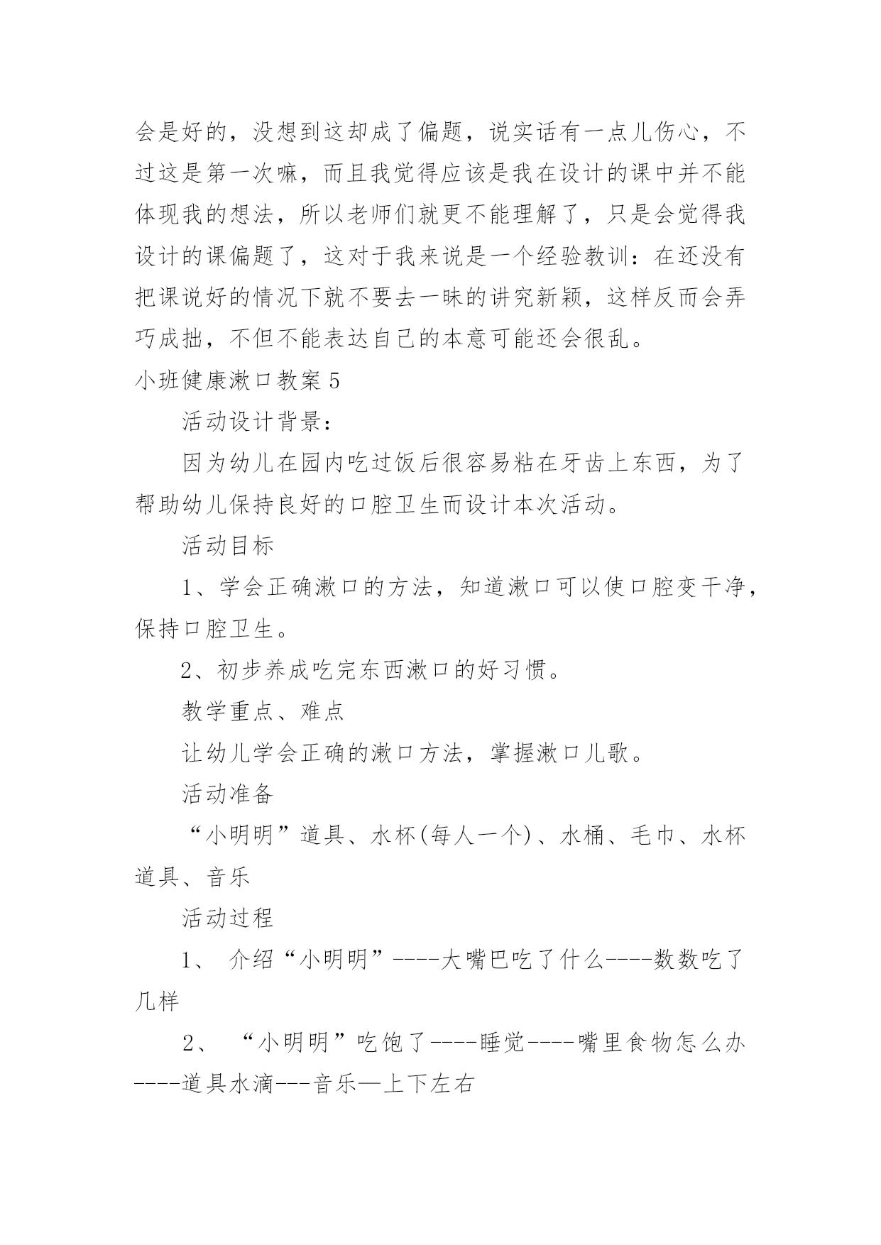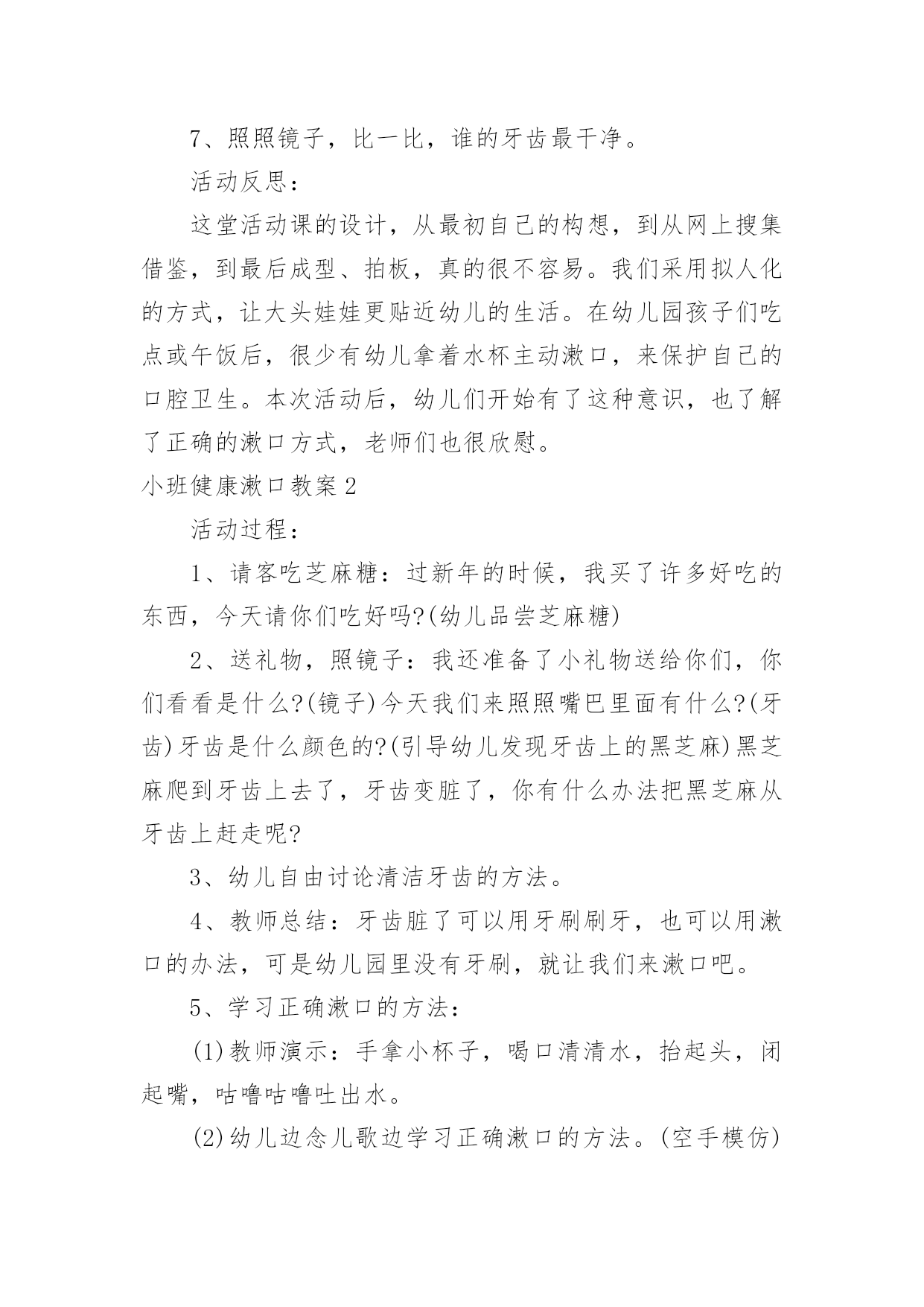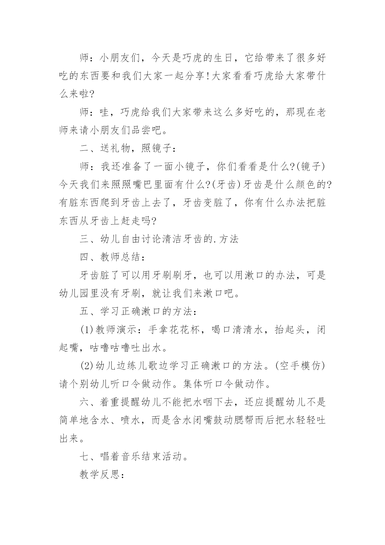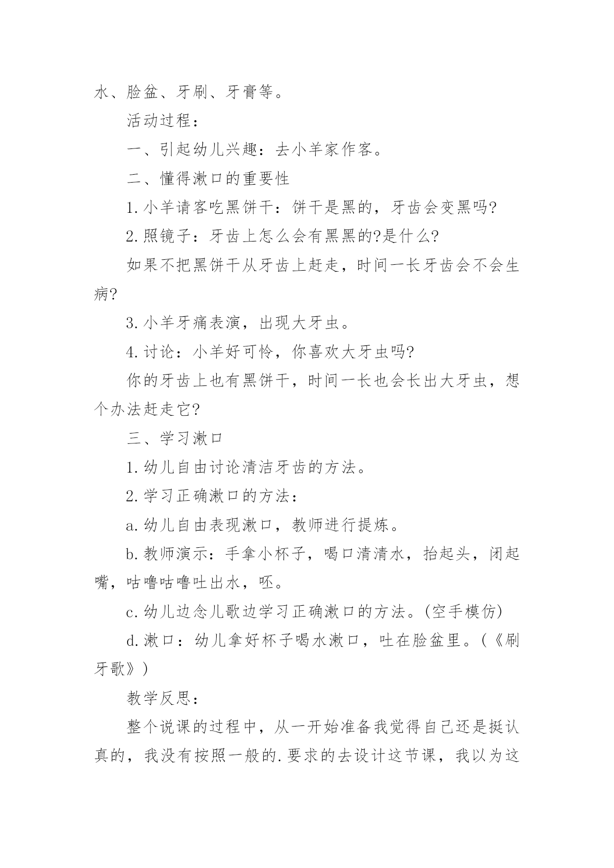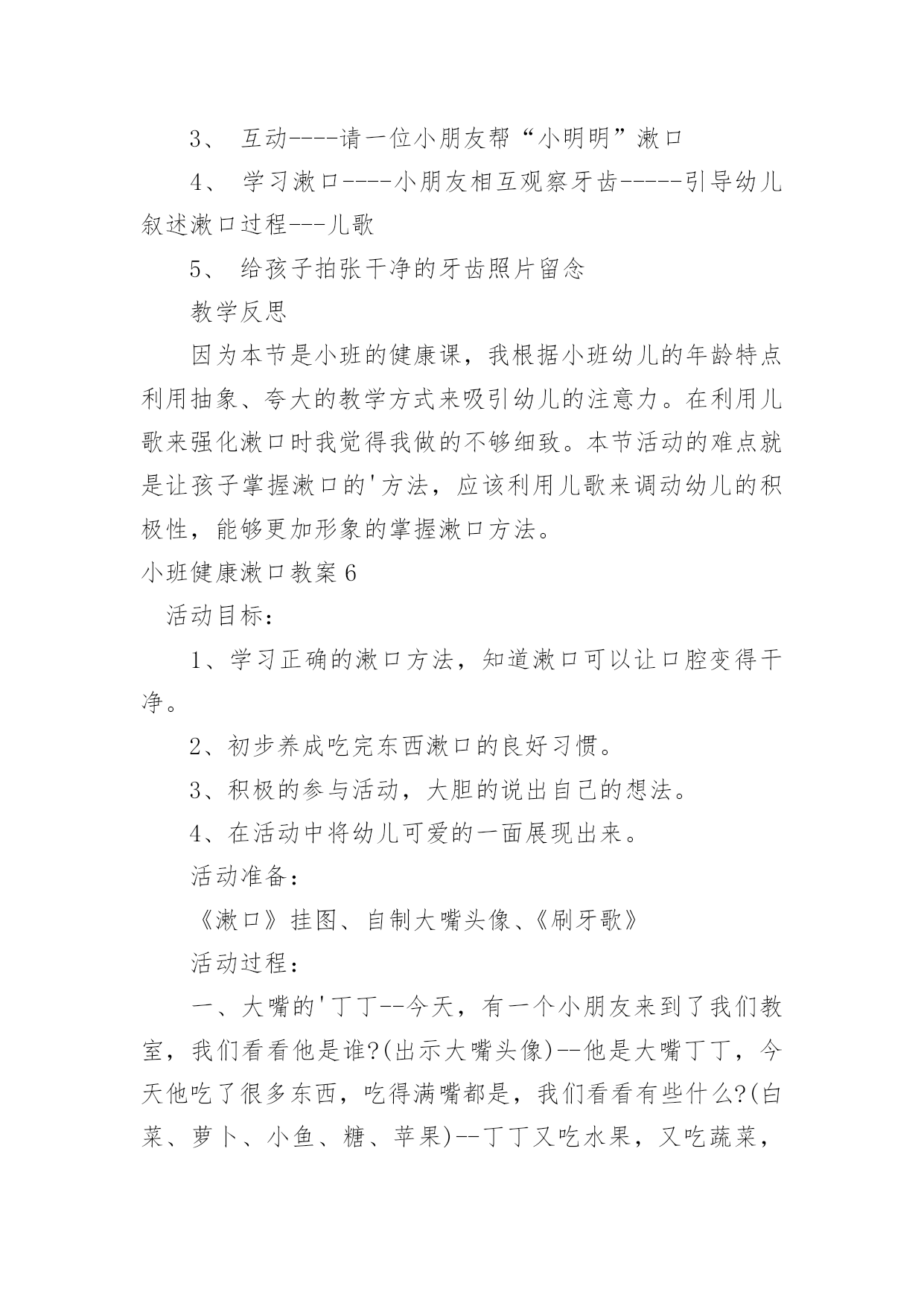 小班健康漱口教案小班健康漱口教案作为一名教职工,常常需要准备教案,教案有助于顺利而有效地开展教学活动。那么应当如何写教案呢?下面是小编收集整理的小班健康漱口教案,欢迎大家分享。小班健康漱口教案1设计思路:小班幼儿刚刚进入幼儿园,在生活自理能力和卫生习惯方面比较欠缺,缺乏自我服务的意识,而小班第一学期的培养目标主要是培养其良好的生活习惯和卫生习惯的养成,然后针对我们班幼儿在近阶段的出现的饭后、点心后不会主动擦脸、漱口等现象,并根据我园近阶段的要求,因此我设计了本次活动。本次活动利用请客的方式激发幼儿参与活动的兴趣,并利用儿歌的的形式帮助幼儿了解正确的漱口方法。活动目标:1、通过活动帮助幼儿掌握正确的漱口方法。2、让幼儿知道漱口可以清洁牙齿。3、培养幼儿乐观开朗的性格。4、教育幼儿养成做事认真,不马虎的好习惯。材料准备:芝麻糖、调羹、镜子、杯子、水、水桶等。重点难点:让幼儿掌握正确漱口的'方法活动流程:活动导人——幼儿讨论——教师总结——学习漱口方法——尝试漱口——比比谁的牙齿最干净活动过程:活动导入,请客吃糖:1、“今天老师给小朋友带来了礼物想不想知道是什么呀?(教师出示芝麻糖,让幼儿品尝)“老师带来的糖好吃吗?哎呀,你们的牙齿怎么了呀?(引导幼儿发现牙齿上的黑芝麻,引导幼儿之间相互观察自己的牙齿)。2、幼儿自由讨论清洁牙齿的办法。3、教师总结:牙齿脏了可以用牙刷刷牙,也可以用漱口的办法,可是幼儿园里没有牙刷,就让我们来漱口吧。那谁在家里漱过口的,请你来试一试。(请个别幼儿示范漱口)4、请幼儿讨论漱口的方法是否正确。5、集体学习:正确漱口的方法(1)、教师演示:手拿小杯子,喝口清清水,抬起头,闭起嘴,咕噜咕噜吐出水。(2)、幼儿边念儿歌边学习正确漱口的方法。(空手模仿)(3)、请个别幼儿听口令做动作。(4)、集体听口令,做动作。6、漱口,幼儿拿好杯子喝水漱口,吐在水桶里。7、照照镜子,比一比,谁的牙齿最干净。活动反思:这堂活动课的设计,从最初自己的构想,到从网上搜集借鉴,到最后成型、拍板,真的很不容易。我们采用拟人化的方式,让大头娃娃更贴近幼儿的生活。在幼儿园孩子们吃点或午饭后,很少有幼儿拿着水杯主动漱口,来保护自己的口腔卫生。本次活动后,幼儿们开始有了这种意识,也了解了正确的漱口方式,老师们也很欣慰。小班健康漱口教案2活动过程:1、请客吃芝麻糖:过新年的时候,我买了许多好吃的东西,今天请你们吃好吗?(幼儿品尝芝麻糖)2、送礼物,照镜子:我还准备了小礼物送给你们,你们看看是什么?(镜子)今天我们来照照嘴巴里面有什么?(牙齿)牙齿是什么颜色的?(引导幼儿发现牙齿上的黑芝麻)黑芝麻爬到牙齿上去了,牙齿变脏了,你有什么办法把黑芝麻从牙齿上赶走呢?3、幼儿自由讨论清洁牙齿的方法。4、教师总结:牙齿脏了可以用牙刷刷牙,也可以用漱口的办法,可是幼儿园里没有牙刷,就让我们来漱口吧。5、学习正确漱口的方法:(1)教师演示:手拿小杯子,喝口清清水,抬起头,闭起嘴,咕噜咕噜吐出水。(2)幼儿边念儿歌边学习正确漱口的方法。(空手模仿)请个别幼儿听口令做动作。集体听口令做动作。6、漱口:幼儿拿好杯子喝水漱口,吐在脸盆里。7、让客人老师看看谁的牙齿最干净。课后反思:一、活动的价值:漱口的重要性:饭后漱口虽是生活小事,但它关系到孩子今后良好的生活习惯的确立,一旦养成将终身受用。因此,设计今天的活动是有价值的,体现了健康教育活动回归生活的理念。今天孩子在活动之前表现出来的漱口能力:1、没有漱口的习惯:很多孩子不自觉,吃好午饭就想去玩,在成人提醒下才马马虎虎进行;2、不会漱口的'正确方法:在漱口过程中,常常会没有经过口腔清洁的环节,直接将水吐出来;或将漱口水咽下去;因此有必要对小班幼儿进行一次集体性的生活教育活动。二、活动过程中的现场反思:1、对目标达成的反思目标一的达成较好。整个活动给孩子创设一个能让他们亲自去感知、去操作、去体验的环境。让幼儿自主体验和自主探究,从而使幼儿真切地感受到了漱口的作用,并学会了正确的漱口方法。目标二:养成饭后漱口的好习惯不能通过今天一个活动达成,而需要他们的老师,家长持之以恒地去引导与培养,作为保健老师,我也会经常性地关注幼儿的牙齿健康状况,通过检查等方式介入并指导。因此在后续活动中我还将进一步把生活课堂和家庭生活有效链接,形成了教育合力,逐渐把这种认识变成孩子自觉的行动。2、对教学策略的反思:(1)通过儿歌的形式形象地帮助幼儿梳理了漱口的方法,符合小班幼儿年龄特点:在这个环节中,教学目标一得到了真正的落实,儿童的生活技能得到了实实在在的提高。(2)通过游戏化教学形式为幼儿营造宽松自由的学习情景,化解了学习的难点。像“吃芝麻糖、漱口”的环节,就源于孩子们经历过的、熟悉的事情,是在孩子自身生活体验上的一种学习和反思。“用镜子观