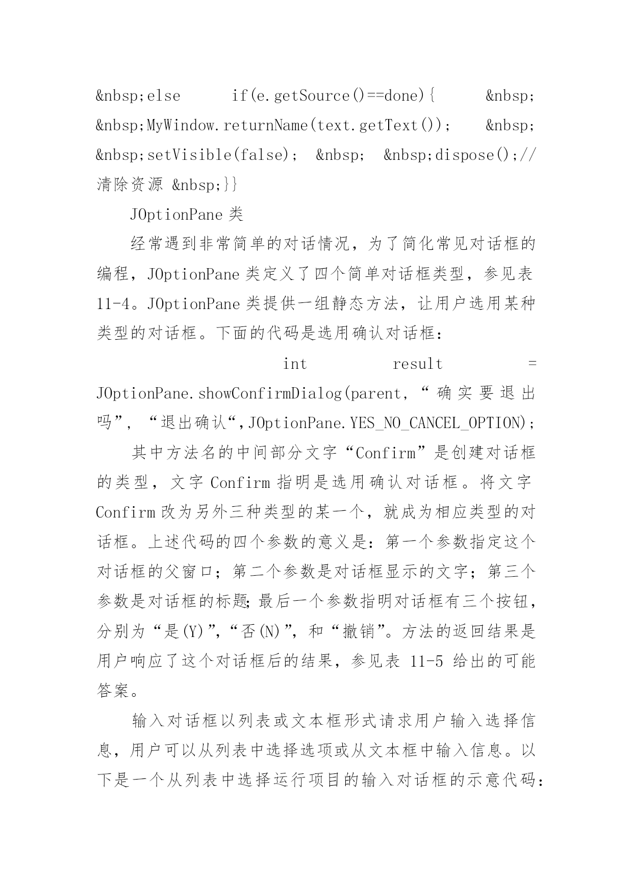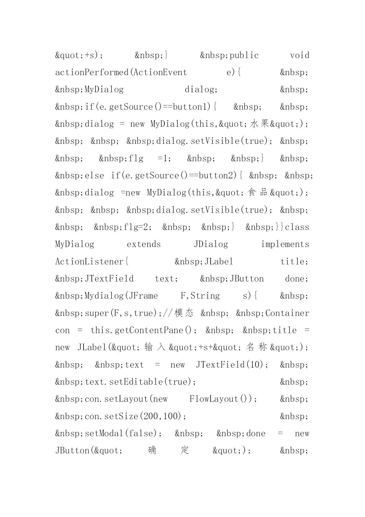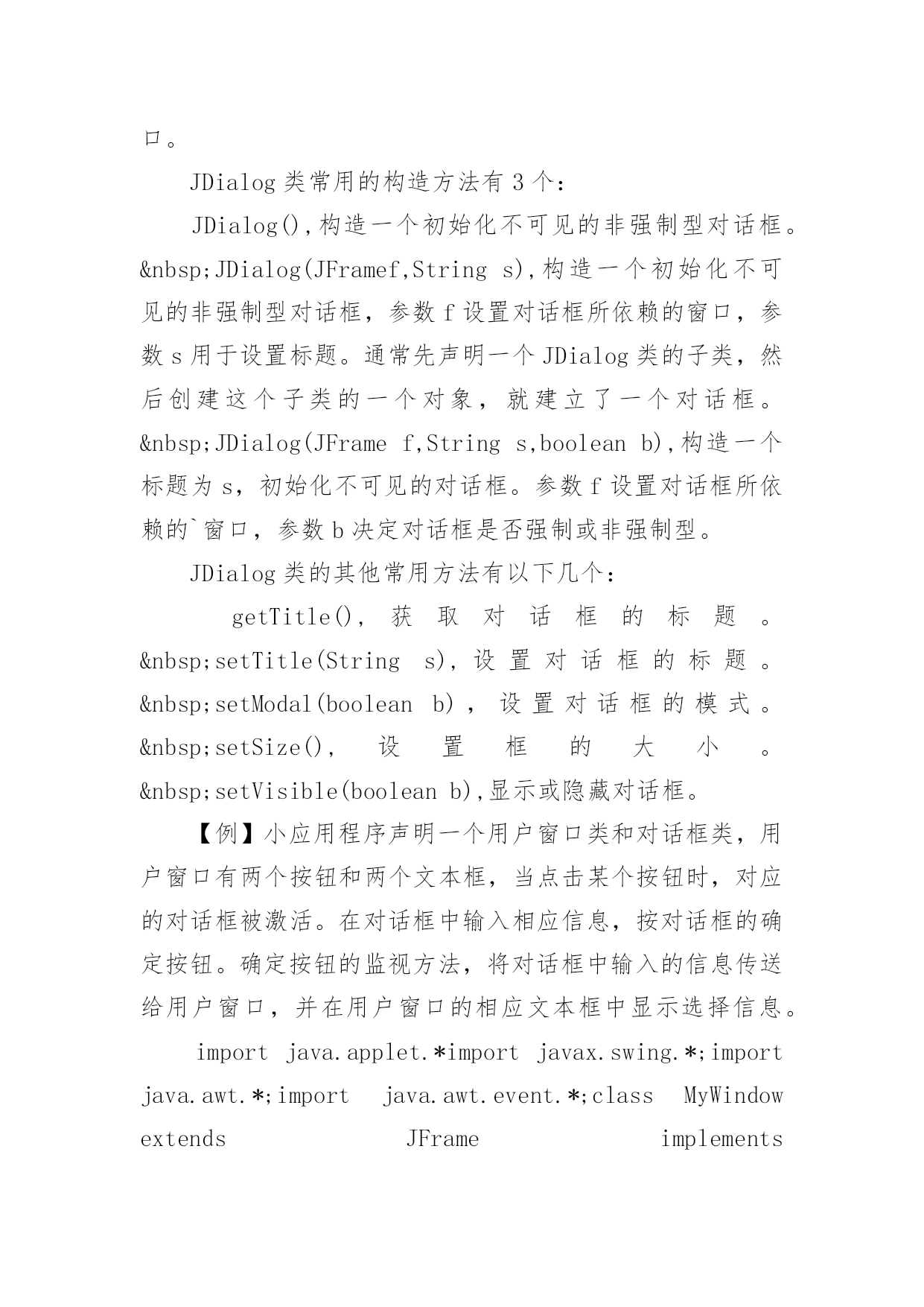 使用Java编写GUI对话框教程讲解使用Java编写GUI对话框教程讲解对话框是为了人机对话过程提供交互模式的工具。应用程序通过对话框,或给用户提供信息,或从用户获得信息。对话框是一个临时窗口,可以在其中放置用于得到用户输入的控件。在Swing中,有两个对话框类,它们是JDialog类和JOptionPane类。JDialog类提供构造并管理通用对话框;JOptionPane类给一些常见的对话框提供许多便于使用的选项,例如,简单的“yes-no”对话框等。JDialog类JDialog类作作对话框的基类。对话框与一般窗口不同,对话框依赖其他窗口,当它所依赖的窗口消失或最小化时,对话框也将消失;窗口还原时,对话框又会自动恢复。对话框分为强制和非强制两种。强制型对话框不能中断对话过程,直至对话框结束,才让程序响应对话框以外的事件。非强制型对话框可以中断对话过程,去响应对话框以外的事件。强制型也称有模式对话框,非强制对话框也称非模式对话框。JDialog对象也是一种容器,因此也可以给JDialog对话框指派布局管理器,对话框的默认布局为BoarderLayout布局。但组件不能直接加到对话框中,对话框也包含一个内容面板,应当把组件加到JDialog对象的内容面板中。由于对话框依赖窗口,因此要建立对话框,必须先要创建一个窗口。JDialog类常用的构造方法有3个:JDialog(),构造一个初始化不可见的非强制型对话框。 JDialog(JFramef,Strings),构造一个初始化不可见的非强制型对话框,参数f设置对话框所依赖的窗口,参数s用于设置标题。通常先声明一个JDialog类的子类,然后创建这个子类的一个对象,就建立了一个对话框。 JDialog(JFramef,Strings,booleanb),构造一个标题为s,初始化不可见的对话框。参数f设置对话框所依赖的`窗口,参数b决定对话框是否强制或非强制型。JDialog类的其他常用方法有以下几个:getTitle(),获取对话框的标题。 setTitle(Strings),设置对话框的标题。 setModal(booleanb),设置对话框的模式。 setSize(),设置框的大小。 setVisible(booleanb),显示或隐藏对话框。【例】小应用程序声明一个用户窗口类和对话框类,用户窗口有两个按钮和两个文本框,当点击某个按钮时,对应的对话框被激活。在对话框中输入相应信息,按对话框的确定按钮。确定按钮的监视方法,将对话框中输入的信息传送给用户窗口,并在用户窗口的相应文本框中显示选择信息。importjava.applet.*importjavax.swing.*;importjava.awt.*;importjava.awt.event.*;classMyWindowextendsJFrameimplementsActionListener{ privateJButtonbutton1,button2; privatestaticintflg=0; privatestaticJTextFieldtext1,text2; Mywindow(Strings){ super(s); Containercon=this.getContentPane(); con.setLayout(newGridLayout(2,2)); this.setSize(200,100); thissetLocation(100,100); button1=newJButton("选择水果"); button2=newJButton("选择食品"); button1.addActionListener(this); button2.addActionListener(this); text1=newJTextField(20); text2=newJTextField(20); con.add(button1); con.add(button2); con.add(text1); con.add(text2); this.setVisible(true); this.pack();&nb