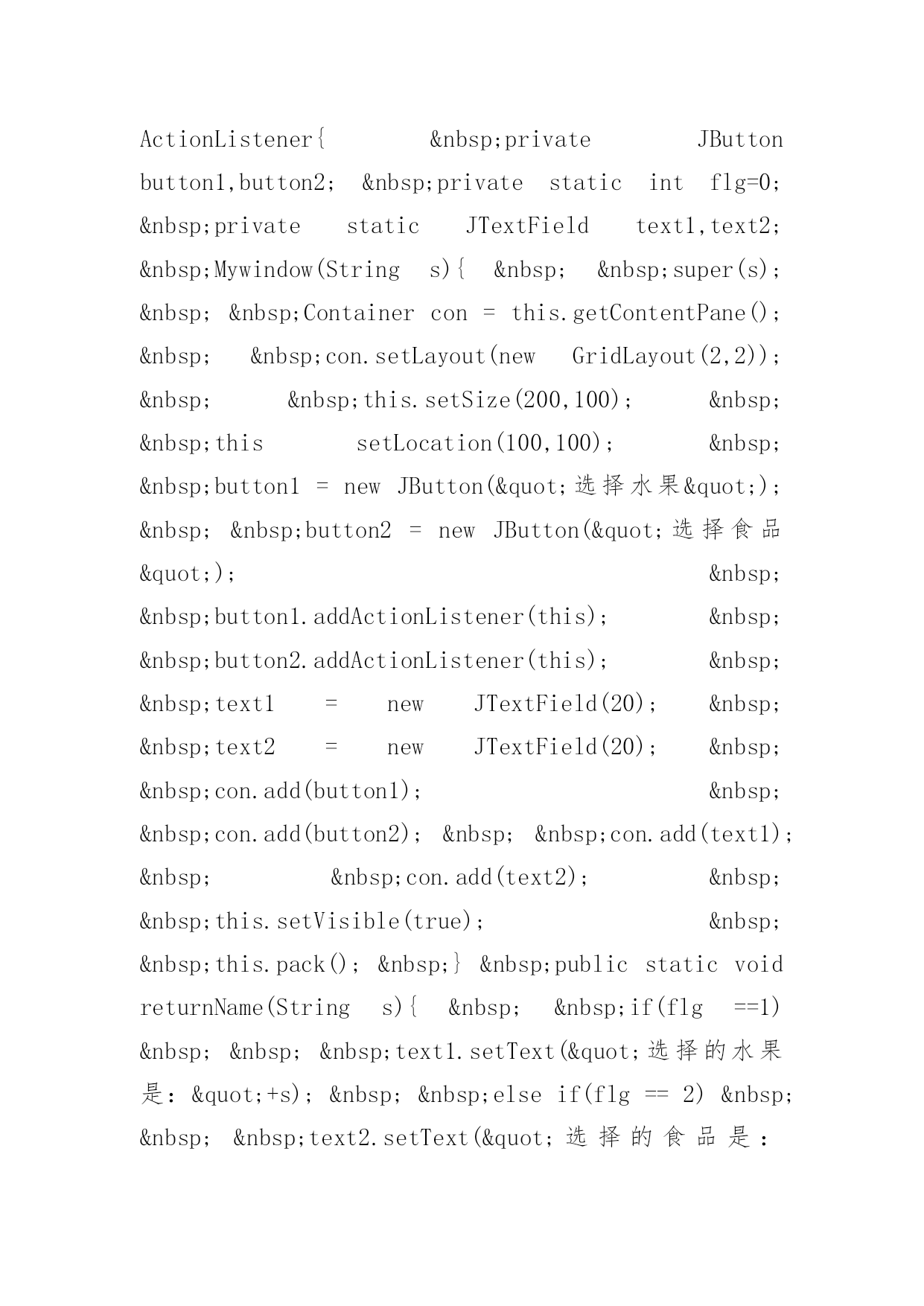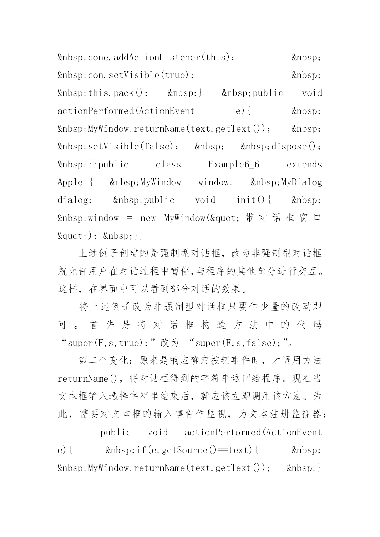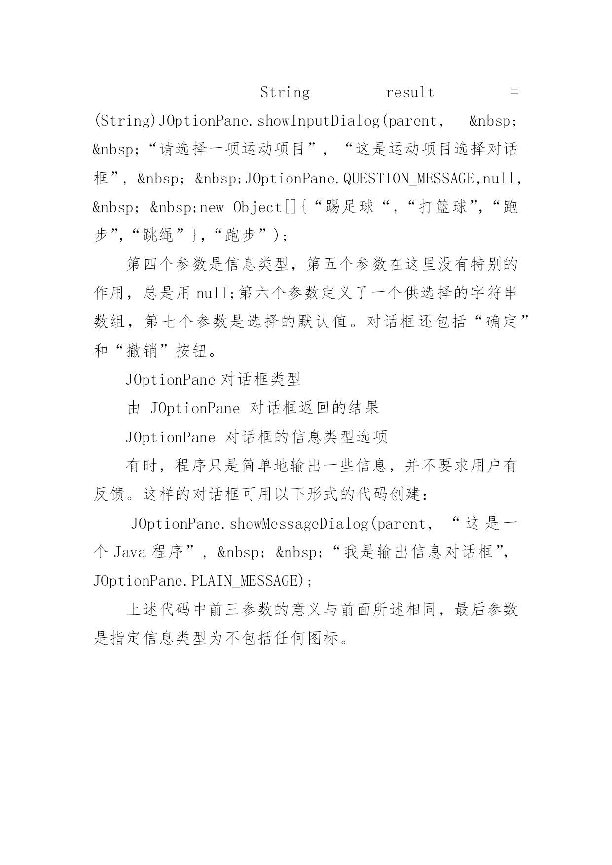 使用Java编写GUI对话框教程讲解使用Java编写GUI对话框教程讲解对话框是为了人机对话过程提供交互模式的工具。应用程序通过对话框,或给用户提供信息,或从用户获得信息。对话框是一个临时窗口,可以在其中放置用于得到用户输入的控件。在Swing中,有两个对话框类,它们是JDialog类和JOptionPane类。JDialog类提供构造并管理通用对话框;JOptionPane类给一些常见的对话框提供许多便于使用的选项,例如,简单的“yes-no”对话框等。JDialog类JDialog类作作对话框的基类。对话框与一般窗口不同,对话框依赖其他窗口,当它所依赖的窗口消失或最小化时,对话框也将消失;窗口还原时,对话框又会自动恢复。对话框分为强制和非强制两种。强制型对话框不能中断对话过程,直至对话框结束,才让程序响应对话框以外的事件。非强制型对话框可以中断对话过程,去响应对话框以外的事件。强制型也称有模式对话框,非强制对话框也称非模式对话框。JDialog对象也是一种容器,因此也可以给JDialog对话框指派布局管理器,对话框的默认布局为BoarderLayout布局。但组件不能直接加到对话框中,对话框也包含一个内容面板,应当把组件加到JDialog对象的内容面板中。由于对话框依赖窗口,因此要建立对话框,必须先要创建一个窗口。JDialog类常用的构造方法有3个:JDialog(),构造一个初始化不可见的非强制型对话框。 JDialog(JFramef,Strings),构造一个初始化不可见的非强制型对话框,参数f设置对话框所依赖的窗口,参数s用于设置标题。通常先声明一个JDialog类的子类,然后创建这个子类的一个对象,就建立了一个对话框。 JDialog(JFramef,Strings,booleanb),构造一个标题为s,初始化不可见的对话框。参数f设置对话框所依赖的`窗口,参数b决定对话框是否强制或非强制型。JDialog类的其他常用方法有以下几个:getTitle(),获取对话框的标题。 setTitle(Strings),设置对话框的标题。 setModal(booleanb),设置对话框的模式。 setSize(),设置框的大小。 setVisible(booleanb),显示或隐藏对话框。【例】小应用程序声明一个用户窗口类和对话框类,用户窗口有两个按钮和两个文本框,当点击某个按钮时,对应的对话框被激活。在对话框中输入相应信息,按对话框的确定按钮。确定按钮的监视方法,将对话框中输入的信息传送给用户窗口,并在用户窗口的相应文本框中显示选择信息。importjava.applet.*importjavax.swing.*;importjava.awt.*;importjava.awt.event.*;classMyWindowextendsJFrameimplementsActionListener{ privateJButtonbutton1,button2; privatestaticintflg=0; privatestaticJTextFieldtext1,text2; Mywindow(Strings){ super(s); Containercon=this.getContentPane(); con.setLayout(newGridLayout(2,2)); this.setSize(200,100); thissetLocation(100,100); button1=newJButton("选择水果"); button2=newJButton("选择食品"); button1.addActionListener(this); button2.addActionListener(this); text1=newJTextField(20); text2=newJTextField(20); con.add(button1); con.add(button2); con.add(text1); con.add(text2); this.setVisible(true); this.pack();&nb