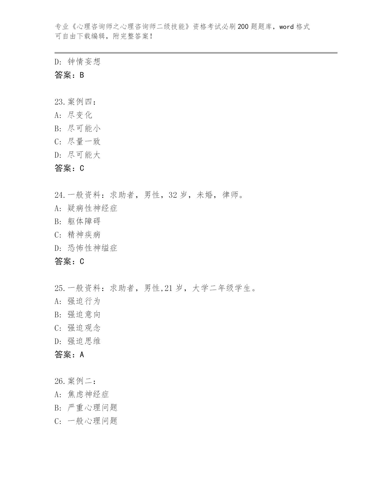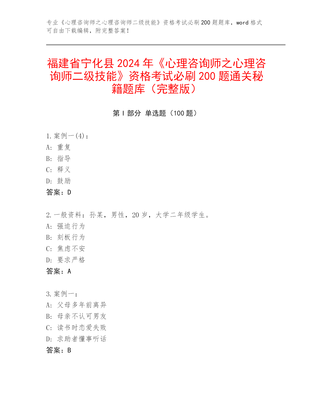 福建省宁化县2024年《心理咨询师之心理咨询师二级技能》资格考试必刷200题通关秘籍题库(完整版)