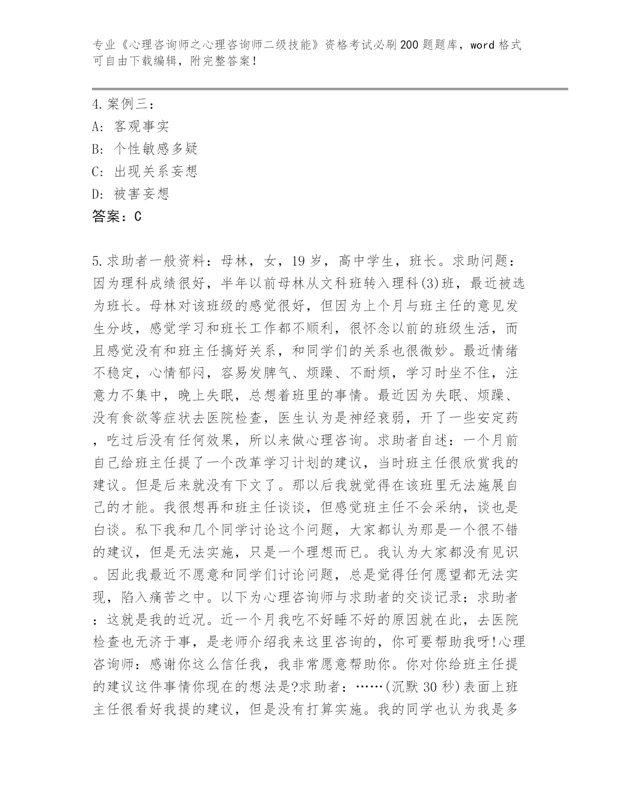 云南省《心理咨询师之心理咨询师二级技能》资格考试必刷200题通关秘籍题库(必刷)