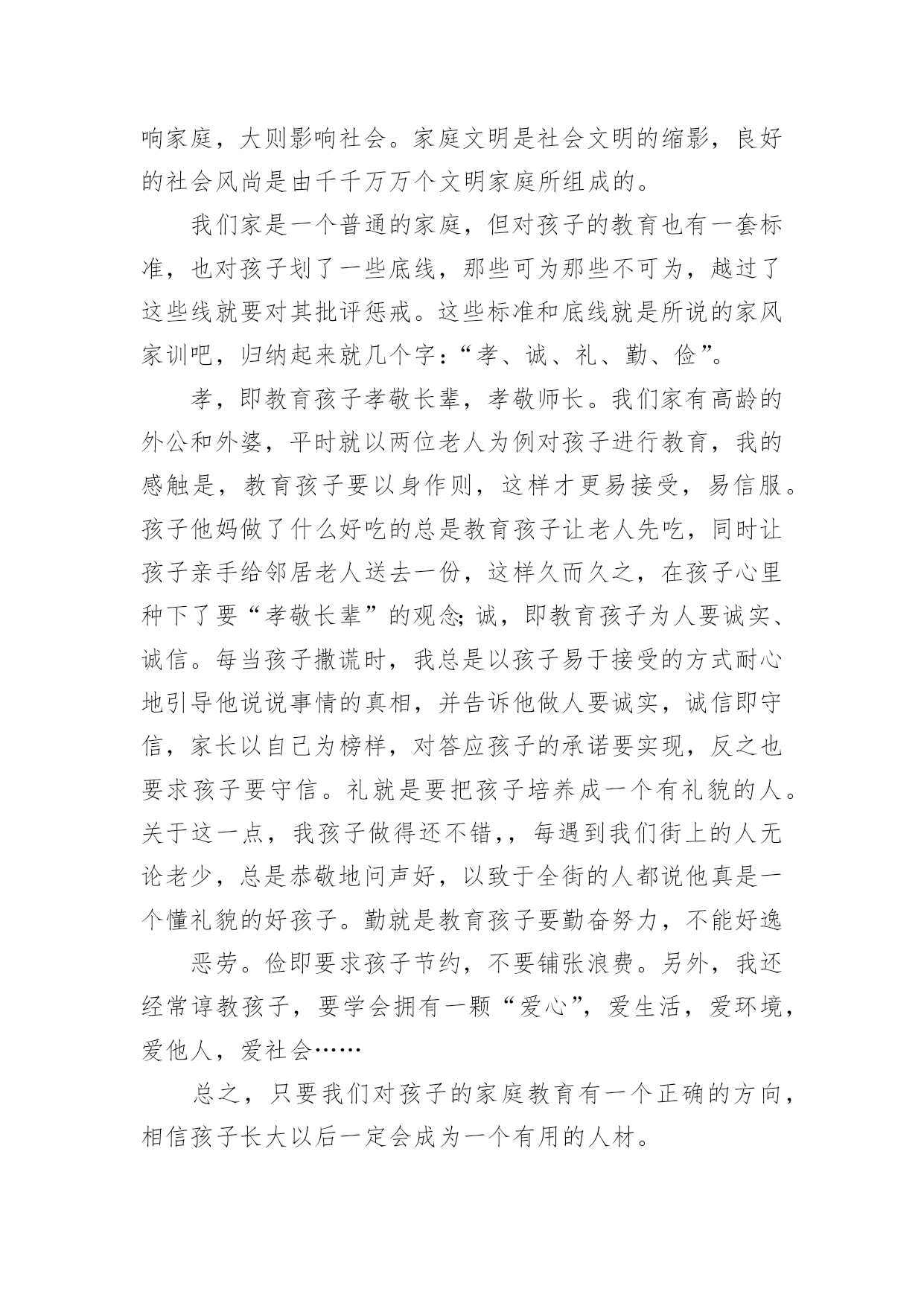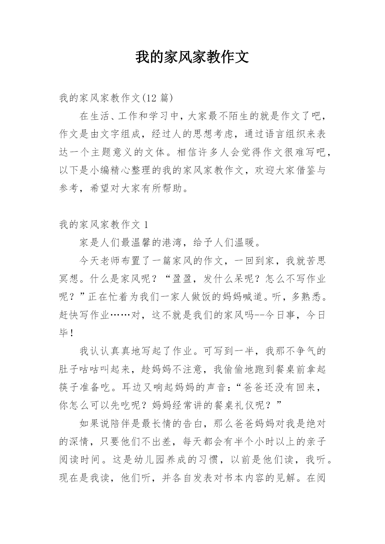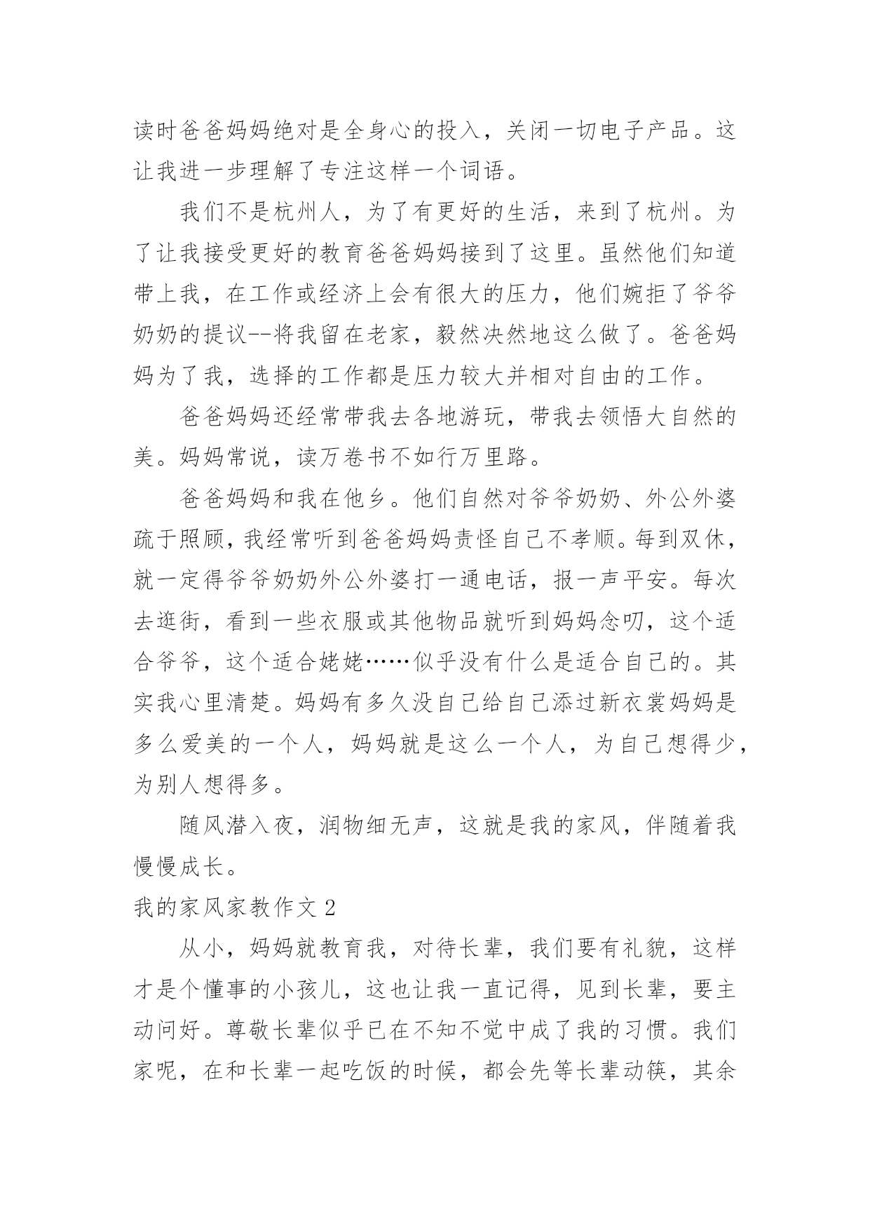我的家风家教作文我的家风家教作文(12篇)在生活、工作和学习中,大家最不陌生的就是作文了吧,作文是由文字组成,经过人的思想考虑,通过语言组织来表达一个主题意义的文体。相信许多人会觉得作文很难写吧,以下是小编精心整理的我的家风家教作文,欢迎大家借鉴与参考,希望对大家有所帮助。我的家风家教作文1家是人们最温馨的港湾,给予人们温暖。今天老师布置了一篇家风的作文,一回到家,我就苦思冥想。什么是家风呢?“盈盈,发什么呆呢?怎么不写作业呢?”正在忙着为我们一家人做饭的妈妈喊道。听,多熟悉。赶快写作业……对,这不就是我们的家风吗--今日事,今日毕!我认认真真地写起了作业。可写到一半,我那不争气的肚子咕咕叫起来,趁妈妈不注意,我偷偷地跑到餐桌前拿起筷子准备吃。耳边又响起妈妈的声音:“爸爸还没有回来,你怎么可以先吃呢?妈妈经常讲的餐桌礼仪呢?”如果说陪伴是最长情的告白,那么爸爸妈妈对我是绝对的深情,只要他们不出差,每天都会有半个小时以上的亲子阅读时间。这是幼儿园养成的习惯,以前是他们读,我听。现在是我读,他们听,并各自发表对书本内容的见解。在阅读时爸爸妈妈绝对是全身心的投入,关闭一切电子产品。这让我进一步理解了专注这样一个词语。我们不是杭州人,为了有更好的生活,来到了杭州。为了让我接受更好的教育爸爸妈妈接到了这里。虽然他们知道带上我,在工作或经济上会有很大的压力,他们婉拒了爷爷奶奶的提议--将我留在老家,毅然决然地这么做了。爸爸妈妈为了我,选择的工作都是压力较大并相对自由的工作。爸爸妈妈还经常带我去各地游玩,带我去领悟大自然的美。妈妈常说,读万卷书不如行万里路。爸爸妈妈和我在他乡。他们自然对爷爷奶奶、外公外婆疏于照顾,我经常听到爸爸妈妈责怪自己不孝顺。每到双休,就一定得爷爷奶奶外公外婆打一通电话,报一声平安。每次去逛街,看到一些衣服或其他物品就听到妈妈念叨,这个适合爷爷,这个适合姥姥……似乎没有什么是适合自己的。其实我心里清楚。妈妈有多久没自己给自己添过新衣裳妈妈是多么爱美的一个人,妈妈就是这么一个人,为自己想得少,为别人想得多。随风潜入夜,润物细无声,这就是我的家风,伴随着我慢慢成长。我的家风家教作文2从小,妈妈就教育我,对待长辈,我们要有礼貌,这样才是个懂事的小孩儿,这也让我一直记得,见到长辈,要主动问好。尊敬长辈似乎已在不知不觉中成了我的习惯。我们家呢,在和长辈一起吃饭的时候,都会先等长辈动筷,其余的人才会动筷,妈妈说,这也是一种礼貌,所以每一次和长辈一起吃饭时,我都会看到,长辈先动筷的情景。记得一次家里的聚餐,吃饭时,长辈还没有动筷,大家也都没动筷,那时,我就问妈妈:“妈妈,为什么她们都不吃饭啊?”妈妈笑着回答我:“因为这是一种礼貌啊!你看,长辈都没有动筷,所以我们不能动筷。”我又问:“那是不是一定要等长辈动筷了,我们才能吃饭啊?”妈妈说:“对,在我们和长辈一起吃饭的时候,如果长辈没有动筷,那么我们就不能动筷,知道了吗?”我说:“嗯嗯,我知道了,我知道了,我会记得的。”然后,长辈动筷了,在长辈动筷后的,大家也都吃起了饭,从那次聚餐之后,我就又学到了一个知识,我觉得这应该算是一种餐桌礼仪吧!我记得我小时候,老是不喜欢端起碗来吃饭,有一次,妈妈看见了,就打了我的手,妈妈对我说:“吃饭的时候,要把碗端起来!”我就问妈妈:“为什么呀?”妈妈回答说:“因为端起碗来吃饭,也是一种礼貌啊,你想想,如果你去别人家吃饭,如果不把碗端起来,别人就会说,这个小孩不懂礼貌。”我听了之后,立马就把碗端起来了,因为我不想让别人认为,我是一个没礼貌的小孩,然后我对妈妈说:“妈妈,以后我知道了!”从那以后,爸爸妈妈看见我不端起碗来吃饭就会提醒我,我被提醒后,也会立马把碗端起来。我一直会告诉自己,我要做一个有礼貌的人,因为爸爸妈妈在日常生活中,就一直在教育着我,我不想让爸爸妈妈的教育全都变成废话,所以我总是会遵守该遵守的礼貌。懂礼貌也是我在日常生活中学会的知识,这也让我知道了,生活中有很多的小细节,都需要去注意,这样才能学到更多的知识。我的家风家教作文3家是花根,孩子是鲜花,家如阳光,鲜花只有在阳光的照射下才能清香宜人;家庭是种子,孩子是小树,家风如雨露,小树只有在雨露的滋润下才能茁壮成长。多才多艺的我就在这优良活水中健康生长。有人说:“家是第一所学校,父母是第一任老师。”这话一点不假。在我家客厅里最显眼的地方,挂着一幅精致的毛笔字,我想这幅字也许就是家训吧!上面的“吃苦耐劳、持之以恒”却深深地刻在我心中。爸爸就以这六个字为人生准则,也同样用这六个字教育我。虽然爸爸是个普通的工人,但一直教育我“吃苦耐劳、持之以恒”让我写书法得到荣誉。说起荣誉,记的一次,我每天去书法班练毛笔练的时间长了,有些厌烦,我灵机一动想:到“装”肚疼这样就不用去书法班了。一开始,爸爸以为我真疼