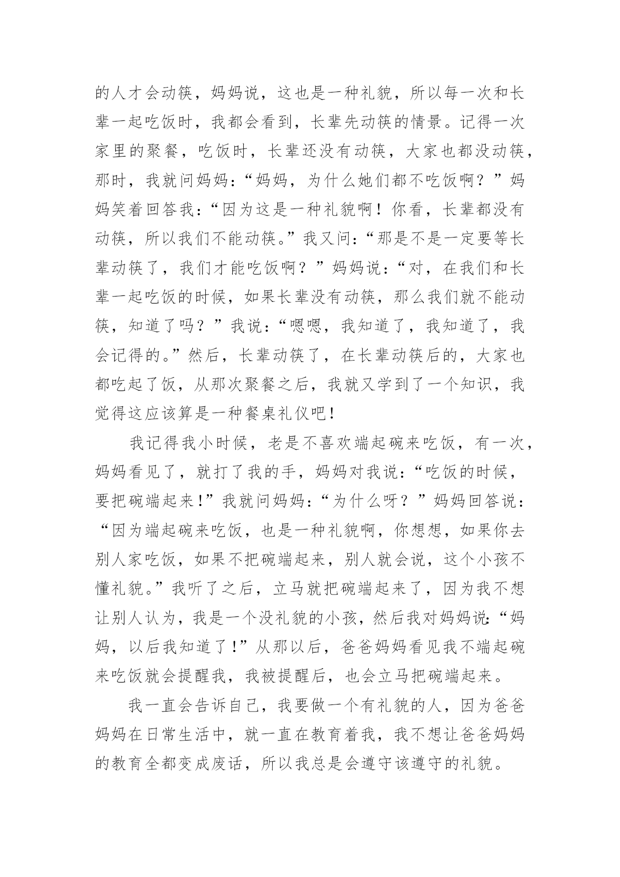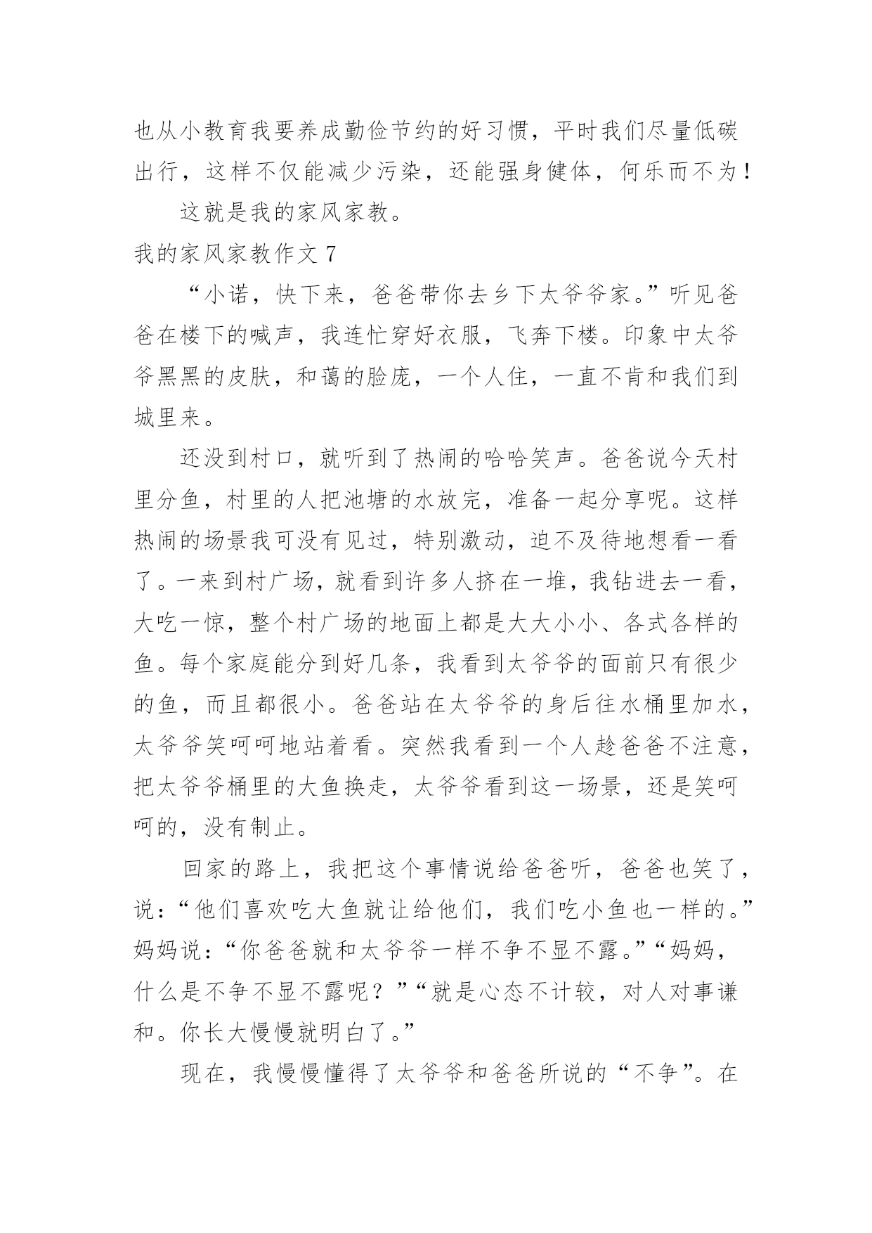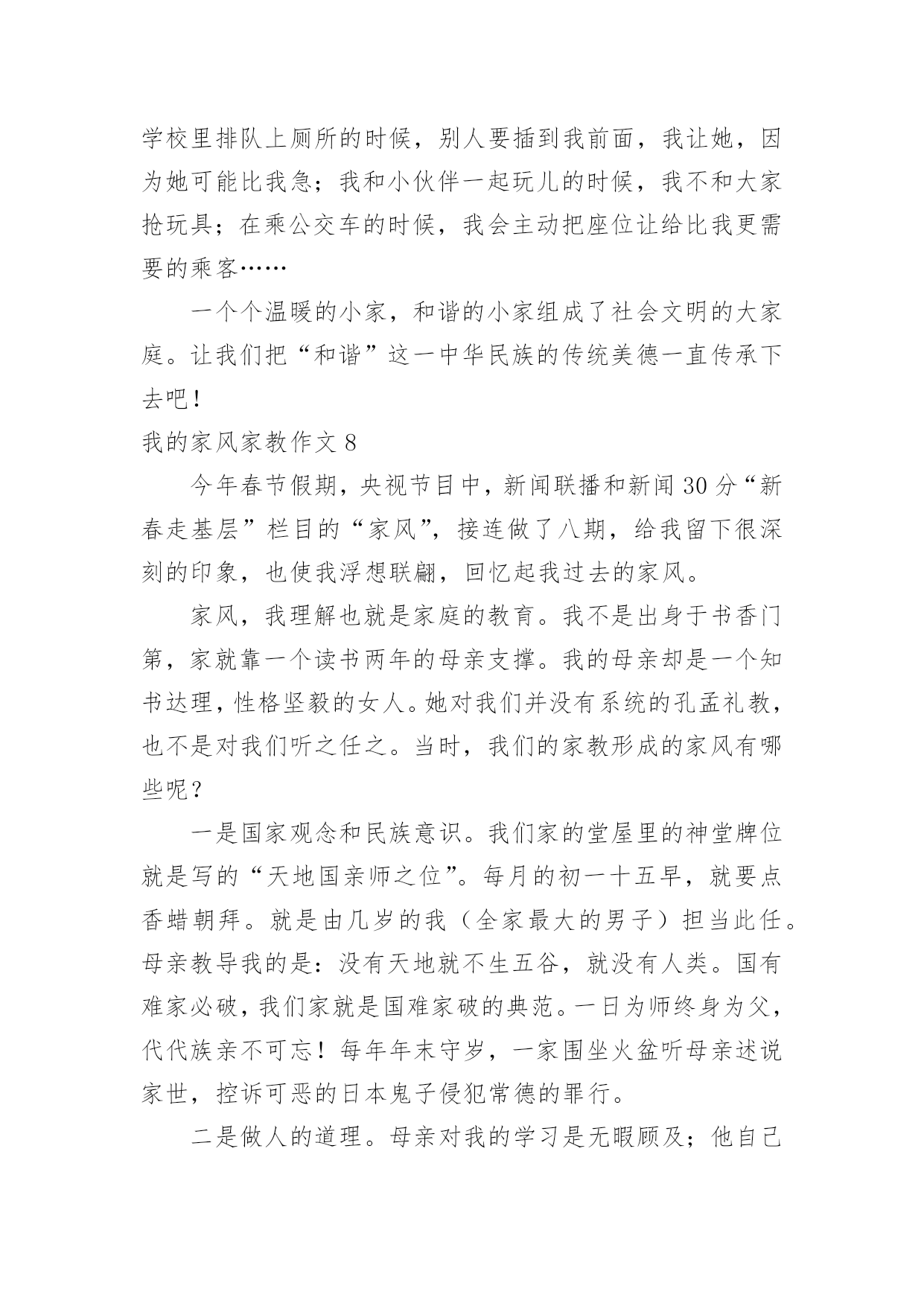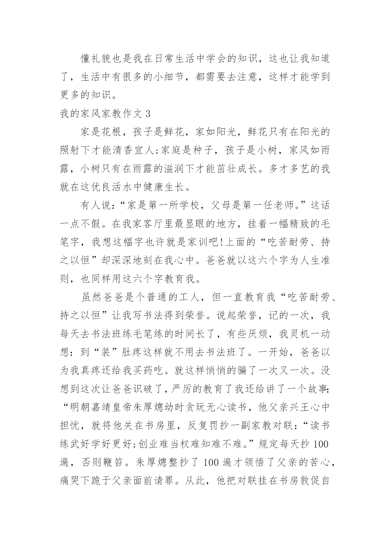 我的家风家教作文我的家风家教作文(12篇)在生活、工作和学习中,大家最不陌生的就是作文了吧,作文是由文字组成,经过人的思想考虑,通过语言组织来表达一个主题意义的文体。相信许多人会觉得作文很难写吧,以下是小编精心整理的我的家风家教作文,欢迎大家借鉴与参考,希望对大家有所帮助。我的家风家教作文1家是人们最温馨的港湾,给予人们温暖。今天老师布置了一篇家风的作文,一回到家,我就苦思冥想。什么是家风呢?“盈盈,发什么呆呢?怎么不写作业呢?”正在忙着为我们一家人做饭的妈妈喊道。听,多熟悉。赶快写作业……对,这不就是我们的家风吗--今日事,今日毕!我认认真真地写起了作业。可写到一半,我那不争气的肚子咕咕叫起来,趁妈妈不注意,我偷偷地跑到餐桌前拿起筷子准备吃。耳边又响起妈妈的声音:“爸爸还没有回来,你怎么可以先吃呢?妈妈经常讲的餐桌礼仪呢?”如果说陪伴是最长情的告白,那么爸爸妈妈对我是绝对的深情,只要他们不出差,每天都会有半个小时以上的亲子阅读时间。这是幼儿园养成的习惯,以前是他们读,我听。现在是我读,他们听,并各自发表对书本内容的见解。在阅读时爸爸妈妈绝对是全身心的投入,关闭一切电子产品。这让我进一步理解了专注这样一个词语。我们不是杭州人,为了有更好的生活,来到了杭州。为了让我接受更好的教育爸爸妈妈接到了这里。虽然他们知道带上我,在工作或经济上会有很大的压力,他们婉拒了爷爷奶奶的提议--将我留在老家,毅然决然地这么做了。爸爸妈妈为了我,选择的工作都是压力较大并相对自由的工作。爸爸妈妈还经常带我去各地游玩,带我去领悟大自然的美。妈妈常说,读万卷书不如行万里路。爸爸妈妈和我在他乡。他们自然对爷爷奶奶、外公外婆疏于照顾,我经常听到爸爸妈妈责怪自己不孝顺。每到双休,就一定得爷爷奶奶外公外婆打一通电话,报一声平安。每次去逛街,看到一些衣服或其他物品就听到妈妈念叨,这个适合爷爷,这个适合姥姥……似乎没有什么是适合自己的。其实我心里清楚。妈妈有多久没自己给自己添过新衣裳妈妈是多么爱美的一个人,妈妈就是这么一个人,为自己想得少,为别人想得多。随风潜入夜,润物细无声,这就是我的家风,伴随着我慢慢成长。我的家风家教作文2从小,妈妈就教育我,对待长辈,我们要有礼貌,这样才是个懂事的小孩儿,这也让我一直记得,见到长辈,要主动问好。尊敬长辈似乎已在不知不觉中成了我的习惯。我们家呢,在和长辈一起吃饭的时候,都会先等长辈动筷,其余的人才会动筷,妈妈说,这也是一种礼貌,所以每一次和长辈一起吃饭时,我都会看到,长辈先动筷的情景。记得一次家里的聚餐,吃饭时,长辈还没有动筷,大家也都没动筷,那时,我就问妈妈:“妈妈,为什么她们都不吃饭啊?”妈妈笑着回答我:“因为这是一种礼貌啊!你看,长辈都没有动筷,所以我们不能动筷。”我又问:“那是不是一定要等长辈动筷了,我们才能吃饭啊?”妈妈说:“对,在我们和长辈一起吃饭的时候,如果长辈没有动筷,那么我们就不能动筷,知道了吗?”我说:“嗯嗯,我知道了,我知道了,我会记得的。”然后,长辈动筷了,在长辈动筷后的,大家也都吃起了饭,从那次聚餐之后,我就又学到了一个知识,我觉得这应该算是一种餐桌礼仪吧!我记得我小时候,老是不喜欢端起碗来吃饭,有一次,妈妈看见了,就打了我的手,妈妈对我说:“吃饭的时候,要把碗端起来!”我就问妈妈:“为什么呀?”妈妈回答说:“因为端起碗来吃饭,也是一种礼貌啊,你想想,如果你去别人家吃饭,如果不把碗端起来,别人就会说,这个小孩不懂礼貌。”我听了之后,立马就把碗端起来了,因为我不想让别人认为,我是一个没礼貌的小孩,然后我对妈妈说:“妈妈,以后我知道了!”从那以后,爸爸妈妈看见我不端起碗来吃饭就会提醒我,我被提醒后,也会立马把碗端起来。我一直会告诉自己,我要做一个有礼貌的人,因为爸爸妈妈在日常生活中,就一直在教育着我,我不想让爸爸妈妈的教育全都变成废话,所以我总是会遵守该遵守的礼貌。懂礼貌也是我在日常生活中学会的知识,这也让我知道了,生活中有很多的小细节,都需要去注意,这样才能学到更多的知识。我的家风家教作文3家是花根,孩子是鲜花,家如阳光,鲜花只有在阳光的照射下才能清香宜人;家庭是种子,孩子是小树,家风如雨露,小树只有在雨露的滋润下才能茁壮成长。多才多艺的我就在这优良活水中健康生长。有人说:“家是第一所学校,父母是第一任老师。”这话一点不假。在我家客厅里最显眼的地方,挂着一幅精致的毛笔字,我想这幅字也许就是家训吧!上面的“吃苦耐劳、持之以恒”却深深地刻在我心中。爸爸就以这六个字为人生准则,也同样用这六个字教育我。虽然爸爸是个普通的工人,但一直教育我“吃苦耐劳、持之以恒”让我写书法得到荣誉。说起荣誉,记的一次,我每天去书法班练毛笔练的时间长了,有些厌烦,我灵机一动想:到“装”肚疼这样就不用去书法班了。一开始,爸爸以为我真疼