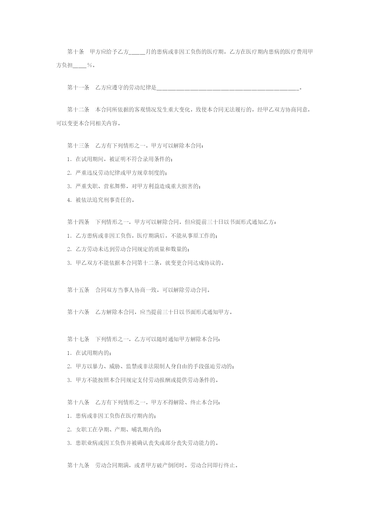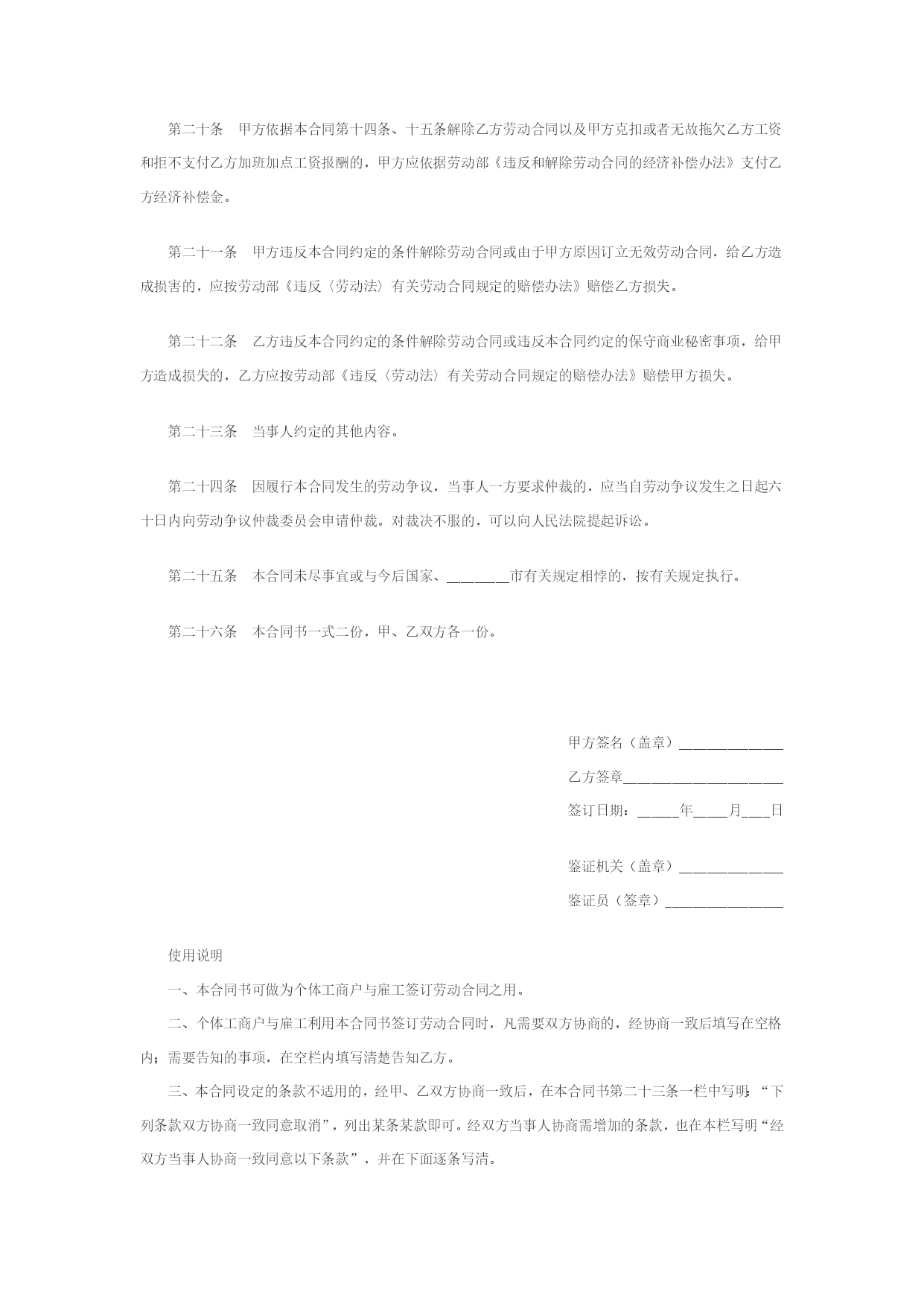 个体工商户雇工劳动合同雇主(以下简称甲方)与受雇职工(以下简称乙方)根据《中华人民共和国劳动法》和《_________》,甲乙双方经平等协商同意,自愿签订本合同,共同遵守本合同所列条款。第一条本合同期限自_________年______月______日开始,至_________年_____月_____日终止,其中试用期_________天。第二条乙方同意在甲方从事_________工作。第三条甲方对乙方的劳动质量和数量要求是_________。第四条甲方每月______日以_________货币形式支付乙方工资,工资不低于________元,其中试用期间工资为_________元。第五条甲方安排乙方每日工作时间不超过8小时,每周不超过40小时,甲方保证乙方每周至少休息一日,因工作需要延长工作时间的,经乙方同意延长工作时间每日不得超过3小时,每月不得超过36小时。第六条甲方安排乙方加班加点的,甲方应依法支付加班加点工资,按以下标准支付工资:1.在日法定标准工作时间以外延长工作时间的,按照乙方小时工资标准的150%支付工资;2.在休息日工作,按照乙方日或小时工资标准为200%支付工资;3.在法定休假节日工作的,应另外支付乙方日或小时工资标准300%的工资。第七条甲乙双方应按国家和_________市社会保险的有关规定缴纳社会保险费。第八条甲方执行国家有关劳动保护的法规、规章,为乙方提供劳动安全和卫生设施。根据从事工种的需要,发给乙方劳动保护用品和配置生产、工作必需的劳动工具。第九条甲方负责为乙方办理人身意外伤害保险。保险期限由甲方按照双方签订的劳动合同期限确定,保险金额为_________元。第十条甲方应给予乙方______月的患病或非因工负伤的医疗期,乙方在医疗期内患病的医疗费用甲方负担_____%。第十一条乙方应遵守的劳动纪律是___________________________________________________。第十二条本合同所依据的客观情况发生重大变化,致使本合同无法履行的,经甲乙双方协商同意,可以变更本合同相关内容。第十三条乙方有下列情形之一,甲方可以解除本合同:1.在试用期间,被证明不符合录用条件的;2.严重违反劳动纪律或甲方规章制度的;3.严重失职、营私舞弊,对甲方利益造成重大损害的;4.被依法追究刑事责任的。第十四条下列情形之一,甲方可以解除合同,但应提前三十日以书面形式通知乙方:1.乙方患病或非因工负伤,医疗期满后,不能从事原工作的;2.乙方劳动未达到劳动合同规定的质量和数量的;3.甲乙双方不能依据本合同第十二条,就变更合同达成协议的。第十五条合同双方当事人协商一致,可以解除劳动合同。第十六条乙方解除本合同,应当提前三十日以书面形式通知甲方。第十七条下列情形之一,乙方可以随时通知甲方解除本合同:1.在试用期内的;2.甲方以暴力、威胁、监禁或非法限制人身自由的手段强迫劳动的;3.甲方不能按照本合同规定支付劳动报酬或提供劳动条件的。第十八条乙方有下列情形之一,甲方不得解除、终止本合同:1.患病或非因工负伤在医疗期内的;2.女职工在孕期、产期、哺乳期内的;3.患职业病或因工负伤并被确认丧失或部分丧失劳动能力的。第十九条劳动合同期满,或者甲方破产倒闭时,劳动合同即行终止。第二十条甲方依据本合同第十四条、十五条解除乙方劳动合同以及甲方克扣或者无故拖欠乙方工资和拒不支付乙方加班加点工资报酬的,甲方应依据劳动部《违反和解除劳动合同的经济补偿办法》支付乙方经济补偿金。第二十一条甲方违反本合同约定的条件解除劳动合同或由于甲方原因订立无效劳动合同,给乙方造成损害的,应按劳动部《违反〈劳动法〉有关劳动合同规定的赔偿办法》赔偿乙方损失。第二十二条乙方违反本合同约定的条件解除劳动合同或违反本合同约定的保守商业秘密事项,给甲方造成损失的,乙方应按劳动部《违反〈劳动法〉有关劳动合同规定的赔偿办法》赔偿甲方损失。第二十三条当事人约定的其他内容。第二十四条因履行本合同发生的劳动争议,当事人一方要求仲裁的,应当自劳动争议发生之日起六十日内向劳动争议仲裁委员会申请仲裁。对裁决不服的,可以向人民法院提起诉讼。第二十五条本合同未尽事宜或与今后国家、_________市有关规定相悖的,按有关规定执行。第二十六条本合同书一式二份,甲、乙双方各一份。甲方签名(盖章)_______________乙方签章_______________________签订日期:______年_____月____日鉴证机关(盖章)_______________鉴证员(签章)_________________使用说明一、本合同书可做为个体工商户与雇工签订劳动合同之用。二、个体工商户与雇工利用本合同书签订劳动合同时