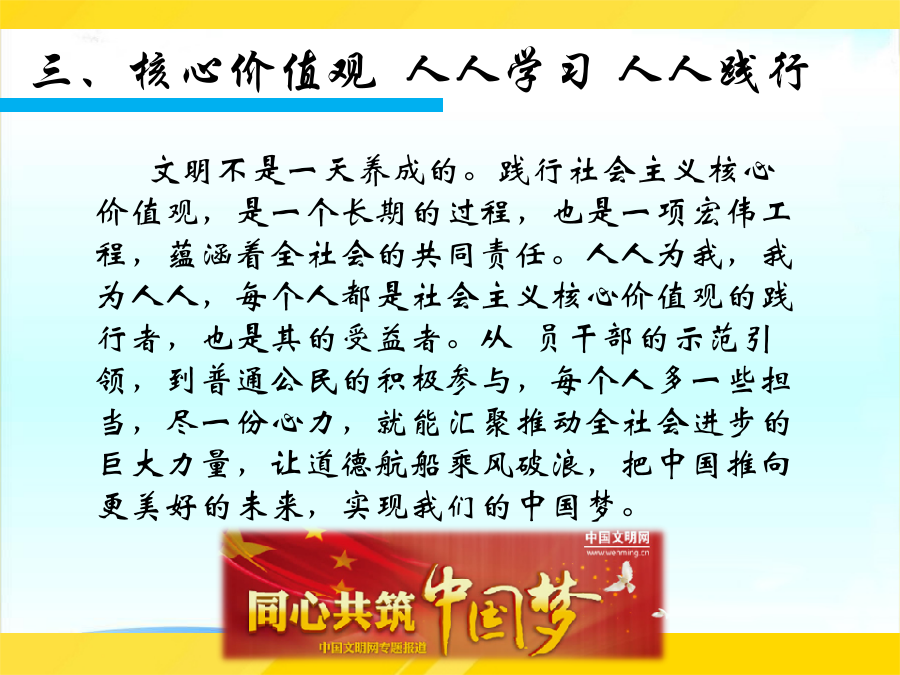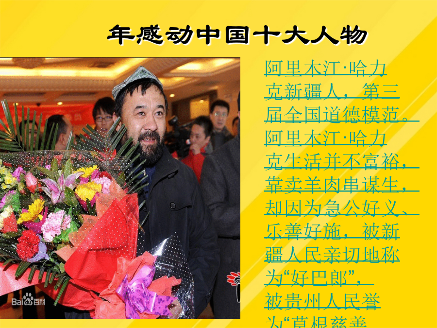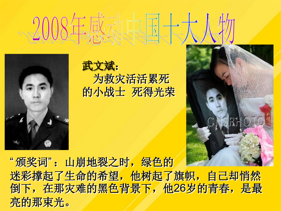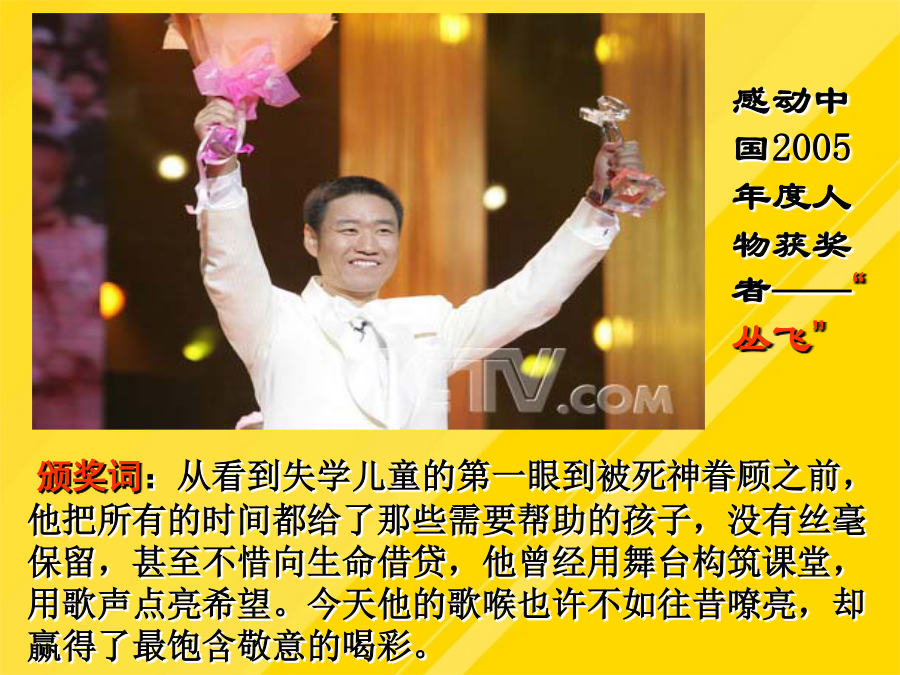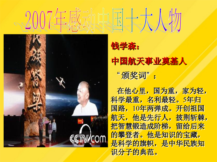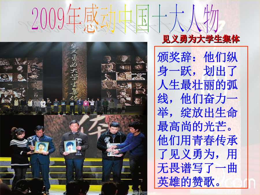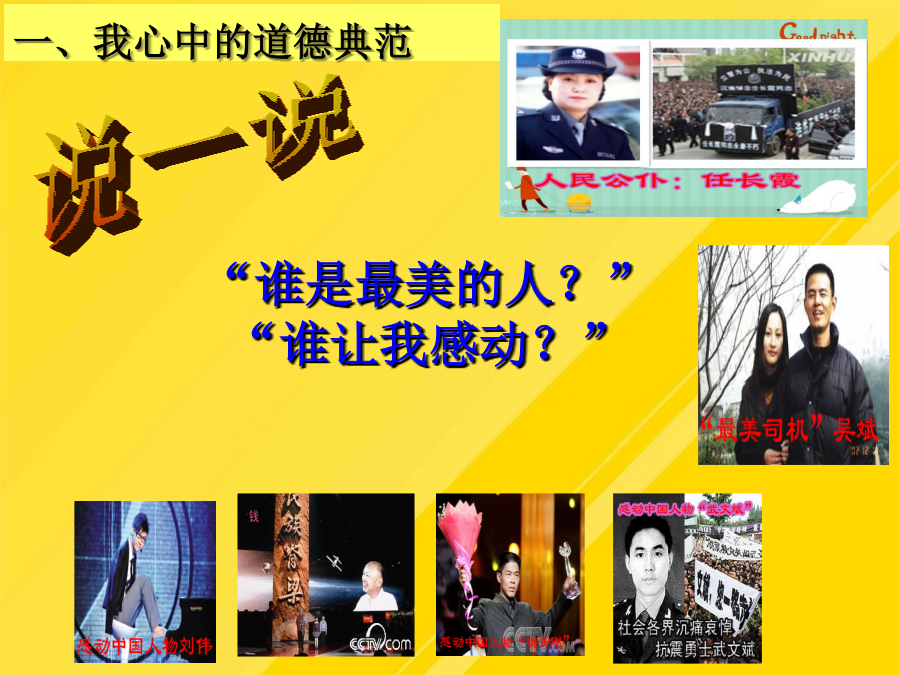 网上疯传的一条微博:“谁是最美的人?”“谁让我感动?”颁奖词:从看到失学儿童的第一眼到被死神眷顾之前,他把所有的时间都给了那些需要帮助的孩子,没有丝毫保留,甚至不惜向生命借贷,他曾经用舞台构筑课堂,用歌声点亮希望。今天他的歌喉也许不如往昔嘹亮,却赢得了最饱含敬意的喝彩。钱学森:中国航天事业奠基人“颁奖词”:在他心里,国为重,家为轻,科学最重,名利最轻。5年归国路,10年两弹成。开创祖国航天,他是先行人,披荆斩棘,把智慧锻造成阶梯,留给后来的攀登者。他是知识的宝藏,是科学的旗帜,是中华民族知识分子的典范。2008年感动中国十大人物颁奖辞:他们纵身一跃,划出了人生最壮丽的弧线,他们奋力一举,绽放出生命最高尚的光芒。他们用青春传承了见义勇为,用无畏谱写了一曲英雄的赞歌。年感动中国十大人物人民日报:《感动中国》,铸造精神品牌这些人物表现出来的令人感动、为人景仰的高尚精神,建构着和谐社会及其所特有的和谐文化。这是《感动中国》所展现的价值取向,抓住了人民精神文化需要的新变化,表现出一个主流媒体的责任与眼光。铸造引领主流价值观念的“亿万人民的精神品牌”,成为提高国家文化软实力的一个重要载体。一、我心目中的思想道德模范今天的道德模范“最美司机”吴斌年6月4日,高速路上遭铁块袭击,肝脏破裂忍剧痛安全停车,以一名职业驾驶员的高度敬业精神,用自己76秒的坚守和生命完成了保证乘客安全的神圣使命和英雄壮举。年5月8日晚,在黑龙江省,正当佳木斯市第十九中学一群学生准备过马路时,一辆客车突然失控与前方停在路边的客车追尾相撞,被撞客车猛力冲向正要过马路的学生。危险瞬间,本可以躲开逃生的女教师张丽莉,奋不顾身去救学生,自己被卷入车轮下,双腿粉碎性骨折,高位截肢。探究思考:从上道德典范与今天涌现出来的道德模范说明什么问题?一、我心目中的思想道德模范众说纷纭一、我心目中的思想道德模范为人民服务是政府的工作宗旨,为人民服务首先是对领导干部和共产员的要求。同资本主义思想道德以个人主义为原则是根本对立的。是社会主义经济、政治和文化建设的必然要求。在社会主义社会,人民当家作主,国家利益、集体利益和个人利益根本上是一致的,使集体主义成为调节三者利益关系的重要原则。辨析一、我心目中的思想道德模范怎样加强思想道德建设?天鹅、大虾和梭鱼——建设社会主义核心价值体系1、是什么(what)社会主义现代化,这一“中国梦”的实现需要13亿民众共同为之奋斗努力,但用什么样的价值观才能凝聚起全体中国人的意志,达成共识?中共十八大给出答案:“社会主义核心价值观”以提高全民族的思想道德素质。1、是什么(what)——建设社会主义核心价值体系道德观念总是带着不同时代的印记,被赋予时代内涵。勿以恶小而为之,勿以善小而不为。——建设社会主义核心价值体系只是天鹅拼命往云里冲,虾用力往后拖,梭子鱼使劲往池塘里拉。既尊重差异、包容多样,又有力抵制各种错误和腐朽思想的影响,不断增强社会主义意识形态的吸引力和凝聚力,从根本上提高国家文化软实力我们公民还应该怎样呢?①是社会主义意识形态的本质体现,是全国人民团结奋斗的共同思想基础。2、本公司是香港六合彩特码内部信息中心的公司。(1)坚持依法治国和以德治国相结合,以诚信建设为重点,加强社会公德、职业道德、家庭美德、个人品德教育,大力弘扬中华传统美德,弘扬时代新风。11月15日中午12时许,在兰州机场高速茅茨互通立交上,一辆车号为甘D-43282在半挂车,在前往甘肃武威方向时,车辆失控发生侧翻,而车上满载的柑橘也散落一地。它们是一个有机统一的整体2、为什么?(why)树立社会主义荣辱观我国是一个有13亿多人口、56个民族的大国,靠什么来统一思想、凝聚力量,对这个问题人们有不同的看法。人民日报:《感动中国》,铸造精神品牌良好的信誉是企业竞争的重要方向。2、为什么建设社会主义核心价值体系?材料一:“年,官员形象危机处于高危状态,危机事件高发、易发,官员形象的形势更加严重,社会负面影响增多。《新闻联播》,坚持了马克思主义的指导地位、建设社会主义核心价值体系,但妨碍了文化多样性的发展?【思维拓展】在文化建设中,坚持马克思主义的指导地位会妨碍文化多样性的发展?(1)重要性:3、(怎样建设社会主义核心价值体系?)(1)实施素质教育,提高学生的文艺素养怎样加强思想道德建设?一、我心目中的思想道德模范为救灾活活累死的小战士死得光荣为人民服务也是对广大群众的要求,每个公民不论社会分这表明我国思想道德建设应该()3、您的朋友13×××××××××为您点播了一首××歌曲,以此表达他的思念和祝福,请你拨打9××××收听阿里木江·哈力克新疆人,第三届全国道德模范。(1)道德典范具有时代性——“社会主义核心价值观”(高考·全国新