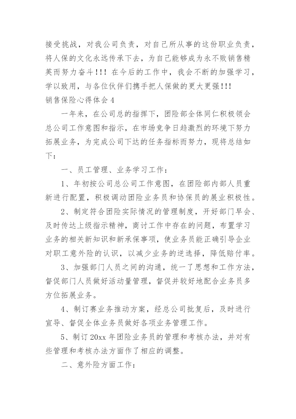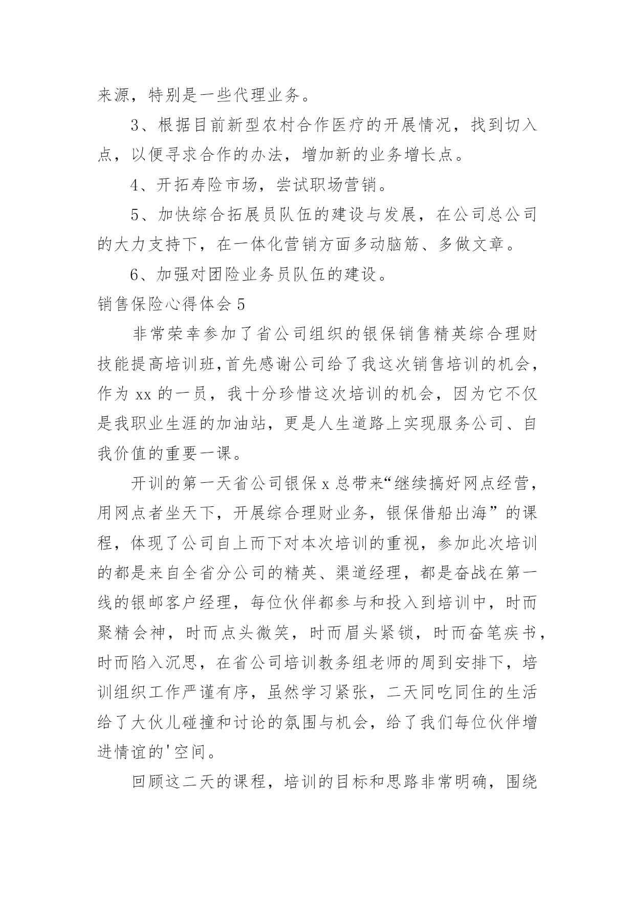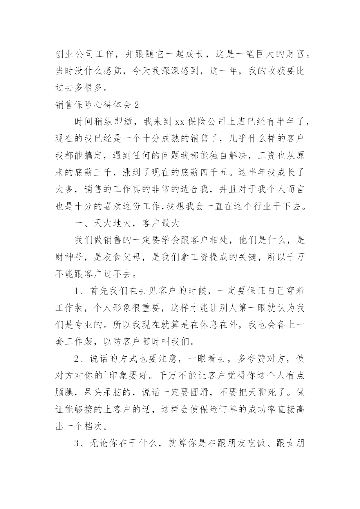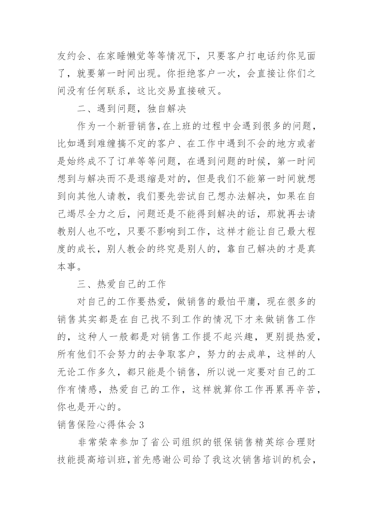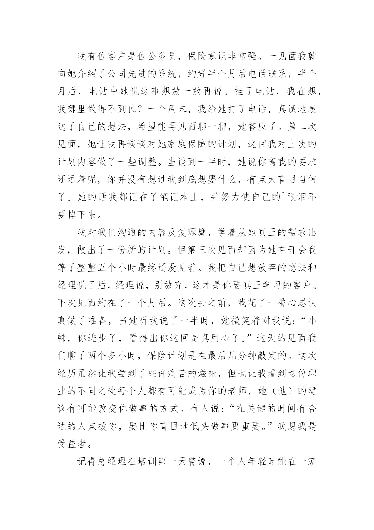 销售保险心得体会销售保险心得体会在平日里,心中难免会有一些新的想法,马上将其记录下来,这样我们可以养成良好的总结方法。那么好的心得体会都具备一些什么特点呢?以下是小编收集整理的销售保险心得体会,欢迎大家分享。销售保险心得体会1销售时像直销,培训时想传销,竞争时相倾销。销售模式其实跟直销差不多;培训时会最大化的激发你的斗志与欲望,某些人会迷失,跟传销有些像;竞争时劣势时有可能会不正当竞争,倾销。呵呵,这是说笑的,别较真。在保险营销中注意销售话术,注意客户的需求,不要为了自己的利益,而损害了客户。另外,其实各家保险公司的产品都差不多,要以服务赢得客户。经过一个月的培训,我认识到保险业发展前景广阔。保险销售工作极富挑战性,而做一名合格的保险人对人的综合能力要求更高。刚开始工作,我跟客户讲半天,我的工作我的公司前景是多么好,最后客户还是满脸不解地问道:“我真没听明白,你到底能为我做些什么?”那一瞬间,我的自信消失得无影无踪。慢慢地,我发现自己过去没意识到的问题都开始浮出水面,这强迫我琢磨怎么做才能避免发生问题,每次与客户面谈后都有不小的收获。我有位客户是位公务员,保险意识非常强。一见面我就向她介绍了公司先进的系统,约好半个月后电话联系,半个月后,电话中她说这事想放一放再说。挂了电话,我在想,我哪里做得不到位?一个周末,我给她打了电话,真诚地表达了自己的想法,希望能再见面聊一聊,她答应了。第二次见面,她让我再谈谈对她家庭保障的计划,这回我对上次的计划内容做了一些调整。当谈到一半时,她说你离我的要求还远着呢,你并没有想过我到底想要什么,有点太盲目自信了。她的话我都记在了笔记本上,并努力使自己的`眼泪不要掉下来。我对我们沟通的内容反复琢磨,学着从她真正的需求出发,做出了一份新的计划。但第三次见面却因为她在开会我等了整整五个小时最终还没见着。我把自己想放弃的想法和经理说了后,经理说,别放弃,这才是你要真正学习的客户。下次见面约在了一个月后。这次去之前,我花了一番心思认真做了准备,当她听我说了一半时,她微笑着对我说:“小韩,你进步了,看得出你这回是真用心了。”这天的见面我们聊了两个多小时,保险计划是在最后几分钟敲定的。这次经历虽然让我尝到了些许痛苦的滋味,但也让我看到这份职业的不同之处每个人都有可能成为你的老师,她(他)的建议有可能改变你做事的方式。有人说:“在关键的时间有合适的人点拨你,要比你盲目地低头做事更重要。”我想我是受益者。记得总经理在培训第一天曾说,一个人年轻时能在一家创业公司工作,并跟随它一起成长,这是一笔巨大的财富。当时没什么感觉,今天我深深感到,这一年,我的收获要比过去多很多。销售保险心得体会2时间稍纵即逝,我来到xx保险公司上班已经有半年了,现在的我已经是一个十分成熟的销售了,几乎什么样的客户我都能搞定,遇到任何的问题我都能独自解决,工资也从原来的底薪三千,涨到了现在的底薪四千五。这半年我成长了太多,销售的工作真的非常的适合我,并且对于我个人而言也是十分的喜欢这份工作,我想我会一直在这个行业干下去。一、天大地大,客户最大我们做销售的一定要学会跟客户相处,他们是什么,是财神爷,是衣食父母,是我们拿工资提成的关键,所以千万不能跟客户过不去。1、首先我们在去见客户的时候,一定要保证自己穿着工作装,个人形象很重要,这样才能让别人第一眼就认为我们是专业的。所以我现在就算是在休息在外,我也会备上一套工作装,以防客户随时叫我们。2、说话的方式也要注意,一眼看去,多夸赞对方,使对方对你的`印象要好。千万不能让客户觉得你这个人有点腼腆,呆头呆脑的,说话一定要圆滑,不要把天聊死了。保证能够接的上客户的话,这样会使保险订单的成功率直接高出一个档次。3、无论你在干什么,就算你是在跟朋友吃饭、跟女朋友约会、在家睡懒觉等等情况下,只要客户打电话约你见面了,就要第一时间出现。你拒绝客户一次,会直接让你们之间没有任何联系,这比交易直接破灭。二、遇到问题,独自解决作为一个新晋销售,在上班的过程中会遇到很多的问题,比如遇到难缠搞不定的客户、在工作中遇到不会的地方或者是始终成不了订单等等问题,在遇到问题的时候,第一时间想到与解决而不是退缩是对的,但是我们不能第一时间就想到向其他人请教,我们要先尝试自己想办法解决,如果在自己竭尽全力之后,问题还是不能得到解决的话,那就再去请教别人也不吃,只要不影响到工作,这样才能让自己最大程度的成长,别人教会的终究是别人的,靠自己解决的才是真本事。三、热爱自己的工作对自己的工作要热爱,做销售的最怕平庸,现在很多的销售其实都是在自己找不到工作的情况下才来做销售工作的,这种人一般都是对销售工作提不起兴趣,更别提热爱,所有他们不会努力的去争取客户,努力的去成单,这样的人无论工作多久,都只能是个销售,所以说一定要对自己的工作有情感,热