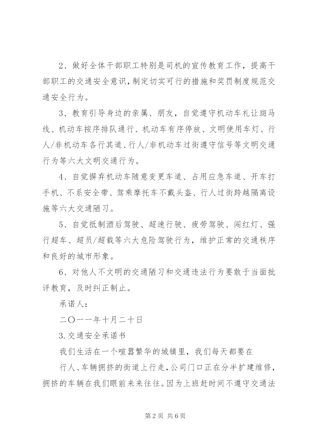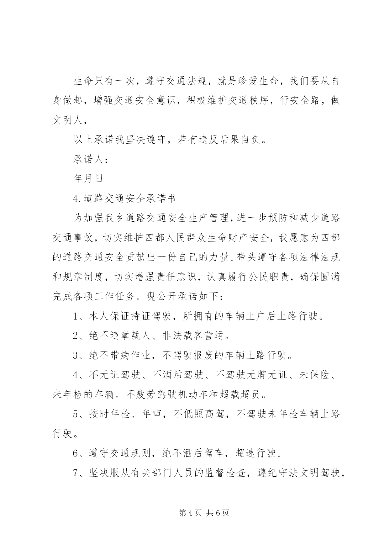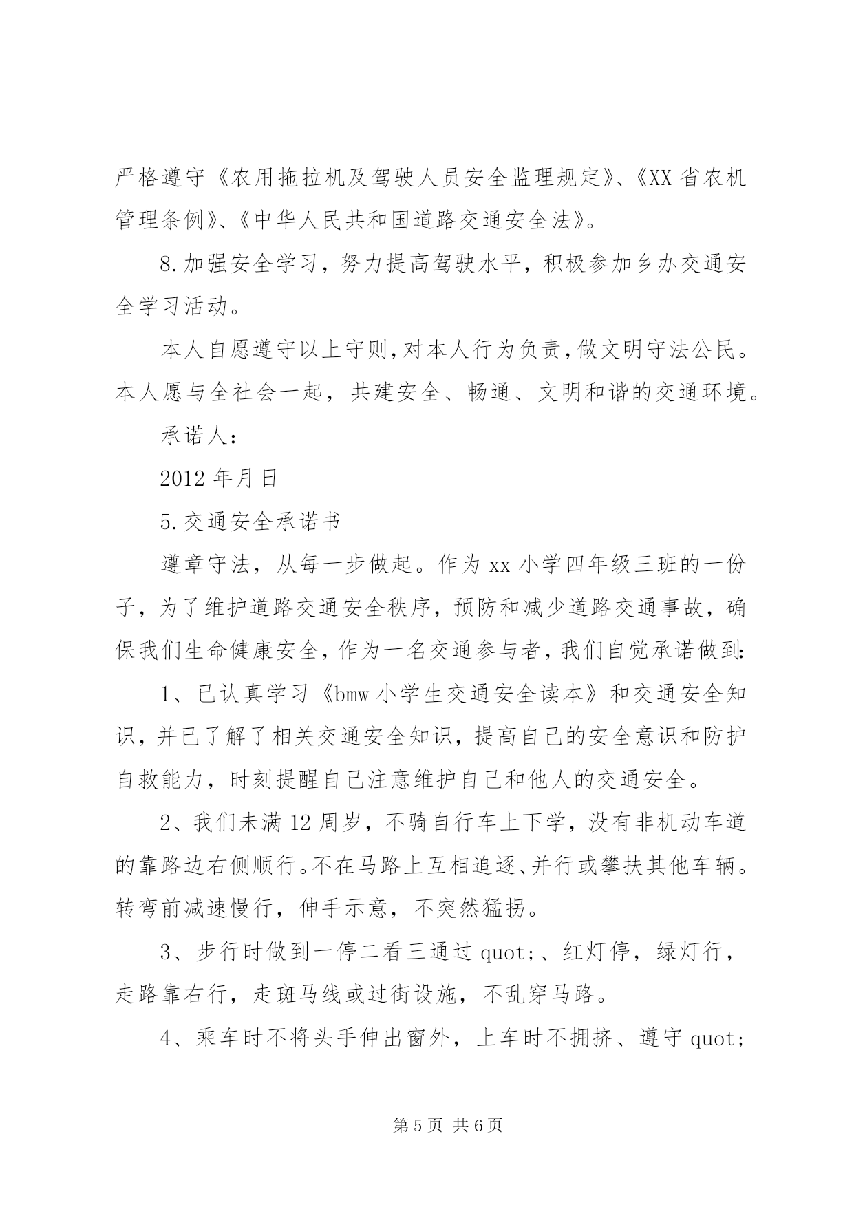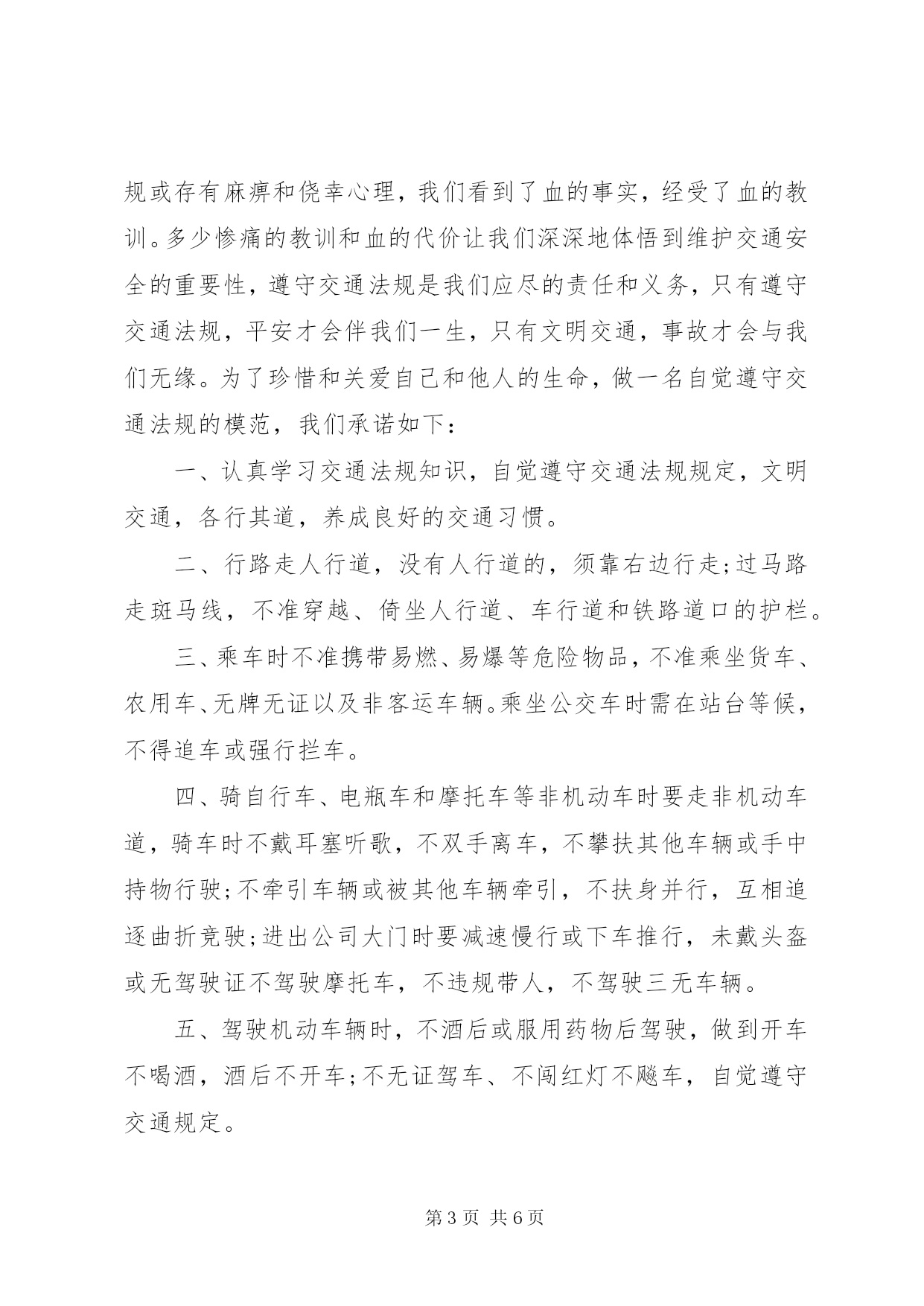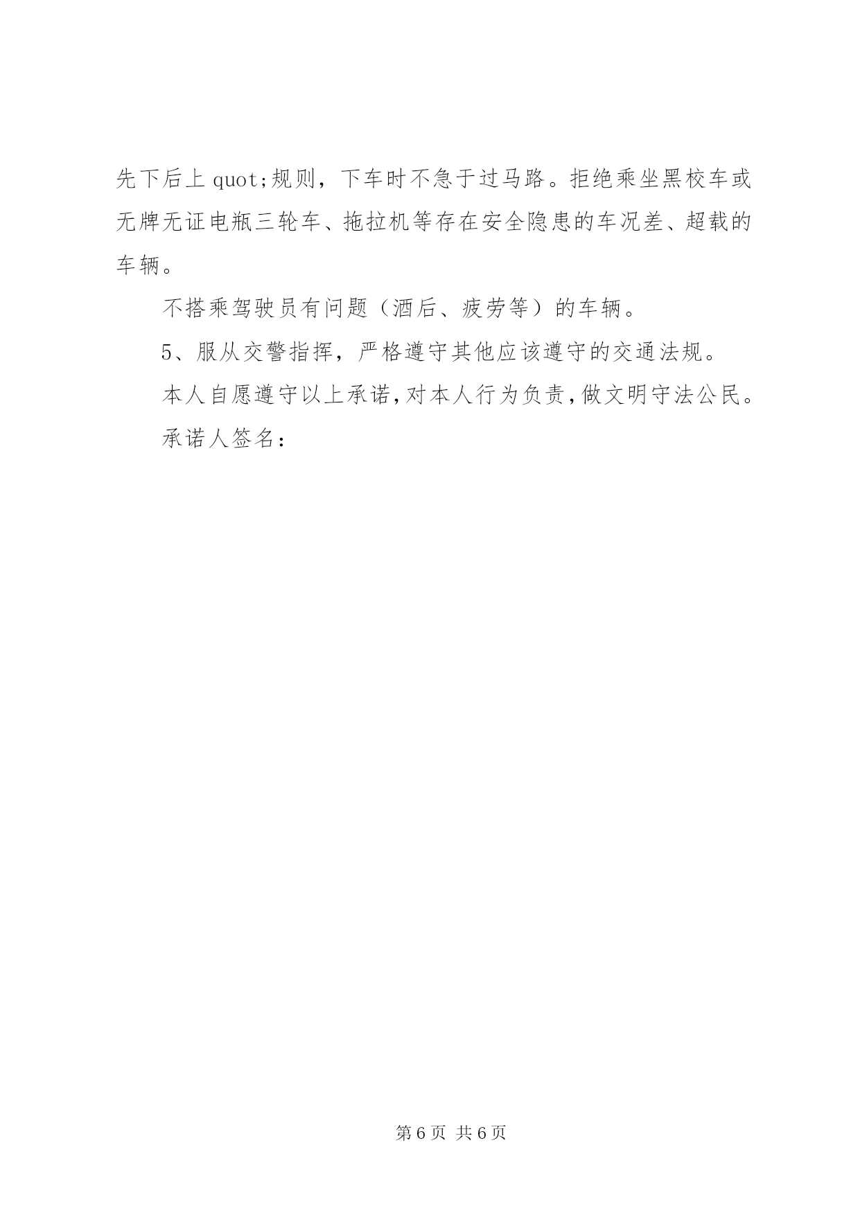第PAGE\*Arabic\*MERGEFORMAT6页共NUMPAGES\*MERGEFORMAT6页交通安全承诺书1.交通安全承诺书遵章守法,从每一步做起。为了维护道路交通安全秩序,预防和减少道路交通事故,确保自身、家庭以及社会公众的平安、幸福,作为一名交通参与者,我承诺做到:一、自觉遵守《中华人民共和国道路交通安全法》、《XX省道路交通管理条例》及其相关法律、法规,时刻谨记交通安全。二、驾安全车,切实做到不酒后驾车,不无证驾车,不闯红灯,不超载超速,不开英雄车、斗气车。三、停文明车,切实做到路口不越线停车,不在网格线内停车,不在路口、公交停靠站点停车,不违法占道乱停乱放。四、珍爱生命、遵章守法、文明驾驶、礼让行车、恪守承诺。本人自愿遵守以上守则,对本人行为负责,做文明守法公民。本人愿与全社会一起,共建安全、畅通、文明和谐的交通环境。部门:承诺人签名(工号):日期:2.交通安全承诺书为积极落实薛强书记《致全县广大机关干部职工和公职人员的一封信》的指示精神,进一步增强交通安全意识,我郑重承诺:1、以身作则,自觉遵守《道路交通安全法》等法律法规。2、做好全体干部职工特别是司机的宣传教育工作,提高干部职工的交通安全意识,制定切实可行的措施和奖罚制度规范交通安全行为。3、教育引导身边的亲属、朋友,自觉遵守机动车礼让斑马线、机动车按序排队通行、机动车有序停放、文明使用车灯、行人/非机动车各行其道、行人/非机动车过街遵守信号等文明交通行为等六大文明交通行为。4、自觉摒弃机动车随意变更车道、占用应急车道、开车打手机、不系安全带、驾乘摩托车不戴头盔、行人过街跨越隔离设施等六大交通陋习。5、自觉抵制酒后驾驶、超速行驶、疲劳驾驶、闯红灯、强行超车、超员/超载等六大危险驾驶行为,维护正常的交通秩序和良好的城市形象。6、对他人不文明的交通陋习和交通违法行为要敢于当面批评教育,及时纠正制止。承诺人:二〇一一年十月二十日3.交通安全承诺书我们生活在一个喧嚣繁华的城镇里,我们每天都要在行人、车辆拥挤的街道上行走,公司门口正在分半扩建维修,拥挤的车辆在我们眼前来来往往。因为上班赶时间不遵守交通法规或存有麻痹和侥幸心理,我们看到了血的事实,经受了血的教训。多少惨痛的教训和血的代价让我们深深地体悟到维护交通安全的重要性,遵守交通法规是我们应尽的责任和义务,只有遵守交通法规,平安才会伴我们一生,只有文明交通,事故才会与我们无缘。为了珍惜和关爱自己和他人的生命,做一名自觉遵守交通法规的模范,我们承诺如下:一、认真学习交通法规知识,自觉遵守交通法规规定,文明交通,各行其道,养成良好的交通习惯。二、行路走人行道,没有人行道的,须靠右边行走;过马路走斑马线,不准穿越、倚坐人行道、车行道和铁路道口的护栏。三、乘车时不准携带易燃、易爆等危险物品,不准乘坐货车、农用车、无牌无证以及非客运车辆。乘坐公交车时需在站台等候,不得追车或强行拦车。四、骑自行车、电瓶车和摩托车等非机动车时要走非机动车道,骑车时不戴耳塞听歌,不双手离车,不攀扶其他车辆或手中持物行驶;不牵引车辆或被其他车辆牵引,不扶身并行,互相追逐曲折竞驶;进出公司大门时要减速慢行或下车推行,未戴头盔或无驾驶证不驾驶摩托车,不违规带人,不驾驶三无车辆。五、驾驶机动车辆时,不酒后或服用药物后驾驶,做到开车不喝酒,酒后不开车;不无证驾车、不闯红灯不飚车,自觉遵守交通规定。生命只有一次,遵守交通法规,就是珍爱生命,我们要从自身做起,增强交通安全意识,积极维护交通秩序,行安全路,做文明人,以上承诺我坚决遵守,若有违反后果自负。承诺人:年月日4.道路交通安全承诺书为加强我乡道路交通安全生产管理,进一步预防和减少道路交通事故,切实维护四都人民群众生命财产安全,我愿意为四都的道路交通安全贡献出一份自己的力量。带头遵守各项法律法规和规章制度,切实增强责任意识,认真履行公民职责,确保圆满完成各项工作任务。现公开承诺如下:1、本人保证持证驾驶,所拥有的车辆上户后上路行驶。2、绝不违章载人、非法载客营运。3、绝不带病作业,不驾驶报废的车辆上路行驶。4、不无证驾驶、不酒后驾驶、不驾驶无牌无证、未保险、未年检的车辆。不疲劳驾驶机动车和超载超员。5、按时年检、年审,不低照高驾,不驾驶未年检车辆上路行驶。6、遵守交通规则,绝不酒后驾车,超速行驶。7、坚决服从有关部门人员的监督检查,遵纪守法文明驾驶,严格遵守《农用拖拉机及驾驶人员安全监理规定》、《XX省农机管理条例》、《中华人民共和国道路交通安全法》。8.加强安全学习,努力提高驾驶水平,积极参加乡办交通安全学习活动。本人自愿遵守以上守则,对本人行为负责,做文明守法公民。本人愿与全社会一起,共建安全、畅通、文明和谐的交通环境。承诺人:2012年月日5.交通安全承诺书遵章守法,从