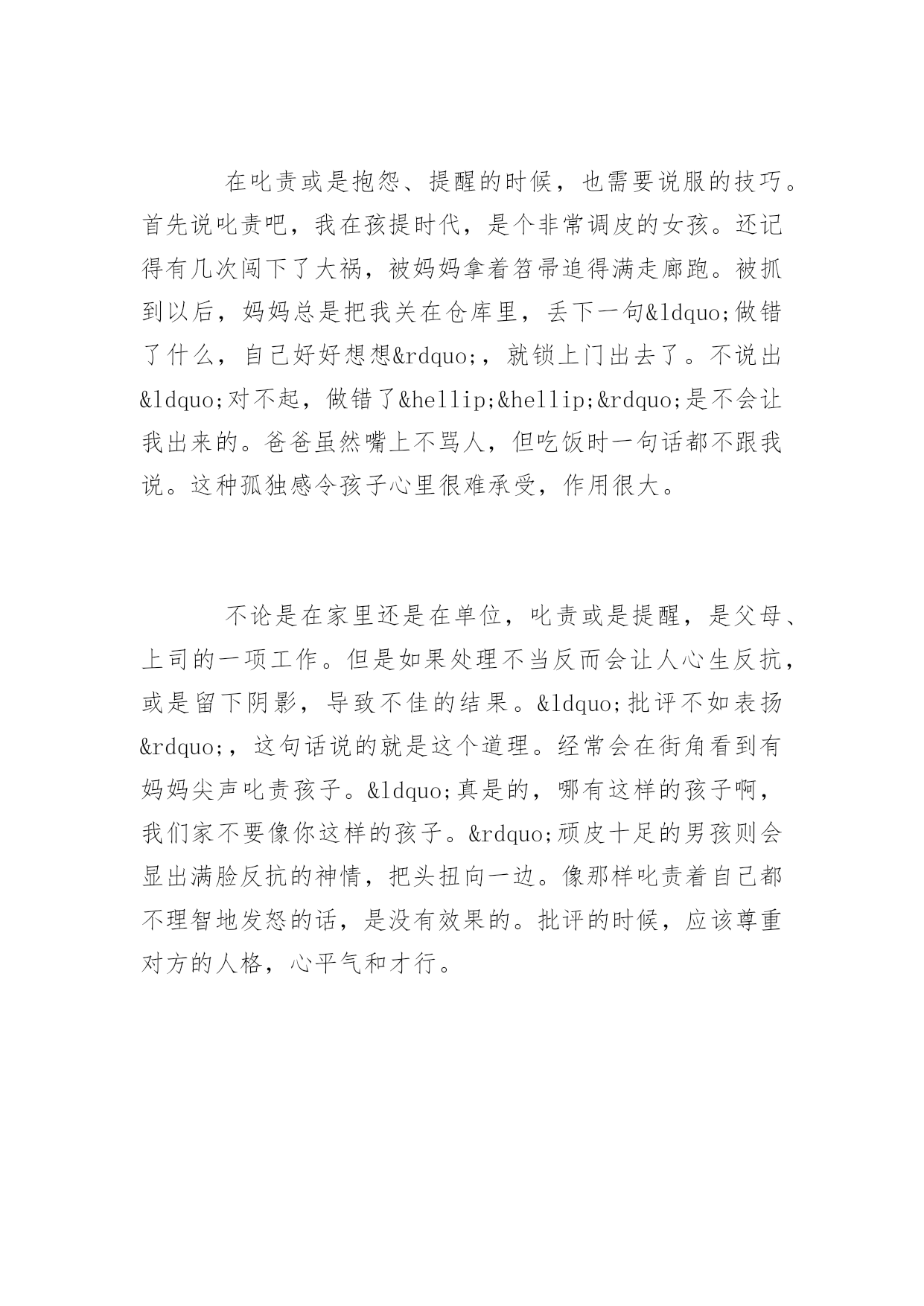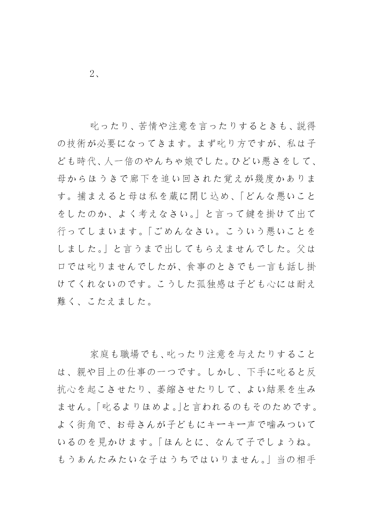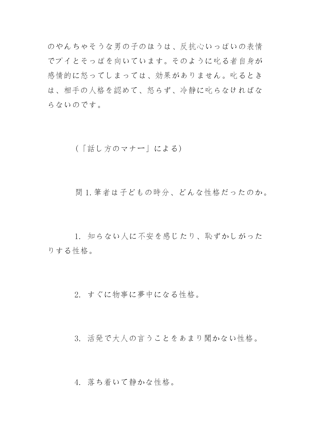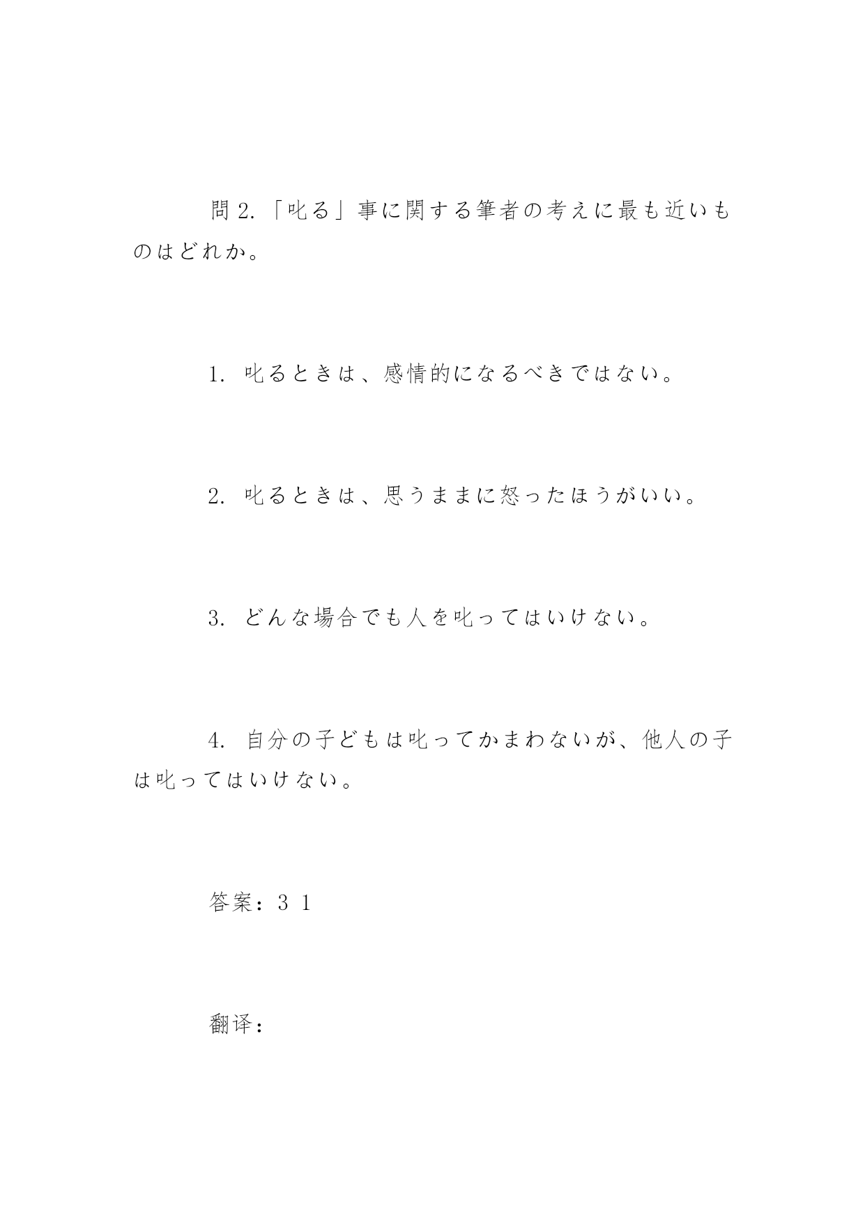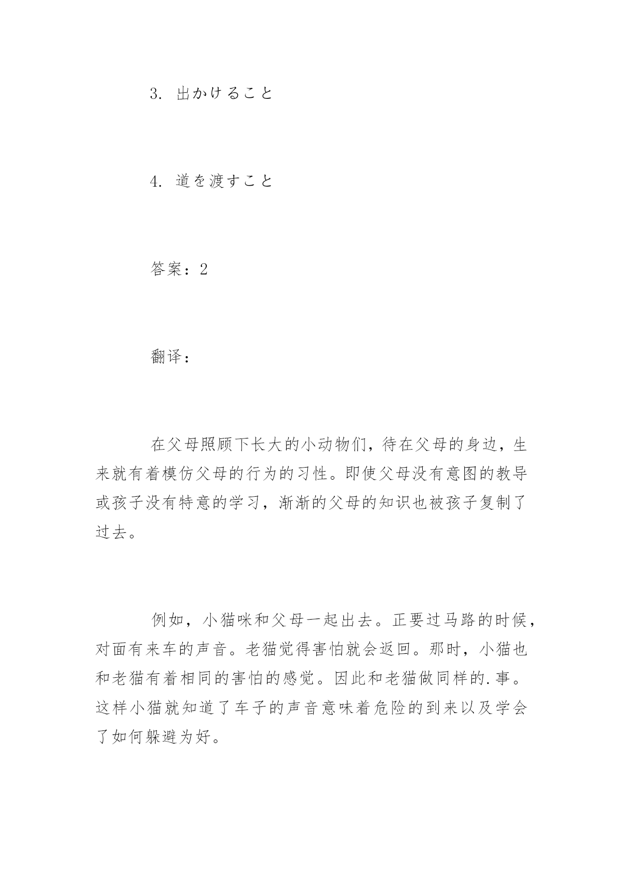 日语考试阅读理解试题日语考试阅读理解精选试题勤劳一日,可得一夜安眠;勤劳一生,可得幸福长眠。以下是小编为大家搜索整理的日语考试阅读理解精选试题,希望能给大家带来帮助!更多精彩内容请及时关注我们应届毕业生考试网!1、次の文章を読んで、問いに対する答えとして最も適当なものを、1、2、3、4の中から一つ選びなさい親に面倒をみてもらって育つ動物の子供たちは、親のそばにいたがり、親のするとおりにするという習性をもって生まれてくる。親は教えるつもりなどなく、子の方でも教わるつもりなどないが、徐徐に親の知恵は子にコピーされていくのだ。(中略)たとえば、子猫が親猫と一緒に出かけていくとする。道を渡ろうとしたとき、向こうから車が来る音がする。親猫は「怖い」と思って引き返す。その時子猫は親と同じレベルで「怖さ」に同調するのである。そして親と同じことをする。これで子猫は車の音が危険の到来だということと、どうやって逃げればよいかということを学ぶ。(加藤由子「雨の日のネコはとことん眠い」による)問い「親と同じこと」というのは、ここではどういうことか。1.コピーすること2.引き返すこと3.出かけること4.道を渡すこと答案:2翻译:在父母照顾下长大的小动物们,待在父母的身边,生来就有着模仿父母的行为的习性。即使父母没有意图的教导或孩子没有特意的学习,渐渐的父母的知识也被孩子复制了过去。例如,小猫咪和父母一起出去。正要过马路的时候,对面有来车的声音。老猫觉得害怕就会返回。那时,小猫也和老猫有着相同的害怕的感觉。因此和老猫做同样的.事。这样小猫就知道了车子的声音意味着危险的到来以及学会了如何躲避为好。2、叱ったり、苦情や注意を言ったりするときも、説得の技術が必要になってきます。まず叱り方ですが、私は子ども時代、人一倍のやんちゃ娘でした。ひどい悪さをして、母からほうきで廊下を追い回された覚えが幾度かあります。捕まえると母は私を蔵に閉じ込め、「どんな悪いことをしたのか、よく考えなさい。」と言って鍵を掛けて出て行ってしまいます。「ごめんなさい。こういう悪いことをしました。」と言うまで出してもらえませんでした。父は口では叱りませんでしたが、食事のときでも一言も話し掛けてくれないのです。こうした孤独感は子ども心には耐え難く、こたえました。家庭も職場でも、叱ったり注意を与えたりすることは、親や目上の仕事の一つです。しかし、下手に叱ると反抗心を起こさせたり、萎縮させたりして、よい結果を生みません。「叱るよりほめよ。」と言われるのもそのためです。よく街角で、お母さんが子どもにキーキー声で噛みついているのを見かけます。「ほんとに、なんて子でしょうね。もうあんたみたいな子はうちではいりません。」当の相手のやんちゃそうな男の子のほうは、反抗心いっぱいの表情でプイとそっぱを向いています。そのように叱る者自身が感情的に怒ってしまっては、効果がありません。叱るときは、相手の人格を認めて、怒らず、冷静に叱らなければならないのです。(「話し方のマナー」による)問1.筆者は子どもの時分、どんな性格だったのか。1.知らない人に不安を感じたり、恥ずかしがったりする性格。2.すぐに物事に夢中になる性格。3.活発で大人の言うことをあまり聞かない性格。4.落ち着いて静かな性格。問2.「叱る」事に関する筆者の考えに最も近いものはどれか。1.叱るときは、感情的になるべきではない。2.叱るときは、思うままに怒ったほうがいい。3.どんな場合でも人を叱ってはいけない。4.自分の子どもは叱ってかまわないが、他人の子は叱ってはいけない。答案:31翻译:在叱责或是抱怨、提醒的时候,也需要说服的技巧。首先说叱责吧,我在孩提时代,是个非常调皮的女孩。还记得有几次闯下了大祸,被妈妈拿着笤帚追得满走廊跑。被抓到以后,妈妈总是把我关在仓库里,丢下一句“做错了什么,自己好好想想”,就锁上门出去了。不说出“对不起,做错了……”是不会让我出来的。爸爸虽然嘴上不骂人,但吃饭时一句话都不跟我说。这种孤独感令孩子心里很难承受,作用很大。不论是在家里还是在单位,叱责或是提醒,是父母、上司的一项工作。但是如果处理不当反而会让人心生反抗,或是留下阴影,导致不佳的结果。“批评不如表扬”,这句话说的就是这个道理。经常会在街角看到有妈妈尖声叱责孩子。“真是的,哪有这样的孩子啊,我们家不要像你这样的孩子。”顽皮十足的男孩则会显出满脸反抗的神情,把头扭向一边。像那样叱责着自己都不理智地发怒的话,是没有效果的。批评的时候,应该尊重对方的人格,心平气和才行。