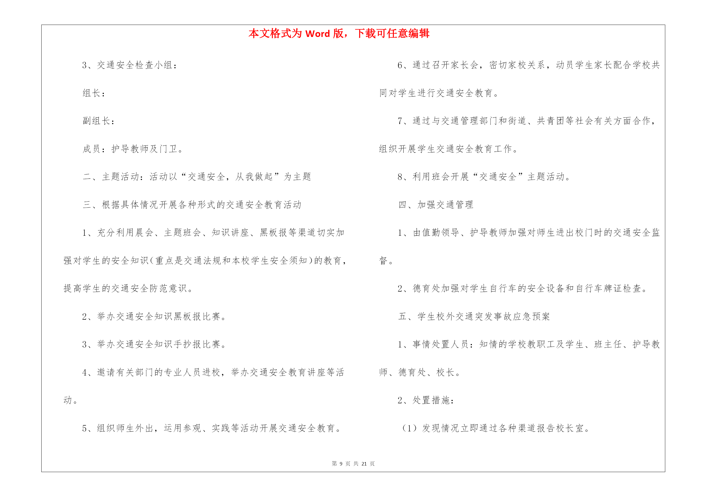 本文格式为Word版,下载可任意编辑第PAGE\*MERGEFORMAT21页共NUMPAGES\*MERGEFORMAT21页交通安全工作计划交通安全工作计划时间就如同白驹过隙般的流逝,我们又将接触新的知识,学习新的技能,积累新的经验,该好好计划一下接下来的工作了!工作计划怎么写才不会流于形式呢?以下是我编写整理的交通安全工作计划,希望能够帮助到大家。交通安全工作计划1一、指导思想认真贯彻落实公安部、教育部的文件精神,积极完成县教委安委会布置的各项任务,小学安全工作计划中进一步加强中小学校交通安全工作,防止中小学生发生交通事故,切实保障广大中小学生及教职员工的人身安全。二、具体工作措施1、建立交通安全工作小组,健全学校管理工作网络,形成工作合力,齐抓共管。2、定期召开工作例会,专题研究学校文明交通安全工作,做到年初有计划,年终有总结,工作有考核。3、与本单位所有司机及私车驾驶员签定责任书,明确各自职责,确保安全无事故。4、建立本单位所有司机及私车驾驶员、车辆安全档案,便于管理。5、加强对教职工交通安全法宣传的工作力度,不断提高其交通安全意识。6、加强对学生交通法规和交通安全常识的宣传教育。利用校园广播、宣传栏、黑板报等阵地教育宣传交通安全知识,提高学生交通安全意识。7、认真开展“小手拉大手”活动,深入家庭、社区开展交通安全宣传活动。8、为本单位司机创造条件,确保其按时参加教委安委会组织的例会学习。9、提醒广大教职工、司机、学生家长按时检修自己及其子女所用的车辆,确保其状况良好,防患于未然。10、认真贯彻落实延庆县教育系统大型活动审批制度,确保学校组织各种大型活动安全无事故。11、加强校园交通安全宣传工作的硬件建设,以便确保交通安全宣传工作能够更好的开展。12、认真做好教委安委会布置的其它临时性工作。交通安全工作计划2今年12月2日是第五个“全国交通安全日”宣传,深入贯彻《20xx年12.2“全国交通安全日”主题活动工作方案》的通知(x公综〔20xx〕x号)和深入开展“122全国交通安全日”活动的文件精神,组织开展好今年第五个122“全国交通安全日”主题活动,不断增强全体师生交通安全意识,提高自我保护能力,根据我园的实际情况,制定如下计划:一、活动主题“守法出行安全自护”二、组织领导组长:许xx副组长:林xx成员:各班班主任三、活动内容1.我园及时召开了动员大会,对本次活动的开展进行了广泛的宣传发动和详细部署布置,使全体师生人人参与到教育活动中来,树立道路交通安全理念,掌握相关知识,提高自我防范能力。2.各班开展形式多样的交通安全知识课。充分利用好安全教育课,对幼儿认真进行宣传教育。3.组织师生观看了《关注学生出行》警示教育片,帮助学生提高交通安全意识和自我防护能力。4.开展一次以“安全文明出行”的主题的国旗下讲话。5.与家长签订《交通安全承诺书》。6.每天放学之前,进行五分钟交通安全教育;7.坚持落实上下学家长护校队制度和护导师值班制度。8.在校园门口警示标牌,杜绝校园周边交通事故的发生。以“12.2交通安全宣传日”活动为契机,将活动不断延伸,促使交通安全宣传经常化、规范化。交通安全工作计划3作为交通参与者的幼儿活泼好动、生活经验少、缺乏交通安全常识,为确保幼儿园交通安全,保证道路安全畅通,现就加强幼儿园周边道路的的交通安全管理有关规定,特制定幼儿园交通安全工作计划。一、幼儿园安全执勤小组负责每天幼儿来园、离园时幼儿家长接送车辆的停放秩序,督促全体幼儿及幼儿家长安全离校,定岗,定责。二、宣传教育1、定于每年的五月和九月为安全教育宣传月,以“增强交通安全意识,提高自我保护能力”为主题,根据幼儿园交通安全特点,制定实施方案,有针对性地开展幼儿学习交通安全知识,遵纪守法,预防交通事故,提高自我保护意识和能力的安全教育活动。2、利用幼儿园宣传栏、家园互动等宣传渠道,宣传交通安全知识和《中华人民共和国道路交通安全法》。3、签订家长、教师及幼儿园各个岗位的安全责任书,要求全体教职园工、家长高度重视安全教育,落实责任,教育学生。(1)、过马路要走人行横道,不随意横穿公路。(2)、乘车不坐无证、无牌照车、不坐驾驶员酒后开的车、不坐超载车辆、不坐农用车等。4、配合交警部门对幼儿园周边交通安全进行治理,消除不安全隐患。5、组织教职工进行交通安全知识培训,要求教师每天对幼儿进行交通安全知识教育,把交通安全教育纳入一日活动之中。6、认真落实安全检查小组的工作,对违反交通规则的行为纳入班级考评中。三、车辆管理1、所有接送幼儿的车辆行经幼儿园周边道路要严格遵守道路交通安全法律法规,服从现场公安交巡警、城管执法人员指挥管理。2、自行车、摩托车,统一指定地点摆放整齐,要求上锁。在园内、园门口禁止骑车。3、接送幼儿的车辆在幼儿园周边道路应
