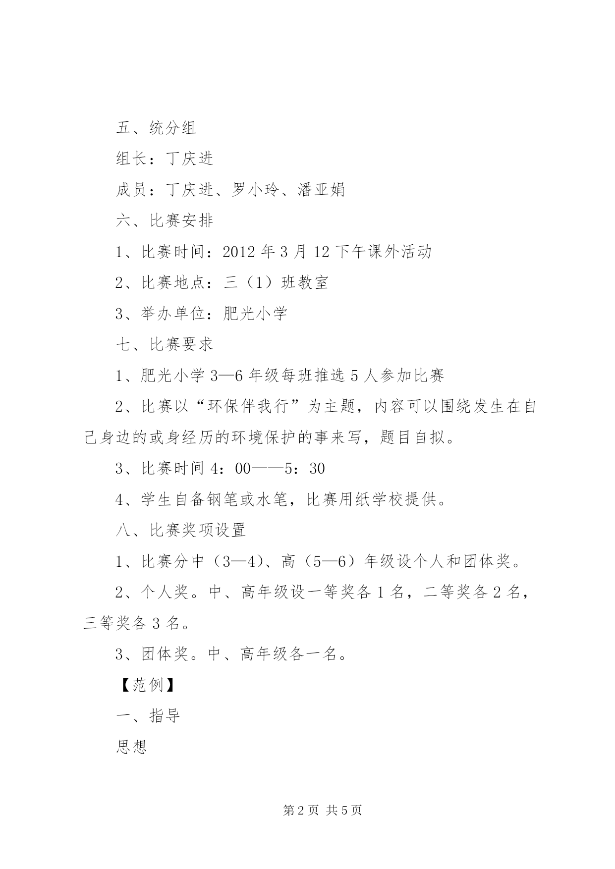 第PAGE\*Arabic\*MERGEFORMAT5页共NUMPAGES\*MERGEFORMAT5页环保征文活动方案一、活动目标环境保护对于科学发展,协调发展,构建和谐社会、和谐校园具有十分重要的意义,环境保护、教育为本、环境教育是环境保护的一项重要工作,也是学校教育的重要组成部分。青少年是祖国的未来和希望也是未来环境的主人,所以我们要教育学生树立热爱环境,保护环境,与自然和谐共处的绿色文明意识,学校利用“3·12”植树节开展主题队会,出一期黑板报,举行一次征文比赛等活动,加强环境保护教育工作的开展。征文比赛活动方案如下:二、活动组织组长:李绍胜、赵小定副组长:王明景、段贤兵组员:丁庆进、周宗友、罗小玲、吴世霞、各班主任负责人:段贤兵三、监考组组长:王红成员:王红、刘小平四、评委组组长:程保红成员:程保红、王亚男、李唐、吴世霞、胡巧娜、葛婷婷五、统分组组长:丁庆进成员:丁庆进、罗小玲、潘亚娟六、比赛安排1、比赛时间:2012年3月12下午课外活动2、比赛地点:三(1)班教室3、举办单位:肥光小学七、比赛要求1、肥光小学3—6年级每班推选5人参加比赛2、比赛以“环保伴我行”为主题,内容可以围绕发生在自己身边的或身经历的环境保护的事来写,题目自拟。3、比赛时间4:00——5:304、学生自备钢笔或水笔,比赛用纸学校提供。八、比赛奖项设置1、比赛分中(3—4)、高(5—6)年级设个人和团体奖。2、个人奖。中、高年级设一等奖各1名,二等奖各2名,三等奖各3名。3、团体奖。中、高年级各一名。【范例】一、指导思想充分发挥部门职能作用,积极参与2012年XX县区环保世纪行活动,全面落实科学发展观,深入贯彻省委、省政府关于大力加强生态文明建设的意见,以加强生态文明建设,推进绿色繁荣为目标,坚持以法律监督、舆论监督和群众监督为手段,牢固树立全民生态环保意识,通过扎扎实实开展XX县区环保世纪行活动,转变发展方式,发展低碳经济、保护饮用水源、强化节能减排、创建模范城市、推进绿色繁荣,促进全县经济社会健康快速发展。二、活动主题建设生态巴东·推进绿色繁荣三、活动对象科技局全体干部职工四、活动内容1、加强科学发展观、生态文明建设、低碳经济、节能减排、创文明机关等方面的教育,开展"低碳家庭·过时尚生活"主题教育活动,努力增强广大干部职工的科学发展意识、低碳意识、环保意识。2、在局机关开展"环保从我做起·从身边做起·从小事做起"主题活动,号召广大干部职工从节约一张纸、一支笔、一度电、一滴水做起,倡导低碳生活,反对铺张浪费,加强公共财物管理,努力降低本单位的行政成本。3、结合3.22世纪水日、中国水周,编印节水科技宣传资料向市民免费发放。4、结合4.22世界地球日,6.5世界环境日,6.25全国土地日等重大环保节日,编印环保知识手册,向全县中小学生免费发放,并组织环保知识进校园活动,为青少年朋友开展环保讲座。5、结合五月科技活动周活动,开展环保知识进社区、进学校、进企业、进农户活动,将一些先进实用技术编印成册免费赠送,大力倡导生态文明、环保节约、低碳高效生活。聘请环保专家进企业开展技术讲座和调研,切实为企业解决一些一直困扰企业发展的环保难题。6、积极支持,鼓励企业开展技术创新和改造,鼓励发明创造,切实做好成果登记、鉴定、申报、奖励和推广工作。五、活动安排(一)宣传发动阶段(8月底)1、成立领导小组;2、制定活动方案;3、召开职工大会,安排部署活动内容。(二)组织宣传阶段(9月1日-10月15日)1、广泛宣传教育,营造良好氛围;2、组织开展各项活动。(三)迎检总结阶段(10月15日-11月)1、将活动情况书面总结汇报,形成迎检材料上报县领导小组办公室;2、迎接州、县检查。六、组织领导为切实加强对环保世纪行活动的领导、经局党组会议研究,决定成立"XX县区科学技术局环保世纪行活动领导小组",由局党组书记、局长周树宝任组长;党组成员、副局长周统英,党组成员、纪检组长向世鹏为副组长,各股室负责人为成员,靳永春兼任办公室主任,负责日常工作。