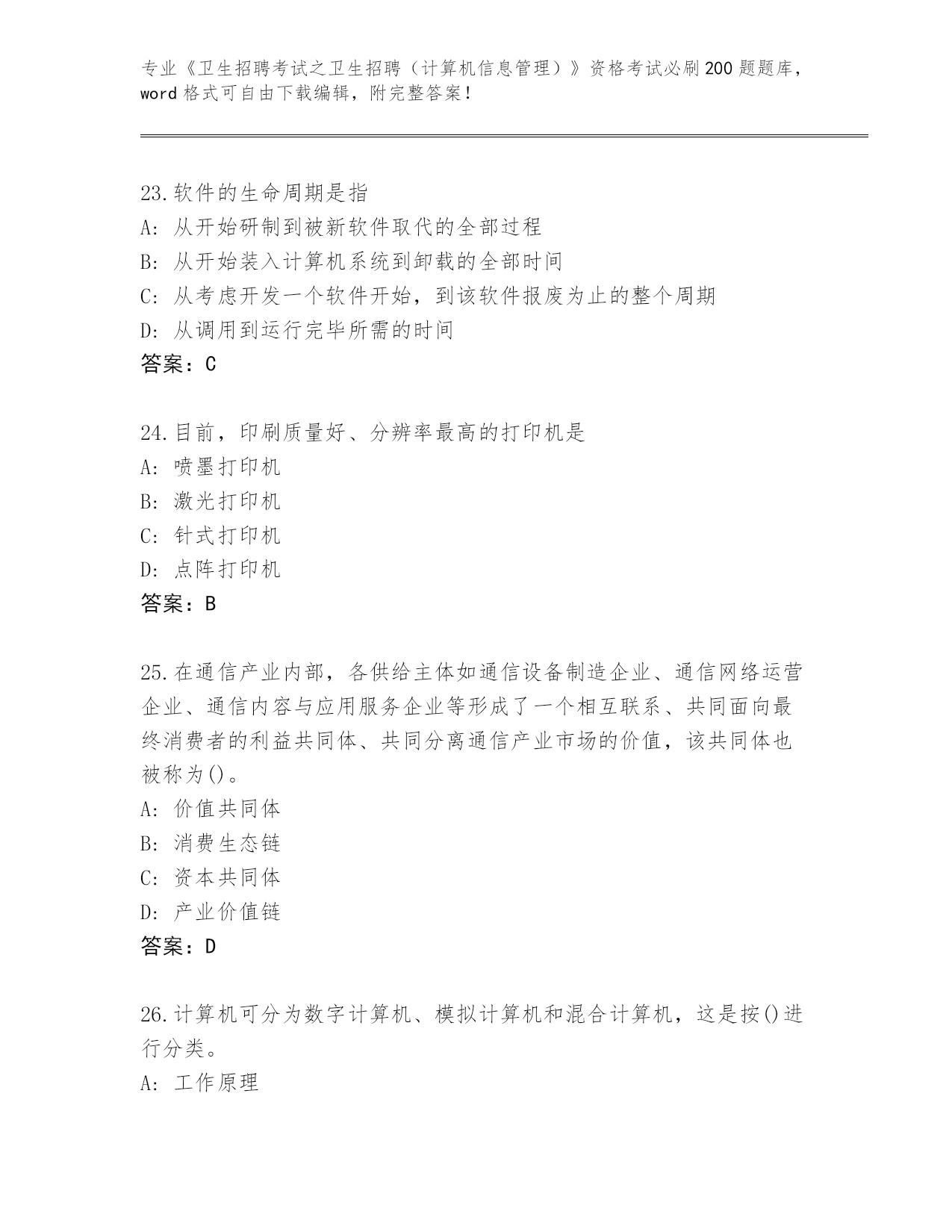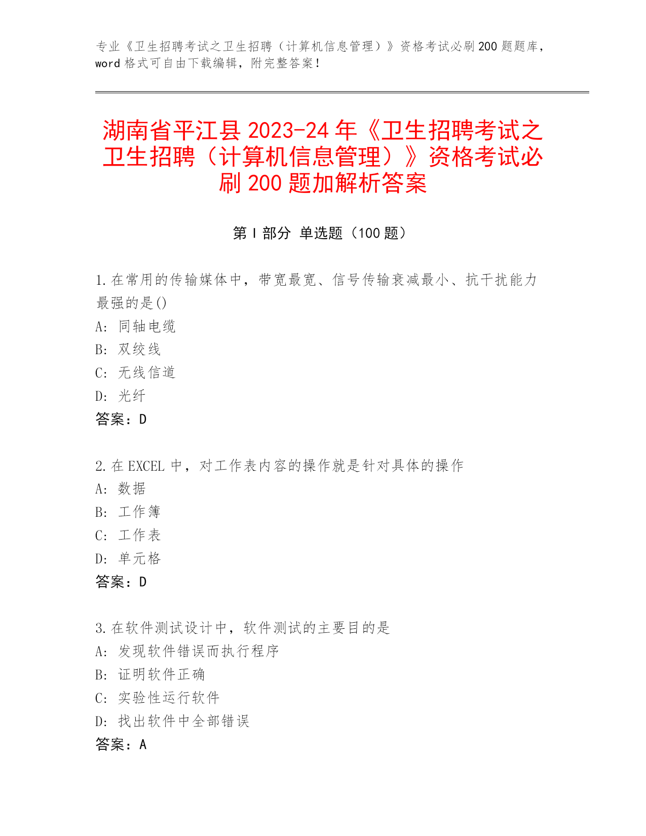 湖南省平江县2023-24年《卫生招聘考试之卫生招聘(计算机信息管理)》资格考试必刷200题加解析答案