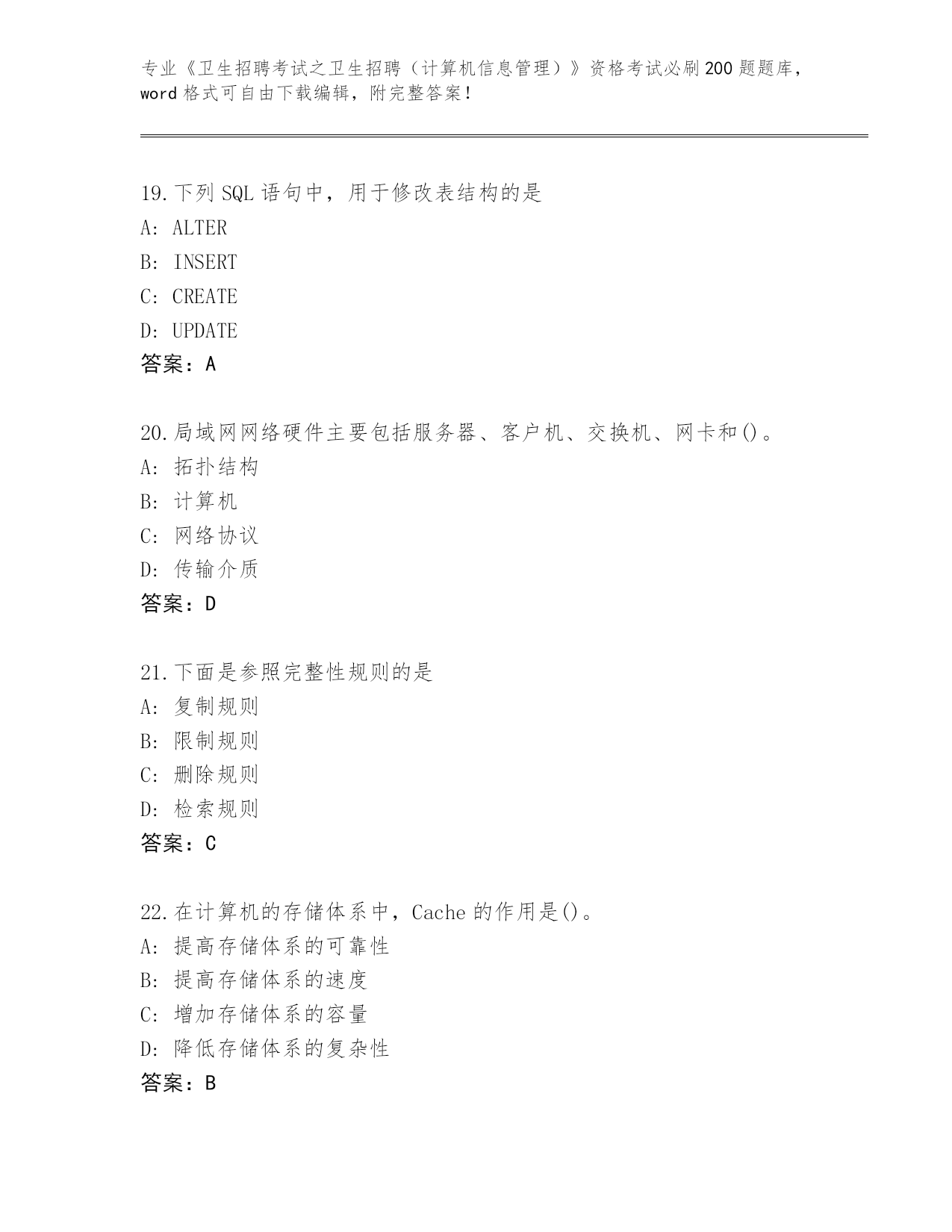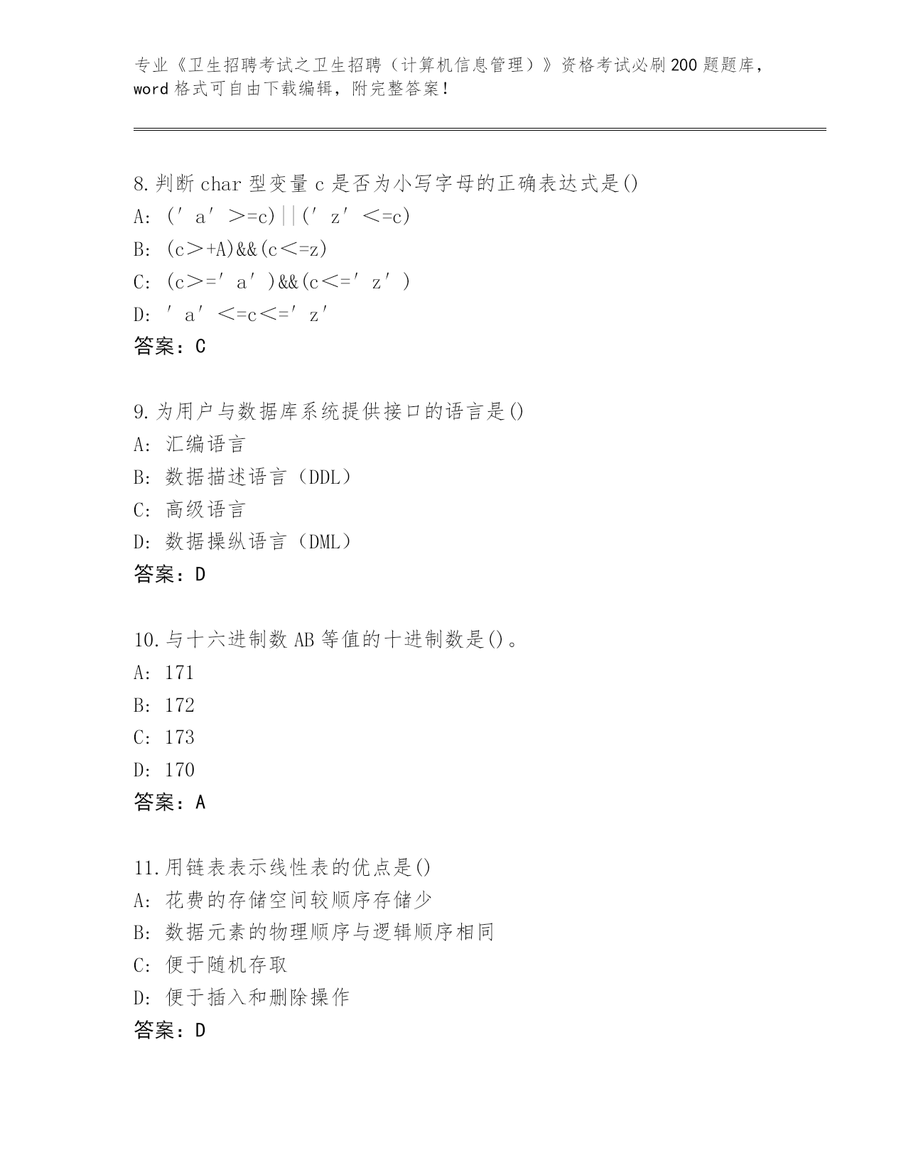 湖南省澧县《卫生招聘考试之卫生招聘(计算机信息管理)》资格考试必背200题加解析答案