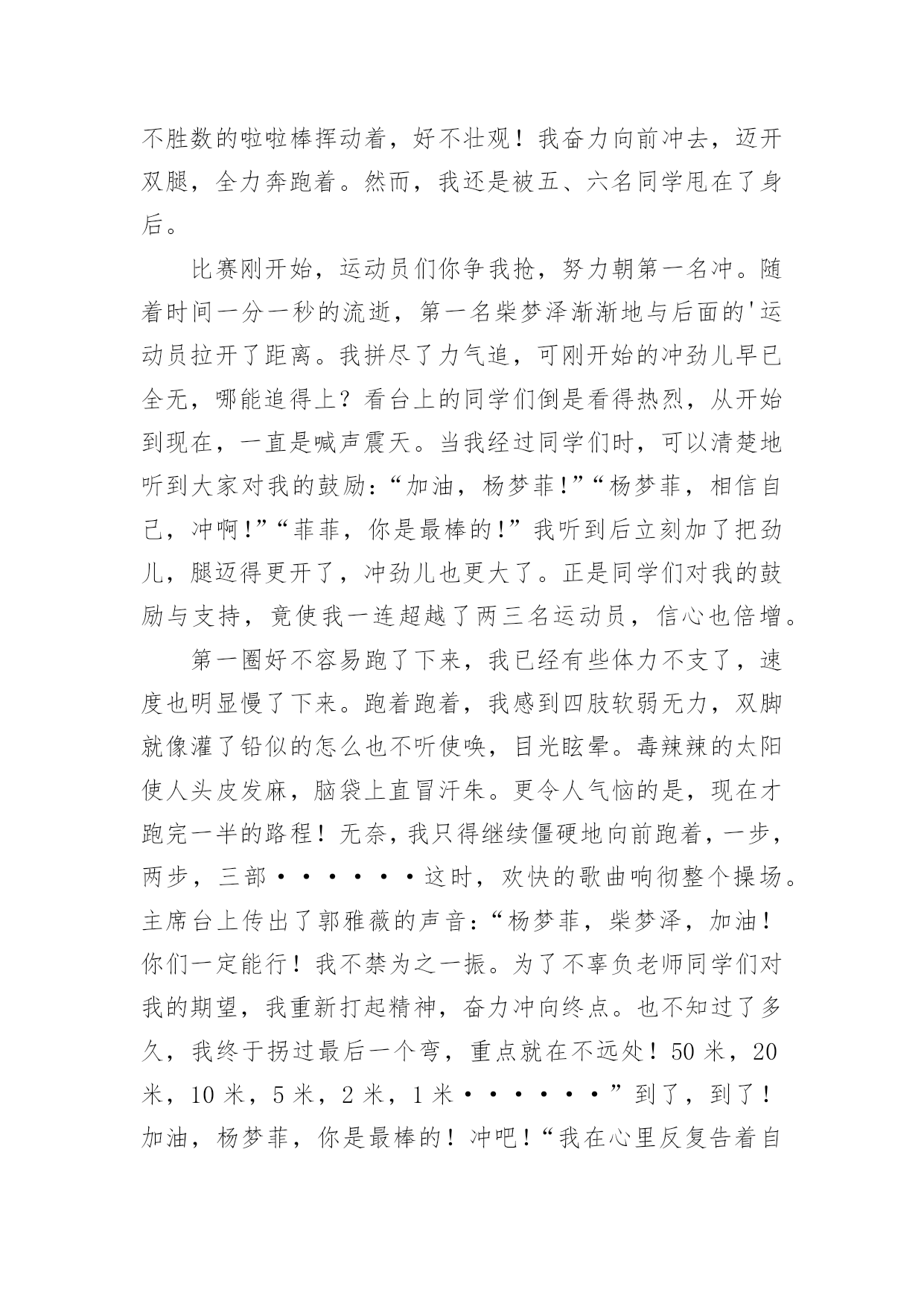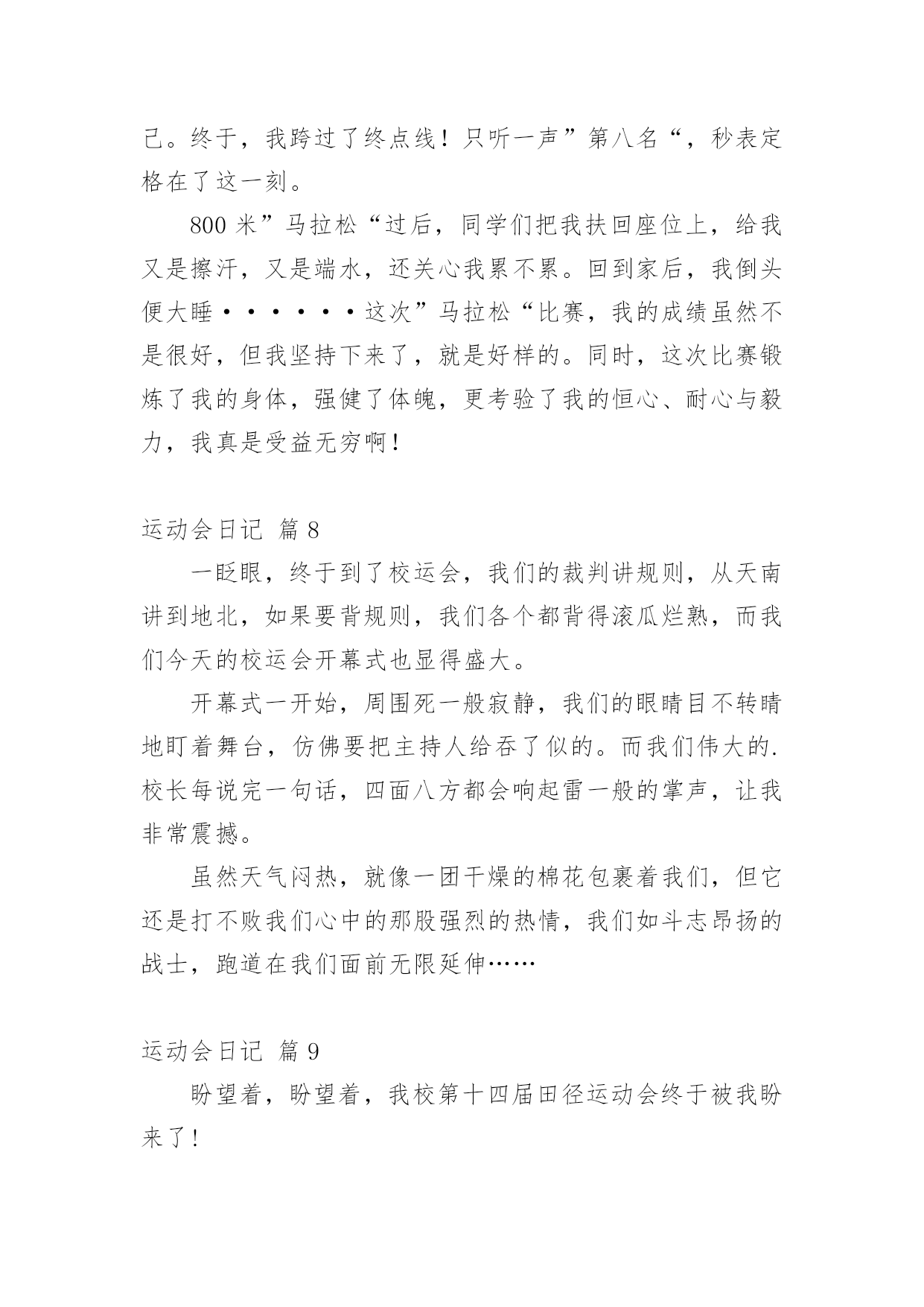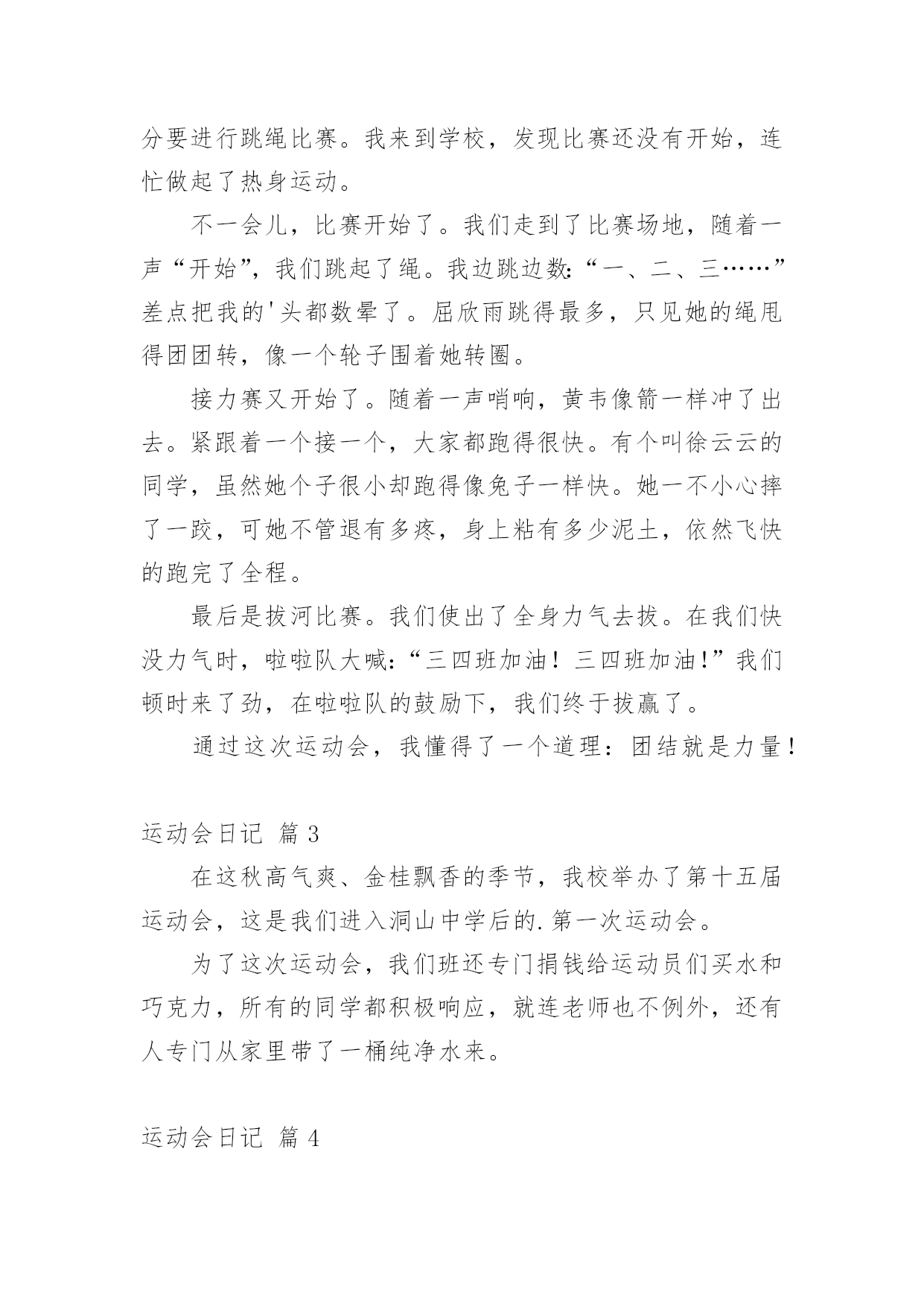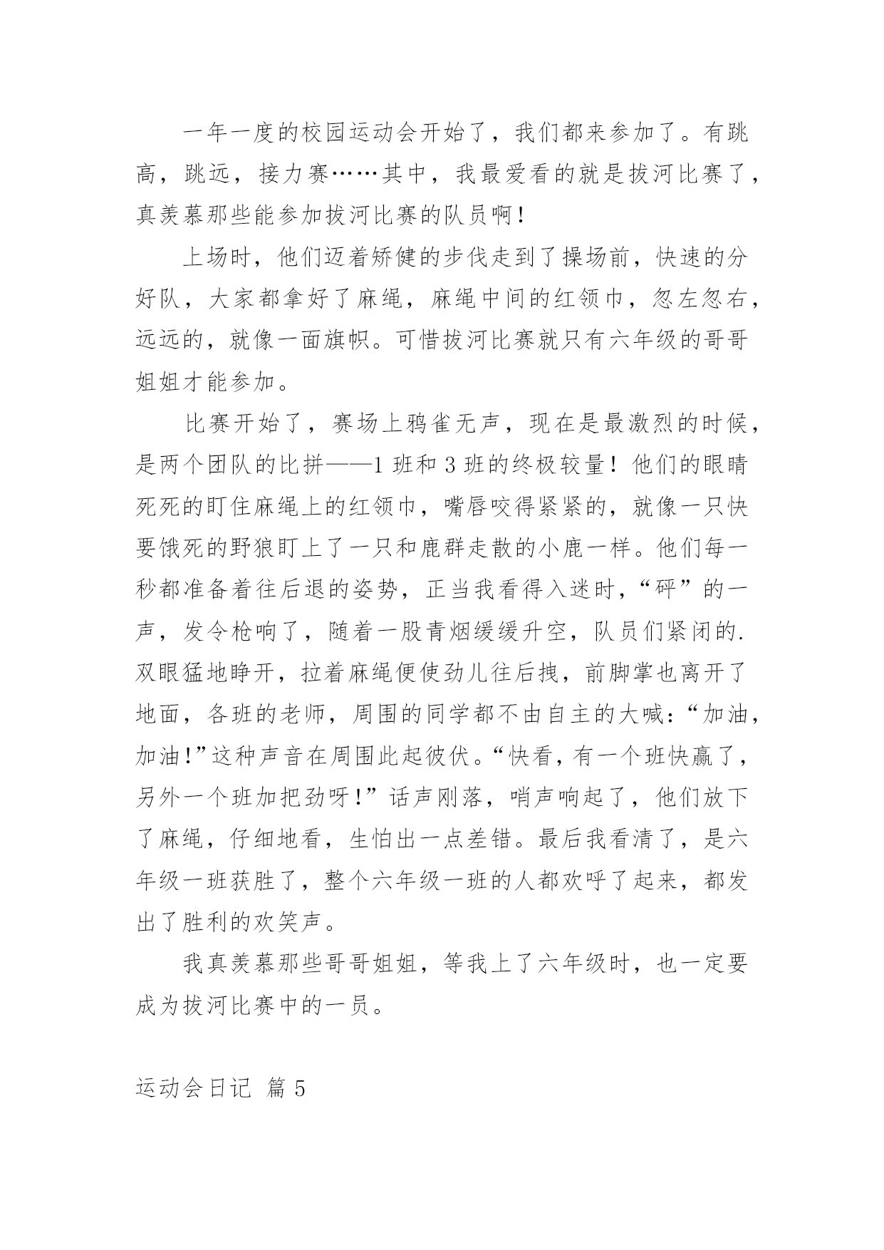 运动会日记[合集]运动会日记一天又结束了,相信你一定有很多值得分享的经验,这时候,最关键的日记怎么能落下。快来参考日记是怎么写的吧,以下是小编为大家整理的运动会日记9篇,仅供参考,大家一起来看看吧。运动会日记篇1这是一个阳光明媚的日子,这是一个学生期盼已久的日子。4月29日上午,统一路小学的同学们呼吸着湿润而清新的空气,沐浴着和煦而温暖的阳光,精神抖擞地走进赛场,学校20xx年春季“体育、文化、科技、创新”大型综合运动会竞技类比赛擂响战鼓,鸣锣开赛。随着“啪”的一声清脆的发令枪声,两人三足、诗句连线、百米接力、障碍赛跑等集竞技性、趣味性于一体的比赛项目,井然有序的开始。操场上到处能看到你追我赶的竞技场面,到处洋溢着参赛选手们发自内心的欢笑。赛场内,一幅幅画面,一个个镜头,都跳跃着统一学子们激情的脉搏,让人兴奋,令人激动。本次大型运动会,注重全体参与,号召全体师生积极参加,几乎100%的同学都是运动员,6大类44个小项的运动项目,融合“体育、文化、科技、创新、趣味、团体、协作、棋类”等诸多元素。整个大会历时一天半,此次运动会的'成功举办让同学在紧张的学习生活之余体会在阳光下欢笑和沸腾的现场气氛;让同学在轻松愉悦的氛围中感受到团队精神的重要性,感受到合作的趣味,丰富和活跃校园文化,增强学生身体素经过一天半的激烈角逐,统一路小学20xx年春季“体育、文化、科技、创新”大型综合运动会于4月30日圆满结束,闭幕式在学校操场隆重举行。伴着《运动员进行曲》激昂的旋律,国旗护卫队队员手托旗帜,迈着庄严而豪迈的步伐进入会场,拉开闭幕式运动会入场仪式的序幕。学校鼓号队、彩旗队、花束队以及各年级代表队依次入场后,大会裁判长教务处邹志杰副主任公布比赛成绩,获奖班级的代表领取奖状,最后学校王建凯副校长致闭幕词。闭幕式现场始终洋溢着和谐的氛围和收获的快乐,彩旗招展,欢呼声和掌声不断。本次大型运动会,是一次全体、全面、综合的盛会,它集中展示统一路小学全面推进素质教育决心,全面展示出统一路小学团结、创新、阳光、奋进的体育文化。质,进一步体现以体促德、以体健身、以体审美、以体怡情、以体健智。运动会日记篇2今天是十一月二十三日,学校又要举办冬季运动会了。我狼吞虎咽地吃了早饭就直奔学校,因为我们八点三十分要进行跳绳比赛。我来到学校,发现比赛还没有开始,连忙做起了热身运动。不一会儿,比赛开始了。我们走到了比赛场地,随着一声“开始”,我们跳起了绳。我边跳边数:“一、二、三……”差点把我的'头都数晕了。屈欣雨跳得最多,只见她的绳甩得团团转,像一个轮子围着她转圈。接力赛又开始了。随着一声哨响,黄韦像箭一样冲了出去。紧跟着一个接一个,大家都跑得很快。有个叫徐云云的同学,虽然她个子很小却跑得像兔子一样快。她一不小心摔了一跤,可她不管退有多疼,身上粘有多少泥土,依然飞快的跑完了全程。最后是拔河比赛。我们使出了全身力气去拔。在我们快没力气时,啦啦队大喊:“三四班加油!三四班加油!”我们顿时来了劲,在啦啦队的鼓励下,我们终于拔赢了。通过这次运动会,我懂得了一个道理:团结就是力量!运动会日记篇3在这秋高气爽、金桂飘香的季节,我校举办了第十五届运动会,这是我们进入洞山中学后的.第一次运动会。为了这次运动会,我们班还专门捐钱给运动员们买水和巧克力,所有的同学都积极响应,就连老师也不例外,还有人专门从家里带了一桶纯净水来。运动会日记篇4一年一度的校园运动会开始了,我们都来参加了。有跳高,跳远,接力赛……其中,我最爱看的就是拔河比赛了,真羡慕那些能参加拔河比赛的队员啊!上场时,他们迈着矫健的步伐走到了操场前,快速的分好队,大家都拿好了麻绳,麻绳中间的红领巾,忽左忽右,远远的,就像一面旗帜。可惜拔河比赛就只有六年级的哥哥姐姐才能参加。比赛开始了,赛场上鸦雀无声,现在是最激烈的时候,是两个团队的比拼——1班和3班的终极较量!他们的眼睛死死的盯住麻绳上的红领巾,嘴唇咬得紧紧的,就像一只快要饿死的野狼盯上了一只和鹿群走散的小鹿一样。他们每一秒都准备着往后退的姿势,正当我看得入迷时,“砰”的一声,发令枪响了,随着一股青烟缓缓升空,队员们紧闭的.双眼猛地睁开,拉着麻绳便使劲儿往后拽,前脚掌也离开了地面,各班的老师,周围的同学都不由自主的大喊:“加油,加油!”这种声音在周围此起彼伏。“快看,有一个班快赢了,另外一个班加把劲呀!”话声刚落,哨声响起了,他们放下了麻绳,仔细地看,生怕出一点差错。最后我看清了,是六年级一班获胜了,整个六年级一班的人都欢呼了起来,都发出了胜利的欢笑声。我真羡慕那些哥哥姐姐,等我上了六年级时,也一定要成为拔河比赛中的一员。运动会日记篇5“五一、五一,永争第一!第一、第一,非我五一!”我们手拿黄、绿色的花球,喊着嘹亮的口号,迈着整齐的步伐,走向主席台。方队经过之处,响起阵阵掌声。