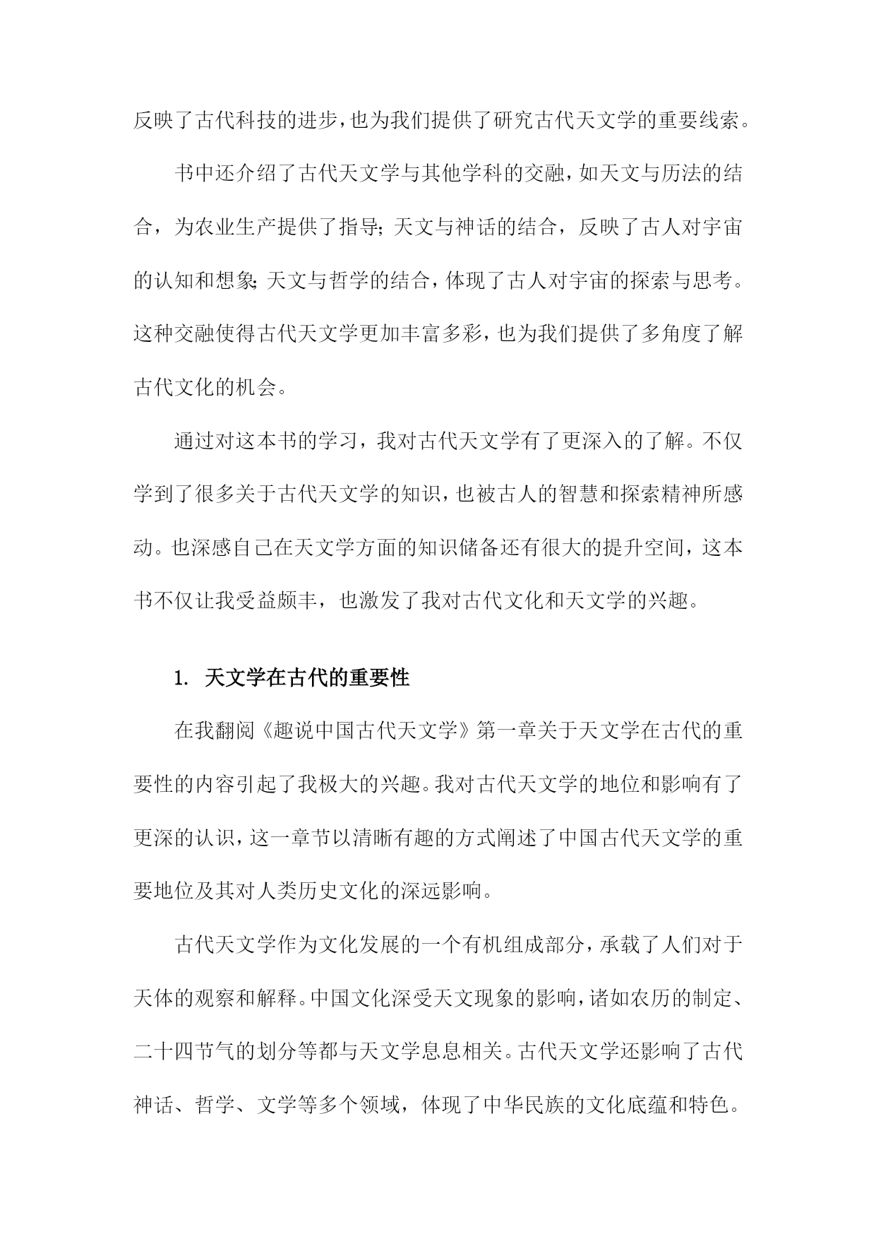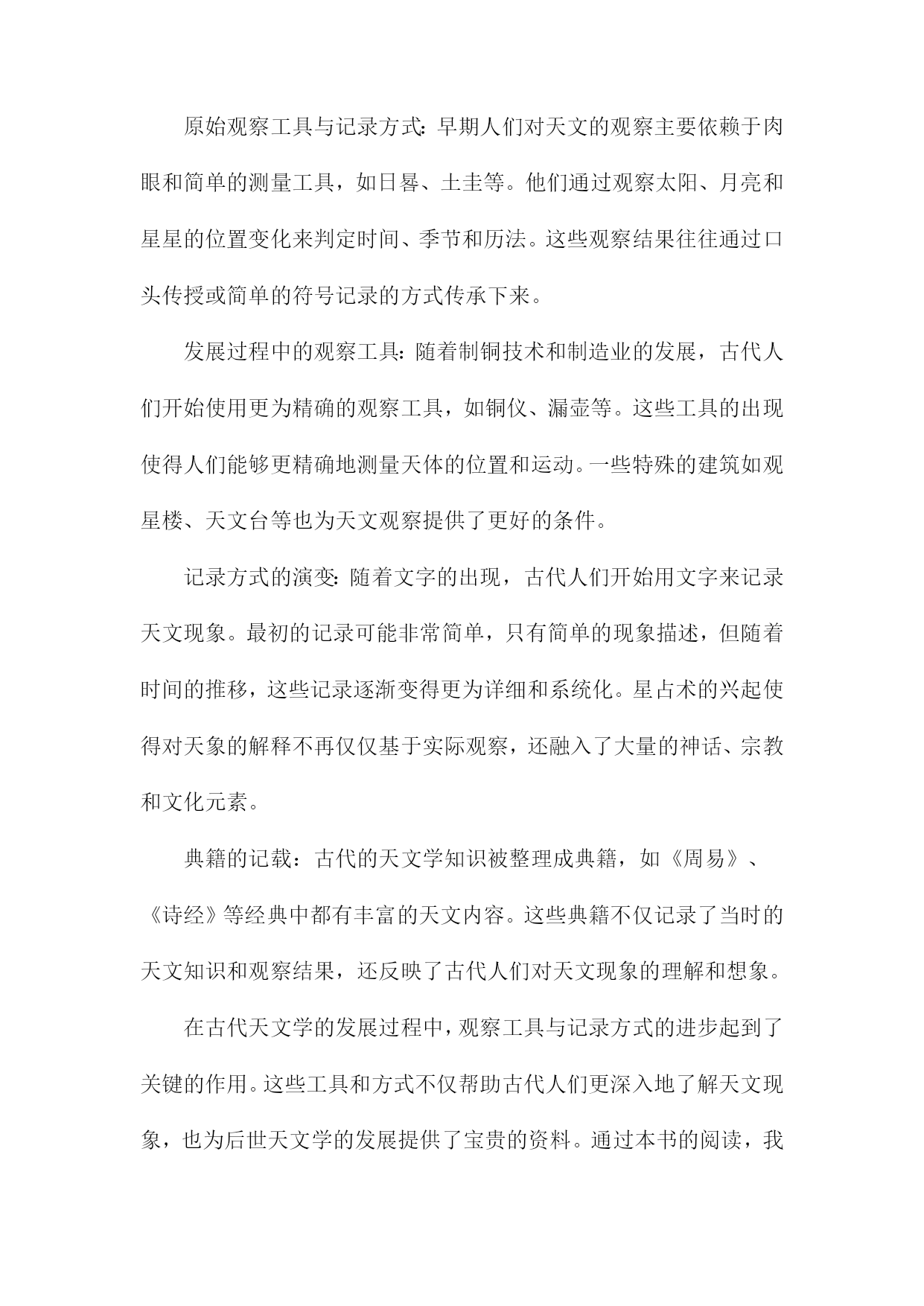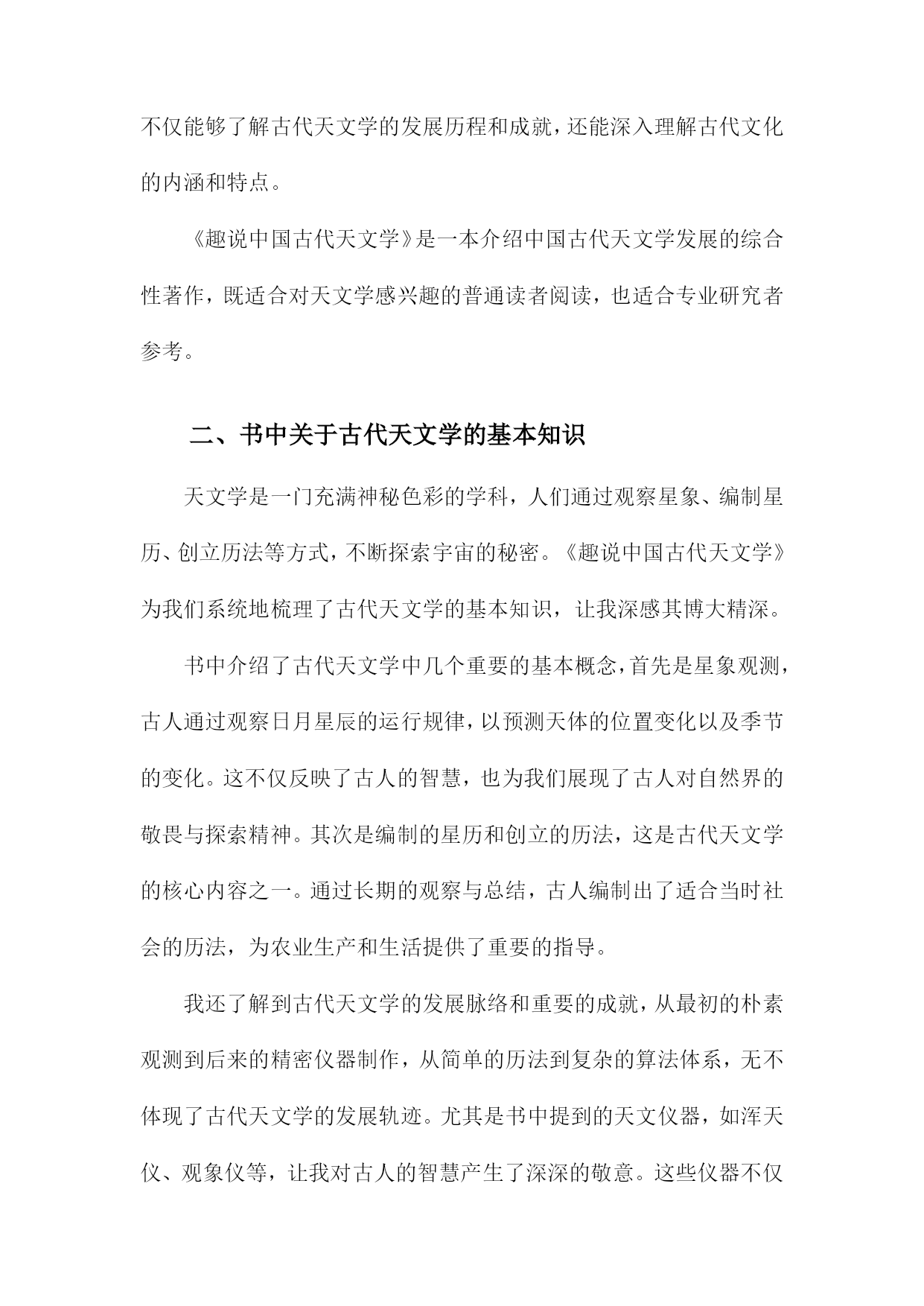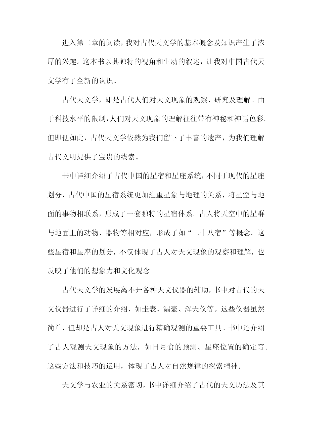 《趣说中国古代天文学》读书笔记一、书中主题及内容简介《趣说中国古代天文学》一书主要围绕中国古代的天文学发展展开详细的解读和阐述。本书旨在通过对中国古代天文学的历史背景、科技环境、文化背景及其发展的全面分析,让读者理解古代天文学的发展历程及其在中国文化中的地位和影响。书中主题鲜明,内容丰富多彩。内容简介方面,本书从古代的天文观测工具、天文思想、天文历法以及天文文化等多个角度切入,生动地再现了古代天文学的发展历程。作者通过搜集大量的历史资料,结合丰富的实例,以通俗易懂的语言,介绍了中国古代天文学的发展历程和主要成就。书中不仅涵盖了古代天文学的基本知识,更通过深入挖掘历史资料,揭示了古代天文学在当时社会的重要性以及其在科技发展中的地位。本书还通过对比现代天文学的知识,引导读者理解古代天文学与现代天文学之间的联系和差异,使读者在了解古代天文学的同时,也能对现代天文学有更深入的理解。本书还通过对古代天文文化、神话传说的解读,展示了古代天文学的人文精神及其在中国文化中的独特地位。通过本书的阅读,读者不仅能够了解古代天文学的发展历程和成就,还能深入理解古代文化的内涵和特点。《趣说中国古代天文学》是一本介绍中国古代天文学发展的综合性著作,既适合对天文学感兴趣的普通读者阅读,也适合专业研究者参考。二、书中关于古代天文学的基本知识天文学是一门充满神秘色彩的学科,人们通过观察星象、编制星历、创立历法等方式,不断探索宇宙的秘密。《趣说中国古代天文学》为我们系统地梳理了古代天文学的基本知识,让我深感其博大精深。书中介绍了古代天文学中几个重要的基本概念,首先是星象观测,古人通过观察日月星辰的运行规律,以预测天体的位置变化以及季节的变化。这不仅反映了古人的智慧,也为我们展现了古人对自然界的敬畏与探索精神。其次是编制的星历和创立的历法,这是古代天文学的核心内容之一。通过长期的观察与总结,古人编制出了适合当时社会的历法,为农业生产和生活提供了重要的指导。我还了解到古代天文学的发展脉络和重要的成就,从最初的朴素观测到后来的精密仪器制作,从简单的历法到复杂的算法体系,无不体现了古代天文学的发展轨迹。尤其是书中提到的天文仪器,如浑天仪、观象仪等,让我对古人的智慧产生了深深的敬意。这些仪器不仅反映了古代科技的进步,也为我们提供了研究古代天文学的重要线索。书中还介绍了古代天文学与其他学科的交融,如天文与历法的结合,为农业生产提供了指导;天文与神话的结合,反映了古人对宇宙的认知和想象;天文与哲学的结合,体现了古人对宇宙的探索与思考。这种交融使得古代天文学更加丰富多彩,也为我们提供了多角度了解古代文化的机会。通过对这本书的学习,我对古代天文学有了更深入的了解。不仅学到了很多关于古代天文学的知识,也被古人的智慧和探索精神所感动。也深感自己在天文学方面的知识储备还有很大的提升空间,这本书不仅让我受益颇丰,也激发了我对古代文化和天文学的兴趣。1.天文学在古代的重要性在我翻阅《趣说中国古代天文学》第一章关于天文学在古代的重要性的内容引起了我极大的兴趣。我对古代天文学的地位和影响有了更深的认识,这一章节以清晰有趣的方式阐述了中国古代天文学的重要地位及其对人类历史文化的深远影响。古代天文学作为文化发展的一个有机组成部分,承载了人们对于天体的观察和解释。中国文化深受天文现象的影响,诸如农历的制定、二十四节气的划分等都与天文学息息相关。古代天文学还影响了古代神话、哲学、文学等多个领域,体现了中华民族的文化底蕴和特色。在古代社会,天文学的地位举足轻重。它不仅是农耕生活的指导工具,更是国家决策的重要依据。通过对天象的观察和研究,古代人们能够预测自然灾害和气候变化,从而调整农业生产和社会生活。天文学在政治、军事等领域也发挥着重要作用,如天文预测能够提前告知君主和统治者可能出现的政治危机和战争局势。天文学在古代社会中具有很高的地位和重要性。中国古代天文学在世界文明中占有重要地位,早在数千年前,中国古代天文学家就对天体进行了系统的观察和记录,积累了丰富的研究经验。一些重要的天文发现和理论不仅对中国古代文化产生了深远影响,也对世界文明产生了重要影响。中国古代的星宿体系、历法和天文仪器等都是人类文明的重要遗产,为后世天文学的发展奠定了基础。中国古代天文学在促进人类文明进步和文化发展中发挥着不可替代的作用。古代天文学的辉煌成就也展示了中华民族的智慧和创造力,对于我们今天的科技发展仍然具有重要的启示和借鉴意义。通过对古代天文学的学习和研究,我们可以更好地理解中国传统文化和思想精髓进而为推动中华民族文化的繁荣发展做出积极贡献。这不仅有助于弘扬中华民族的文化自信力而且有助于提升我们对于自身历史和文化的认同感与自豪感。2.古代天文学的基本概念及知识进入第二章的阅读,我对古代天