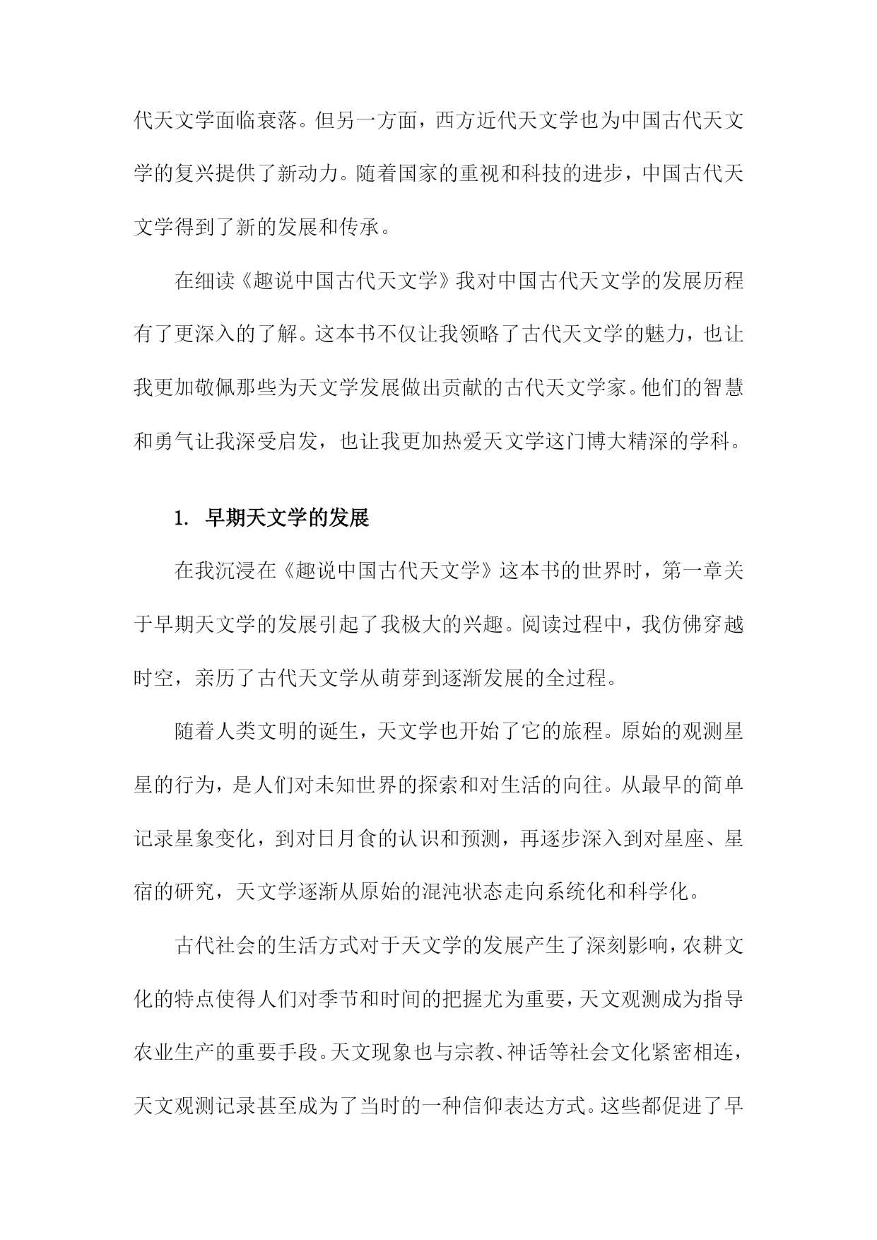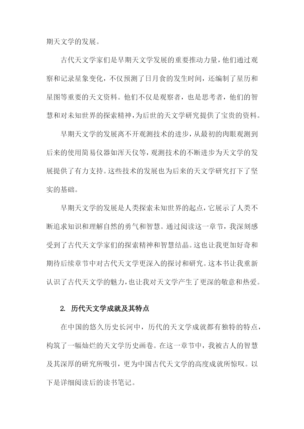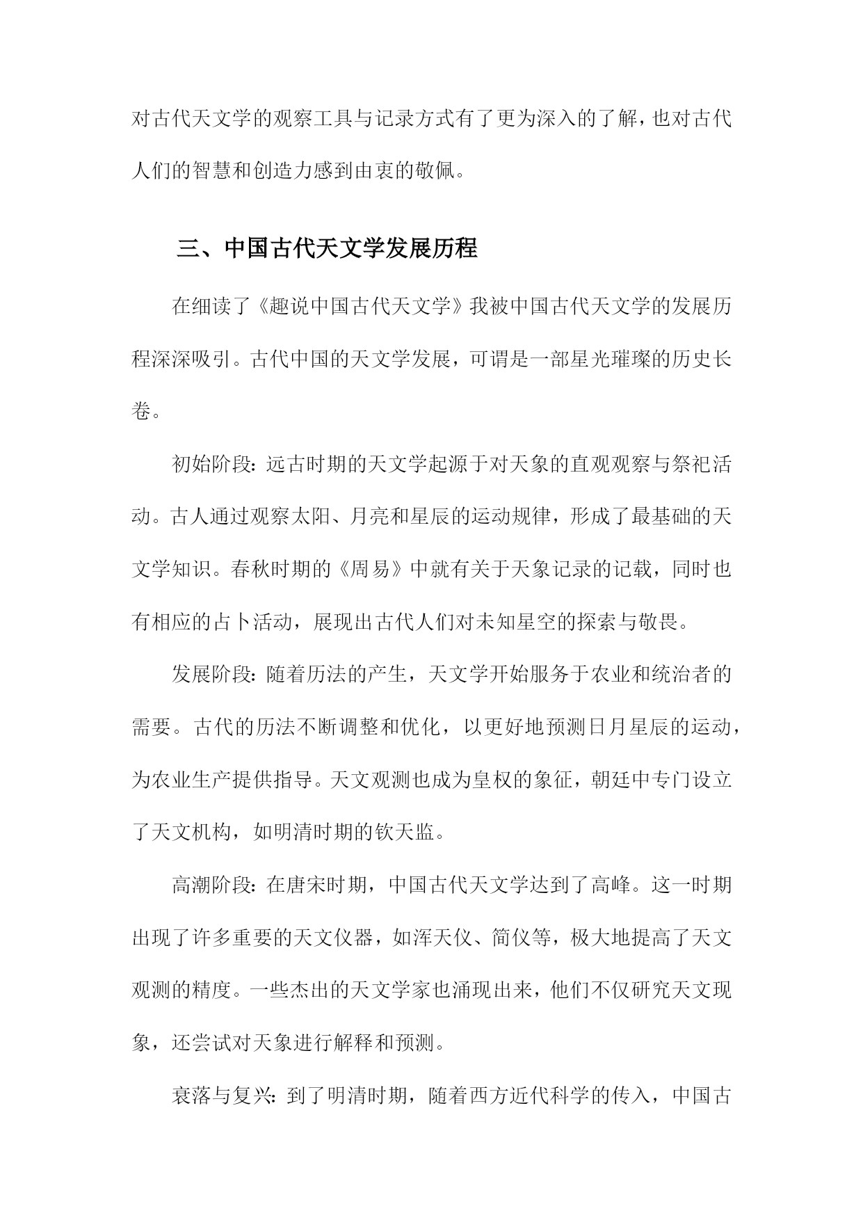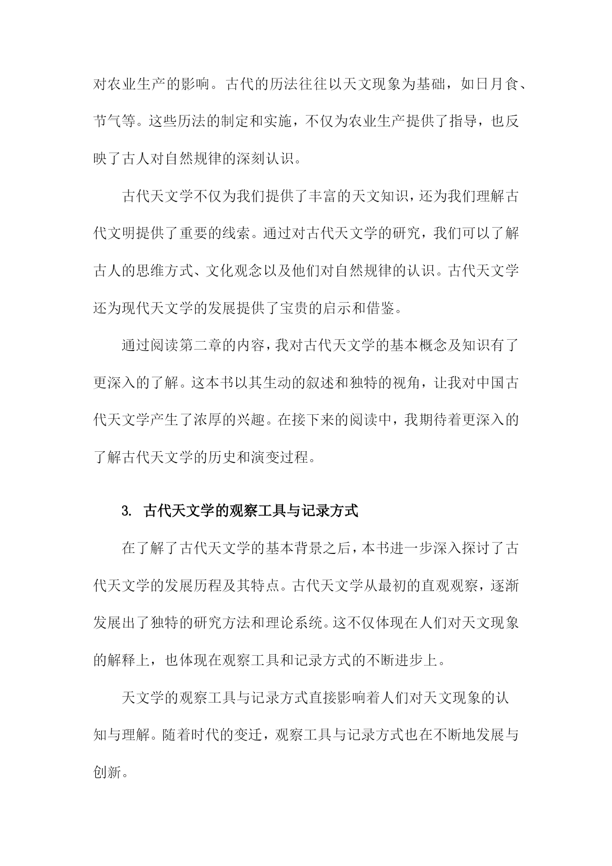 《趣说中国古代天文学》读书笔记一、书中主题及内容简介《趣说中国古代天文学》一书主要围绕中国古代的天文学发展展开详细的解读和阐述。本书旨在通过对中国古代天文学的历史背景、科技环境、文化背景及其发展的全面分析,让读者理解古代天文学的发展历程及其在中国文化中的地位和影响。书中主题鲜明,内容丰富多彩。内容简介方面,本书从古代的天文观测工具、天文思想、天文历法以及天文文化等多个角度切入,生动地再现了古代天文学的发展历程。作者通过搜集大量的历史资料,结合丰富的实例,以通俗易懂的语言,介绍了中国古代天文学的发展历程和主要成就。书中不仅涵盖了古代天文学的基本知识,更通过深入挖掘历史资料,揭示了古代天文学在当时社会的重要性以及其在科技发展中的地位。本书还通过对比现代天文学的知识,引导读者理解古代天文学与现代天文学之间的联系和差异,使读者在了解古代天文学的同时,也能对现代天文学有更深入的理解。本书还通过对古代天文文化、神话传说的解读,展示了古代天文学的人文精神及其在中国文化中的独特地位。通过本书的阅读,读者不仅能够了解古代天文学的发展历程和成就,还能深入理解古代文化的内涵和特点。《趣说中国古代天文学》是一本介绍中国古代天文学发展的综合性著作,既适合对天文学感兴趣的普通读者阅读,也适合专业研究者参考。二、书中关于古代天文学的基本知识天文学是一门充满神秘色彩的学科,人们通过观察星象、编制星历、创立历法等方式,不断探索宇宙的秘密。《趣说中国古代天文学》为我们系统地梳理了古代天文学的基本知识,让我深感其博大精深。书中介绍了古代天文学中几个重要的基本概念,首先是星象观测,古人通过观察日月星辰的运行规律,以预测天体的位置变化以及季节的变化。这不仅反映了古人的智慧,也为我们展现了古人对自然界的敬畏与探索精神。其次是编制的星历和创立的历法,这是古代天文学的核心内容之一。通过长期的观察与总结,古人编制出了适合当时社会的历法,为农业生产和生活提供了重要的指导。我还了解到古代天文学的发展脉络和重要的成就,从最初的朴素观测到后来的精密仪器制作,从简单的历法到复杂的算法体系,无不体现了古代天文学的发展轨迹。尤其是书中提到的天文仪器,如浑天仪、观象仪等,让我对古人的智慧产生了深深的敬意。这些仪器不仅反映了古代科技的进步,也为我们提供了研究古代天文学的重要线索。书中还介绍了古代天文学与其他学科的交融,如天文与历法的结合,为农业生产提供了指导;天文与神话的结合,反映了古人对宇宙的认知和想象;天文与哲学的结合,体现了古人对宇宙的探索与思考。这种交融使得古代天文学更加丰富多彩,也为我们提供了多角度了解古代文化的机会。通过对这本书的学习,我对古代天文学有了更深入的了解。不仅学到了很多关于古代天文学的知识,也被古人的智慧和探索精神所感动。也深感自己在天文学方面的知识储备还有很大的提升空间,这本书不仅让我受益颇丰,也激发了我对古代文化和天文学的兴趣。1.天文学在古代的重要性在我翻阅《趣说中国古代天文学》第一章关于天文学在古代的重要性的内容引起了我极大的兴趣。我对古代天文学的地位和影响有了更深的认识,这一章节以清晰有趣的方式阐述了中国古代天文学的重要地位及其对人类历史文化的深远影响。古代天文学作为文化发展的一个有机组成部分,承载了人们对于天体的观察和解释。中国文化深受天文现象的影响,诸如农历的制定、二十四节气的划分等都与天文学息息相关。古代天文学还影响了古代神话、哲学、文学等多个领域,体现了中华民族的文化底蕴和特色。在古代社会,天文学的地位举足轻重。它不仅是农耕生活的指导工具,更是国家决策的重要依据。通过对天象的观察和研究,古代人们能够预测自然灾害和气候变化,从而调整农业生产和社会生活。天文学在政治、军事等领域也发挥着重要作用,如天文预测能够提前告知君主和统治者可能出现的政治危机和战争局势。天文学在古代社会中具有很高的地位和重要性。中国古代天文学在世界文明中占有重要地位,早在数千年前,中国古代天文学家就对天体进行了系统的观察和记录,积累了丰富的研究经验。一些重要的天文发现和理论不仅对中国古代文化产生了深远影响,也对世界文明产生了重要影响。中国古代的星宿体系、历法和天文仪器等都是人类文明的重要遗产,为后世天文学的发展奠定了基础。中国古代天文学在促进人类文明进步和文化发展中发挥着不可替代的作用。古代天文学的辉煌成就也展示了中华民族的智慧和创造力,对于我们今天的科技发展仍然具有重要的启示和借鉴意义。通过对古代天文学的学习和研究,我们可以更好地理解中国传统文化和思想精髓进而为推动中华民族文化的繁荣发展做出积极贡献。这不仅有助于弘扬中华民族的文化自信力而且有助于提升我们对于自身历史和文化的认同感与自豪感。2.古代天文学的基本概念及知识进入第二章的阅读,我对古代天