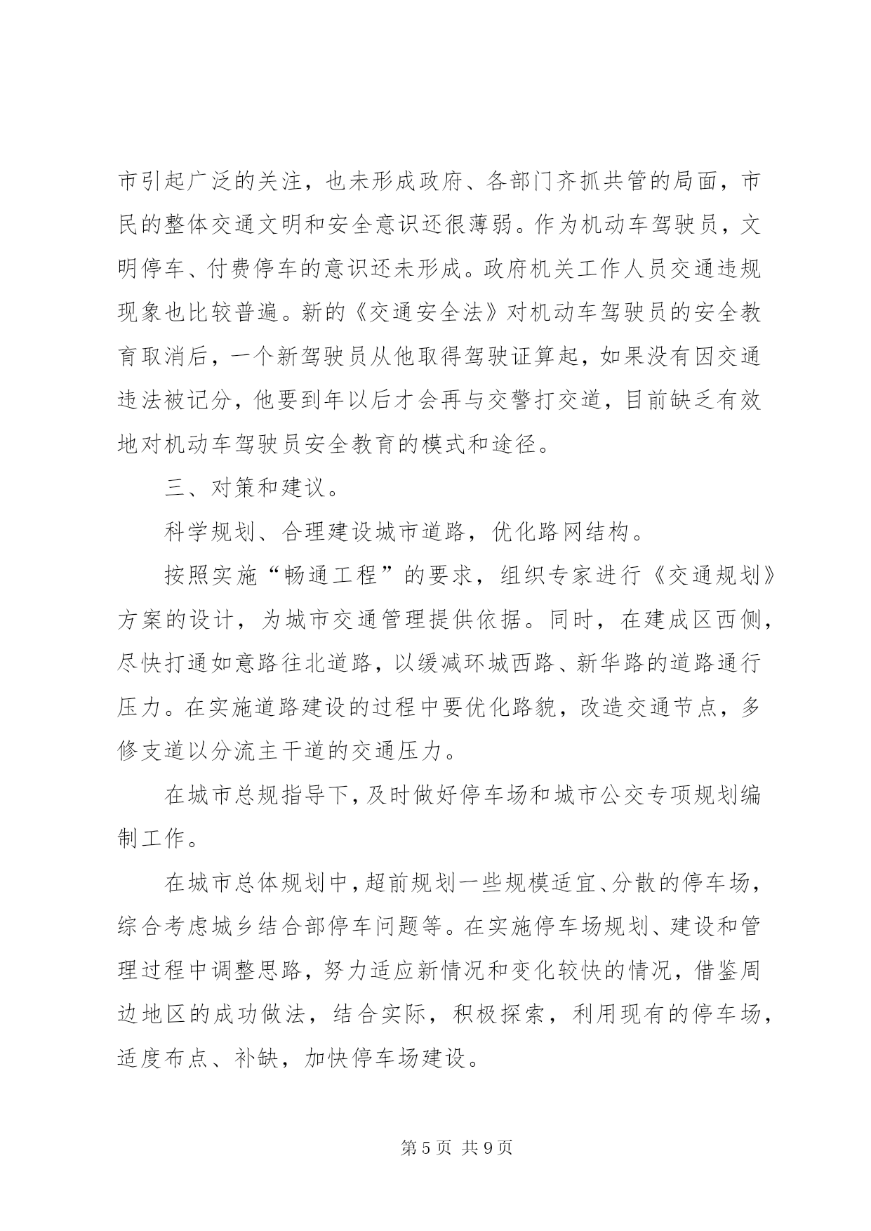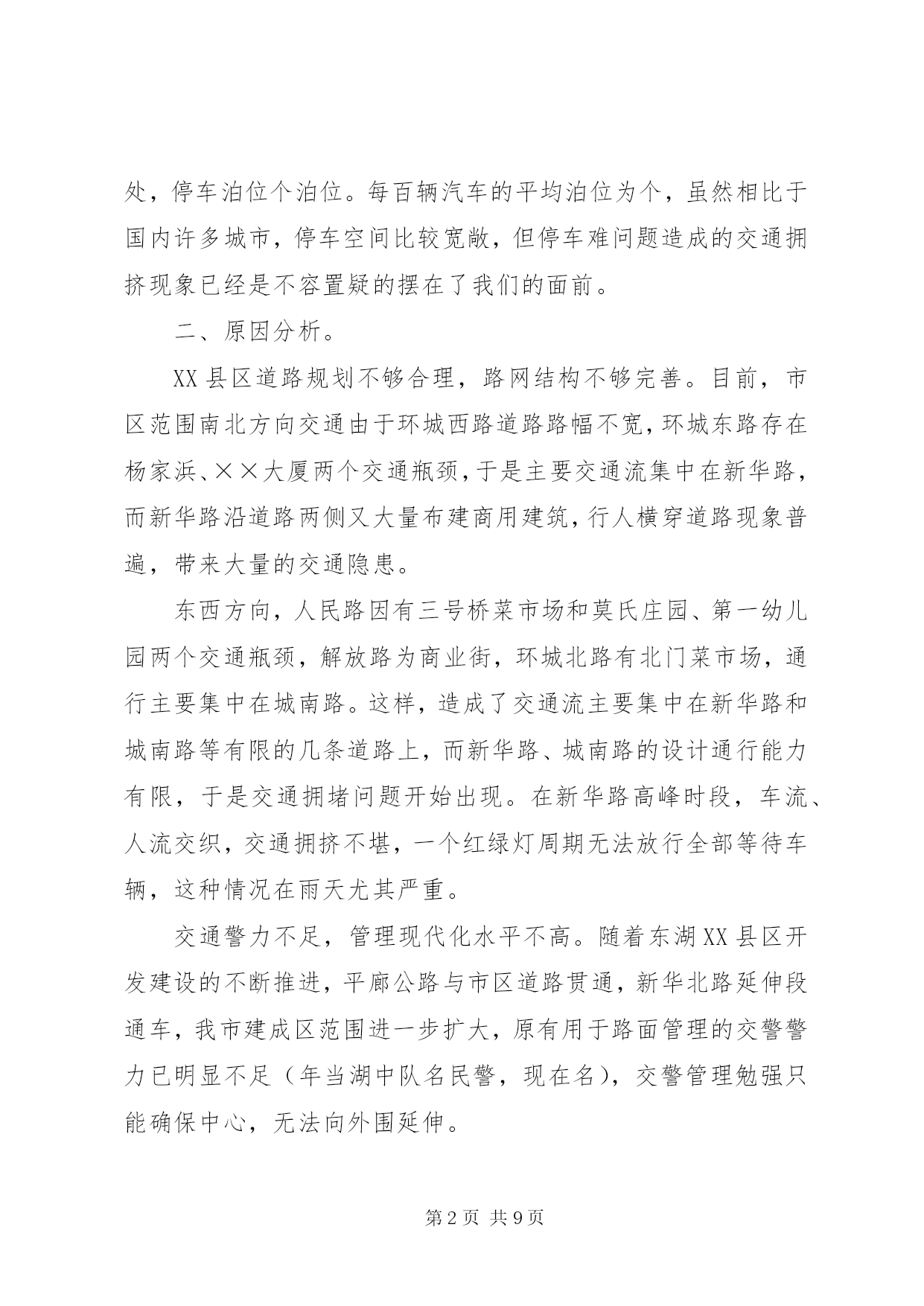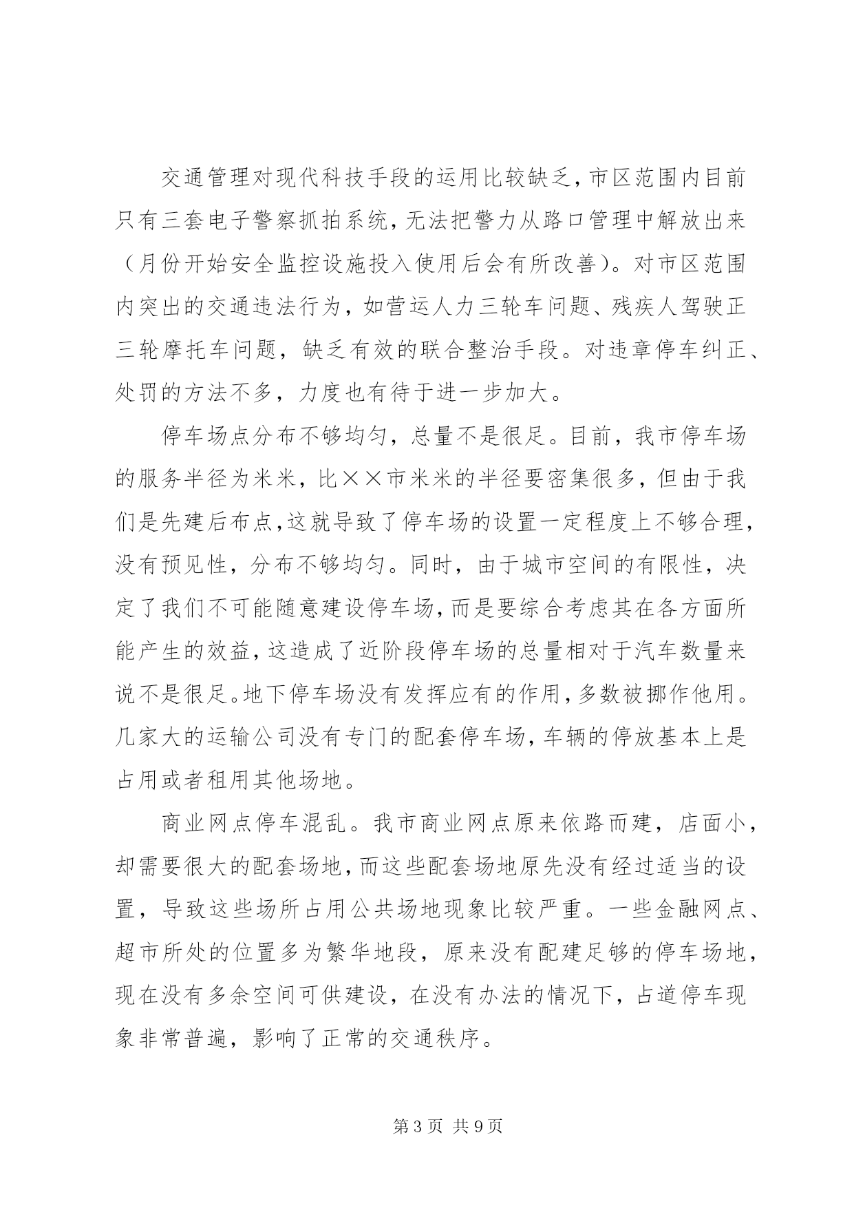 第PAGE\*Arabic\*MERGEFORMAT9页共NUMPAGES\*MERGEFORMAT9页市区交通整治问题专题调研报告...市区交通整治问题专题调研报告随着经济的发展和社会的进步,人民生活水平不断提高,城市汽车保有量不断攀升,由于汽车引发的交通问题,特别是停车难、乱停车,城市交通拥堵,交通秩序混乱等现象开始逐渐成为城市通病。为贯彻落实市政府有关会议精神,现将我市交通情况调研后报告如下:一、交通现状。近年来,我市城市建设步伐的不断加快,XX县区路网等基础设施的不断完善,“畅通工程”效果比较显著,一定程度上缓解了助动车量增长快速,市区交通拥挤的状况。但是,从总体上来说,我市的交通拥堵情况日益严峻,已经开始影响到市民的正常生产、生活和我市经济社会的发展。到年底,我市建成区面积平方公里,人口万人,XX县区道路总长为公里公里,总面积平方米万平方米。据市交警大队最新统计。我市汽车数量年为辆,年为辆,年为。其中,年增幅为;年增幅为。与之相对应的是,当前,XX县区可提供汽车停放的泊位有处,个泊位。其中公共建筑配建的停车场(点)处,个泊位;社会停车场(点)处,个泊位;道路停车点处,个泊位;住宅小区处,停车泊位个泊位。每百辆汽车的平均泊位为个,虽然相比于国内许多城市,停车空间比较宽敞,但停车难问题造成的交通拥挤现象已经是不容置疑的摆在了我们的面前。二、原因分析。XX县区道路规划不够合理,路网结构不够完善。目前,市区范围南北方向交通由于环城西路道路路幅不宽,环城东路存在杨家浜、××大厦两个交通瓶颈,于是主要交通流集中在新华路,而新华路沿道路两侧又大量布建商用建筑,行人横穿道路现象普遍,带来大量的交通隐患。东西方向,人民路因有三号桥菜市场和莫氏庄园、第一幼儿园两个交通瓶颈,解放路为商业街,环城北路有北门菜市场,通行主要集中在城南路。这样,造成了交通流主要集中在新华路和城南路等有限的几条道路上,而新华路、城南路的设计通行能力有限,于是交通拥堵问题开始出现。在新华路高峰时段,车流、人流交织,交通拥挤不堪,一个红绿灯周期无法放行全部等待车辆,这种情况在雨天尤其严重。交通警力不足,管理现代化水平不高。随着东湖XX县区开发建设的不断推进,平廊公路与市区道路贯通,新华北路延伸段通车,我市建成区范围进一步扩大,原有用于路面管理的交警警力已明显不足(年当湖中队名民警,现在名),交警管理勉强只能确保中心,无法向外围延伸。交通管理对现代科技手段的运用比较缺乏,市区范围内目前只有三套电子警察抓拍系统,无法把警力从路口管理中解放出来(月份开始安全监控设施投入使用后会有所改善)。对市区范围内突出的交通违法行为,如营运人力三轮车问题、残疾人驾驶正三轮摩托车问题,缺乏有效的联合整治手段。对违章停车纠正、处罚的方法不多,力度也有待于进一步加大。停车场点分布不够均匀,总量不是很足。目前,我市停车场的服务半径为米米,比××市米米的半径要密集很多,但由于我们是先建后布点,这就导致了停车场的设置一定程度上不够合理,没有预见性,分布不够均匀。同时,由于城市空间的有限性,决定了我们不可能随意建设停车场,而是要综合考虑其在各方面所能产生的效益,这造成了近阶段停车场的总量相对于汽车数量来说不是很足。地下停车场没有发挥应有的作用,多数被挪作他用。几家大的运输公司没有专门的配套停车场,车辆的停放基本上是占用或者租用其他场地。商业网点停车混乱。我市商业网点原来依路而建,店面小,却需要很大的配套场地,而这些配套场地原先没有经过适当的设置,导致这些场所占用公共场地现象比较严重。一些金融网点、超市所处的位置多为繁华地段,原来没有配建足够的停车场地,现在没有多余空间可供建设,在没有办法的情况下,占道停车现象非常普遍,影响了正常的交通秩序。住宅小区配建的停车设施不足。目前,较多的房地产开发商出于商业利益考虑,在开发建设中安排的商铺数量过多,而这些商铺在经营过程中或多或少存在占用道路的问题,影响小区周边道路的通行;在小区内部,则压缩、挤占停车位数量,有车的业主找不到车位只好占用小区道路,造成居民通行困难。停车收费制度不完善。一方面,为贯彻《交通安全法》第条第款关于“交警部门不得举办或参与收费停车经营活动”的规定,交警对有效路面的临时停车收费实际上已经取消。在目前缺乏一支专门停车收费队伍的情况下,除有限的几个停车场还实施收费管理外,市区路面停车全部不收费,变相鼓励了机动车不进停车场而占道停车的行为。另一方面,因为缺乏对违章停车的有效处罚手段,市民为求方便,随意停车,那里方便停那里,无视交通秩序,造成了停车场内空位较多,道路两旁车满为患的情况。门前“三包”责任制未有效落实,沿街人行道停车秩序比较混乱。部分道路如建国北路小吃店占道设摊,使原本不宽的路面更显拥挤,经常出现交通拥堵现象