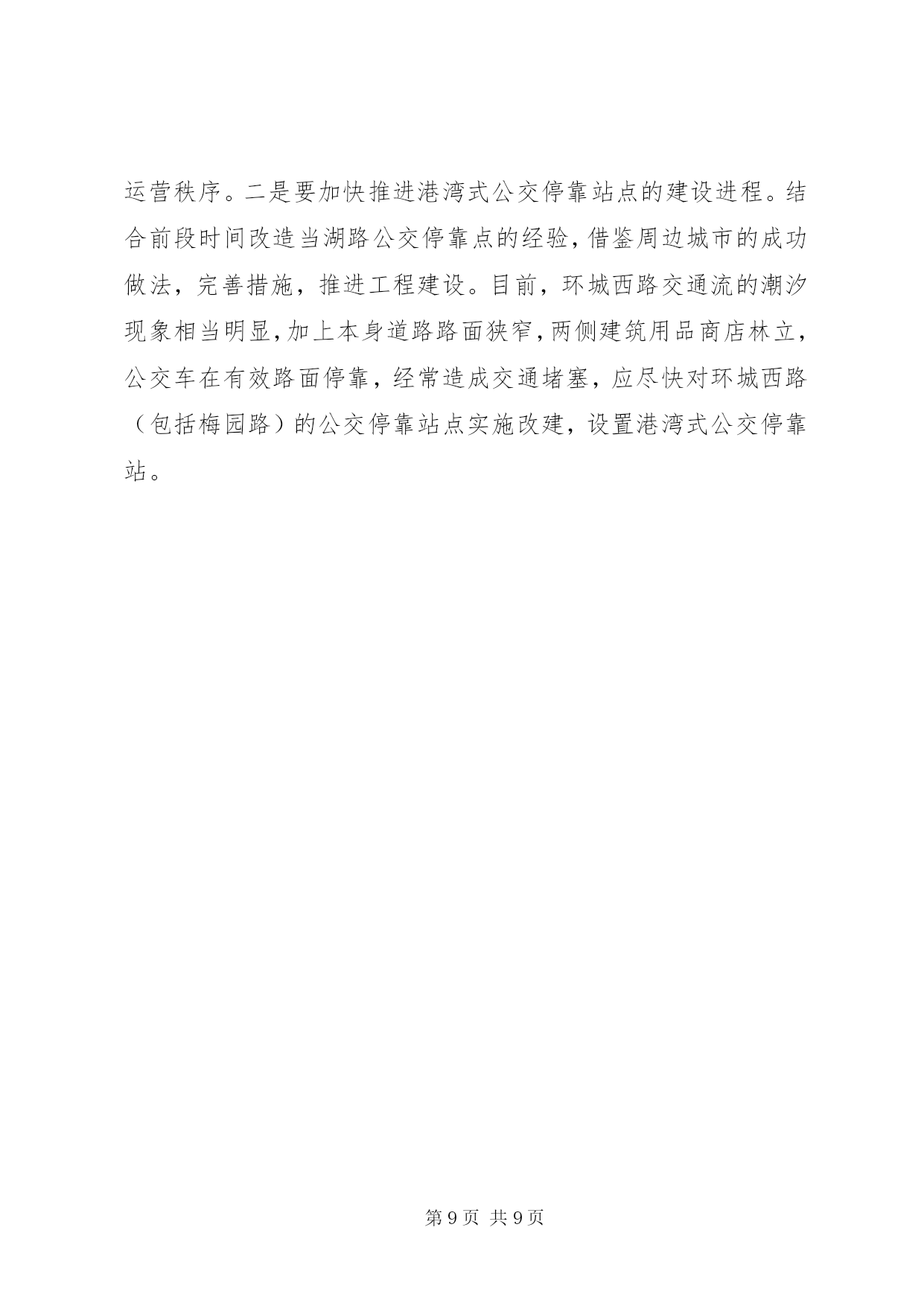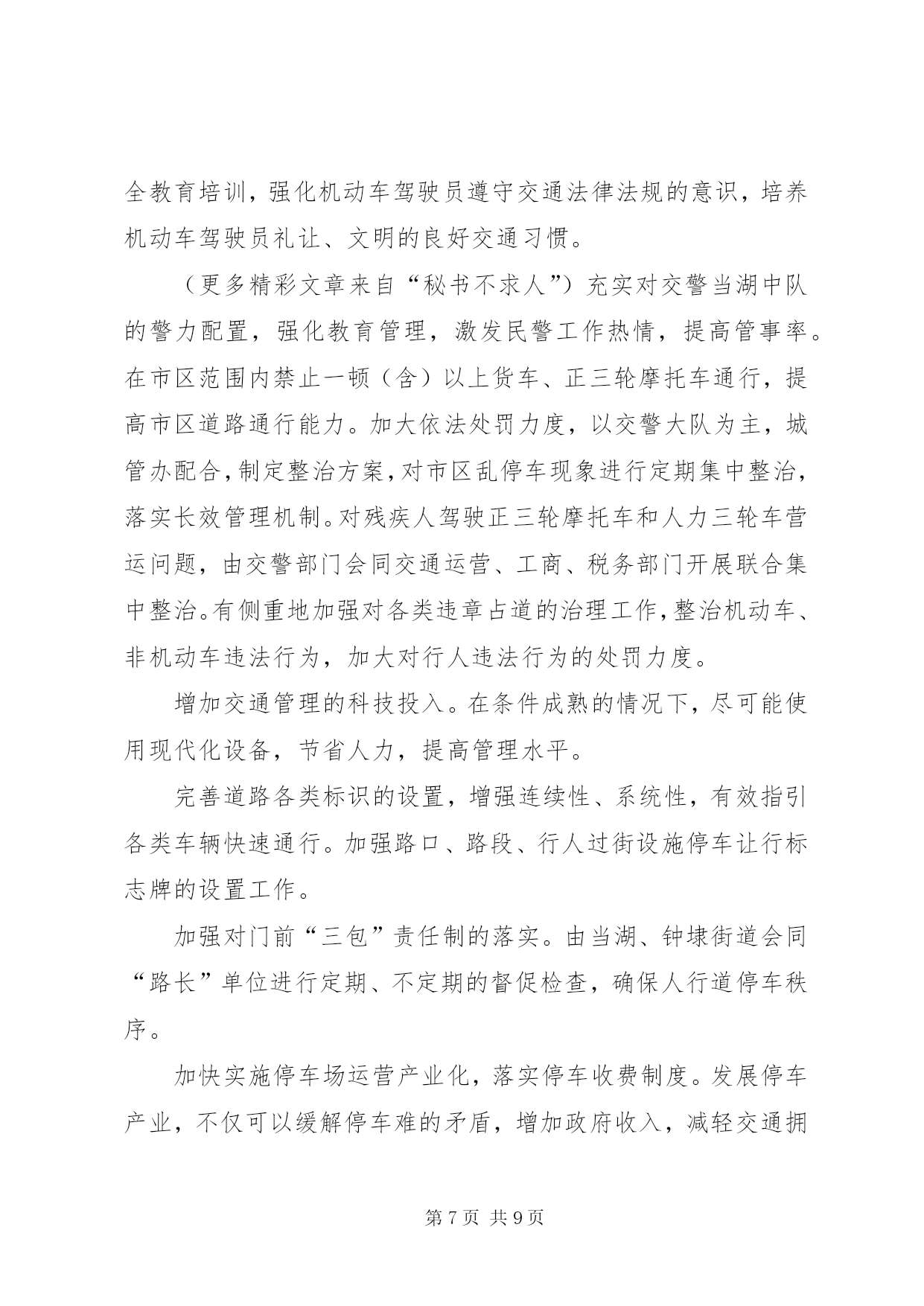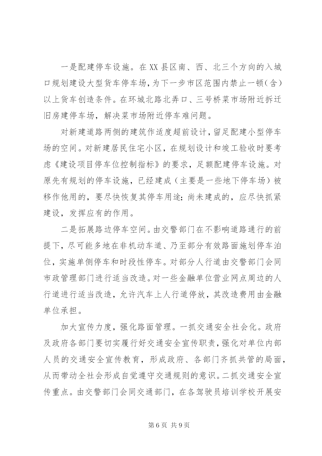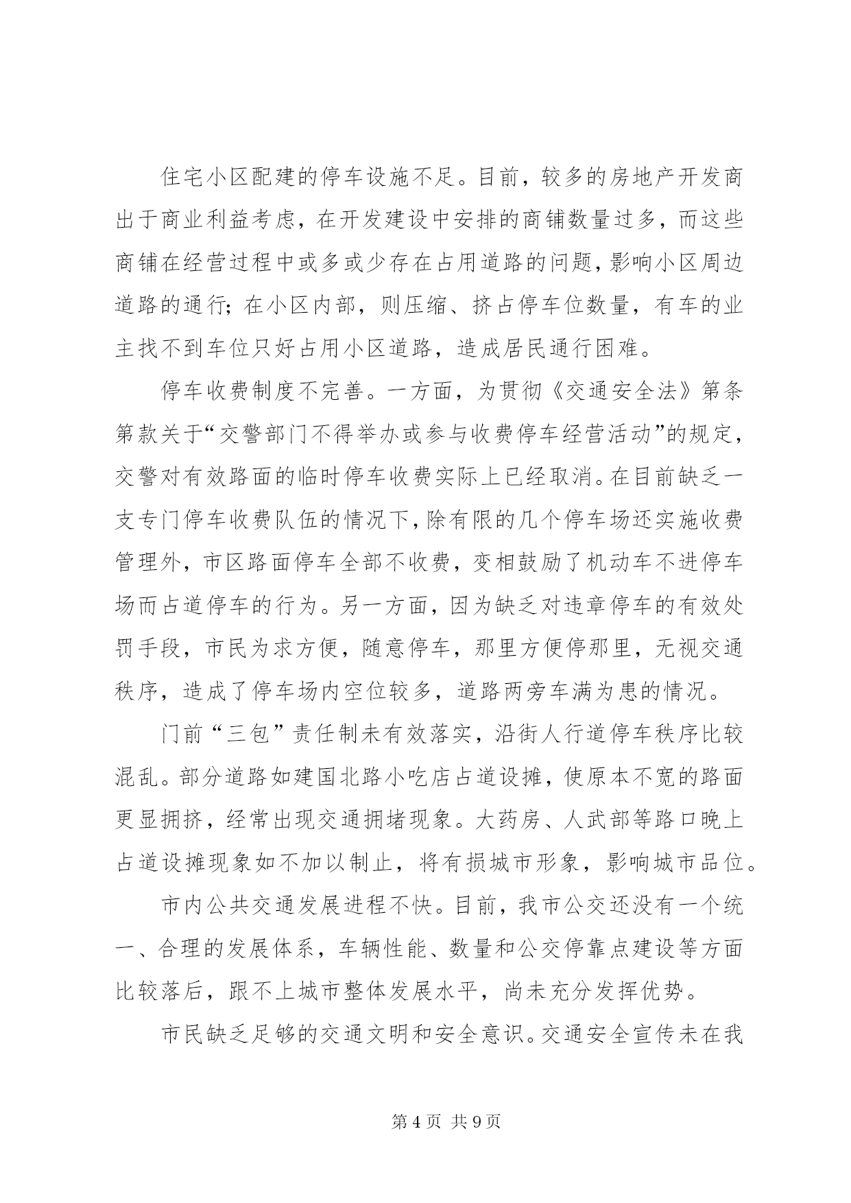 第PAGE\*Arabic\*MERGEFORMAT9页共NUMPAGES\*MERGEFORMAT9页市区交通整治问题专题调研报告...市区交通整治问题专题调研报告随着经济的发展和社会的进步,人民生活水平不断提高,城市汽车保有量不断攀升,由于汽车引发的交通问题,特别是停车难、乱停车,城市交通拥堵,交通秩序混乱等现象开始逐渐成为城市通病。为贯彻落实市政府有关会议精神,现将我市交通情况调研后报告如下:一、交通现状。近年来,我市城市建设步伐的不断加快,XX县区路网等基础设施的不断完善,“畅通工程”效果比较显著,一定程度上缓解了助动车量增长快速,市区交通拥挤的状况。但是,从总体上来说,我市的交通拥堵情况日益严峻,已经开始影响到市民的正常生产、生活和我市经济社会的发展。到年底,我市建成区面积平方公里,人口万人,XX县区道路总长为公里公里,总面积平方米万平方米。据市交警大队最新统计。我市汽车数量年为辆,年为辆,年为。其中,年增幅为;年增幅为。与之相对应的是,当前,XX县区可提供汽车停放的泊位有处,个泊位。其中公共建筑配建的停车场(点)处,个泊位;社会停车场(点)处,个泊位;道路停车点处,个泊位;住宅小区处,停车泊位个泊位。每百辆汽车的平均泊位为个,虽然相比于国内许多城市,停车空间比较宽敞,但停车难问题造成的交通拥挤现象已经是不容置疑的摆在了我们的面前。二、原因分析。XX县区道路规划不够合理,路网结构不够完善。目前,市区范围南北方向交通由于环城西路道路路幅不宽,环城东路存在杨家浜、××大厦两个交通瓶颈,于是主要交通流集中在新华路,而新华路沿道路两侧又大量布建商用建筑,行人横穿道路现象普遍,带来大量的交通隐患。东西方向,人民路因有三号桥菜市场和莫氏庄园、第一幼儿园两个交通瓶颈,解放路为商业街,环城北路有北门菜市场,通行主要集中在城南路。这样,造成了交通流主要集中在新华路和城南路等有限的几条道路上,而新华路、城南路的设计通行能力有限,于是交通拥堵问题开始出现。在新华路高峰时段,车流、人流交织,交通拥挤不堪,一个红绿灯周期无法放行全部等待车辆,这种情况在雨天尤其严重。交通警力不足,管理现代化水平不高。随着东湖XX县区开发建设的不断推进,平廊公路与市区道路贯通,新华北路延伸段通车,我市建成区范围进一步扩大,原有用于路面管理的交警警力已明显不足(年当湖中队名民警,现在名),交警管理勉强只能确保中心,无法向外围延伸。交通管理对现代科技手段的运用比较缺乏,市区范围内目前只有三套电子警察抓拍系统,无法把警力从路口管理中解放出来(月份开始安全监控设施投入使用后会有所改善)。对市区范围内突出的交通违法行为,如营运人力三轮车问题、残疾人驾驶正三轮摩托车问题,缺乏有效的联合整治手段。对违章停车纠正、处罚的方法不多,力度也有待于进一步加大。停车场点分布不够均匀,总量不是很足。目前,我市停车场的服务半径为米米,比××市米米的半径要密集很多,但由于我们是先建后布点,这就导致了停车场的设置一定程度上不够合理,没有预见性,分布不够均匀。同时,由于城市空间的有限性,决定了我们不可能随意建设停车场,而是要综合考虑其在各方面所能产生的效益,这造成了近阶段停车场的总量相对于汽车数量来说不是很足。地下停车场没有发挥应有的作用,多数被挪作他用。几家大的运输公司没有专门的配套停车场,车辆的停放基本上是占用或者租用其他场地。商业网点停车混乱。我市商业网点原来依路而建,店面小,却需要很大的配套场地,而这些配套场地原先没有经过适当的设置,导致这些场所占用公共场地现象比较严重。一些金融网点、超市所处的位置多为繁华地段,原来没有配建足够的停车场地,现在没有多余空间可供建设,在没有办法的情况下,占道停车现象非常普遍,影响了正常的交通秩序。住宅小区配建的停车设施不足。目前,较多的房地产开发商出于商业利益考虑,在开发建设中安排的商铺数量过多,而这些商铺在经营过程中或多或少存在占用道路的问题,影响小区周边道路的通行;在小区内部,则压缩、挤占停车位数量,有车的业主找不到车位只好占用小区道路,造成居民通行困难。停车收费制度不完善。一方面,为贯彻《交通安全法》第条第款关于“交警部门不得举办或参与收费停车经营活动”的规定,交警对有效路面的临时停车收费实际上已经取消。在目前缺乏一支专门停车收费队伍的情况下,除有限的几个停车场还实施收费管理外,市区路面停车全部不收费,变相鼓励了机动车不进停车场而占道停车的行为。另一方面,因为缺乏对违章停车的有效处罚手段,市民为求方便,随意停车,那里方便停那里,无视交通秩序,造成了停车场内空位较多,道路两旁车满为患的情况。门前“三包”责任制未有效落实,沿街人行道停车秩序比较混乱。部分道路如建国北路小吃店占道设摊,使原本不宽的路面更显拥挤,经常出现交通拥堵现象