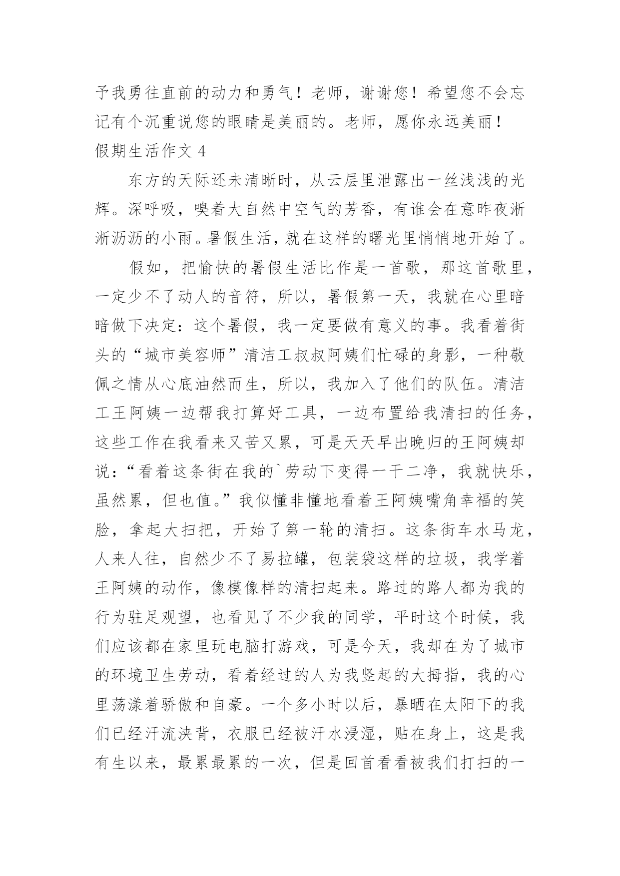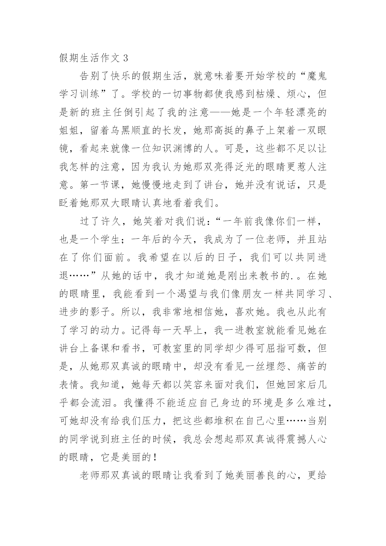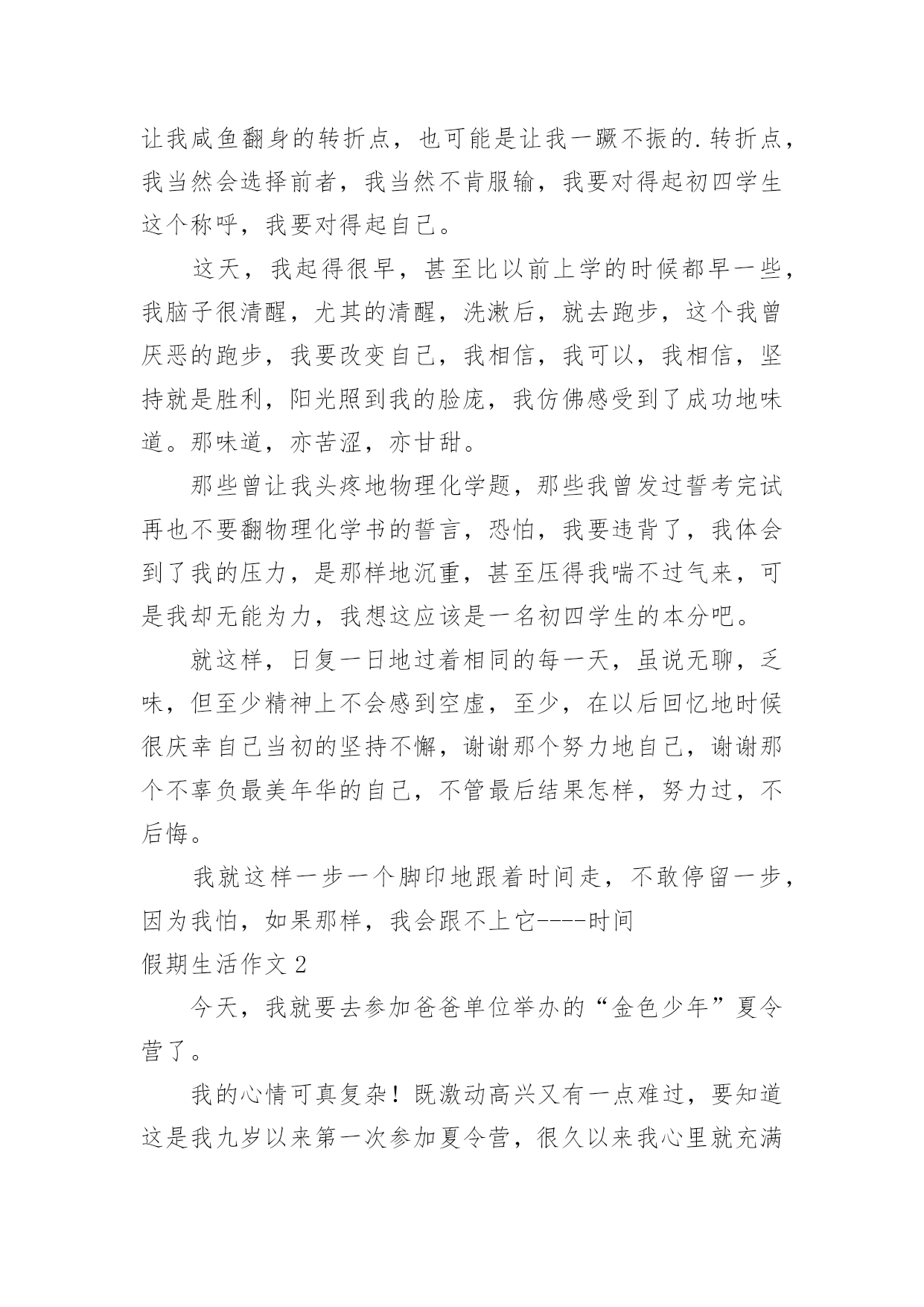假期生活作文假期生活作文(必备15篇)在平日的学习、工作和生活里,大家对作文都再熟悉不过了吧,借助作文人们可以实现文化交流的目的。那么,怎么去写作文呢?下面是小编为大家整理的假期生活作文,希望对大家有所帮助。假期生活作文1时间,就这样悄无声息地向前走,我们又迎来了假期生活。我曾天真的以为我可以肆无忌惮地玩,没日没夜地玩,我曾天真的以为我可以睡到中午十二点,我曾天真的以为我不用学习,可是,那只是我以为,在成绩出来的那一刻,这些,对我来说,都破碎了。原谅我的天真,原谅我的无知吧,原谅我已经忘了自己已经是一名初四的学生了,原谅我已经忘了自己即将是一名面对中考的学生了,可是即便别人能原谅,你能原谅你自己吗?你能原谅自己曾在马上要考试时还在贪玩刷空间吗?你能原谅自己马上要考试时还在睡到自然醒吗?是啊,小舍小得,大舍大得,不舍不得,这分数恰好证明了你努力的程度,这难道还不算沉重地打击吗?问问自己还有什么理由再去玩,还有什么资格再去玩..我清楚地知道,这个假期对我来说至关重要,它可能是让我咸鱼翻身的转折点,也可能是让我一蹶不振的.转折点,我当然会选择前者,我当然不肯服输,我要对得起初四学生这个称呼,我要对得起自己。这天,我起得很早,甚至比以前上学的时候都早一些,我脑子很清醒,尤其的清醒,洗漱后,就去跑步,这个我曾厌恶的跑步,我要改变自己,我相信,我可以,我相信,坚持就是胜利,阳光照到我的脸庞,我仿佛感受到了成功地味道。那味道,亦苦涩,亦甘甜。那些曾让我头疼地物理化学题,那些我曾发过誓考完试再也不要翻物理化学书的誓言,恐怕,我要违背了,我体会到了我的压力,是那样地沉重,甚至压得我喘不过气来,可是我却无能为力,我想这应该是一名初四学生的本分吧。就这样,日复一日地过着相同的每一天,虽说无聊,乏味,但至少精神上不会感到空虚,至少,在以后回忆地时候很庆幸自己当初的坚持不懈,谢谢那个努力地自己,谢谢那个不辜负最美年华的自己,不管最后结果怎样,努力过,不后悔。我就这样一步一个脚印地跟着时间走,不敢停留一步,因为我怕,如果那样,我会跟不上它----时间假期生活作文2今天,我就要去参加爸爸单位举办的“金色少年”夏令营了。我的心情可真复杂!既激动高兴又有一点难过,要知道这是我九岁以来第一次参加夏令营,很久以来我心里就充满着对夏令营的憧憬和盼望,如今怎能不激动呢!高兴的是我可以在夏令营锻炼自己,培养独立自理能力,还可以学到很多知识,认识更多的好朋友,难过的是我第一次要离开亲爱的妈妈这么久,想到在家里妈妈对我无微不至的关爱和照顾,我是多么依依不舍啊!带着这种复杂的心情,我登上了即将远去的汽车。汽车上都是和我一样参加夏令营的小朋友,他们相互认识的都坐在一起,欢快地聊着天,而我谁也不认识,孤零零地坐在座位上,我的座位旁边也没有坐人,我感到从未有过的孤独。于是,我又想起了妈妈和我的好朋友,想起了我们一起度过的美好时光,想着想着,不知不觉我就睡着了。突然我的头碰到了汽车玻璃上,好疼呀,我就醒了。我心想:我必须得交一个朋友,否则太无聊了。我就怀着紧张的心情拍了拍座位前面的一位同学的肩膀说:“小朋友,我们交个朋友吧!”她爽快地答应了,我又让她坐到了我的身边的'座位上,她说我很像《巴拉拉小魔仙》中的女王,我说她很像《欢天喜地七仙女》中的大公主,我们两就这样成为了好朋友,一路上说说笑笑,孤独已经抛到了九霄云外,不知不觉我们已经来到了长沟——我们的夏令营目的地。晚上,老师给我们分了班级和宿舍,遗憾的是我俩不但没分到一个班,也没分到一个宿舍,我们都很失望。这一天就这样过去了,该睡觉了,我默默地祈祷着:希望明天能过得更好!想着想着,我就进入了甜蜜的梦乡…假期生活作文3告别了快乐的假期生活,就意味着要开始学校的“魔鬼学习训练”了。学校的一切事物都使我感到枯燥、烦心,但是新的班主任倒引起了我的注意——她是一个年轻漂亮的姐姐,留着乌黑顺直的长发,她那高挺的鼻子上架着一双眼镜,看起来就像一位知识渊博的人。可是,这些都不足以让我怎样的注意,因为我认为她那双亮得泛光的眼睛更惹人注意。第一节课,她慢慢地走到了讲台,她并没有说话,只是眨着她那双大眼睛认真地看着我们。过了许久,她笑着对我们说:“一年前我像你们一样,也是一个学生;一年后的今天,我成为了一位老师,并且站在了你们面前。我希望在以后的日子,我们可以共同进退……”从她的话中,我才知道她是刚出来教书的.。在她的眼睛里,我能看到一个渴望与我们像朋友一样共同学习、进步的影子。所以,我非常地相信她,喜欢她。我也从此有了学习的动力。记得每一天早上,我一进教室就能看见她在讲台上备课和看书,可教室里的同学却少得可屈指可数,但是,从她那双真诚的眼睛中,却没有看见一丝埋怨、痛苦的表情。我知道,她每天都以笑容来面对我们,但她回家后几乎都会流泪。我懂得不能适应自己