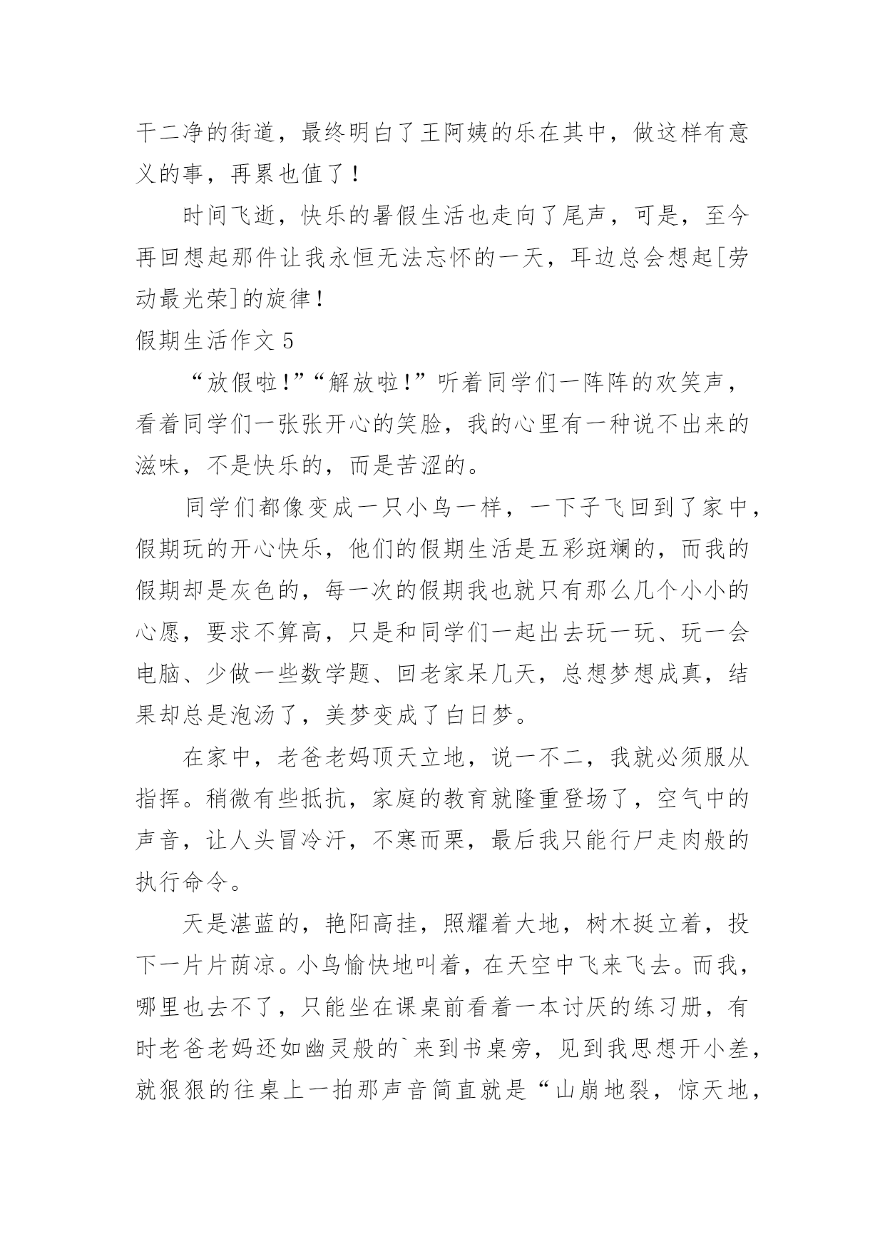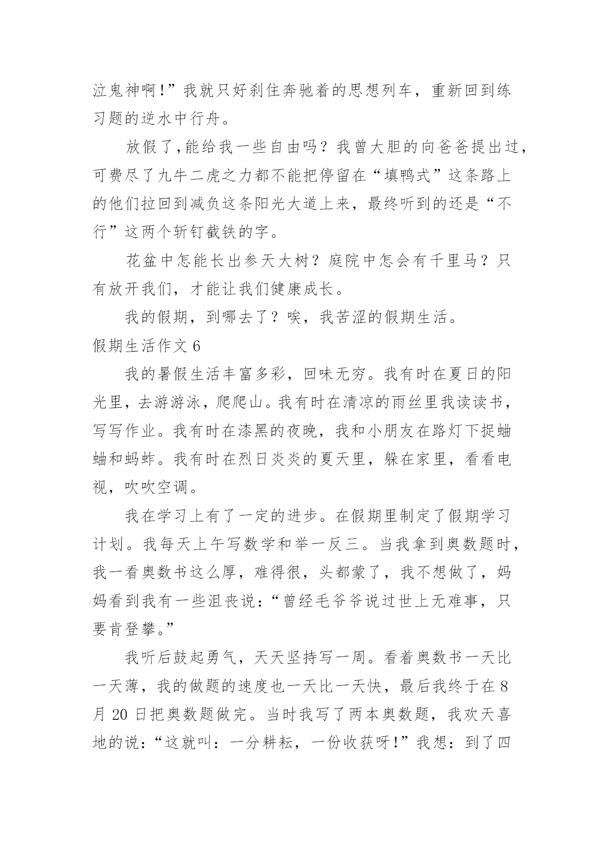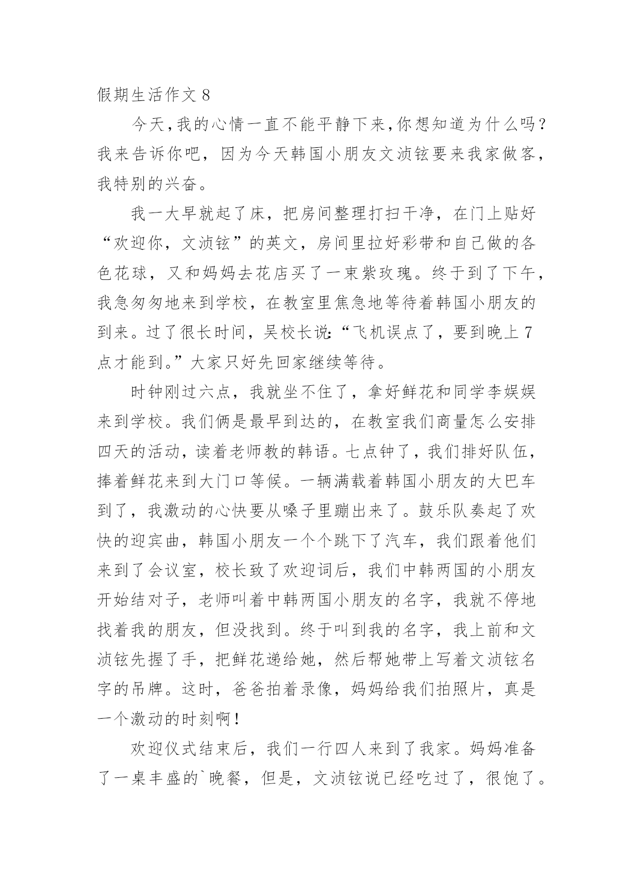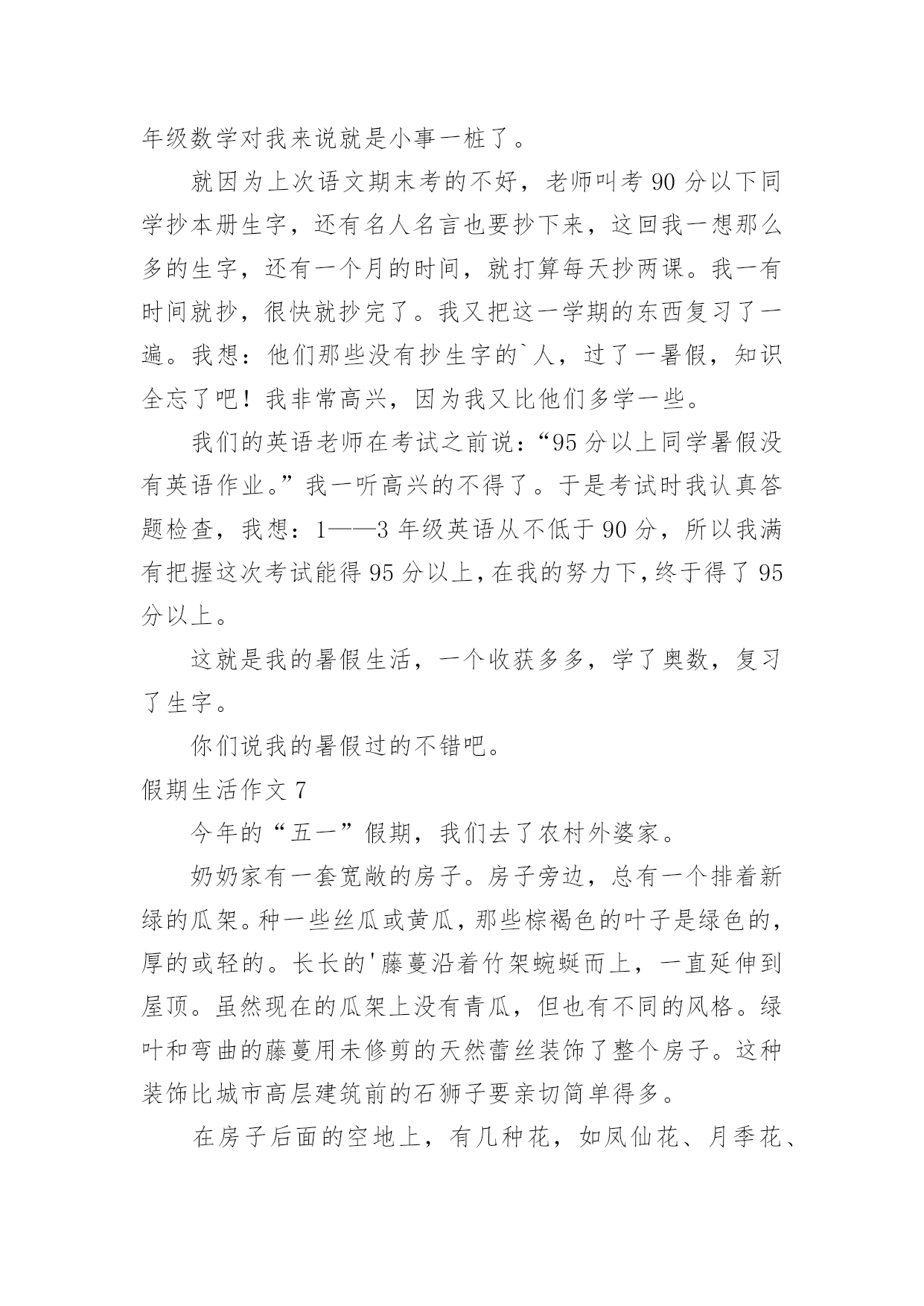假期生活作文假期生活作文(必备15篇)在平日的学习、工作和生活里,大家对作文都再熟悉不过了吧,借助作文人们可以实现文化交流的目的。那么,怎么去写作文呢?下面是小编为大家整理的假期生活作文,希望对大家有所帮助。假期生活作文1时间,就这样悄无声息地向前走,我们又迎来了假期生活。我曾天真的以为我可以肆无忌惮地玩,没日没夜地玩,我曾天真的以为我可以睡到中午十二点,我曾天真的以为我不用学习,可是,那只是我以为,在成绩出来的那一刻,这些,对我来说,都破碎了。原谅我的天真,原谅我的无知吧,原谅我已经忘了自己已经是一名初四的学生了,原谅我已经忘了自己即将是一名面对中考的学生了,可是即便别人能原谅,你能原谅你自己吗?你能原谅自己曾在马上要考试时还在贪玩刷空间吗?你能原谅自己马上要考试时还在睡到自然醒吗?是啊,小舍小得,大舍大得,不舍不得,这分数恰好证明了你努力的程度,这难道还不算沉重地打击吗?问问自己还有什么理由再去玩,还有什么资格再去玩..我清楚地知道,这个假期对我来说至关重要,它可能是让我咸鱼翻身的转折点,也可能是让我一蹶不振的.转折点,我当然会选择前者,我当然不肯服输,我要对得起初四学生这个称呼,我要对得起自己。这天,我起得很早,甚至比以前上学的时候都早一些,我脑子很清醒,尤其的清醒,洗漱后,就去跑步,这个我曾厌恶的跑步,我要改变自己,我相信,我可以,我相信,坚持就是胜利,阳光照到我的脸庞,我仿佛感受到了成功地味道。那味道,亦苦涩,亦甘甜。那些曾让我头疼地物理化学题,那些我曾发过誓考完试再也不要翻物理化学书的誓言,恐怕,我要违背了,我体会到了我的压力,是那样地沉重,甚至压得我喘不过气来,可是我却无能为力,我想这应该是一名初四学生的本分吧。就这样,日复一日地过着相同的每一天,虽说无聊,乏味,但至少精神上不会感到空虚,至少,在以后回忆地时候很庆幸自己当初的坚持不懈,谢谢那个努力地自己,谢谢那个不辜负最美年华的自己,不管最后结果怎样,努力过,不后悔。我就这样一步一个脚印地跟着时间走,不敢停留一步,因为我怕,如果那样,我会跟不上它----时间假期生活作文2今天,我就要去参加爸爸单位举办的“金色少年”夏令营了。我的心情可真复杂!既激动高兴又有一点难过,要知道这是我九岁以来第一次参加夏令营,很久以来我心里就充满着对夏令营的憧憬和盼望,如今怎能不激动呢!高兴的是我可以在夏令营锻炼自己,培养独立自理能力,还可以学到很多知识,认识更多的好朋友,难过的是我第一次要离开亲爱的妈妈这么久,想到在家里妈妈对我无微不至的关爱和照顾,我是多么依依不舍啊!带着这种复杂的心情,我登上了即将远去的汽车。汽车上都是和我一样参加夏令营的小朋友,他们相互认识的都坐在一起,欢快地聊着天,而我谁也不认识,孤零零地坐在座位上,我的座位旁边也没有坐人,我感到从未有过的孤独。于是,我又想起了妈妈和我的好朋友,想起了我们一起度过的美好时光,想着想着,不知不觉我就睡着了。突然我的头碰到了汽车玻璃上,好疼呀,我就醒了。我心想:我必须得交一个朋友,否则太无聊了。我就怀着紧张的心情拍了拍座位前面的一位同学的肩膀说:“小朋友,我们交个朋友吧!”她爽快地答应了,我又让她坐到了我的身边的'座位上,她说我很像《巴拉拉小魔仙》中的女王,我说她很像《欢天喜地七仙女》中的大公主,我们两就这样成为了好朋友,一路上说说笑笑,孤独已经抛到了九霄云外,不知不觉我们已经来到了长沟——我们的夏令营目的地。晚上,老师给我们分了班级和宿舍,遗憾的是我俩不但没分到一个班,也没分到一个宿舍,我们都很失望。这一天就这样过去了,该睡觉了,我默默地祈祷着:希望明天能过得更好!想着想着,我就进入了甜蜜的梦乡…假期生活作文3告别了快乐的假期生活,就意味着要开始学校的“魔鬼学习训练”了。学校的一切事物都使我感到枯燥、烦心,但是新的班主任倒引起了我的注意——她是一个年轻漂亮的姐姐,留着乌黑顺直的长发,她那高挺的鼻子上架着一双眼镜,看起来就像一位知识渊博的人。可是,这些都不足以让我怎样的注意,因为我认为她那双亮得泛光的眼睛更惹人注意。第一节课,她慢慢地走到了讲台,她并没有说话,只是眨着她那双大眼睛认真地看着我们。过了许久,她笑着对我们说:“一年前我像你们一样,也是一个学生;一年后的今天,我成为了一位老师,并且站在了你们面前。我希望在以后的日子,我们可以共同进退……”从她的话中,我才知道她是刚出来教书的.。在她的眼睛里,我能看到一个渴望与我们像朋友一样共同学习、进步的影子。所以,我非常地相信她,喜欢她。我也从此有了学习的动力。记得每一天早上,我一进教室就能看见她在讲台上备课和看书,可教室里的同学却少得可屈指可数,但是,从她那双真诚的眼睛中,却没有看见一丝埋怨、痛苦的表情。我知道,她每天都以笑容来面对我们,但她回家后几乎都会流泪。我懂得不能适应自己