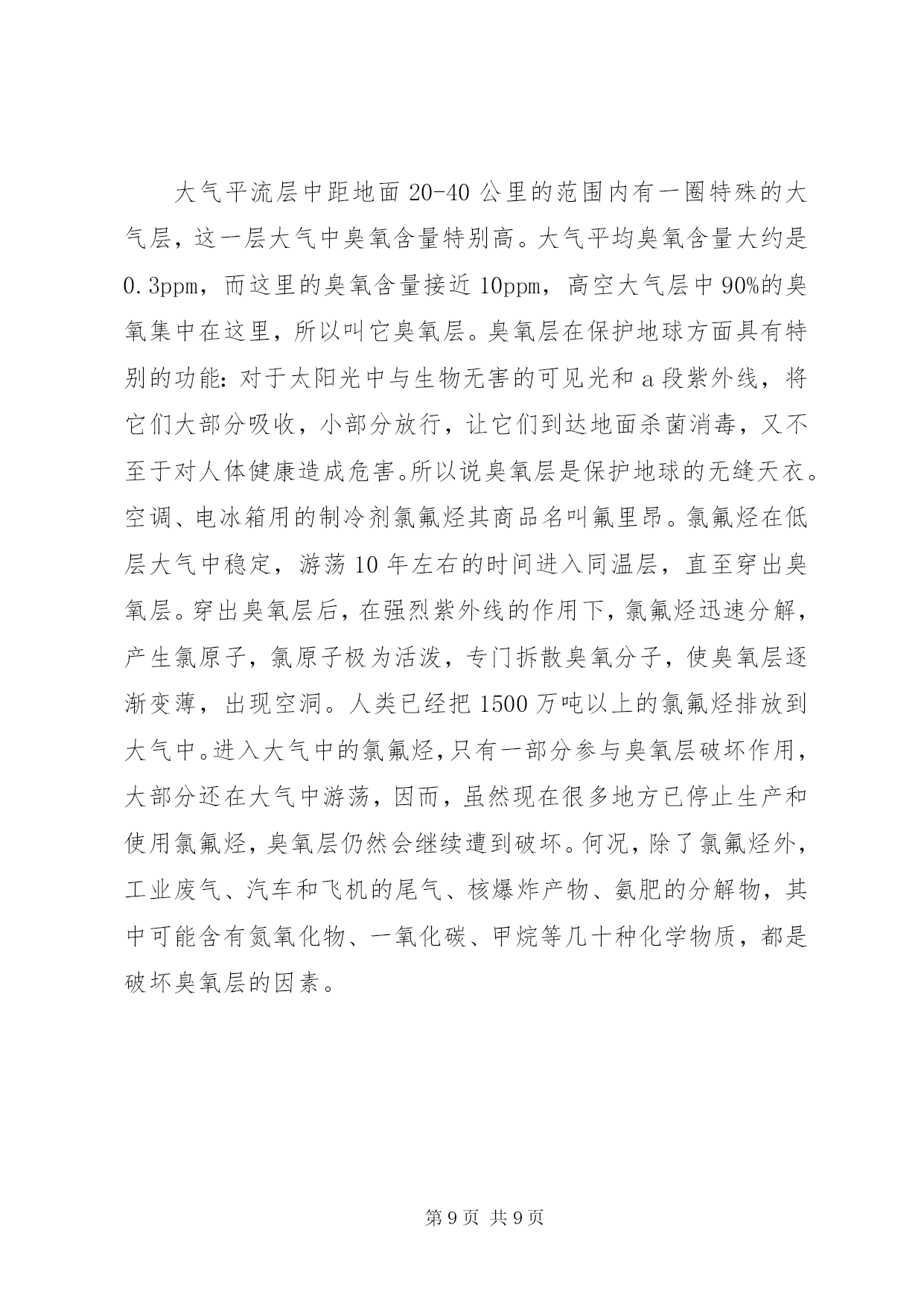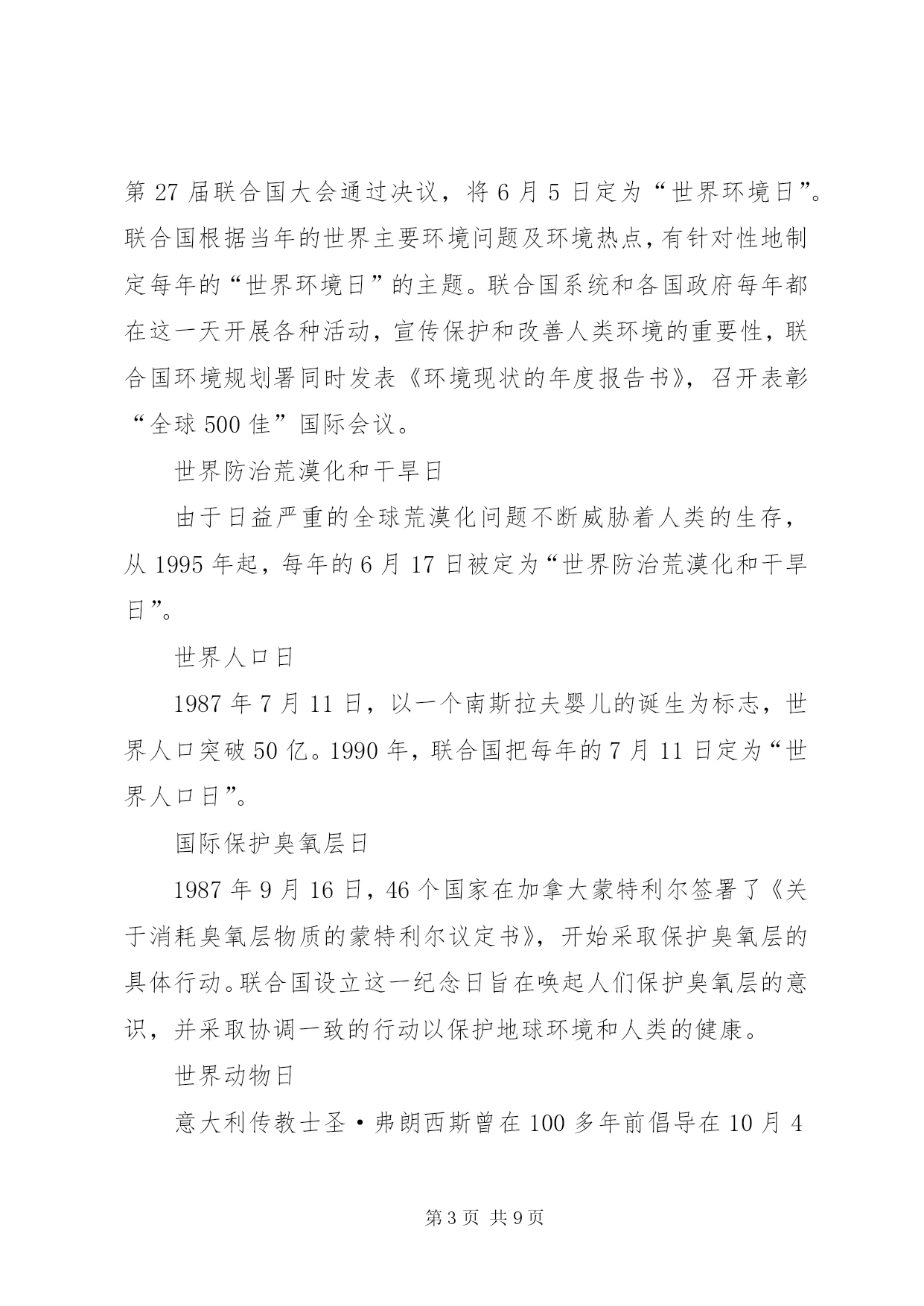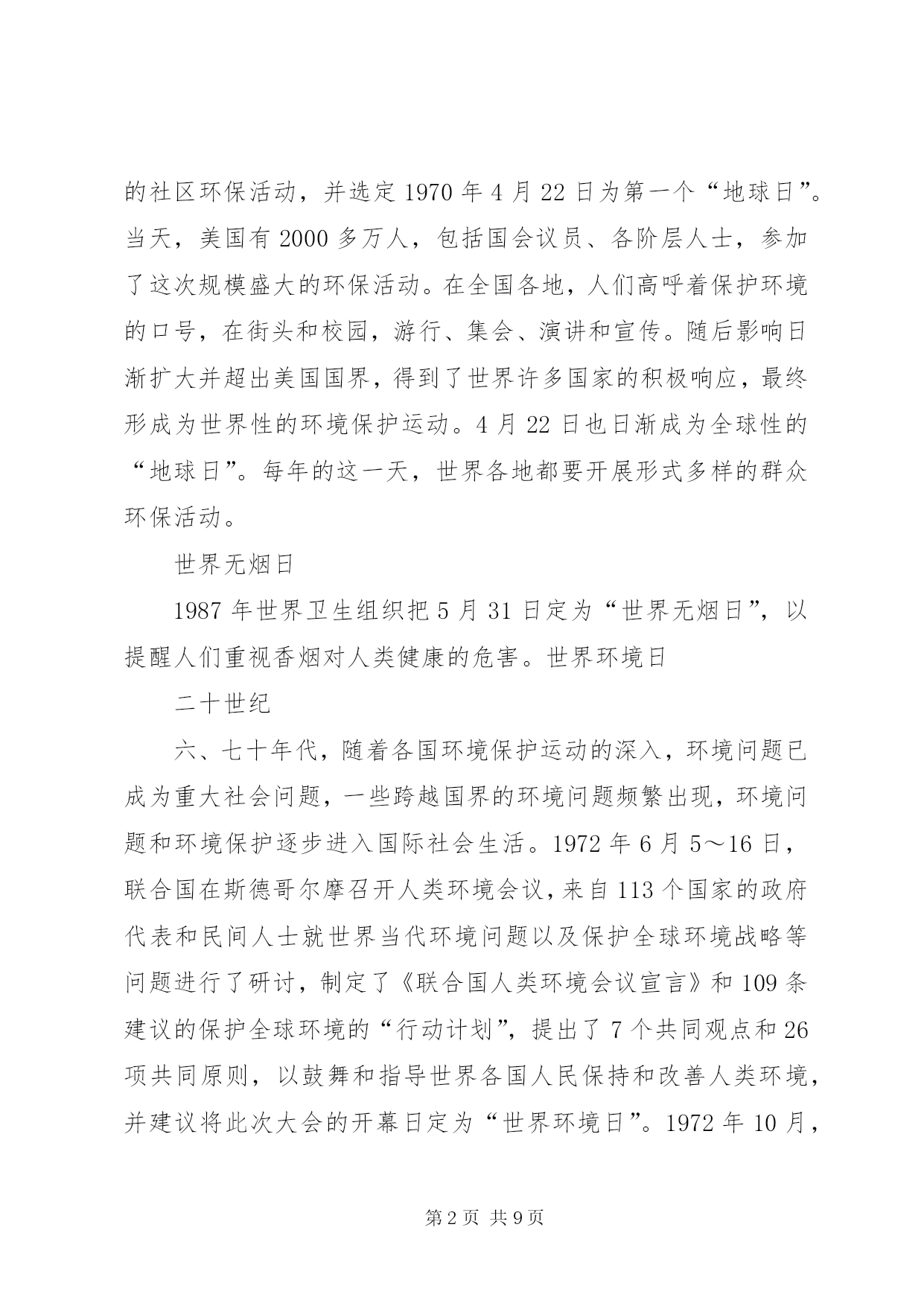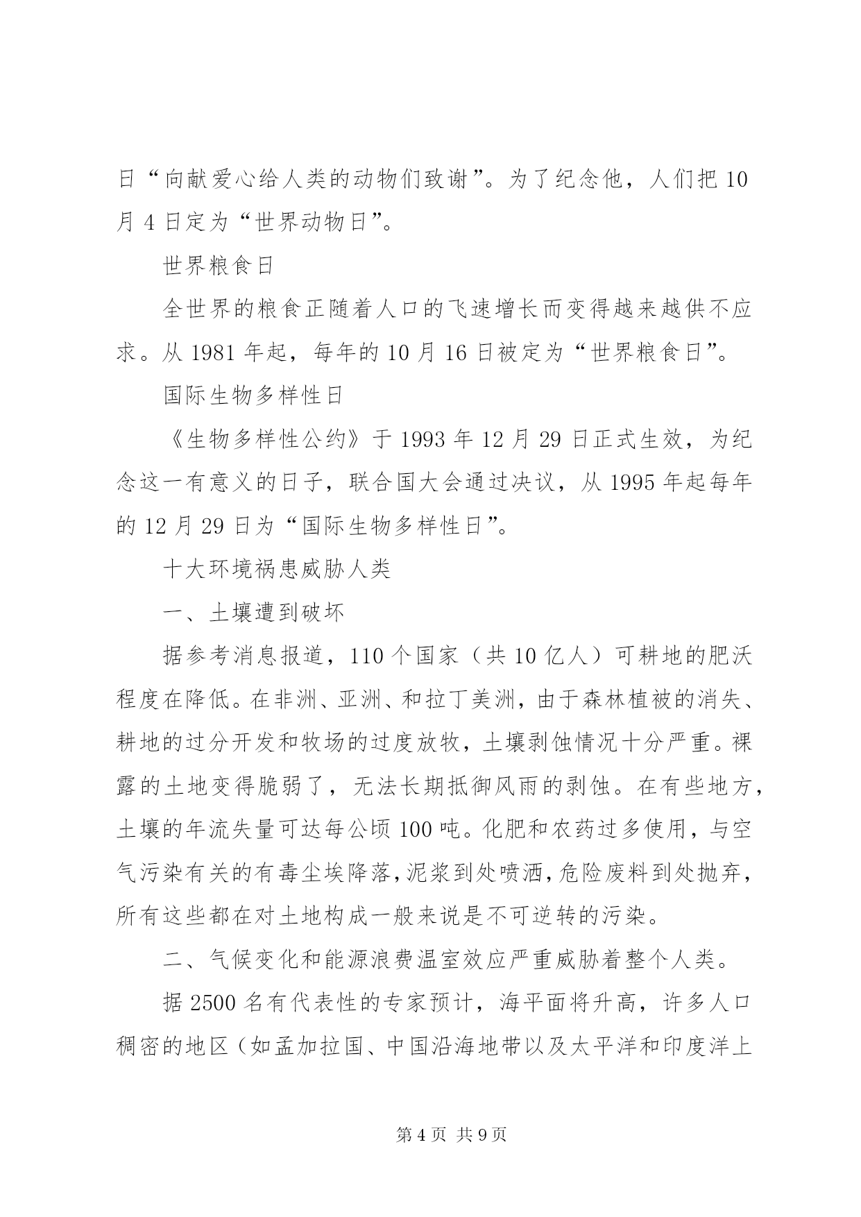 第PAGE\*Arabic\*MERGEFORMAT9页共NUMPAGES\*MERGEFORMAT9页环保相关纪念日环保纪念日国际湿地日2月2日为国际湿地日。根据1971年在伊朗拉姆萨尔(ramsar)签定的《关于特别是作为水禽栖息地的国际重要湿地公约》,湿地是指“长久或暂时性沼泽地、泥炭地或水域地带,带有静止或流动、或为淡水、半咸水、咸水体,包括低潮时不超过6米的水域”。湿地对于保护生物多样性,特别是禽类的生息和迁徙有重要的作用。世界水日1993年1月18日,第四十七届联合国大会做出决议,确定每年的3月22日为“世界水日”。决议提请各国政府根据各自的国情,在这一天开展一些具体的活动,以提高公众意识。从1994年开始,我国政府把“中国水周”的时间改为每年的3月22日至28日,使宣传活动更加突出“世界水日”的主题世界气象日1960年,世界气象组织把3月23日定为“世界气象日”,以提高公众对气象问题的关注。地球日1969年美国威斯康星州参议员盖洛德纳尔逊提议,在美国各大学校园内举办环保问题的讲演会。不久,美国哈佛大学法学院的学生丹尼斯海斯将纳尔逊的提议扩展为在全美举办大规模的社区环保活动,并选定1970年4月22日为第一个“地球日”。当天,美国有2000多万人,包括国会议员、各阶层人士,参加了这次规模盛大的环保活动。在全国各地,人们高呼着保护环境的口号,在街头和校园,游行、集会、演讲和宣传。随后影响日渐扩大并超出美国国界,得到了世界许多国家的积极响应,最终形成为世界性的环境保护运动。4月22日也日渐成为全球性的“地球日”。每年的这一天,世界各地都要开展形式多样的群众环保活动。世界无烟日1987年世界卫生组织把5月31日定为“世界无烟日”,以提醒人们重视香烟对人类健康的危害。世界环境日二十世纪六、七十年代,随着各国环境保护运动的深入,环境问题已成为重大社会问题,一些跨越国界的环境问题频繁出现,环境问题和环境保护逐步进入国际社会生活。1972年6月5~16日,联合国在斯德哥尔摩召开人类环境会议,来自113个国家的政府代表和民间人士就世界当代环境问题以及保护全球环境战略等问题进行了研讨,制定了《联合国人类环境会议宣言》和109条建议的保护全球环境的“行动计划”,提出了7个共同观点和26项共同原则,以鼓舞和指导世界各国人民保持和改善人类环境,并建议将此次大会的开幕日定为“世界环境日”。1972年10月,第27届联合国大会通过决议,将6月5日定为“世界环境日”。联合国根据当年的世界主要环境问题及环境热点,有针对性地制定每年的“世界环境日”的主题。联合国系统和各国政府每年都在这一天开展各种活动,宣传保护和改善人类环境的重要性,联合国环境规划署同时发表《环境现状的年度报告书》,召开表彰“全球500佳”国际会议。世界防治荒漠化和干旱日由于日益严重的全球荒漠化问题不断威胁着人类的生存,从1995年起,每年的6月17日被定为“世界防治荒漠化和干旱日”。世界人口日1987年7月11日,以一个南斯拉夫婴儿的诞生为标志,世界人口突破50亿。1990年,联合国把每年的7月11日定为“世界人口日”。国际保护臭氧层日1987年9月16日,46个国家在加拿大蒙特利尔签署了《关于消耗臭氧层物质的蒙特利尔议定书》,开始采取保护臭氧层的具体行动。联合国设立这一纪念日旨在唤起人们保护臭氧层的意识,并采取协调一致的行动以保护地球环境和人类的健康。世界动物日意大利传教士圣·弗朗西斯曾在100多年前倡导在10月4日“向献爱心给人类的动物们致谢”。为了纪念他,人们把10月4日定为“世界动物日”。世界粮食日全世界的粮食正随着人口的飞速增长而变得越来越供不应求。从1981年起,每年的10月16日被定为“世界粮食日”。国际生物多样性日《生物多样性公约》于1993年12月29日正式生效,为纪念这一有意义的日子,联合国大会通过决议,从1995年起每年的12月29日为“国际生物多样性日”。十大环境祸患威胁人类一、土壤遭到破坏据参考消息报道,110个国家(共10亿人)可耕地的肥沃程度在降低。在非洲、亚洲、和拉丁美洲,由于森林植被的消失、耕地的过分开发和牧场的过度放牧,土壤剥蚀情况十分严重。裸露的土地变得脆弱了,无法长期抵御风雨的剥蚀。在有些地方,土壤的年流失量可达每公顷100吨。化肥和农药过多使用,与空气污染有关的有毒尘埃降落,泥浆到处喷洒,危险废料到处抛弃,所有这些都在对土地构成一般来说是不可逆转的污染。二、气候变化和能源浪费温室效应严重威胁着整个人类。据2500名有代表性的专家预计,海平面将升高,许多人口稠密的地区(如孟加拉国、中国沿海地带以及太平洋和印度洋上的多数岛屿)都将本水淹没。气温的升高也将对农业和生态系统带来严重影响。据预计,1990-2010年,亚洲