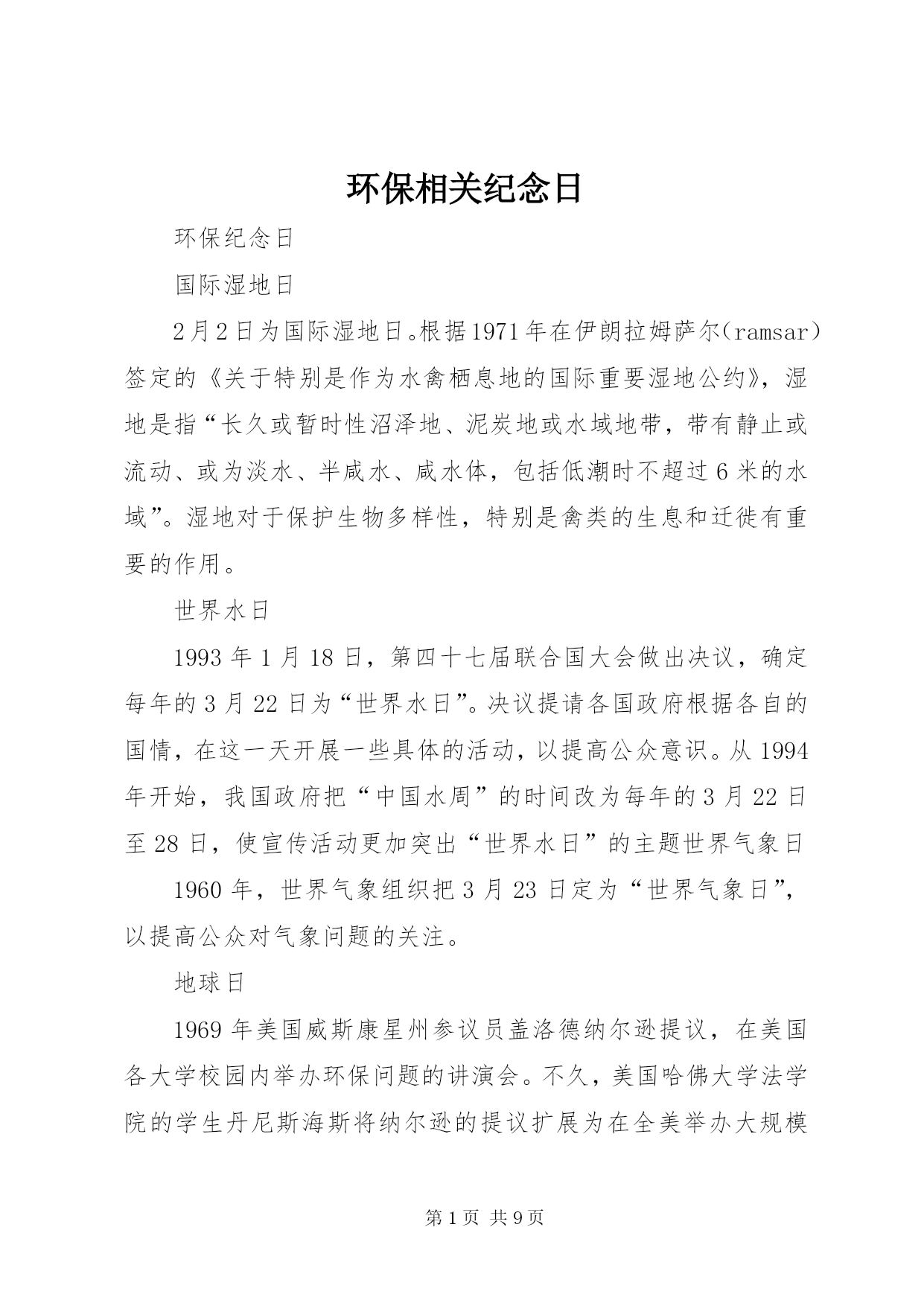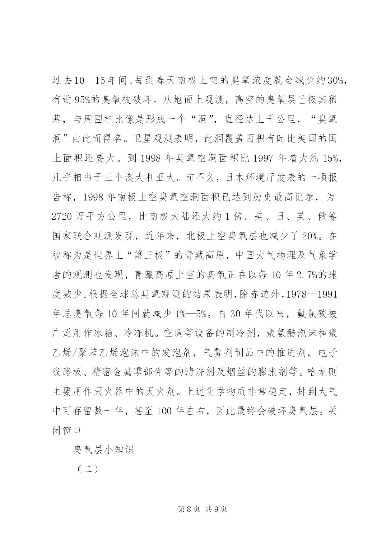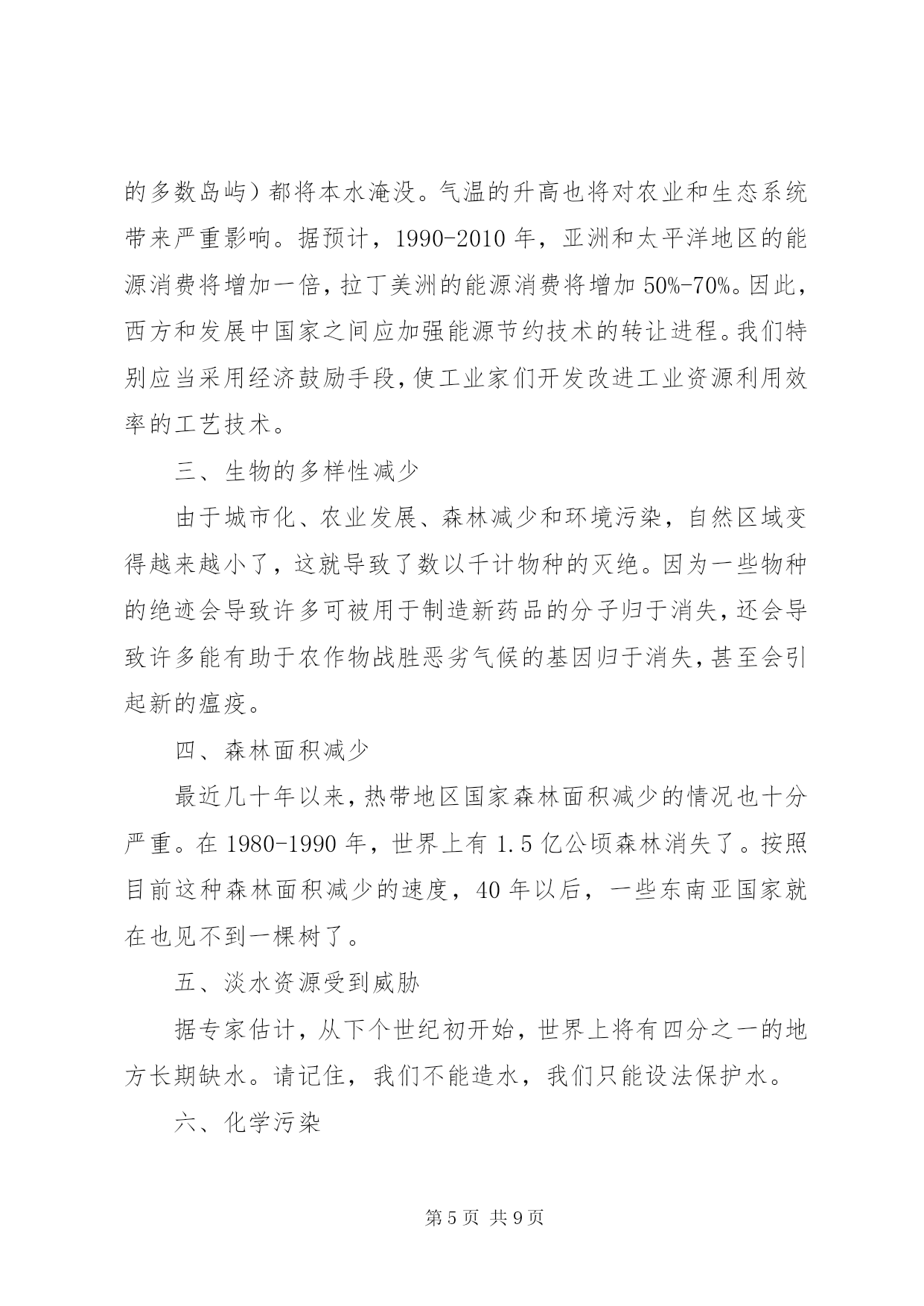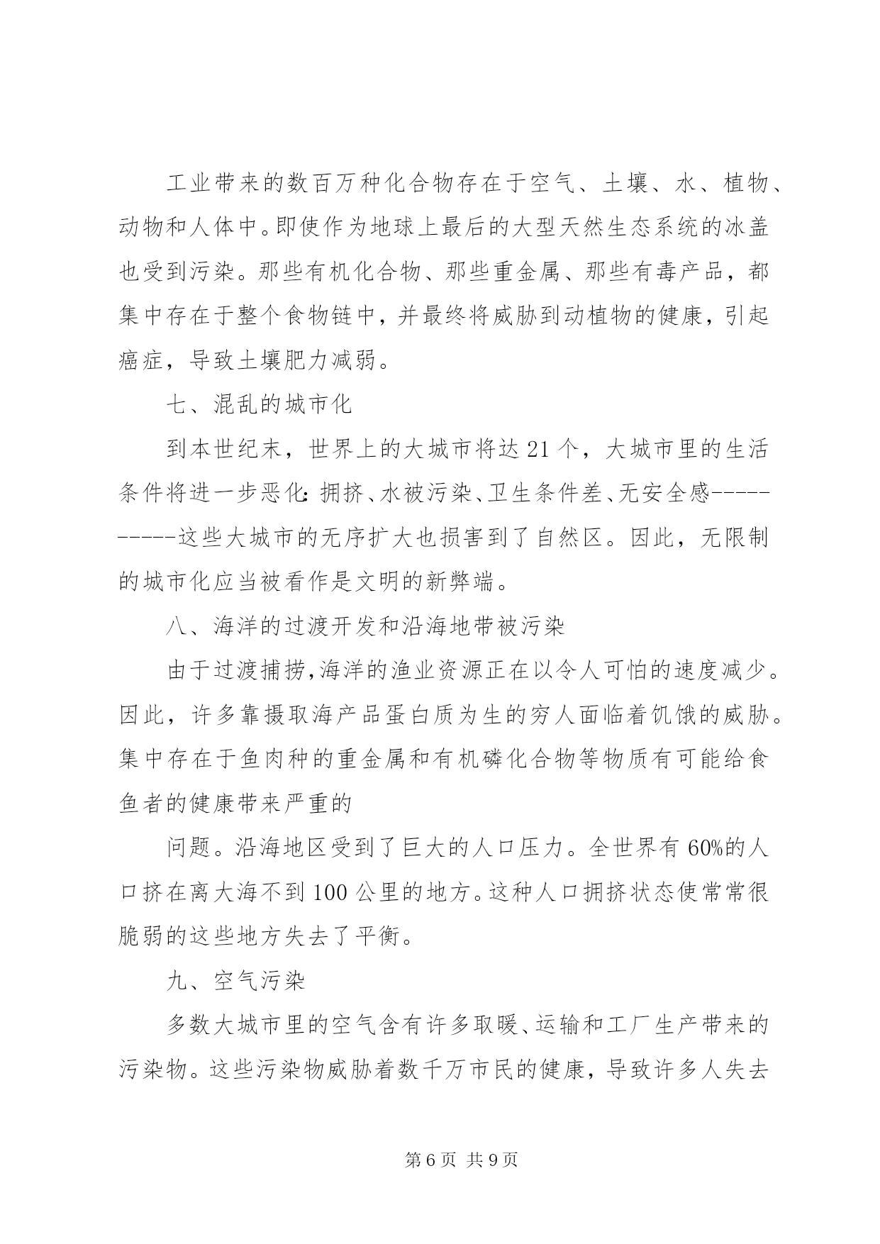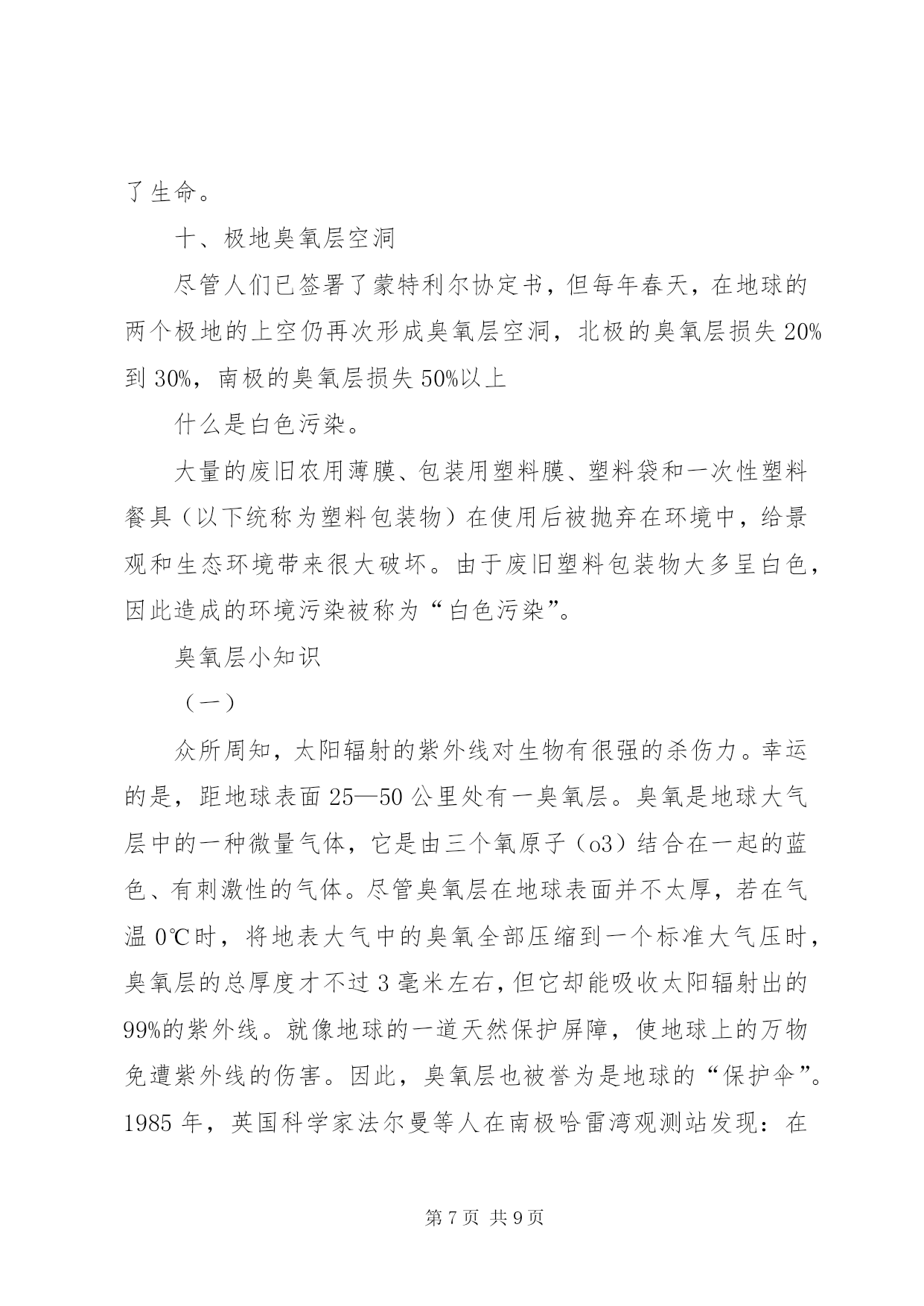 第PAGE\*Arabic\*MERGEFORMAT9页共NUMPAGES\*MERGEFORMAT9页环保相关纪念日环保纪念日国际湿地日2月2日为国际湿地日。根据1971年在伊朗拉姆萨尔(ramsar)签定的《关于特别是作为水禽栖息地的国际重要湿地公约》,湿地是指“长久或暂时性沼泽地、泥炭地或水域地带,带有静止或流动、或为淡水、半咸水、咸水体,包括低潮时不超过6米的水域”。湿地对于保护生物多样性,特别是禽类的生息和迁徙有重要的作用。世界水日1993年1月18日,第四十七届联合国大会做出决议,确定每年的3月22日为“世界水日”。决议提请各国政府根据各自的国情,在这一天开展一些具体的活动,以提高公众意识。从1994年开始,我国政府把“中国水周”的时间改为每年的3月22日至28日,使宣传活动更加突出“世界水日”的主题世界气象日1960年,世界气象组织把3月23日定为“世界气象日”,以提高公众对气象问题的关注。地球日1969年美国威斯康星州参议员盖洛德纳尔逊提议,在美国各大学校园内举办环保问题的讲演会。不久,美国哈佛大学法学院的学生丹尼斯海斯将纳尔逊的提议扩展为在全美举办大规模的社区环保活动,并选定1970年4月22日为第一个“地球日”。当天,美国有2000多万人,包括国会议员、各阶层人士,参加了这次规模盛大的环保活动。在全国各地,人们高呼着保护环境的口号,在街头和校园,游行、集会、演讲和宣传。随后影响日渐扩大并超出美国国界,得到了世界许多国家的积极响应,最终形成为世界性的环境保护运动。4月22日也日渐成为全球性的“地球日”。每年的这一天,世界各地都要开展形式多样的群众环保活动。世界无烟日1987年世界卫生组织把5月31日定为“世界无烟日”,以提醒人们重视香烟对人类健康的危害。世界环境日二十世纪六、七十年代,随着各国环境保护运动的深入,环境问题已成为重大社会问题,一些跨越国界的环境问题频繁出现,环境问题和环境保护逐步进入国际社会生活。1972年6月5~16日,联合国在斯德哥尔摩召开人类环境会议,来自113个国家的政府代表和民间人士就世界当代环境问题以及保护全球环境战略等问题进行了研讨,制定了《联合国人类环境会议宣言》和109条建议的保护全球环境的“行动计划”,提出了7个共同观点和26项共同原则,以鼓舞和指导世界各国人民保持和改善人类环境,并建议将此次大会的开幕日定为“世界环境日”。1972年10月,第27届联合国大会通过决议,将6月5日定为“世界环境日”。联合国根据当年的世界主要环境问题及环境热点,有针对性地制定每年的“世界环境日”的主题。联合国系统和各国政府每年都在这一天开展各种活动,宣传保护和改善人类环境的重要性,联合国环境规划署同时发表《环境现状的年度报告书》,召开表彰“全球500佳”国际会议。世界防治荒漠化和干旱日由于日益严重的全球荒漠化问题不断威胁着人类的生存,从1995年起,每年的6月17日被定为“世界防治荒漠化和干旱日”。世界人口日1987年7月11日,以一个南斯拉夫婴儿的诞生为标志,世界人口突破50亿。1990年,联合国把每年的7月11日定为“世界人口日”。国际保护臭氧层日1987年9月16日,46个国家在加拿大蒙特利尔签署了《关于消耗臭氧层物质的蒙特利尔议定书》,开始采取保护臭氧层的具体行动。联合国设立这一纪念日旨在唤起人们保护臭氧层的意识,并采取协调一致的行动以保护地球环境和人类的健康。世界动物日意大利传教士圣·弗朗西斯曾在100多年前倡导在10月4日“向献爱心给人类的动物们致谢”。为了纪念他,人们把10月4日定为“世界动物日”。世界粮食日全世界的粮食正随着人口的飞速增长而变得越来越供不应求。从1981年起,每年的10月16日被定为“世界粮食日”。国际生物多样性日《生物多样性公约》于1993年12月29日正式生效,为纪念这一有意义的日子,联合国大会通过决议,从1995年起每年的12月29日为“国际生物多样性日”。十大环境祸患威胁人类一、土壤遭到破坏据参考消息报道,110个国家(共10亿人)可耕地的肥沃程度在降低。在非洲、亚洲、和拉丁美洲,由于森林植被的消失、耕地的过分开发和牧场的过度放牧,土壤剥蚀情况十分严重。裸露的土地变得脆弱了,无法长期抵御风雨的剥蚀。在有些地方,土壤的年流失量可达每公顷100吨。化肥和农药过多使用,与空气污染有关的有毒尘埃降落,泥浆到处喷洒,危险废料到处抛弃,所有这些都在对土地构成一般来说是不可逆转的污染。二、气候变化和能源浪费温室效应严重威胁着整个人类。据2500名有代表性的专家预计,海平面将升高,许多人口稠密的地区(如孟加拉国、中国沿海地带以及太平洋和印度洋上的多数岛屿)都将本水淹没。气温的升高也将对农业和生态系统带来严重影响。据预计,1990-2010年,亚洲