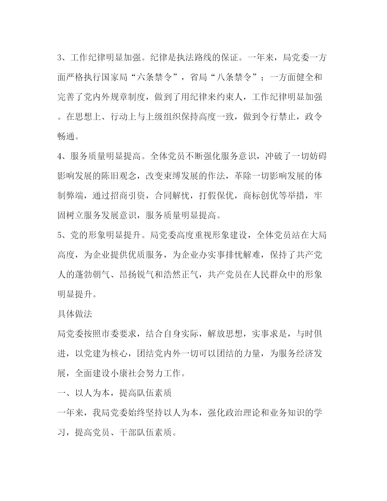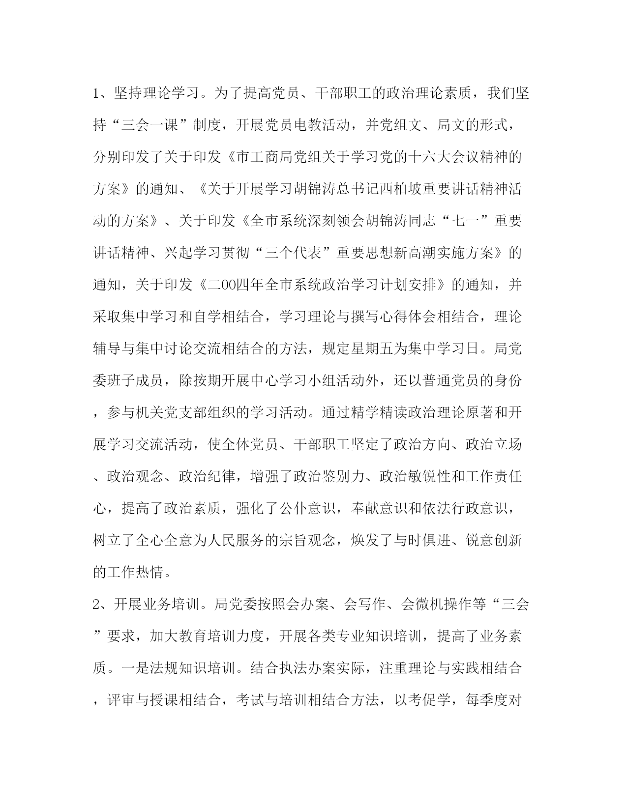 PAGE此资料由网络收集而来,如有侵权请告知上传者立即删除。资料共分享,我们负责传递知识。工商局党建工作总结工商局党建工作总结今年,我局党建工作,在市委、市直机关工委的正确领导下,以xxx理论和“三个代表”重要思想为指导,全面贯彻党的十六大和十六届三中全会精神,紧紧围绕“第一要务”,加快小康社会建设步伐,创新服务举措,加强思想作风纪律建设,加大改革力度,坚持民主集中制原则,强化党员教育,党委的核心地位、党支部的战斗堡垒作用和党员的先锋模范作用得到充分发挥,工商队伍的依法行政意识明显增强,做到了围绕发展抓党建,抓好党建促发展。主要成绩一年来,由于局党委的高度重视,各党支部步调一致,全体党员和干部职工的共同努力,我局党建工作取得了显著的成绩。1、核心地位明确增强。办好中国的事情,关键取决于我们党。为此,局党委践行“三个代表”,牢记“两个务必”,发挥党委总揽全局,协调各方面的作用,始终保持了党的先进性和纯洁性,党的创造力、凝聚力、战斗力和核心领导地位明显增强。2、行政执法明显规范。一年来,局党委贯彻执法为民精神,全市系统执法水平显著提高,行政执法明显规范,“三乱”现象彻底绝迹,依法办事,秉公执法的良好氛围基本形成。3、工作纪律明显加强。纪律是执法路线的保证。一年来,局党委一方面严格执行国家局“六条禁令”,省局“八条禁令”;一方面健全和完善了党内外规章制度,做到了用纪律来约束人,工作纪律明显加强。在思想上、行动上与上级组织保持高度一致,做到令行禁止,政令畅通。4、服务质量明显提高。全体党员不断强化服务意识,冲破了一切妨碍影响发展的陈旧观念,改变束缚发展的作法,革除一切影响发展的体制弊端,通过招商引资,合同解忧,打假保优,商标创优等举措,牢固树立服务发展意识,服务质量明显提高。5、党的形象明显提升。局党委高度重视形象建设,全体党员站在大局高度,为企业提供优质服务,为企业办实事排忧解难,保持了共产党人的蓬勃朝气、昂扬锐气和浩然正气,共产党员在人民群众中的形象明显提升。具体做法局党委按照市委要求,结合自身实际,解放思想,实事求是,与时俱进,以党建为核心,团结党内外一切可以团结的力量,为服务经济发展,全面建设小康社会努力工作。一、以人为本,提高队伍素质一年来,我局党委始终坚持以人为本,强化政治理论和业务知识的学习,提高党员、干部队伍素质。1、坚持理论学习。为了提高党员、干部职工的政治理论素质,我们坚持“三会一课”制度,开展党员电教活动,并党组文、局文的形式,分别印发了关于印发《市工商局党组关于学习党的十六大会议精神的方案》的通知、《关于开展学习胡锦涛总书记西柏坡重要讲话精神活动的方案》、关于印发《全市系统深刻领会胡锦涛同志“七一”重要讲话精神、兴起学习贯彻“三个代表”重要思想新高潮实施方案》的通知,关于印发《二OO四年全市系统政治学习计划安排》的通知,并采取集中学习和自学相结合,学习理论与撰写心得体会相结合,理论辅导与集中讨论交流相结合的方法,规定星期五为集中学习日。局党委班子成员,除按期开展中心学习小组活动外,还以普通党员的身份,参与机关党支部组织的学习活动。通过精学精读政治理论原著和开展学习交流活动,使全体党员、干部职工坚定了政治方向、政治立场、政治观念、政治纪律,增强了政治鉴别力、政治敏锐性和工作责任心,提高了政治素质,强化了公仆意识,奉献意识和依法行政意识,树立了全心全意为人民服务的宗旨观念,焕发了与时俱进、锐意创新的工作热情。2、开展业务培训。局党委按照会办案、会写作、会微机操作等“三会”要求,加大教育培训力度,开展各类专业知识培训,提高了业务素质。一是法规知识培训。结合执法办案实际,注重理论与实践相结合,评审与授课相结合,考试与培训相结合方法,以考促学,每季度对分局(所)长、机关科室、直属分局负责人、法制人员开展1期培训,每月进行1次法规知识考试;二是公文写作培训。公文写作是法规知识等综合素质的具体体现,会干不会写,一些工作经验总结不出来,不能指导工作的开展。年初,党委请来写作能人,举办了为期3天的机关党员干部写作培训班,收到很好的培训效果;三是财务技能培训。结合财务工作的实际,定期和不定期地开展财务专业技能培训,提高了财务人员的专业素质。今年8月份,城区分局在机构整合中,通过在系统内公开招考的形式,择优录用了6名财务人员,做到“财务素质与综合素质”的统一;四是微机操作培训。一方面,定期派人到市人事局计算机培训中心培训,一方面,举办微机操作员培训班,提高了办公自动化水平。