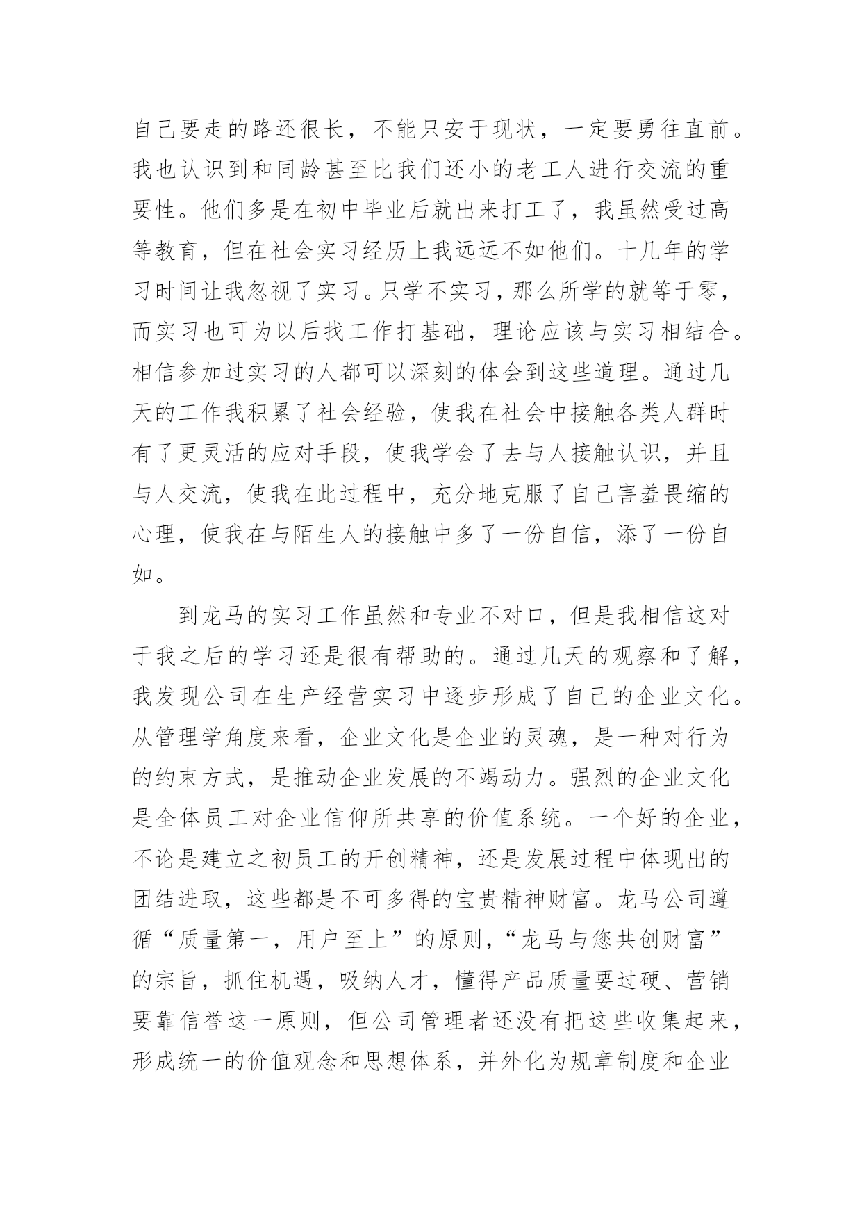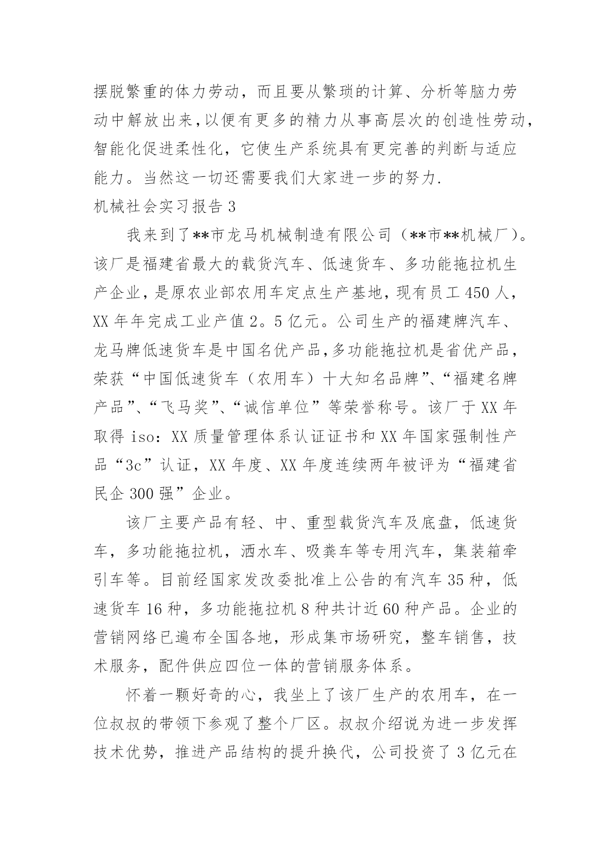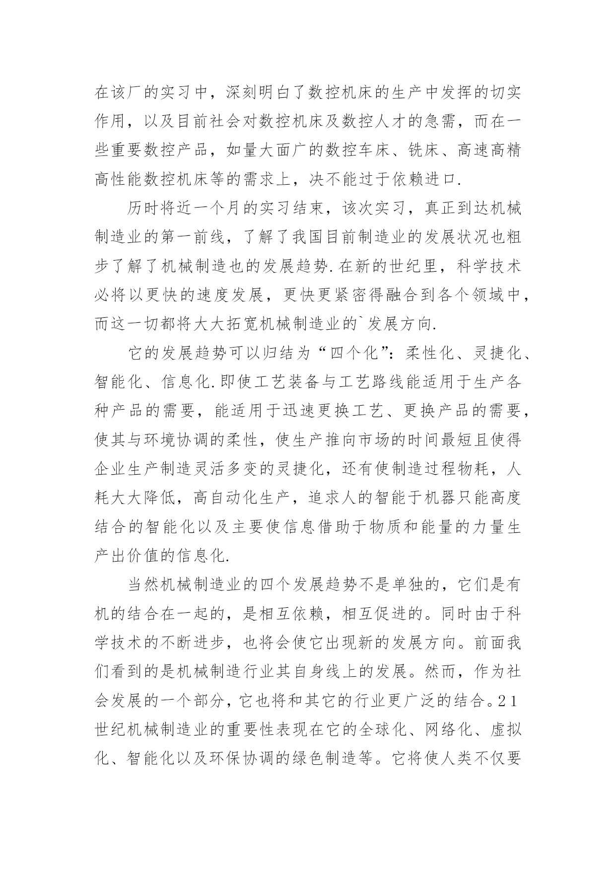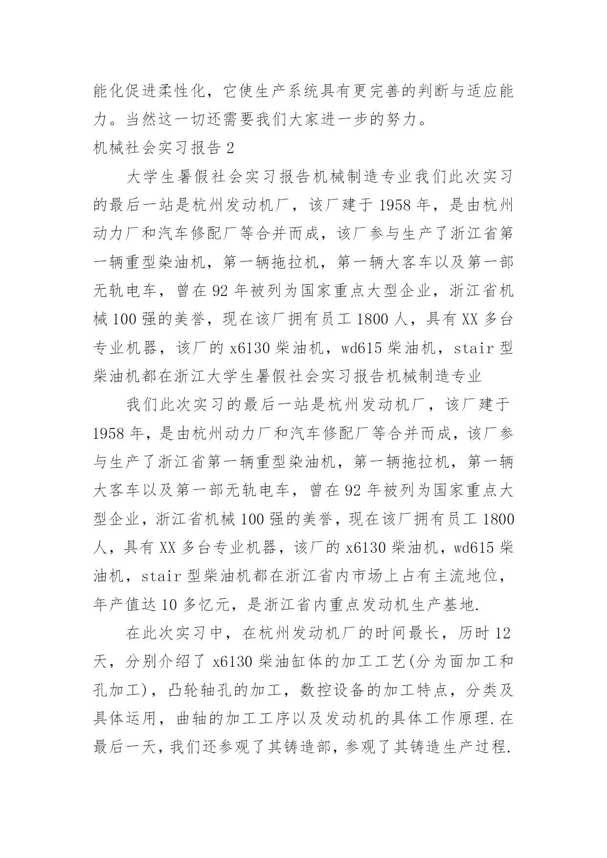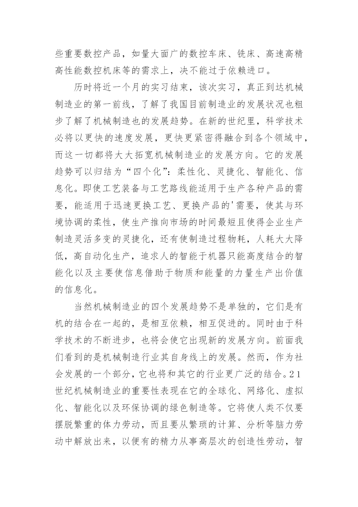 机械社会实习报告机械社会实习报告随着个人素质的提升,接触并使用报告的人越来越多,其在写作上有一定的技巧。为了让您不再为写报告头疼,下面是小编收集整理的机械社会实习报告,欢迎大家借鉴与参考,希望对大家有所帮助。机械社会实习报告1我们此次实习的最后一站是杭州发动机厂,该厂建于1958年,是由杭州动力厂和汽车修配厂等合并而成,该厂参与生产了浙江省第一辆重型染油机,第一辆拖拉机,第一辆大客车以及第一部无轨电车,曾在92年被列为国家重点大型企业,浙江省机械100强的美誉,现在该厂拥有员工1800人,具有20xx多台专业机器,该厂的x6130柴油机,wd615柴油机,stair型柴油机都在浙江省内市场上占有主流地位,年产值达10多忆元,是浙江省内重点发动机生产基地。在此次实习中,在杭州发动机厂的时间最长,历时12天,分别介绍了x6130柴油缸体的加工工艺(分为面加工和孔加工),凸轮轴孔的加工,数控设备的加工特点,分类及具体运用,曲轴的加工工序以及发动机的具体工作原理。在最后一天,我们还参观了其铸造部,参观了其铸造生产过程。在该厂的实习中,深刻明白了数控机床的生产中发挥的切实作用,以及目前社会对数控机床及数控人才的急需,而在一些重要数控产品,如量大面广的数控车床、铣床、高速高精高性能数控机床等的需求上,决不能过于依赖进口。历时将近一个月的实习结束,该次实习,真正到达机械制造业的第一前线,了解了我国目前制造业的发展状况也粗步了解了机械制造也的发展趋势。在新的世纪里,科学技术必将以更快的速度发展,更快更紧密得融合到各个领域中,而这一切都将大大拓宽机械制造业的发展方向。它的发展趋势可以归结为“四个化”:柔性化、灵捷化、智能化、信息化。即使工艺装备与工艺路线能适用于生产各种产品的需要,能适用于迅速更换工艺、更换产品的'需要,使其与环境协调的柔性,使生产推向市场的时间最短且使得企业生产制造灵活多变的灵捷化,还有使制造过程物耗,人耗大大降低,高自动化生产,追求人的智能于机器只能高度结合的智能化以及主要使信息借助于物质和能量的力量生产出价值的信息化。当然机械制造业的四个发展趋势不是单独的,它们是有机的结合在一起的,是相互依赖,相互促进的。同时由于科学技术的不断进步,也将会使它出现新的发展方向。前面我们看到的是机械制造行业其自身线上的发展。然而,作为社会发展的一个部分,它也将和其它的行业更广泛的结合。21世纪机械制造业的重要性表现在它的全球化、网络化、虚拟化、智能化以及环保协调的绿色制造等。它将使人类不仅要摆脱繁重的体力劳动,而且要从繁琐的计算、分析等脑力劳动中解放出来,以便有的精力从事高层次的创造性劳动,智能化促进柔性化,它使生产系统具有更完善的判断与适应能力。当然这一切还需要我们大家进一步的努力。机械社会实习报告2大学生暑假社会实习报告机械制造专业我们此次实习的最后一站是杭州发动机厂,该厂建于1958年,是由杭州动力厂和汽车修配厂等合并而成,该厂参与生产了浙江省第一辆重型染油机,第一辆拖拉机,第一辆大客车以及第一部无轨电车,曾在92年被列为国家重点大型企业,浙江省机械100强的美誉,现在该厂拥有员工1800人,具有XX多台专业机器,该厂的x6130柴油机,wd615柴油机,stair型柴油机都在浙江大学生暑假社会实习报告机械制造专业我们此次实习的最后一站是杭州发动机厂,该厂建于1958年,是由杭州动力厂和汽车修配厂等合并而成,该厂参与生产了浙江省第一辆重型染油机,第一辆拖拉机,第一辆大客车以及第一部无轨电车,曾在92年被列为国家重点大型企业,浙江省机械100强的美誉,现在该厂拥有员工1800人,具有XX多台专业机器,该厂的x6130柴油机,wd615柴油机,stair型柴油机都在浙江省内市场上占有主流地位,年产值达10多忆元,是浙江省内重点发动机生产基地.在此次实习中,在杭州发动机厂的时间最长,历时12天,分别介绍了x6130柴油缸体的加工工艺(分为面加工和孔加工),凸轮轴孔的加工,数控设备的加工特点,分类及具体运用,曲轴的加工工序以及发动机的具体工作原理.在最后一天,我们还参观了其铸造部,参观了其铸造生产过程.在该厂的实习中,深刻明白了数控机床的生产中发挥的切实作用,以及目前社会对数控机床及数控人才的急需,而在一些重要数控产品,如量大面广的数控车床、铣床、高速高精高性能数控机床等的需求上,决不能过于依赖进口.历时将近一个月的实习结束,该次实习,真正到达机械制造业的第一前线,了解了我国目前制造业的发展状况也粗步了解了机械制造也的发展趋势.在新的世纪里,科学技术必将以更快的速度发展,更快更紧密得融合到各个领域中,而这一切都将大大拓宽机械制造业的`发展方向.它的发展趋势可以归结为“四个化”:柔性化、灵捷化、智能化、信息化.即使工艺装备与工艺路线能适用于