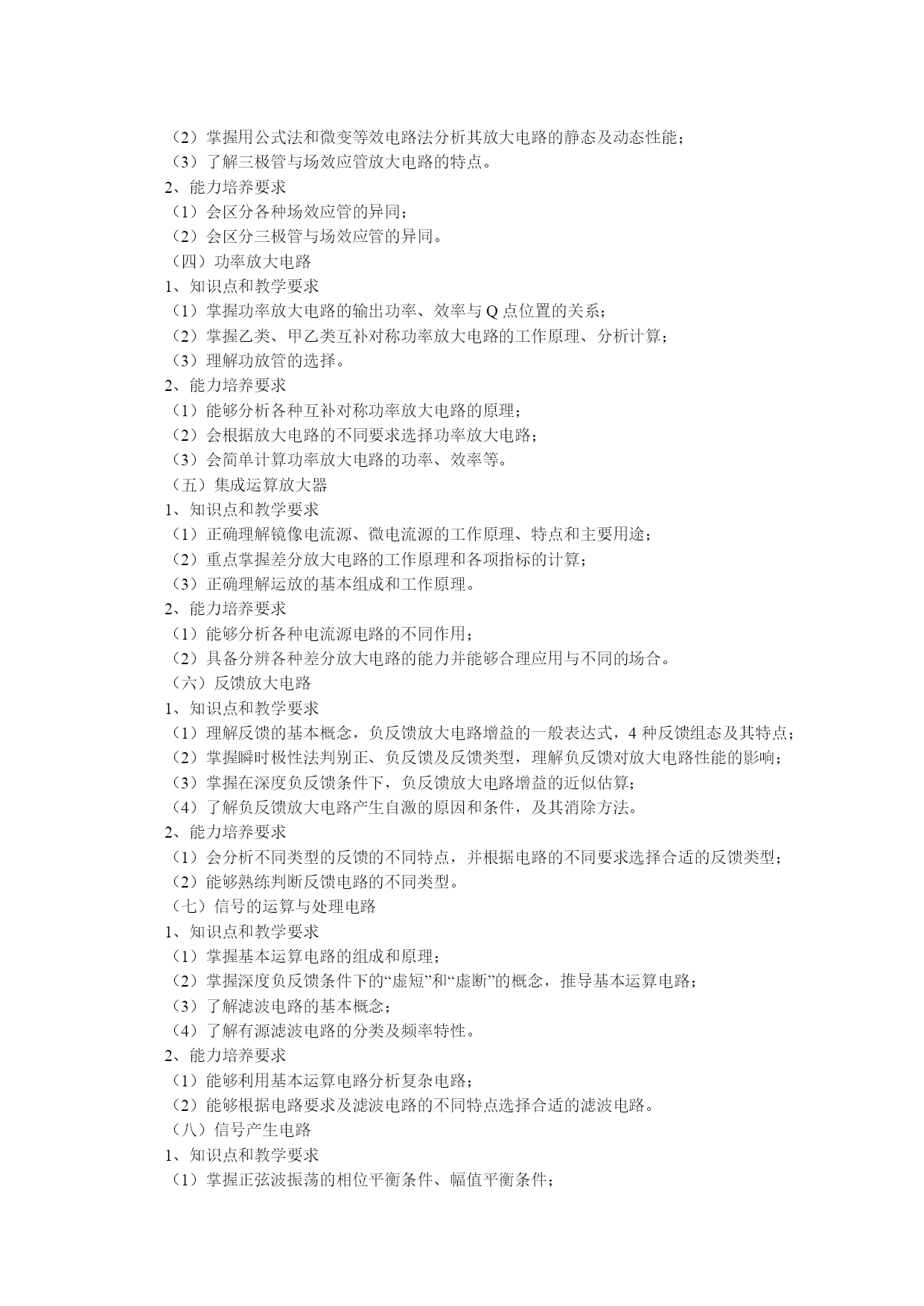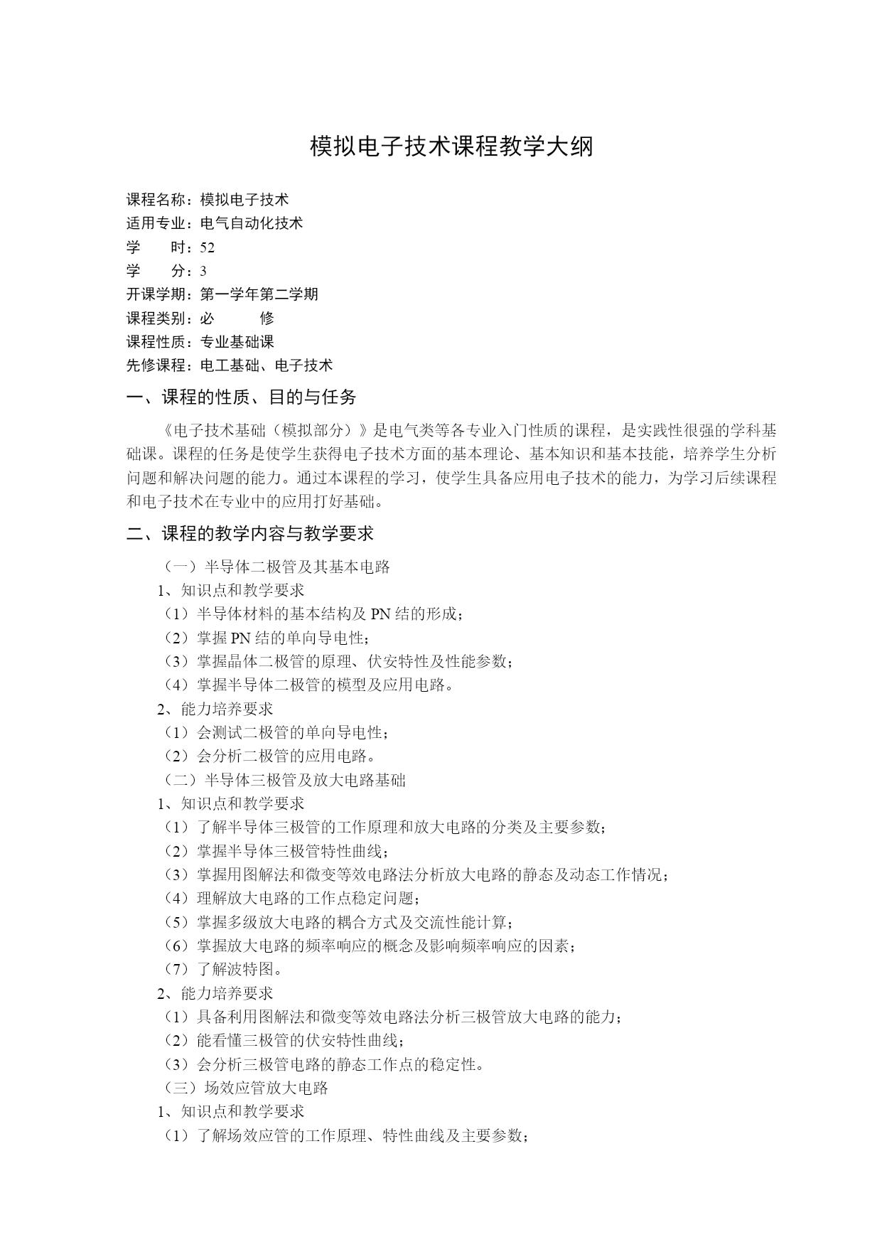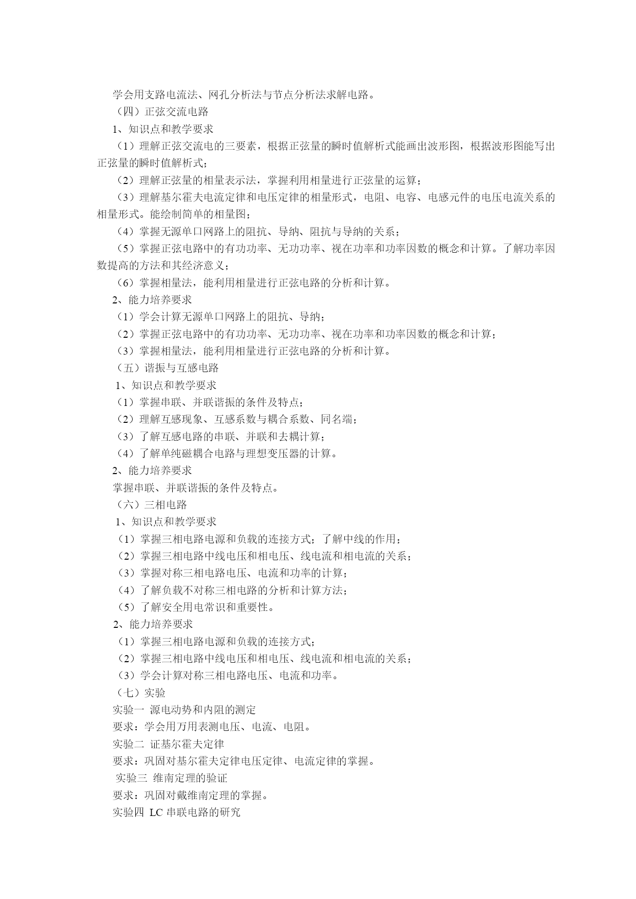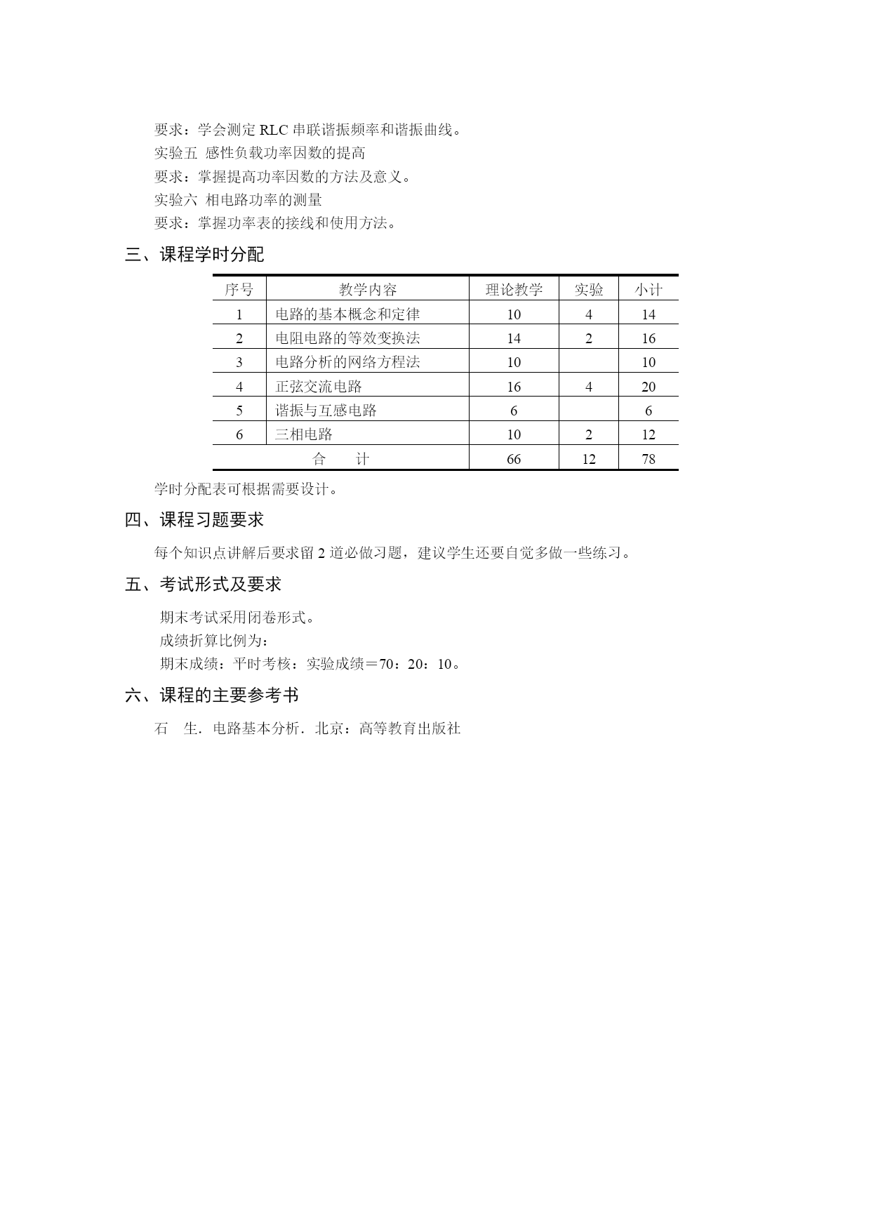 机电系电气自动化技术专业(2005级)教学大纲济源职业技术学院2005年8月目录TOC\o"1-1"\h\z\u1、2、3、4、5、6、7、8、9、10、11、12、13、14、15、16、17、18、19、20、21、22、23、24、电路分析课程教学大纲课程名称:电路分析适用专业:电气自动化技术学时:78学分:4开课学期:第一学年第一学期课程类别:必修课程性质:专业基础课先修课程:高等数学、大学物理一、课程的地位、作用及任务本课程电气自动化专业开设的一门重要的技术基础课,是学习一切电气工程技术的理论基础。通过本课程的学习,使学生掌握电路的基本理论和基本分析方法,并具备必要的实践技能,为学习后续课及今后的工作打好基础。本课程在培养学生认真严肃的科学作风和抽象思维能力、逻辑推理能力、实验研究能力、分析和解决实际问题的能力等方面起着重要作用。实验课突出基本能力的训练。二、课程的教学内容和教学要求(一)电路的基本概念和定律1、知识点和教学要求(1)理解电路模型及理想电路元件(电阻、电感、电容)的特征;(2)掌握电路分析中电压、电流的含义及参考方向的意义;(3)掌握功率计算及基尔霍夫电压定律与电流定律;(4)掌握独立电压源与独立电流源的特点及实际电源的电压源与电流源模型。2、能力培养要求(1)学会分析电路中电压、电流的含义及参考方向的意义;(2)学会计算功率及应用基尔霍夫电压定律与电流定律。(二)电阻电路的等效变换1、知识点和教学要求(1)理解电路等效变换的含义,了解电阻的Y-Δ变换;(2)了解电压源及电流源的串并联;(3)掌握实际电源的两种模型及其等效变换;(4)了解受控源及其等效变换;(5)掌握叠加定理、戴维南定理、诺顿定理,理解替代定理。2、能力培养要求(1)学会应用叠加定理、戴维南定理、诺顿定理求解电路;(2)掌握实际电源的两种模型及其等效变换。(三)电路分析的网络方程法1、知识点和教学要求(1)理解KCL及KVL的独立方程数;(2)掌握支路电流法、网孔分析法与节点分析法;(3)了解回路分析法。2、能力培养要求学会用支路电流法、网孔分析法与节点分析法求解电路。(四)正弦交流电路1、知识点和教学要求(1)理解正弦交流电的三要素,根据正弦量的瞬时值解析式能画出波形图,根据波形图能写出正弦量的瞬时值解析式;(2)理解正弦量的相量表示法,掌握利用相量进行正弦量的运算;(3)理解基尔霍夫电流定律和电压定律的相量形式,电阻、电容、电感元件的电压电流关系的相量形式。能绘制简单的相量图;(4)掌握无源单口网路上的阻抗、导纳、阻抗与导纳的关系;(5)掌握正弦电路中的有功功率、无功功率、视在功率和功率因数的概念和计算。了解功率因数提高的方法和其经济意义;(6)掌握相量法,能利用相量进行正弦电路的分析和计算。2、能力培养要求(1)学会计算无源单口网路上的阻抗、导纳;(2)掌握正弦电路中的有功功率、无功功率、视在功率和功率因数的概念和计算;(3)掌握相量法,能利用相量进行正弦电路的分析和计算。(五)谐振与互感电路1、知识点和教学要求(1)掌握串联、并联谐振的条件及特点;(2)理解互感现象、互感系数与耦合系数、同名端;(3)了解互感电路的串联、并联和去耦计算;(4)了解单纯磁耦合电路与理想变压器的计算。2、能力培养要求掌握串联、并联谐振的条件及特点。(六)三相电路1、知识点和教学要求(1)掌握三相电路电源和负载的连接方式;了解中线的作用;(2)掌握三相电路中线电压和相电压、线电流和相电流的关系;(3)掌握对称三相电路电压、电流和功率的计算;(4)了解负载不对称三相电路的分析和计算方法;(5)了解安全用电常识和重要性。2、能力培养要求(1)掌握三相电路电源和负载的连接方式;(2)掌握三相电路中线电压和相电压、线电流和相电流的关系;(3)学会计算对称三相电路电压、电流和功率。(七)实验实验一源电动势和内阻的测定要求:学会用万用表测电压、电流、电阻。实验二证基尔霍夫定律要求:巩固对基尔霍夫定律电压定律、电流定律的掌握。实验三维南定理的验证要求:巩固对戴维南定理的掌握。实验四LC串联电路的研究要求:学会测定RLC串联谐振频率和谐振曲线。实验五感性负载功率因数的提高要求:掌握提高功率因数的方法及意义。实验六相电路功率的测量要求:掌握功率表的接线和使用方法。三、课程学时分配序号教学内容理论教学实验小计1电路的基本概念和定律104142电阻电路的等效变换法142163电路分析的网络方程法10104正弦交流