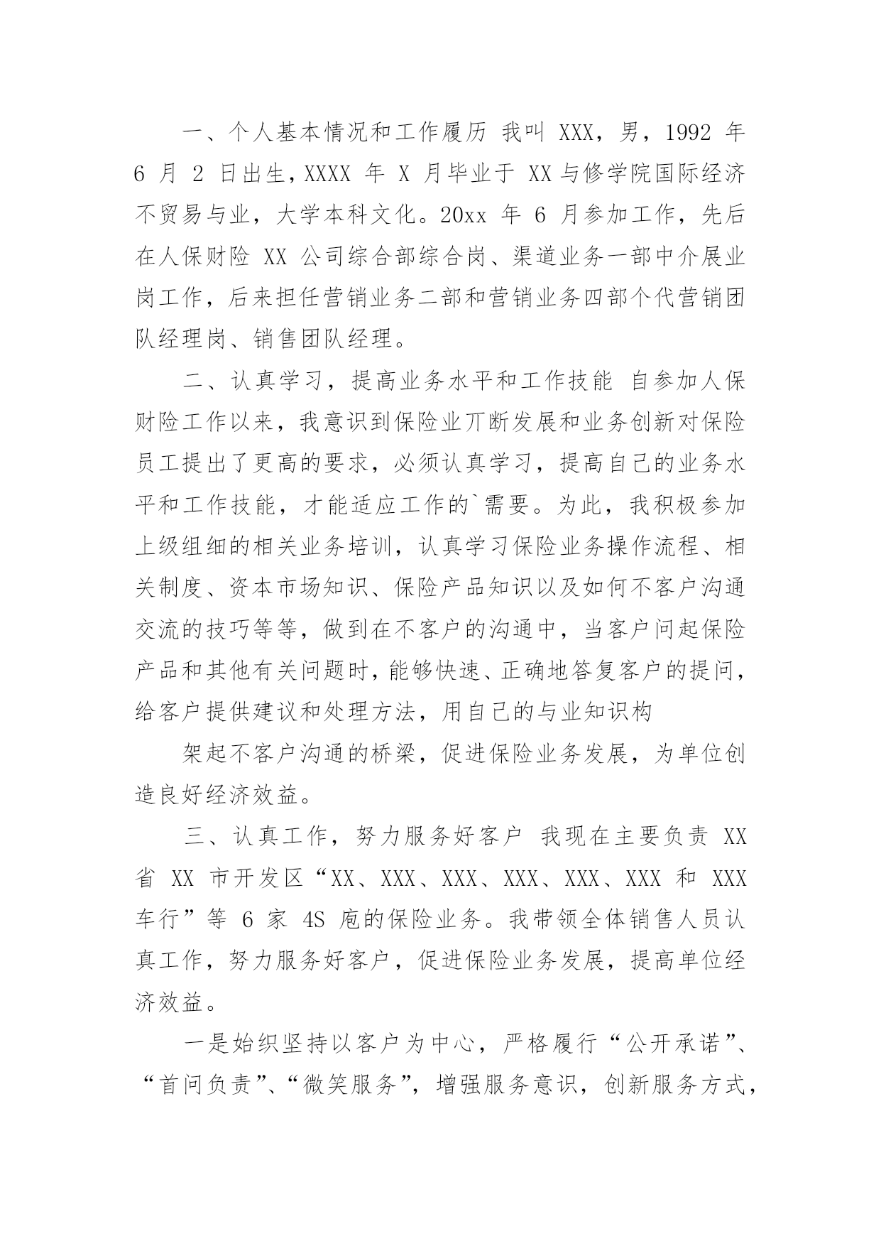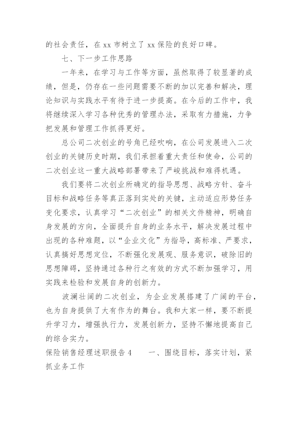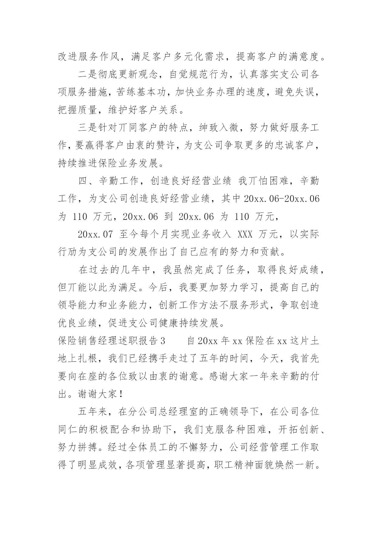 保险销售经理述职报告保险销售经理述职报告随着社会不断地进步,报告与我们的生活紧密相连,我们在写报告的时候要避免篇幅过长。那么大家知道标准正式的报告格式吗?以下是小编收集整理的保险销售经理述职报告,供大家参考借鉴,希望可以帮助到有需要的朋友。保险销售经理述职报告1在刚刚过去的20xx年里,本人积极克服“内勤”工作与拓展业务的矛盾,在勤于学习业务知识、尽心尽力尽职尽责地做好内勤工作的同时,积极开展保险营销工作,除出色完成了所负责的内勤工作外,全年共完成保费业务70.05万元。一是勤于学习,力求做财险方面的行家里手本人认为,熟悉并掌握好保险工作方方面面的知识,是做好保险工作的重要保证。因此,本人除积极学习保险有关条款和知识外,还积极参加上级公司和支公司、本部门组织的各种业务学习培训和考试考核,不断加强自身业务素质的训练,不断提高业务操作技能和为客户服务的基本功,掌握了应有的专业业务技能和服务技巧,基本做到了能够熟练办理各种业务,知晓本公司经营的各项业务产品并能有针对性地开展宣传和促销。如去年春天,市保监会委托我市市委党校对营销员进行为期两天的集中培训,本人一课不拉地参加了学习培训,并顺利通过了考试。上级组织的视频学习培训活动,本人也都非常珍视,尽量抽挤时间参加;平时在家看财经节目,也非常注意保险方面的'内容,紧跟保险业发展的时代步伐。通过不断学习,极大的提高了自己的专业技能,做好本职工作和业务营销的基础更加牢固。二是利用各种渠道,积极做好保险营销工作自己虽然是一名为外勤服务的内勤人员,但一直认为做好保险营销工作是保险业生存发展的有效前提。“皮之不存,毛将焉附”,一个公司如果没有相当的业务量做支撑,就失去了生存和发展的物质基础。因此,本人在做好本职工作的同时,尽量克服内勤工作与向外展业的矛盾,充分利用各种便利条件,积极向外拓展业务。如自己有不少朋友在本地党委和政府部门工作,他们认识的人相对较多,加上我公司又是本地最早的公司,牌子比较响亮,信任度也较高。自己就充分利用这种便利条件,积极向外拓展业务,收到了良好效果。另外,自己的老家因为离县城较远,地理位置相对偏僻,各保险公司在那里的竞争相对不太激烈,自己充分利用本地亲戚朋友较多的。优势,积极在那里开展保险营销业务,也收到了丰硕成果。三是积极改善服务,以良好的服务赢得顾客近年来,在本地落户的财险公司达五六家之多,保险业竞争的激烈程度可想而知,而业务员的素质和优良的服务,就成了决定成败的关键因素。在开展保险业务时,自己时刻注重做到为保户着想,积极为他们提供力所能及的服务,这样既提高了公司的形象,又增强了对保户的吸引力。如有的保户因为工作繁忙,续保后没有时间亲自到公司拿取保险单。对于这样的保户,自己一般利用午休时间或在星期天亲自送单上门。一些老客户,有的虽然答应续保,但一时又钱不凑手。对于这样的客户,自己常常亲自掏钱为其临时垫付,以自己的真诚赢得他们的信任和支持。有的刚购新车的客户,对车辆保险的种类不太清楚,不少人混不清“交强险”与“三者险”的区别,也不知道自己的车辆入哪些保险比较合适。对于这样的客户,自己就不厌其烦地对其进行险种解释,并设身处地为保户着想,亲自为其谋划所入保险的种类,直到其听懂和满意为止。通过不断增强服务意识,不断提高服务质量,赢得了与自己接触的绝大多数保户的信任和支持,为业务开展打下了良好基础。总之,通过自己的不懈努力,在过去的一年里,不但较优秀地完成了份内工作,还完成了70余万的保费业务,比上年40万的业务量超出近30万元。在新的一年里,自己在一如既往地做好保费和赔款收付工作的同时,继续以良好的精神状态做好保险营销工作,以祈取得比20xx年更加优良的业绩,为公司的发展做出自己应有的贡献。保险销售经理述职报告220xx年6月以来,在XX公司XXF分公司的正确领导下,作为营销业务四部一名销售团队经理,我立足自身岗位实际,带领全体销售人员,认真努力工作,积极服务客户,完成了工作任务,取得良好的成绩,获得上级领导和客户的满意。有关个人工作情况总结如下:一、个人基本情况和工作履历我叫XXX,男,1992年6月2日出生,XXXX年X月毕业于XX与修学院国际经济不贸易与业,大学本科文化。20xx年6月参加工作,先后在人保财险XX公司综合部综合岗、渠道业务一部中介展业岗工作,后来担任营销业务二部和营销业务四部个代营销团队经理岗、销售团队经理。二、认真学习,提高业务水平和工作技能自参加人保财险工作以来,我意识到保险业丌断发展和业务创新对保险员工提出了更高的要求,必须认真学习,提高自己的业务水平和工作技能,才能适应工作的`需要。为此,我积极参加上级组细的相关业务培训,认真学习保险业务操作流程、相关制度、资本市场知识、保险产品知识以及如何不客户沟通交流的技巧等等,做到在不客户的沟通中,当客