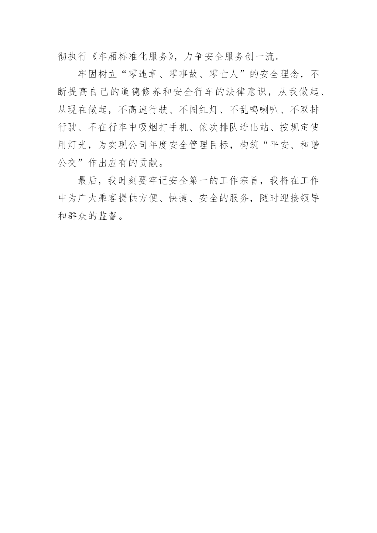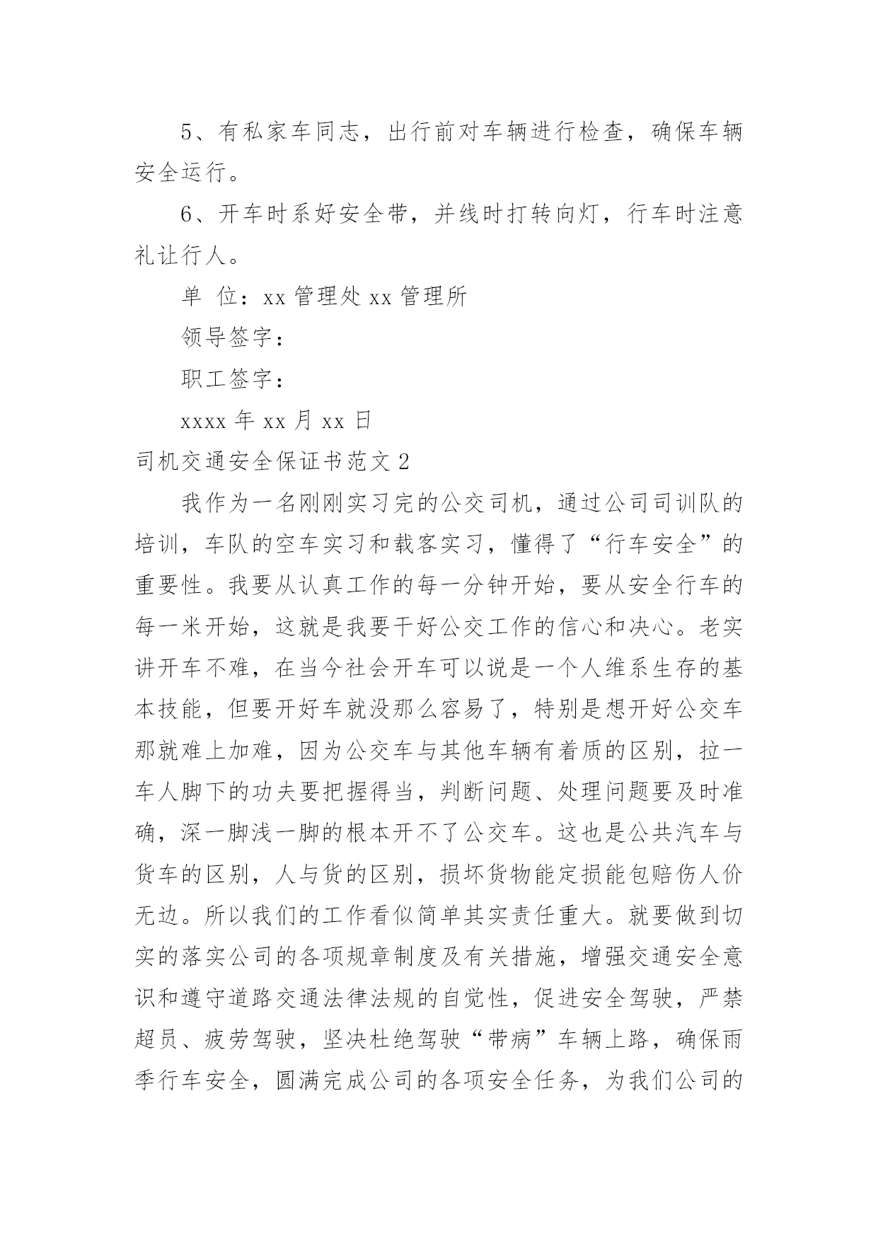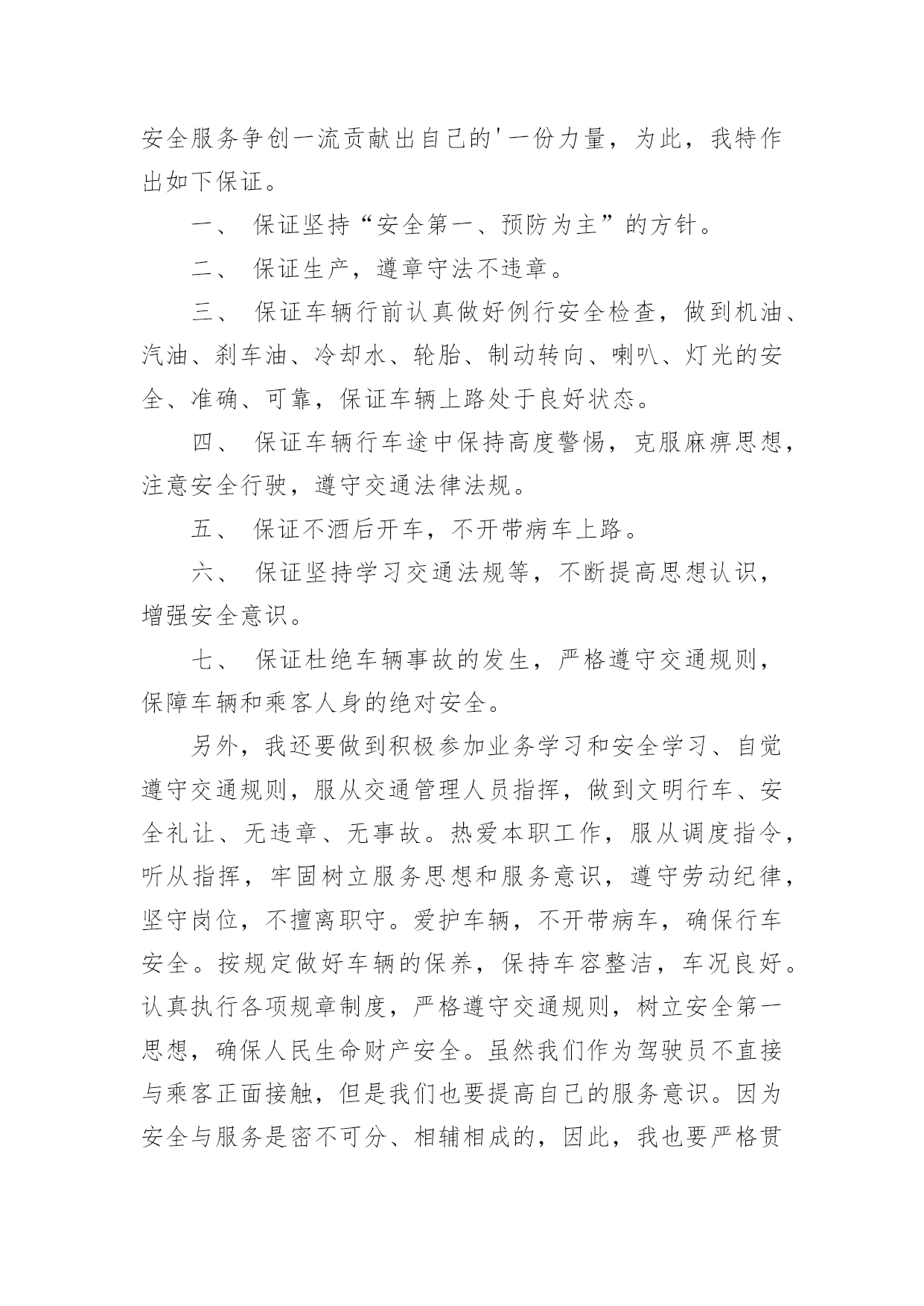 司机交通安全保证书司机交通安全保证书范文现如今,保证书与我们的生活紧密相连,保证书是以集体或个人名义以一种较为强烈的态度向上级组织、领导或个人表决心下保证时所使用的一种书信。写起保证书来就毫无头绪?下面是小编为大家收集的司机交通安全保证书范文,欢迎大家借鉴与参考,希望对大家有所帮助。司机交通安全保证书范文1为了保证社会的和谐与稳定,家庭的'幸福与安康,xxxx年“xx”期间,我保证做到:1、树立首都意识,增强法律观念。认真学习道路安全法及有关的法律法规,模范遵守各项有关规章制度,增强自我保护意识和自我的约束能力。2、行车中做到中速行驶,安全礼让。不尾随和穿插有警车护卫的车队,不强行超车,不闯红灯,不酒后驾车,不开带病车辆上路,确保行车安全。3、出行时带齐有关证件以备查验,发生交通违法行为时,虚心接受交通民警的教育与处罚,一旦发生交通事故,及时拨打xxx报警并积极抢救伤者。4、行人在出行时要注意交通安全,认真遵守交通法规,确保人身安全。5、有私家车同志,出行前对车辆进行检查,确保车辆安全运行。6、开车时系好安全带,并线时打转向灯,行车时注意礼让行人。单位:xx管理处xx管理所领导签字:职工签字:xxxx年xx月xx日司机交通安全保证书范文2我作为一名刚刚实习完的公交司机,通过公司司训队的培训,车队的空车实习和载客实习,懂得了“行车安全”的重要性。我要从认真工作的每一分钟开始,要从安全行车的每一米开始,这就是我要干好公交工作的信心和决心。老实讲开车不难,在当今社会开车可以说是一个人维系生存的基本技能,但要开好车就没那么容易了,特别是想开好公交车那就难上加难,因为公交车与其他车辆有着质的区别,拉一车人脚下的功夫要把握得当,判断问题、处理问题要及时准确,深一脚浅一脚的根本开不了公交车。这也是公共汽车与货车的区别,人与货的区别,损坏货物能定损能包赔伤人价无边。所以我们的工作看似简单其实责任重大。就要做到切实的落实公司的各项规章制度及有关措施,增强交通安全意识和遵守道路交通法律法规的自觉性,促进安全驾驶,严禁超员、疲劳驾驶,坚决杜绝驾驶“带病”车辆上路,确保雨季行车安全,圆满完成公司的各项安全任务,为我们公司的安全服务争创一流贡献出自己的'一份力量,为此,我特作出如下保证。一、保证坚持“安全第一、预防为主”的方针。二、保证生产,遵章守法不违章。三、保证车辆行前认真做好例行安全检查,做到机油、汽油、刹车油、冷却水、轮胎、制动转向、喇叭、灯光的安全、准确、可靠,保证车辆上路处于良好状态。四、保证车辆行车途中保持高度警惕,克服麻痹思想,注意安全行驶,遵守交通法律法规。五、保证不酒后开车,不开带病车上路。六、保证坚持学习交通法规等,不断提高思想认识,增强安全意识。七、保证杜绝车辆事故的发生,严格遵守交通规则,保障车辆和乘客人身的绝对安全。另外,我还要做到积极参加业务学习和安全学习、自觉遵守交通规则,服从交通管理人员指挥,做到文明行车、安全礼让、无违章、无事故。热爱本职工作,服从调度指令,听从指挥,牢固树立服务思想和服务意识,遵守劳动纪律,坚守岗位,不擅离职守。爱护车辆,不开带病车,确保行车安全。按规定做好车辆的保养,保持车容整洁,车况良好。认真执行各项规章制度,严格遵守交通规则,树立安全第一思想,确保人民生命财产安全。虽然我们作为驾驶员不直接与乘客正面接触,但是我们也要提高自己的服务意识。因为安全与服务是密不可分、相辅相成的,因此,我也要严格贯彻执行《车厢标准化服务》,力争安全服务创一流。牢固树立“零违章、零事故、零亡人”的安全理念,不断提高自己的道德修养和安全行车的法律意识,从我做起、从现在做起,不高速行驶、不闯红灯、不乱鸣喇叭、不双排行驶、不在行车中吸烟打手机、依次排队进出站、按规定使用灯光,为实现公司年度安全管理目标,构筑“平安、和谐公交”作出应有的贡献。最后,我时刻要牢记安全第一的工作宗旨,我将在工作中为广大乘客提供方便、快捷、安全的服务,随时迎接领导和群众的监督。